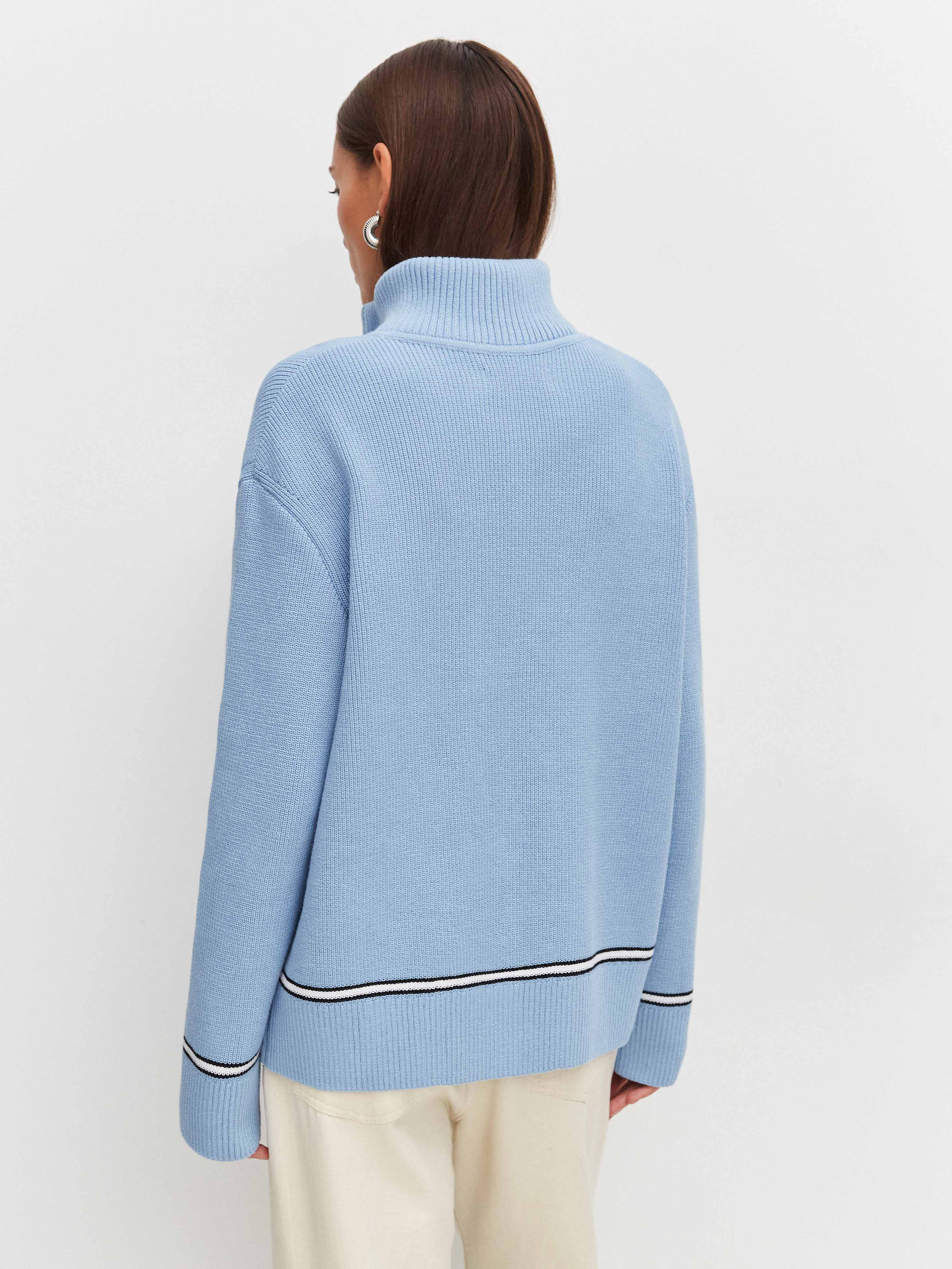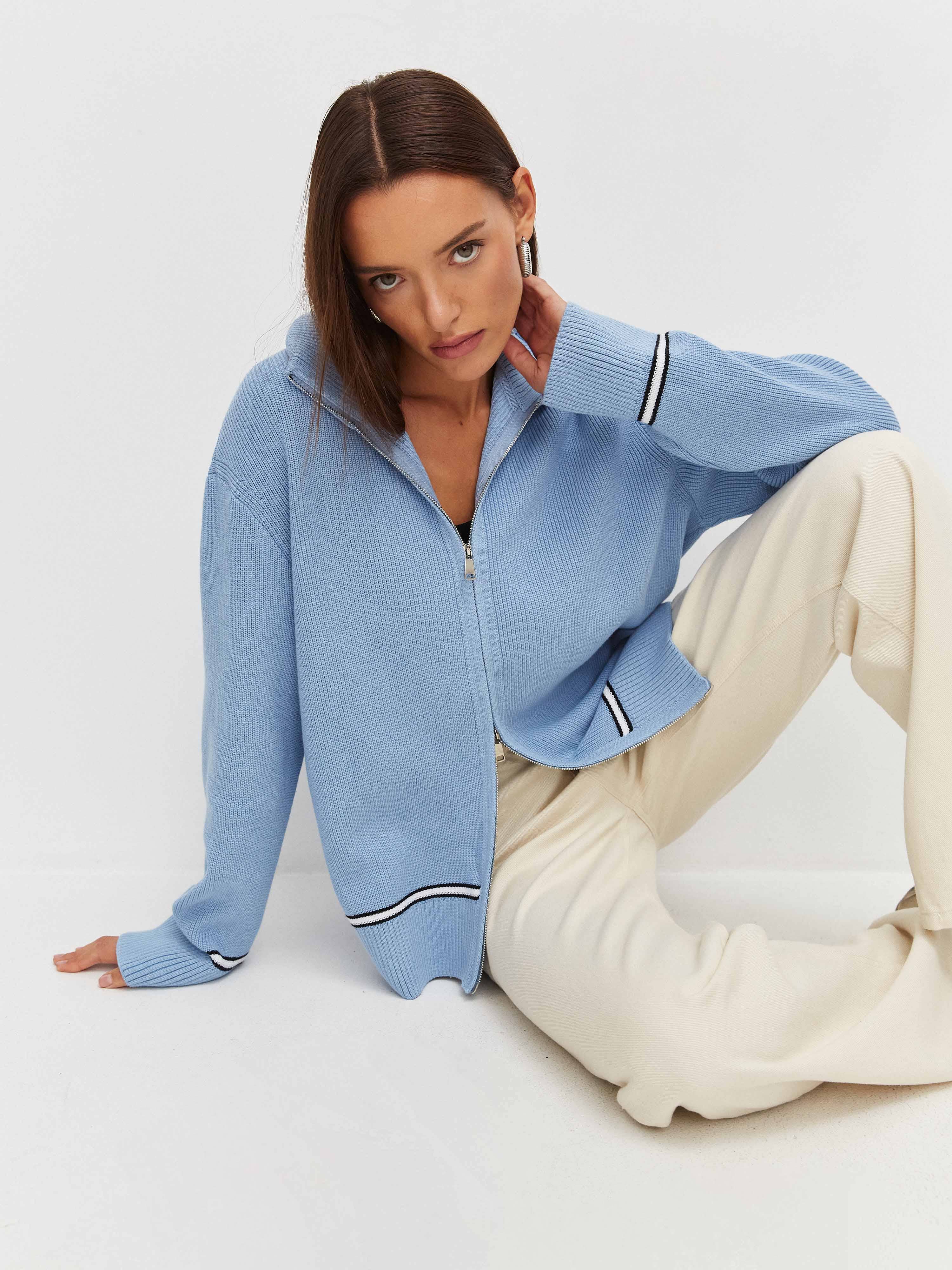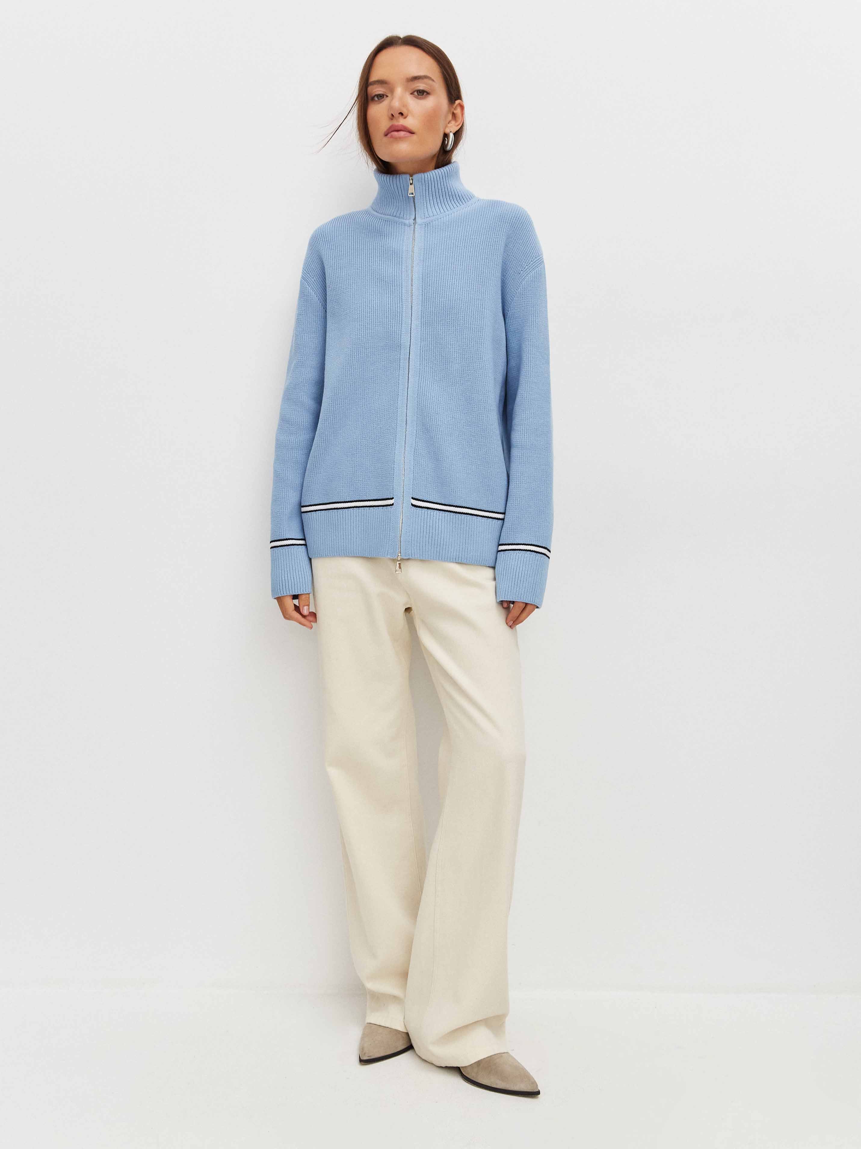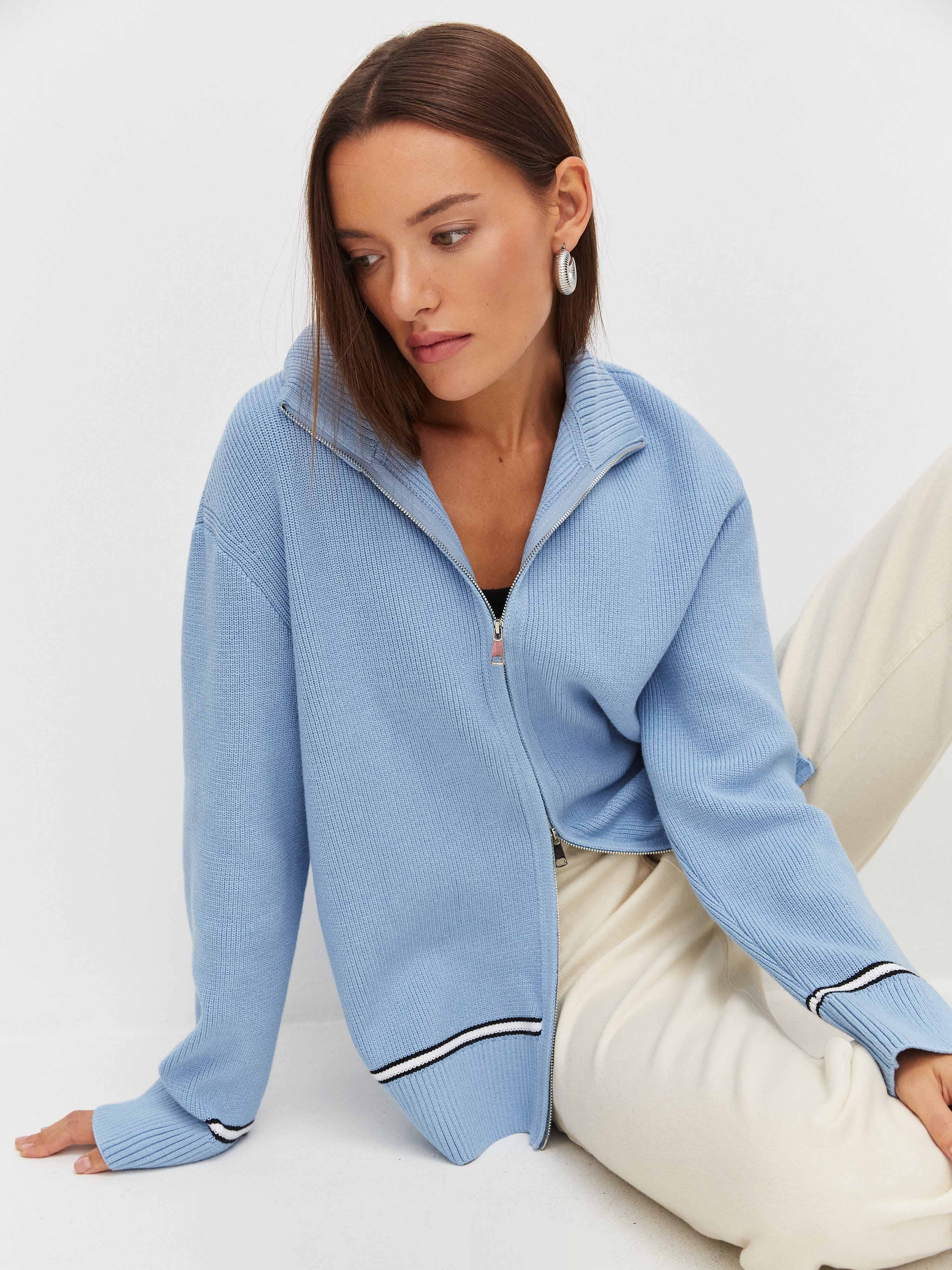 Просторный мягкий джемпер из хлопкового трикотажа, украшенный по низу деликатной полоской. Легко подстраивается под настроение своей обладательницы, благодаря двойному замку. Достаточно расстегнуть кофту снизу и сверху и лук кардинально преображается. Идеальный кандидат на роль осеннего джемпера в многослойных капсулах.