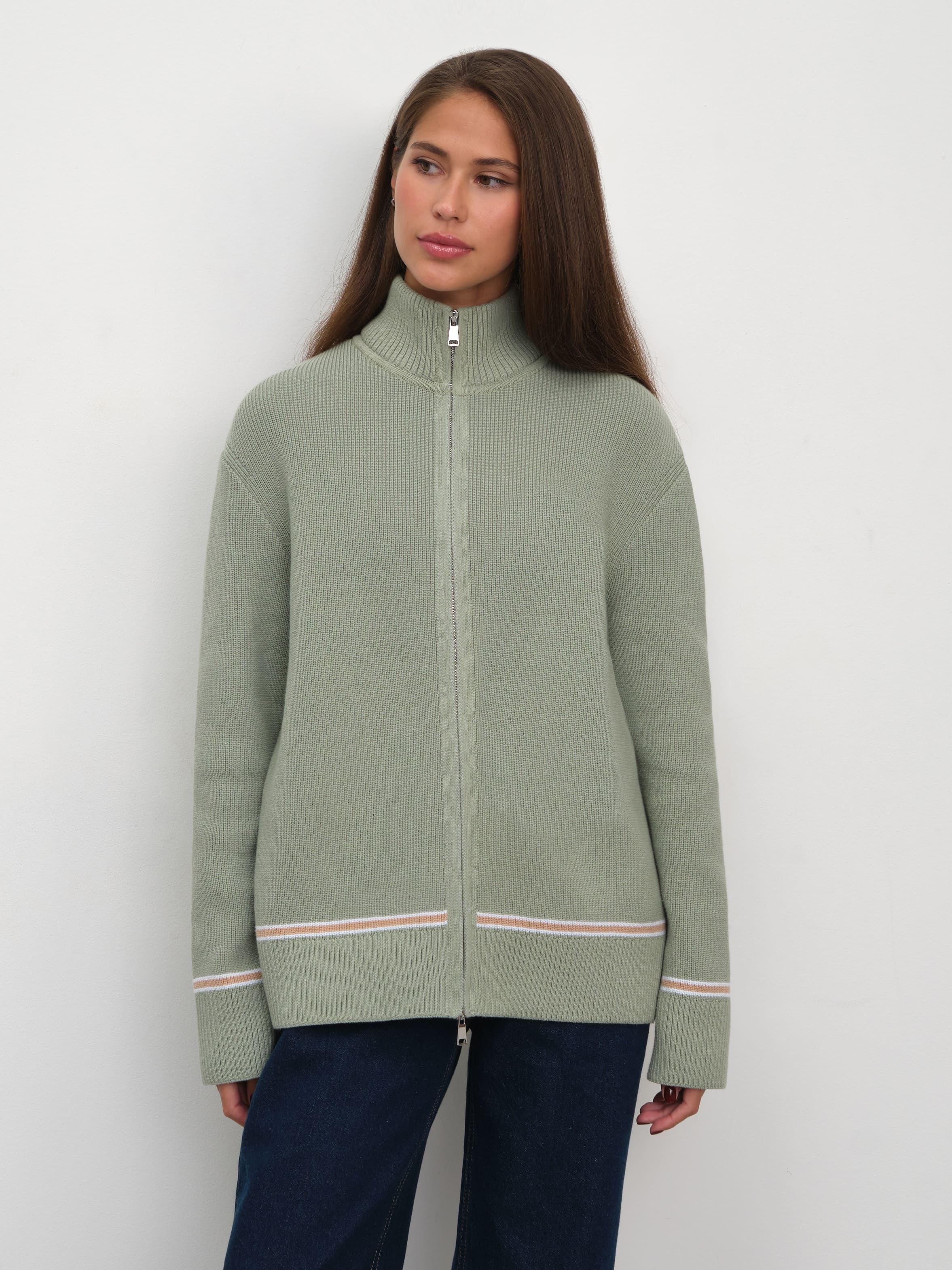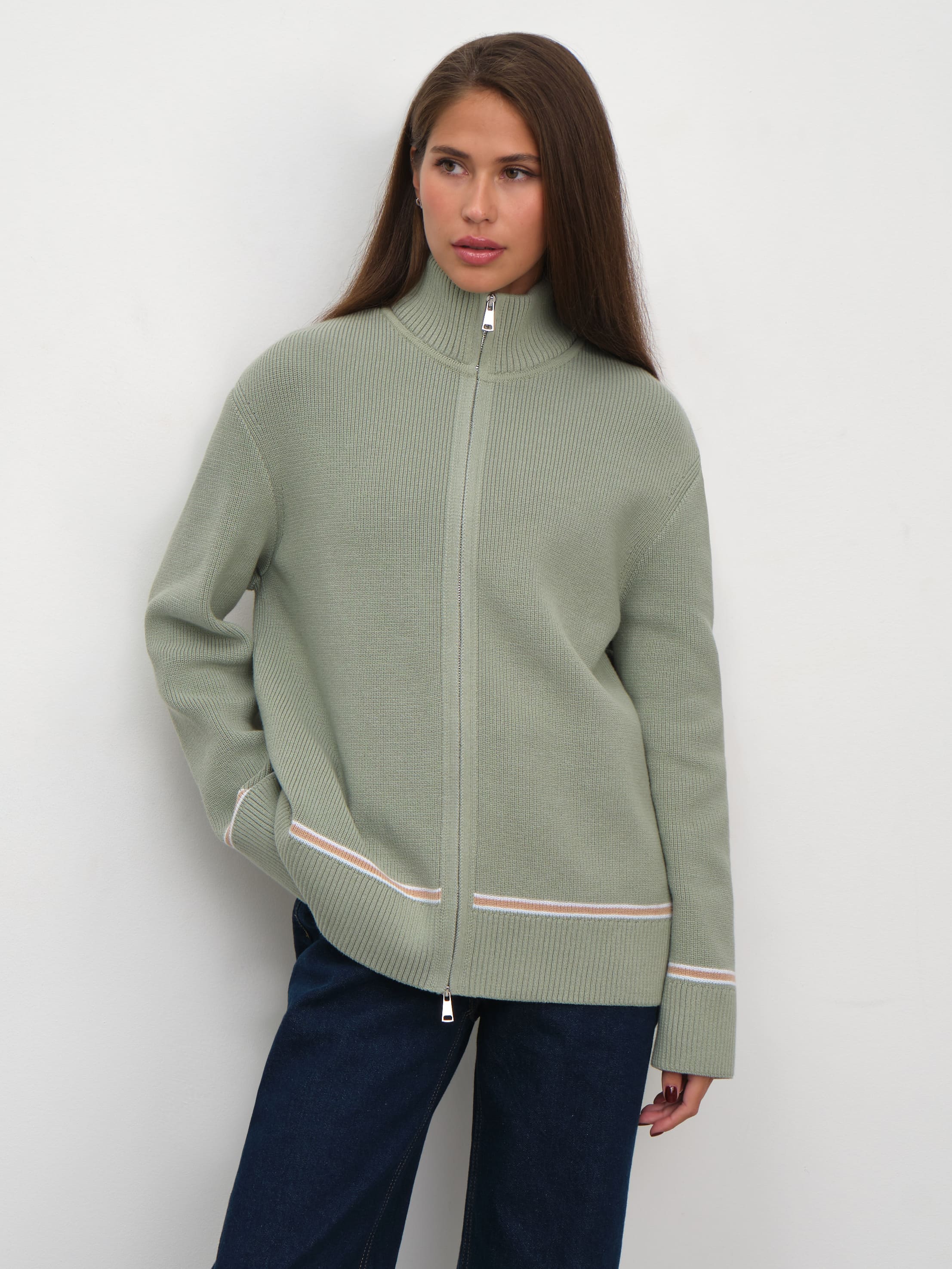 Просторный мягкий джемпер из хлопкового трикотажа, украшенный по низу деликатной полоской. Легко подстраивается под настроение своей обладательницы, благодаря двойному замку. Достаточно расстегнуть кофту снизу и сверху и лук кардинально преображается. Идеальный кандидат на роль осеннего джемпера в многослойных капсулах.