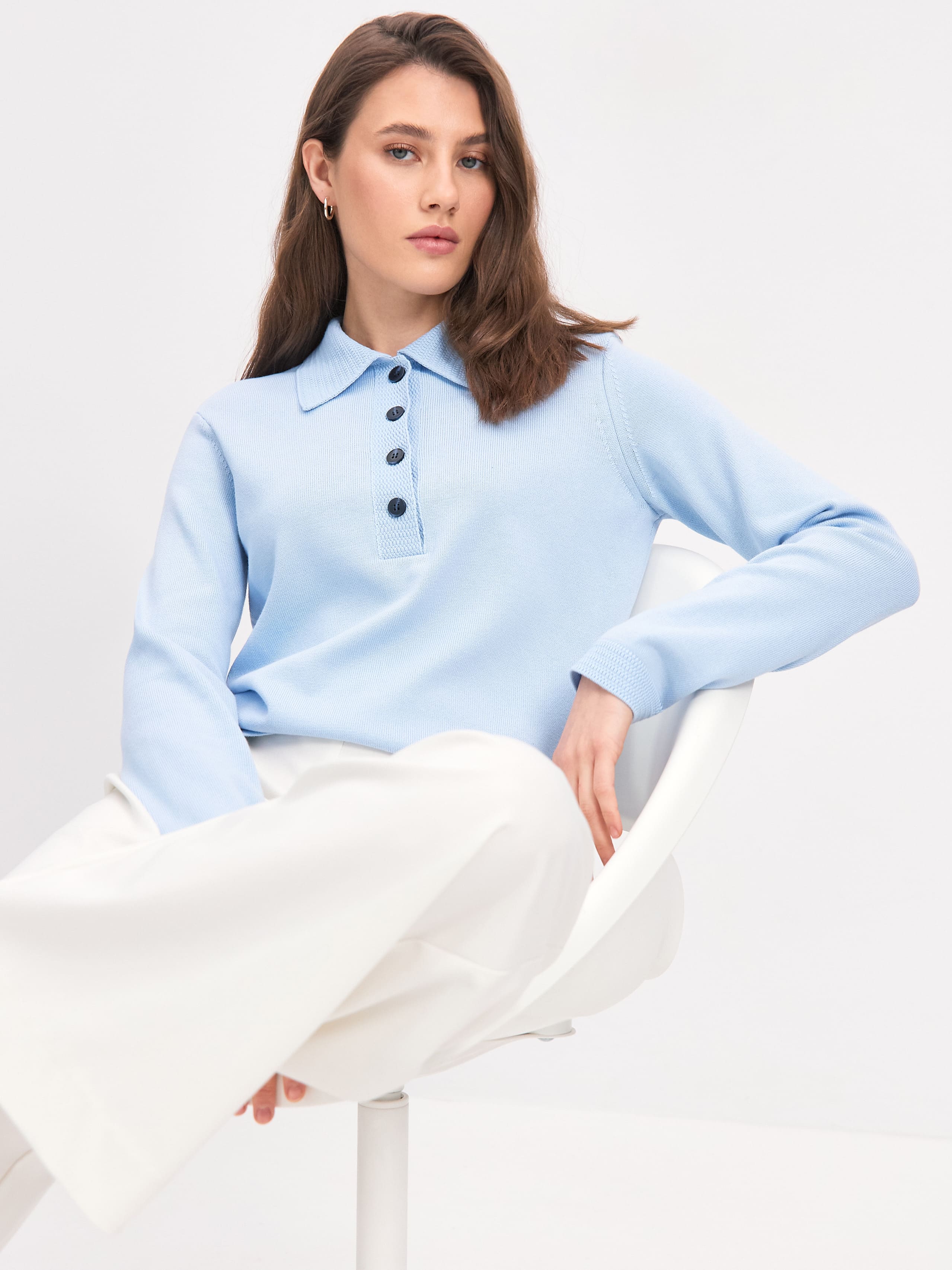 Аккуратный вязаный джемпер-поло с натуральным хлопком – модная классика, переживающая свой очередной ренессанс. Модель выполнена из высококачественного тактильного трикотажа. Дополнена рукавами полноценной длины, крупными пластиковыми пуговицами и уплотненной отделкой краев. Трикотажное полотно сохраняет структуру и остается умеренно эластичным, благодаря полиамиду, что способствует правильной посадке изделия по фигуре.