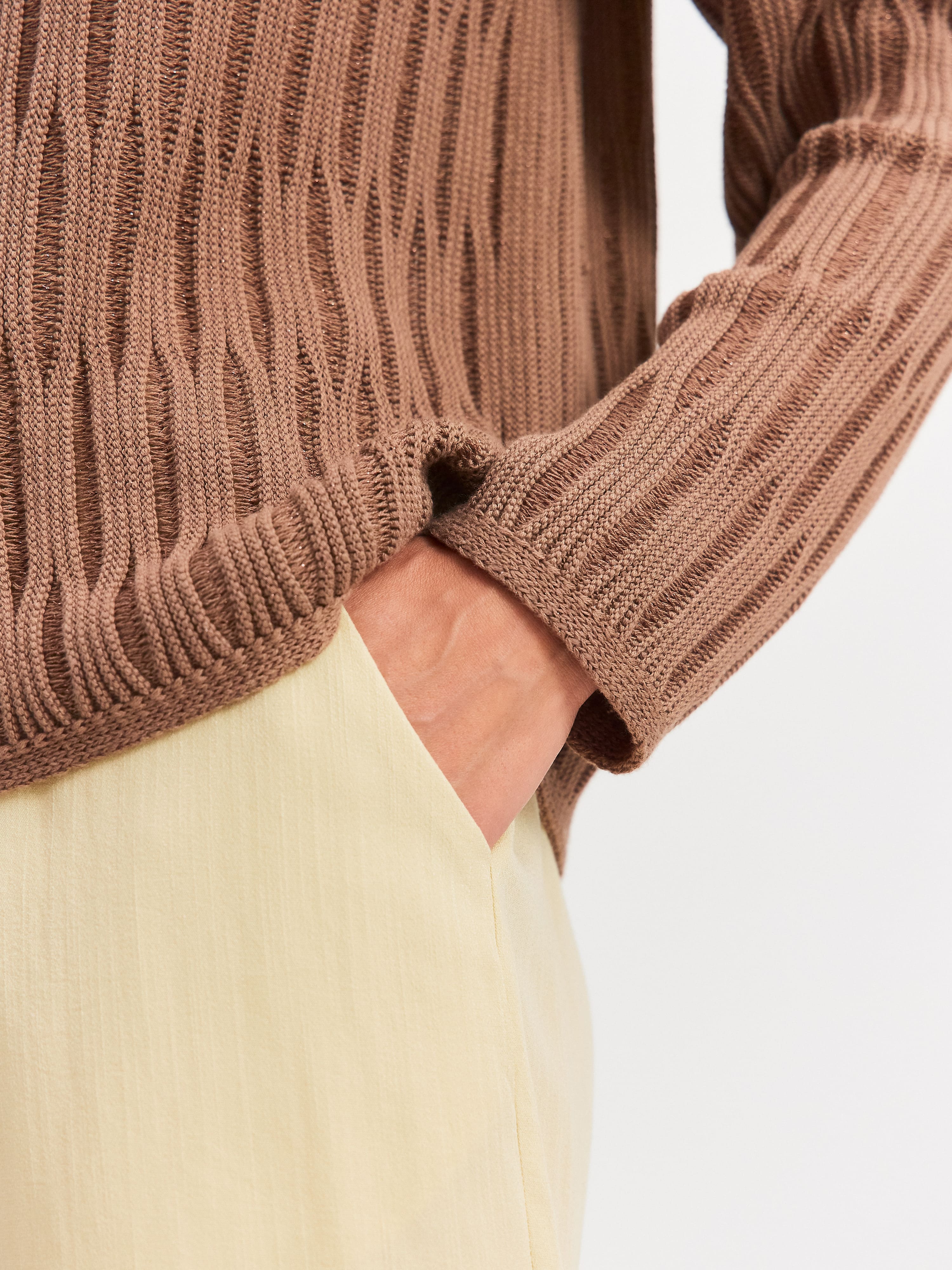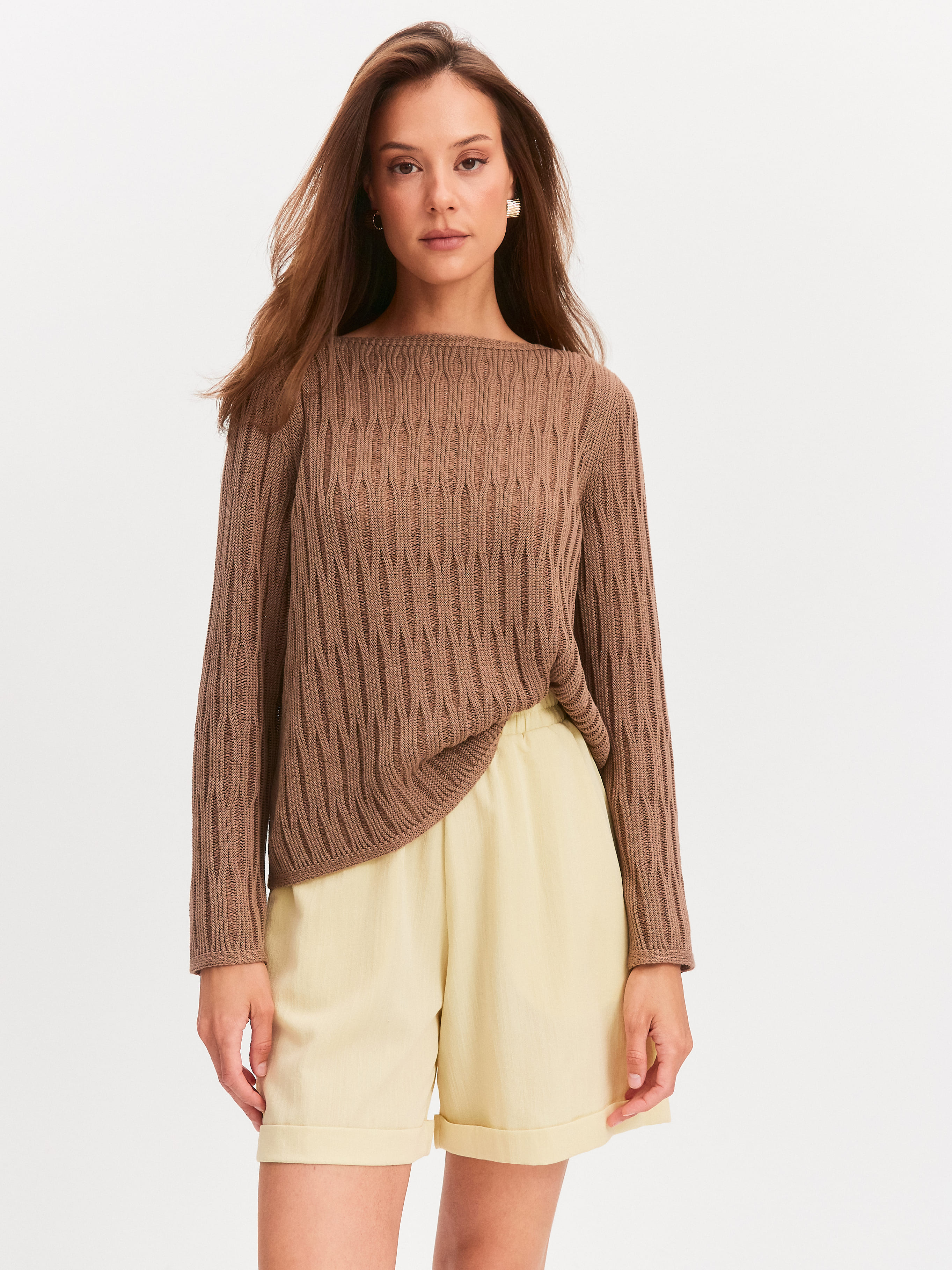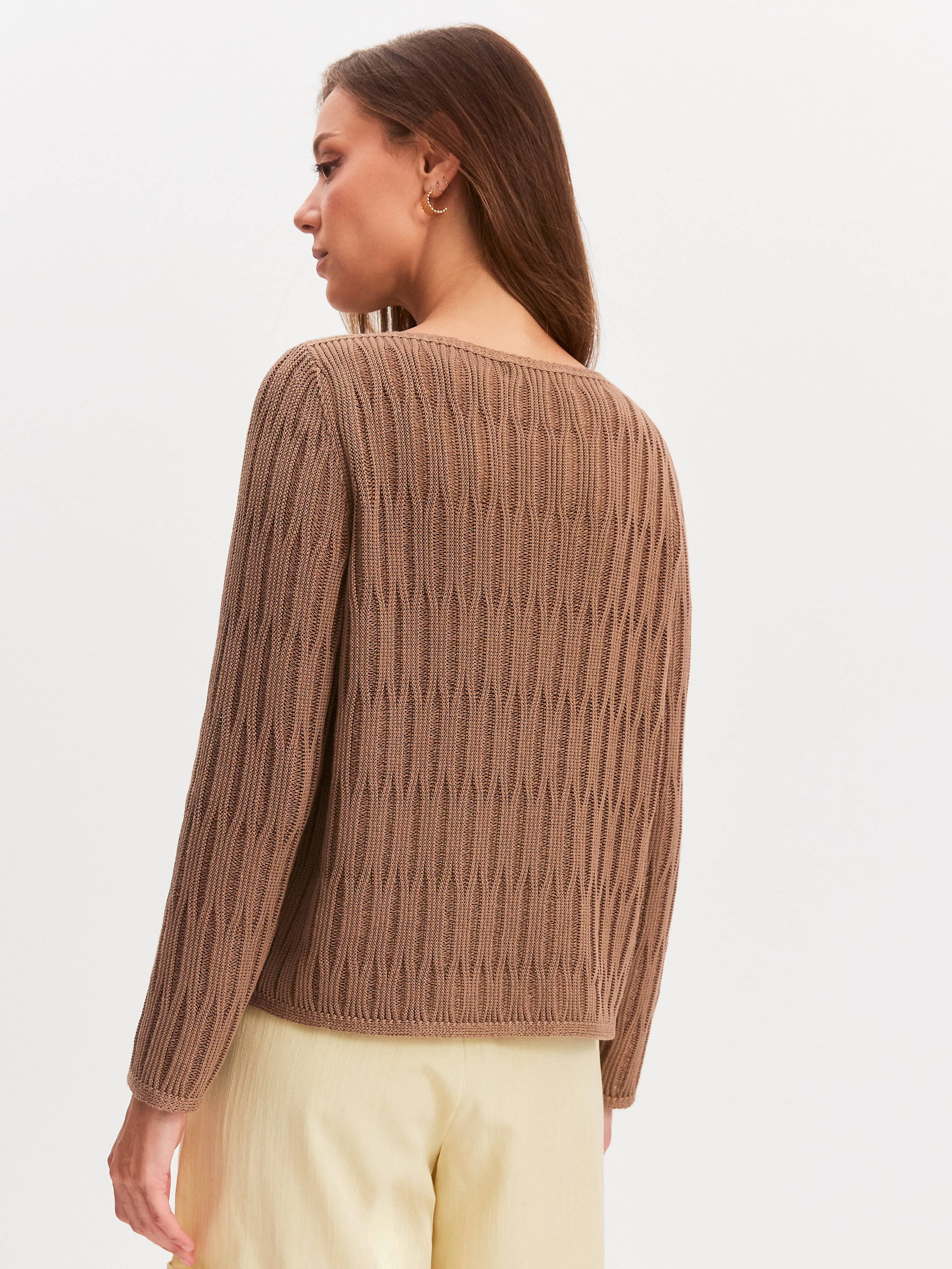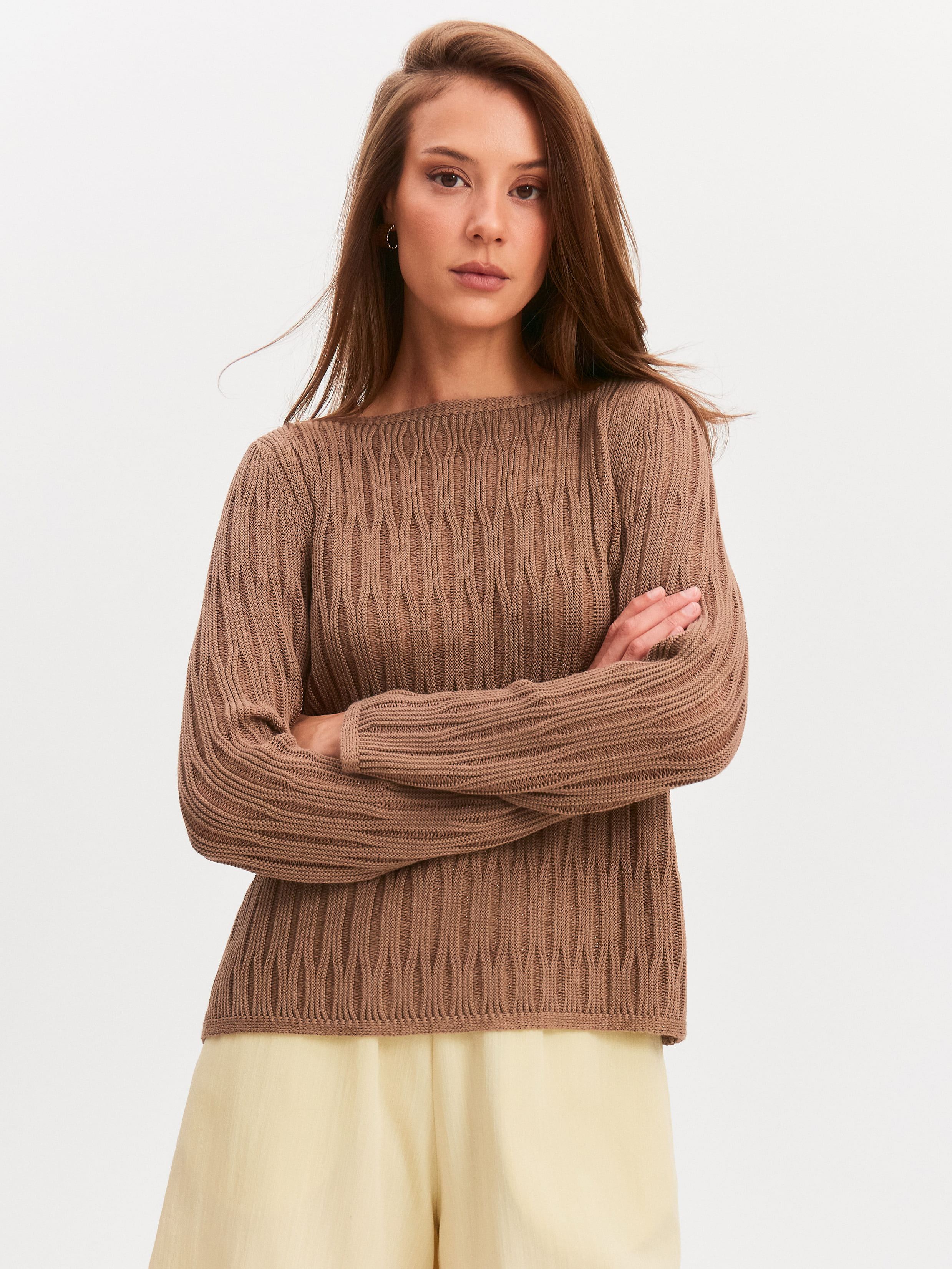 Авторская модель джемпера, образы с которой мгновенно считываются как уникальные. Главное средство выразительности здесь – объемный шнуровидный узор. Сквозь верхнюю часть рисунка отчетливо просматривается сетчатое переплетение основы. Модель свободного кроя, прекрасно вписывается в любые летние стилизации за счет натурального состава. Трикотаж полноценно дышит и охлаждает разгоряченную кожу, благодаря сочетанию тонкого хлопка и вискозы.
