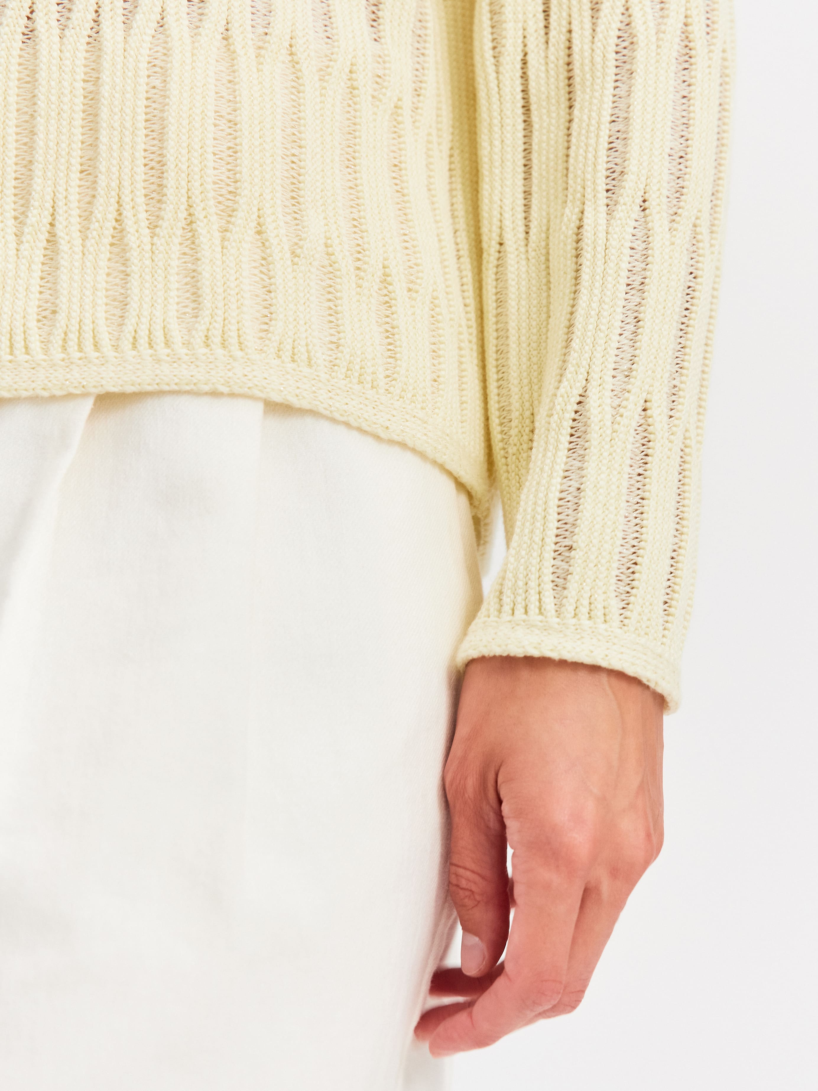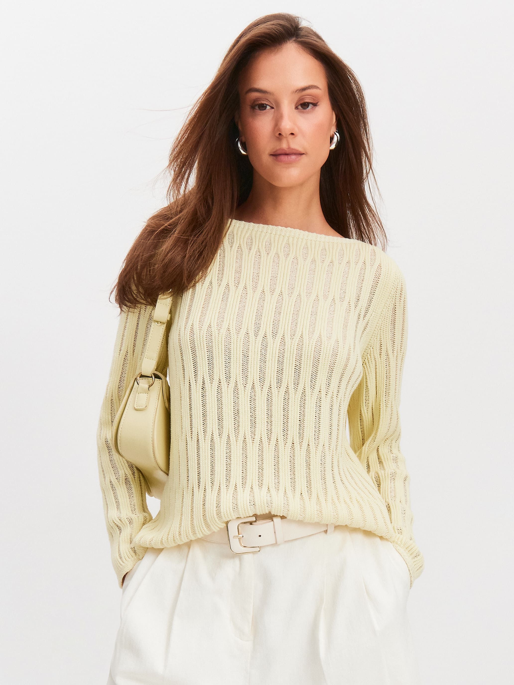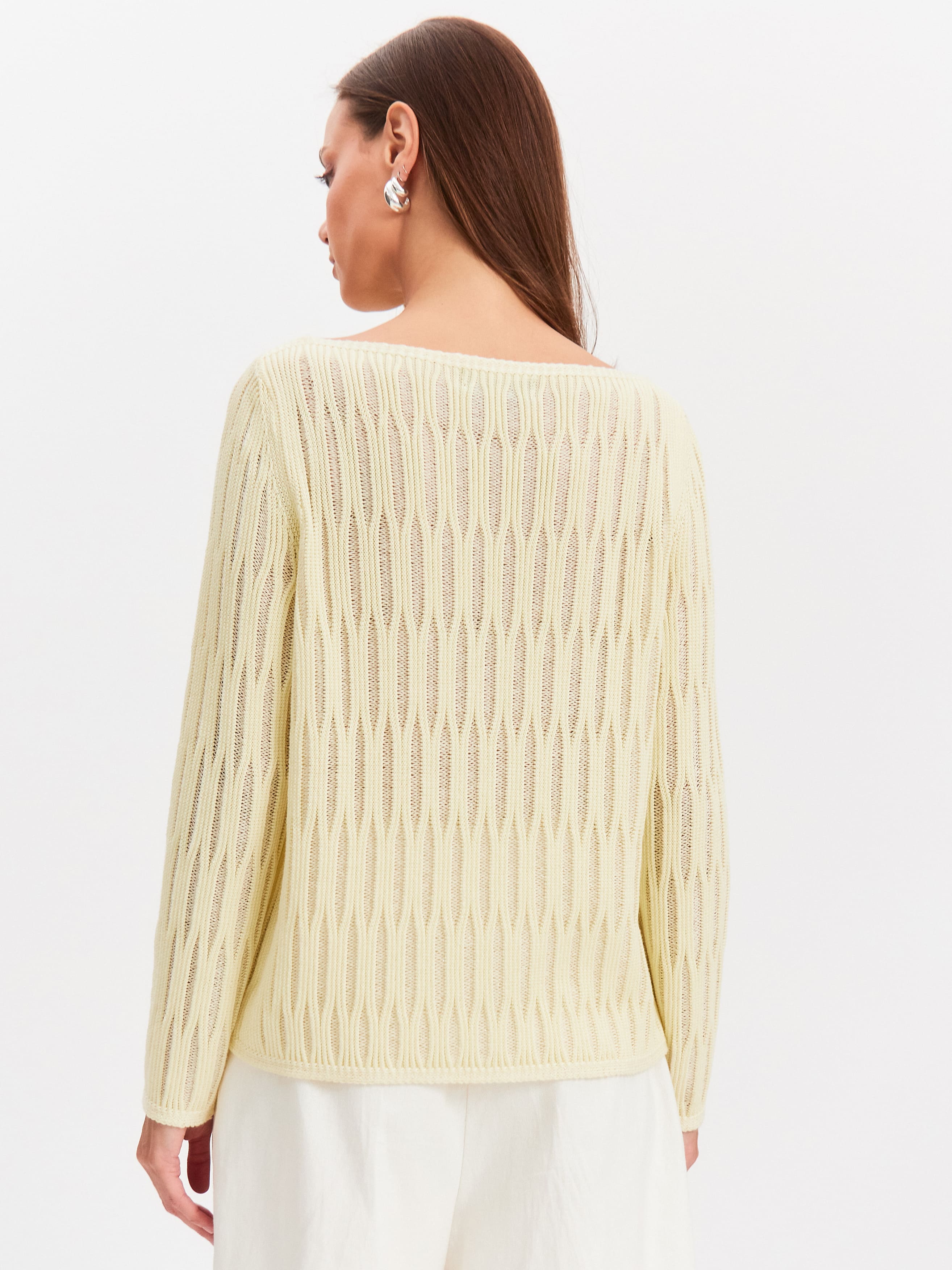 Авторская модель джемпера, образы с которой мгновенно считываются как уникальные. Главное средство выразительности здесь – объемный шнуровидный узор. Сквозь верхнюю часть рисунка отчетливо просматривается сетчатое переплетение основы. Модель свободного кроя, прекрасно вписывается в любые летние стилизации за счет натурального состава. Трикотаж полноценно дышит и охлаждает разгоряченную кожу, благодаря сочетанию тонкого хлопка и вискозы.