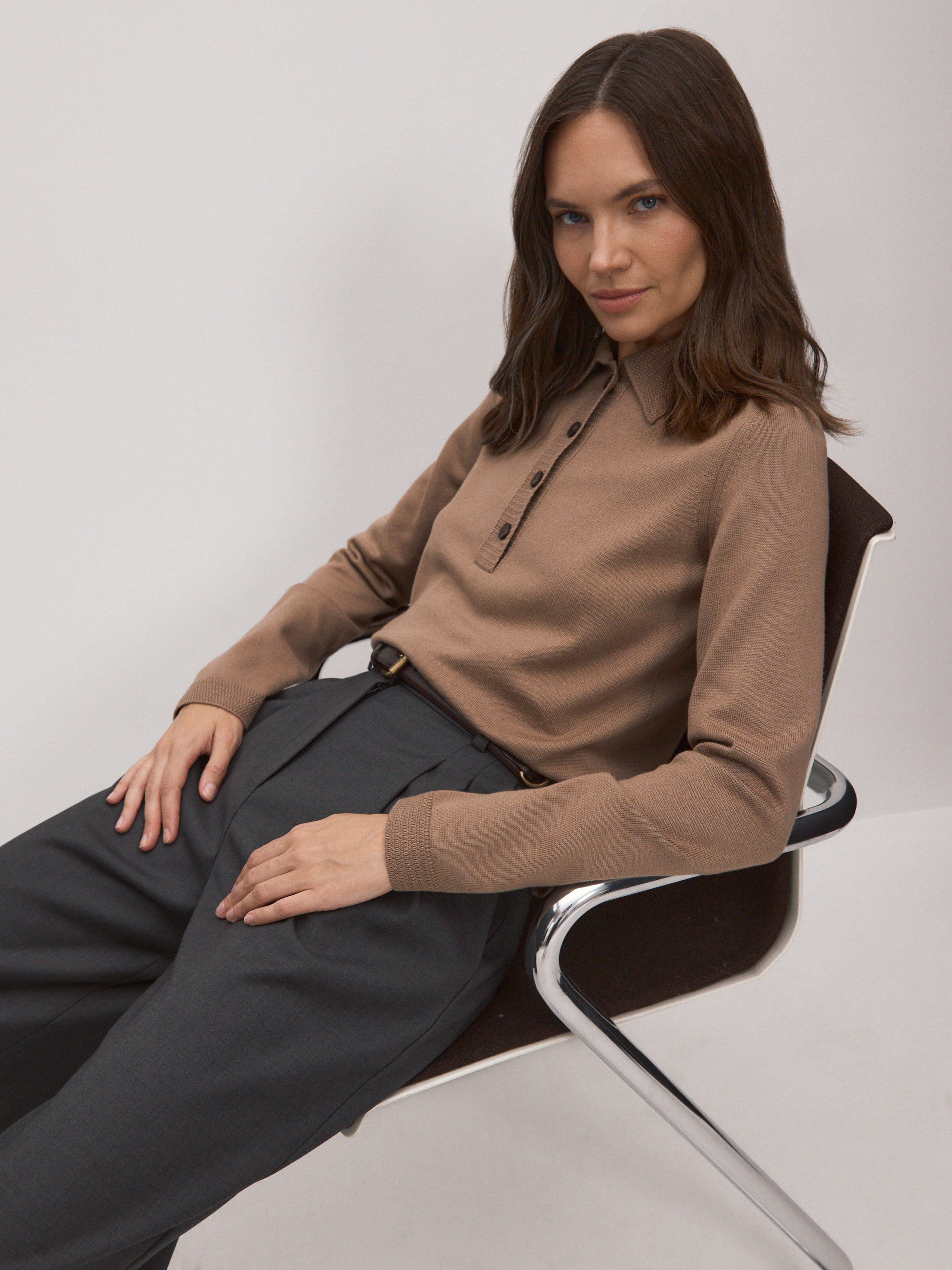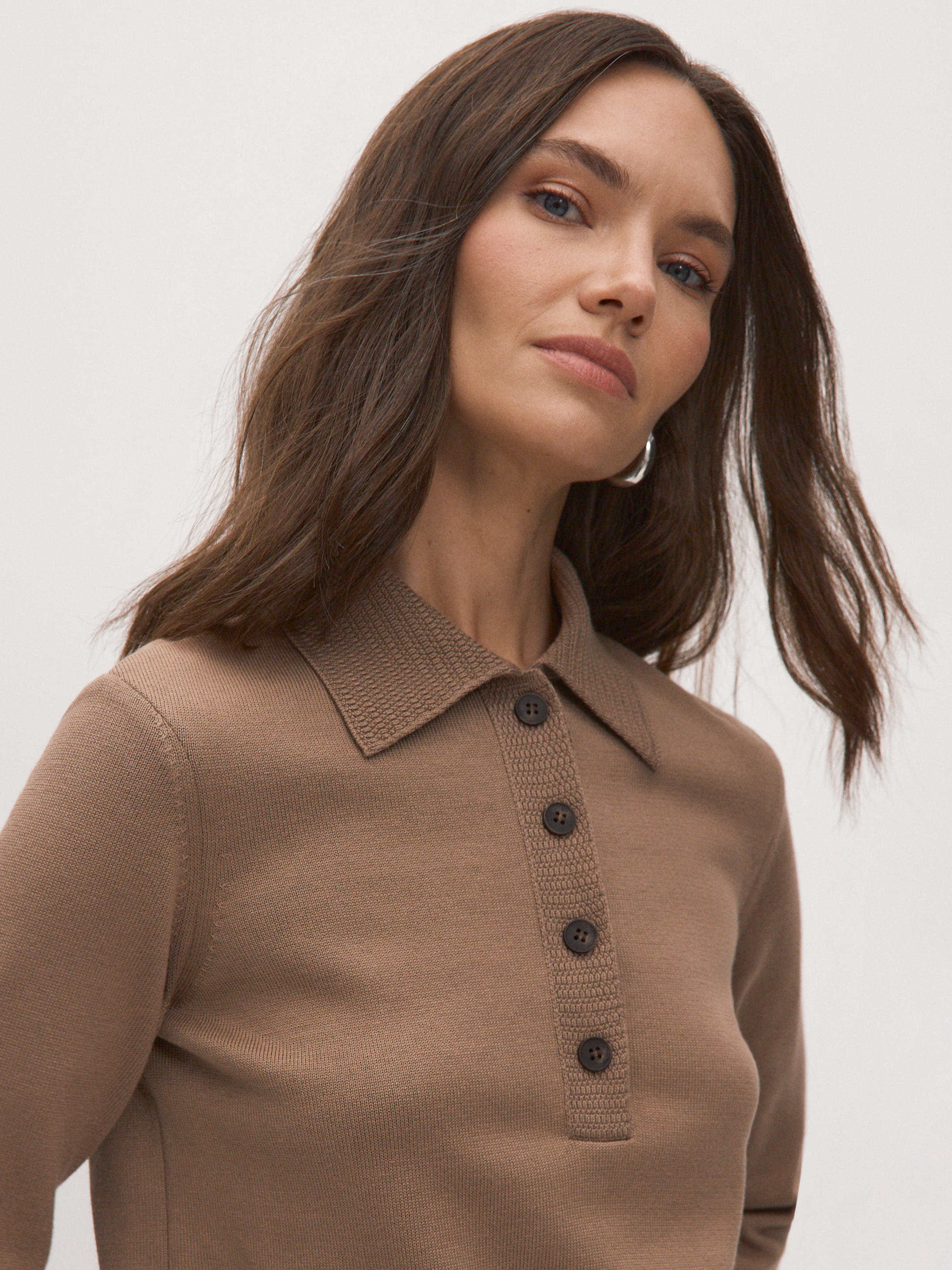 Аккуратный вязаный джемпер-поло с натуральным хлопком – модная классика, переживающая свой очередной ренессанс. Модель выполнена из высококачественного тактильного трикотажа. Дополнена рукавами полноценной длины, крупными пластиковыми пуговицами и уплотненной отделкой краев. Трикотажное полотно сохраняет структуру и остается умеренно эластичным, благодаря полиамиду, что способствует правильной посадке изделия по фигуре.