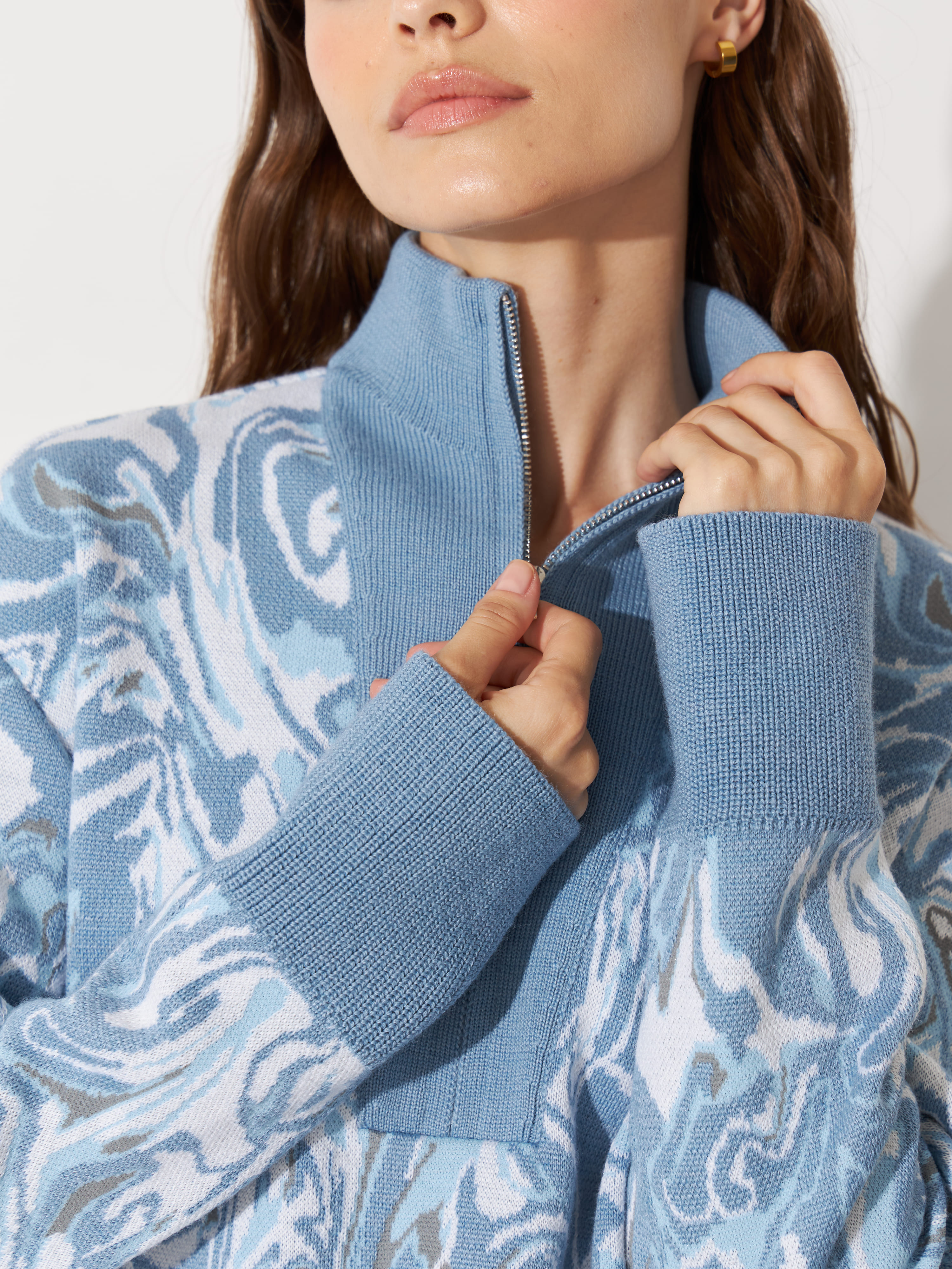 Акцентная дизайнерская модель, секрет привлекательности которой – в контрасте вязальных техник и дополнительно смягченной шерсти. Жаккардовая абстракция играет на выразительность образа, а мягкая отделка резинкой сохраняет форму вещи. Прекрасно смотрится в комбинациях с брюками палаццо и любым однотонным трикотажем из коллекции бренда.