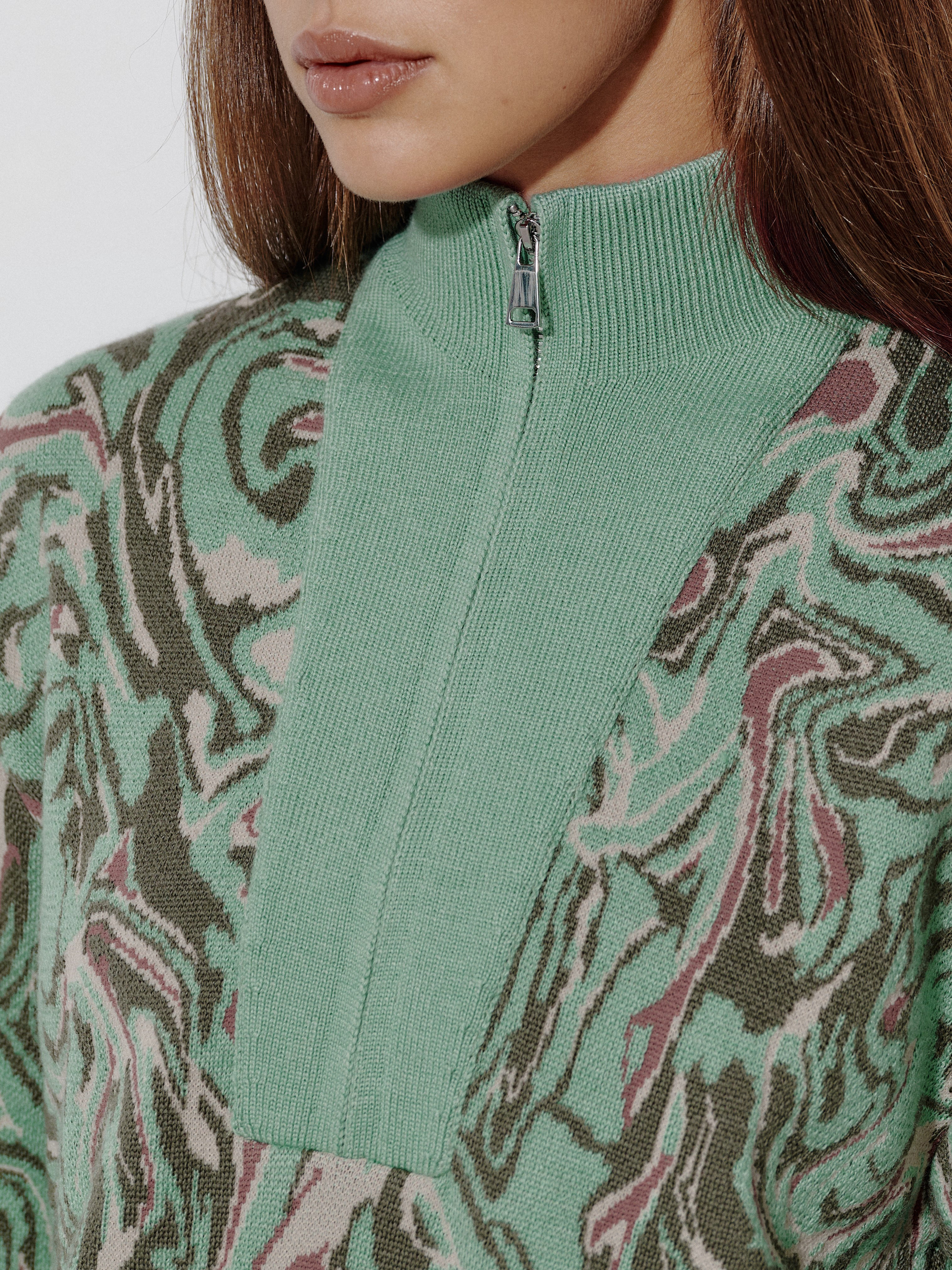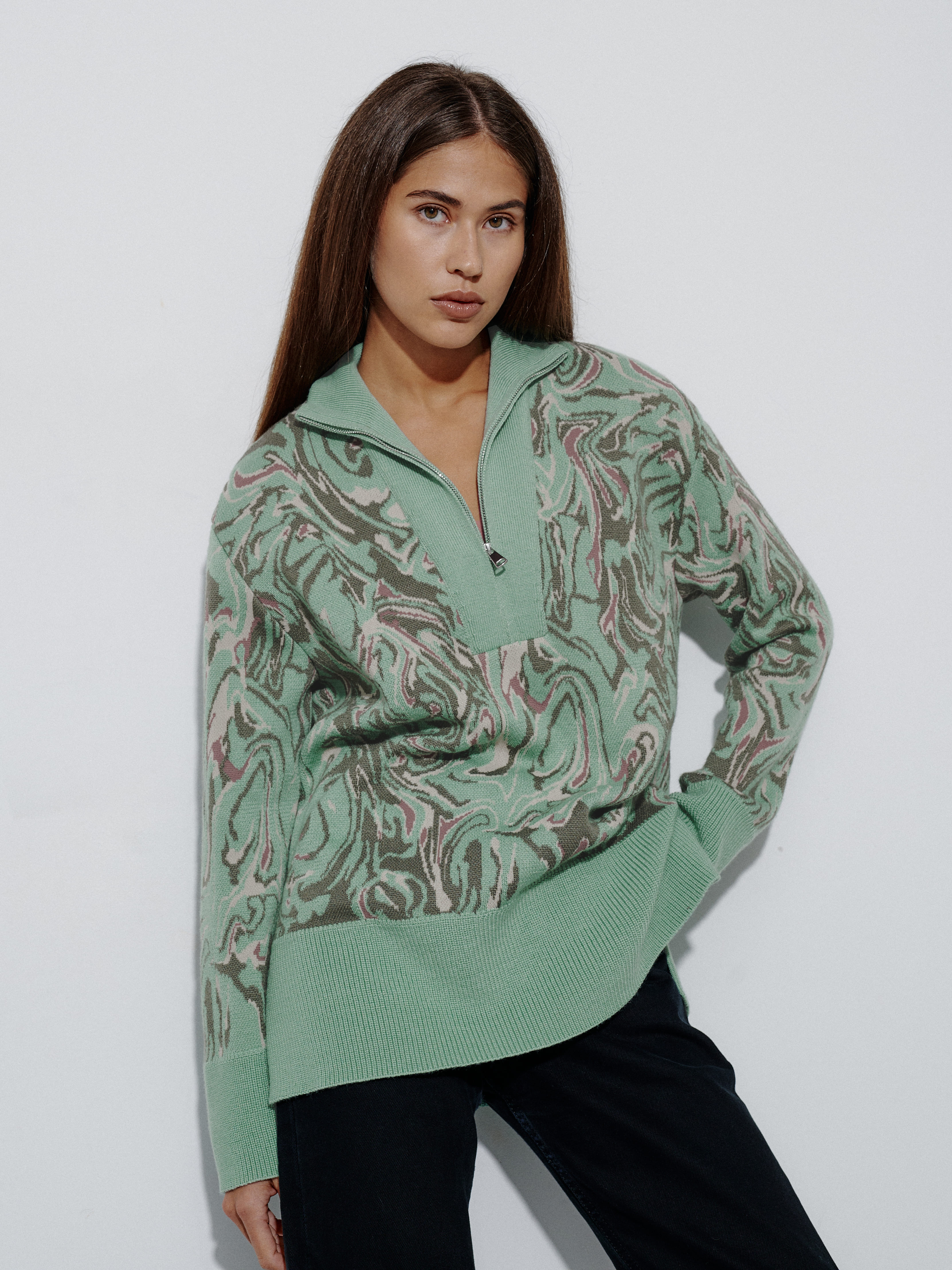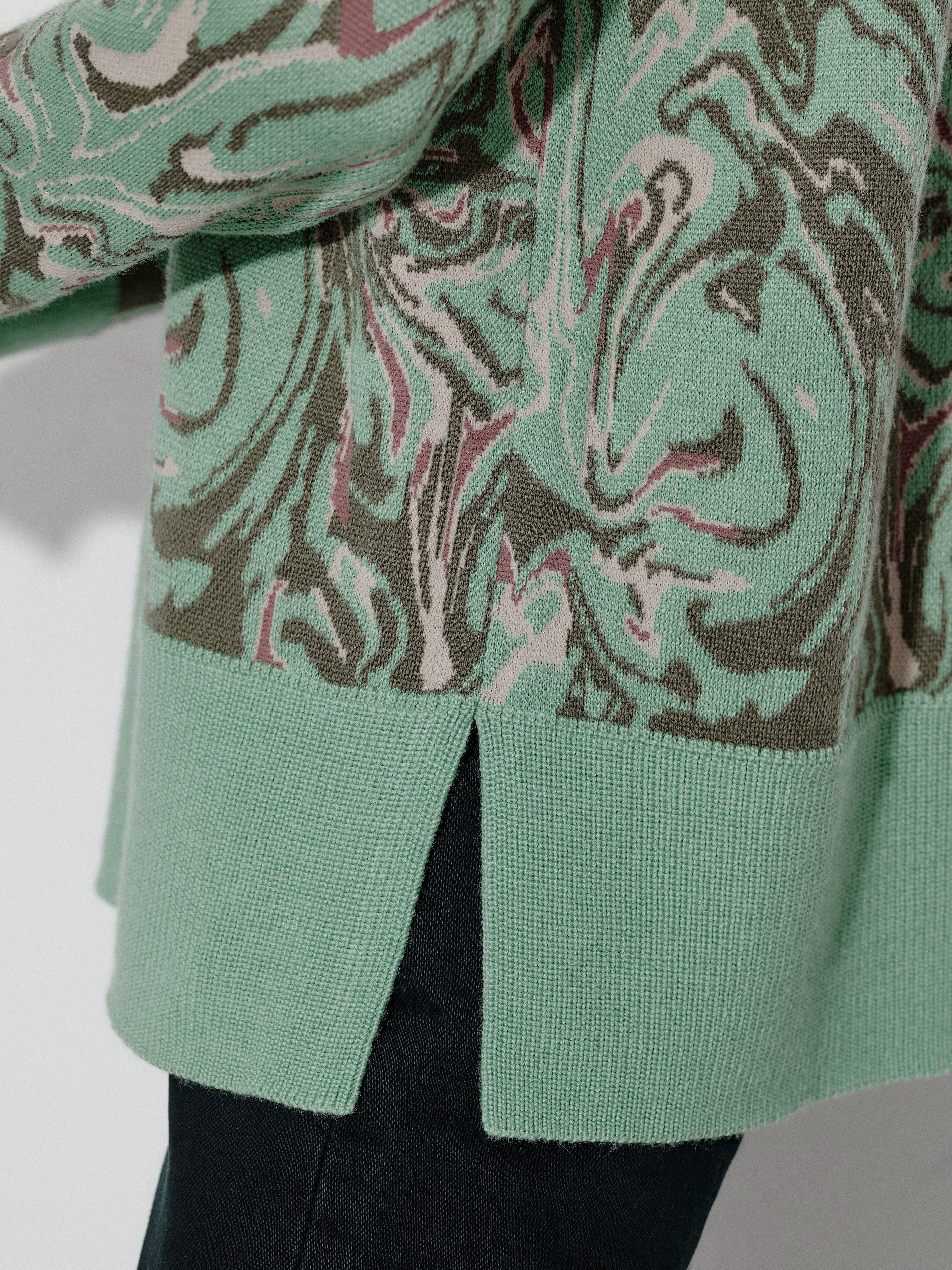 Акцентная дизайнерская модель, секрет привлекательности которой – в контрасте вязальных техник и дополнительно смягченной шерсти. Жаккардовая абстракция играет на выразительность образа, а мягкая отделка резинкой сохраняет форму вещи. Прекрасно смотрится в комбинациях с брюками палаццо и любым однотонным трикотажем из коллекции бренда.