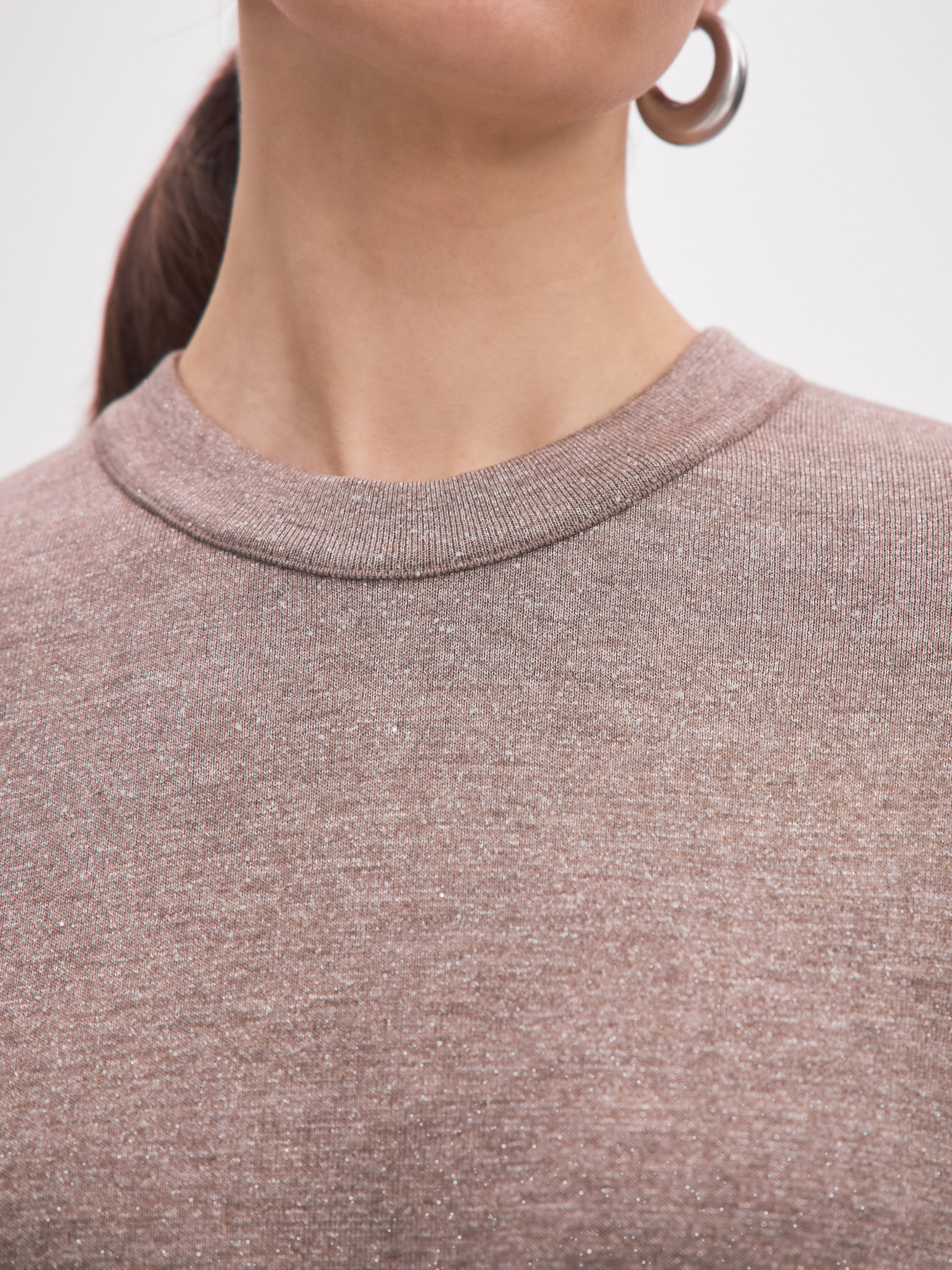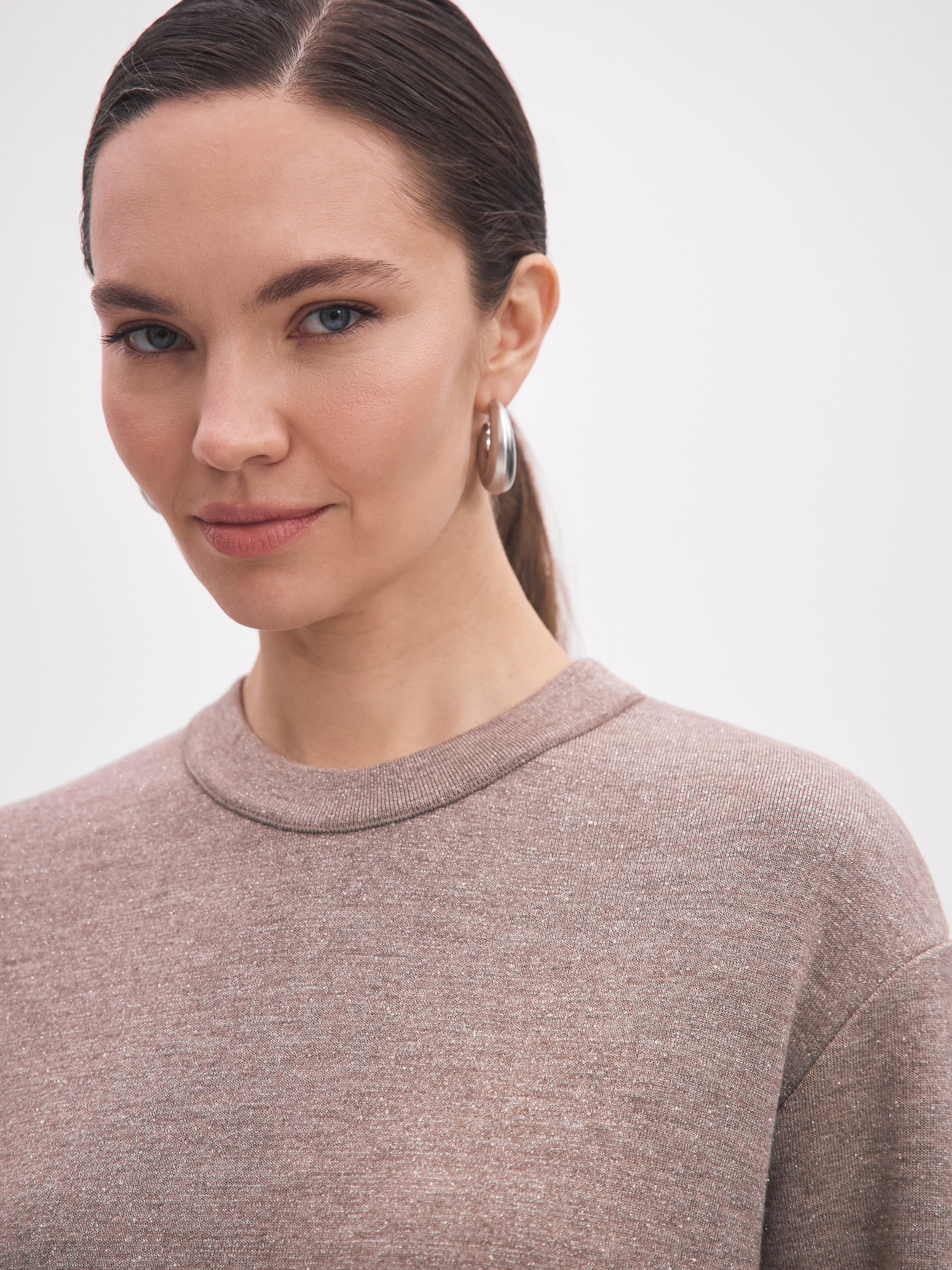 Свободный джемпер для особенных поводов, в котором уютное тепло шерсти и нежная прохлада вискозы смешиваются с деликатным сиянием люрекса. Идеальный вариант для любой вечеринки, где подразумеваются танцы. Модель имеет непринужденный силуэт за счет приспущенного плеча и высоких манжет. Детали фасона: круглая пришивная горловина и оформленный широкой расслабленной резинкой низ. Как и в остальных моделях новогодней коллекции, в этом джемпере используется самый тактильный вид люрекса – софт. Его мягкая металлизированная нить не ощущается в трикотажном полотне, поэтому джемпер сохраняет мягкость и комфортную фактуру.