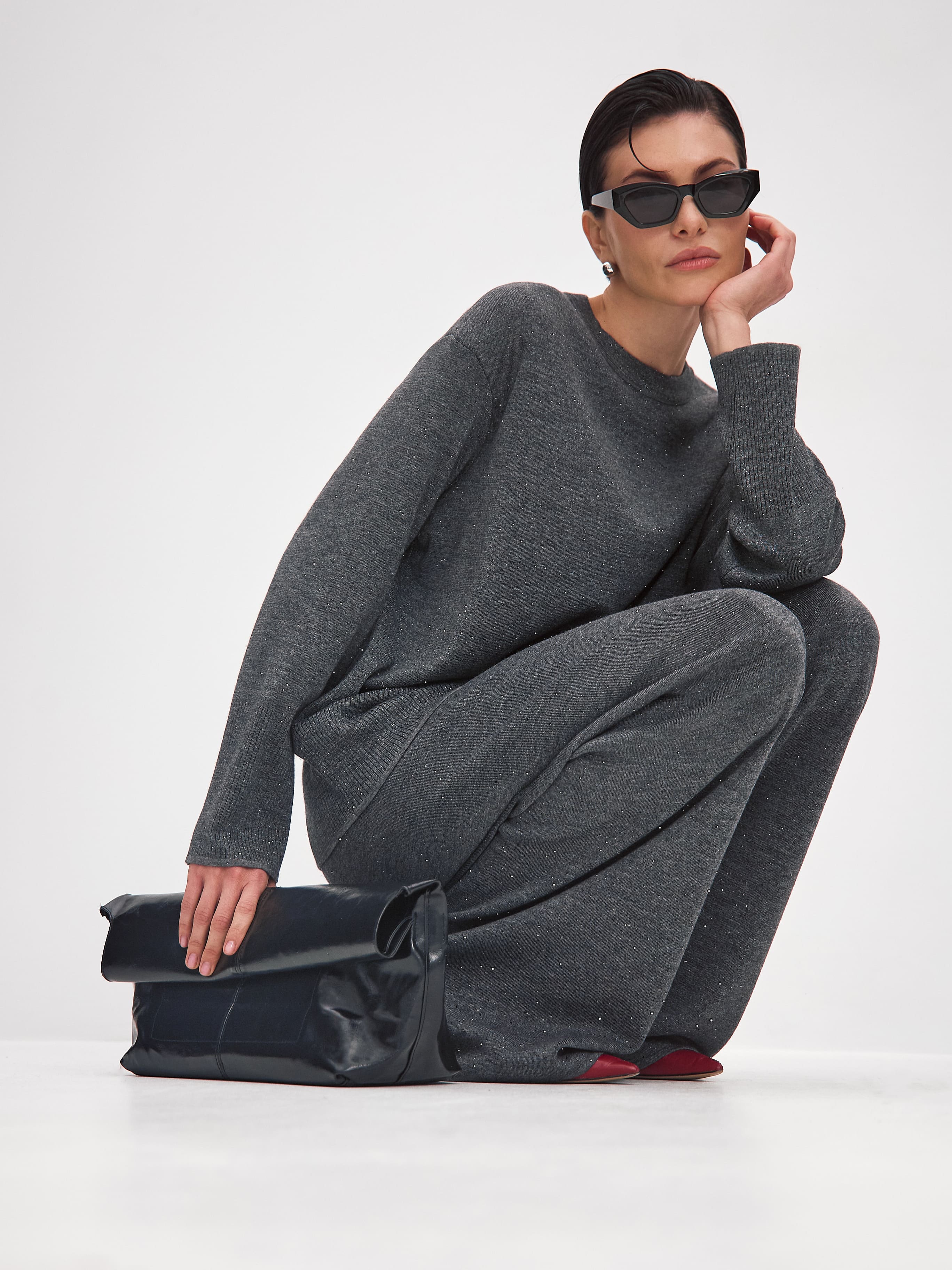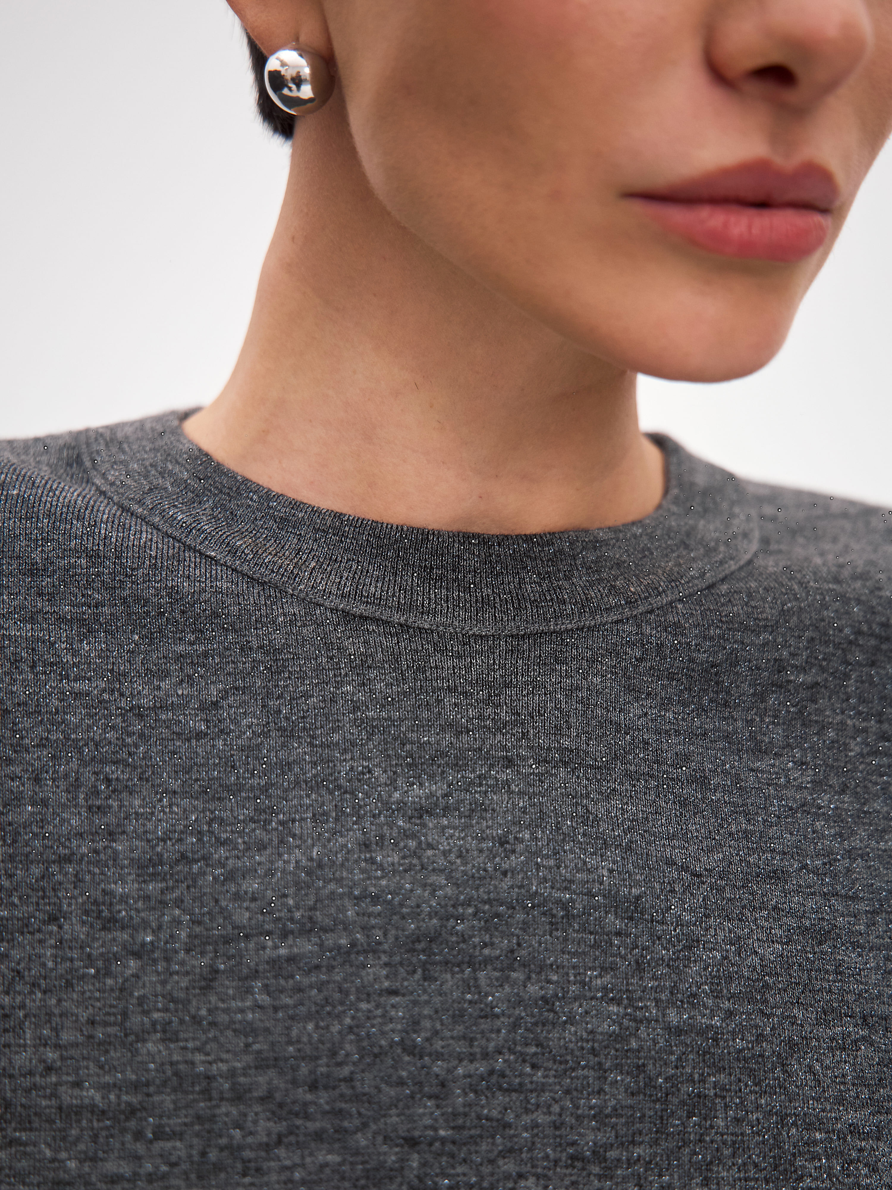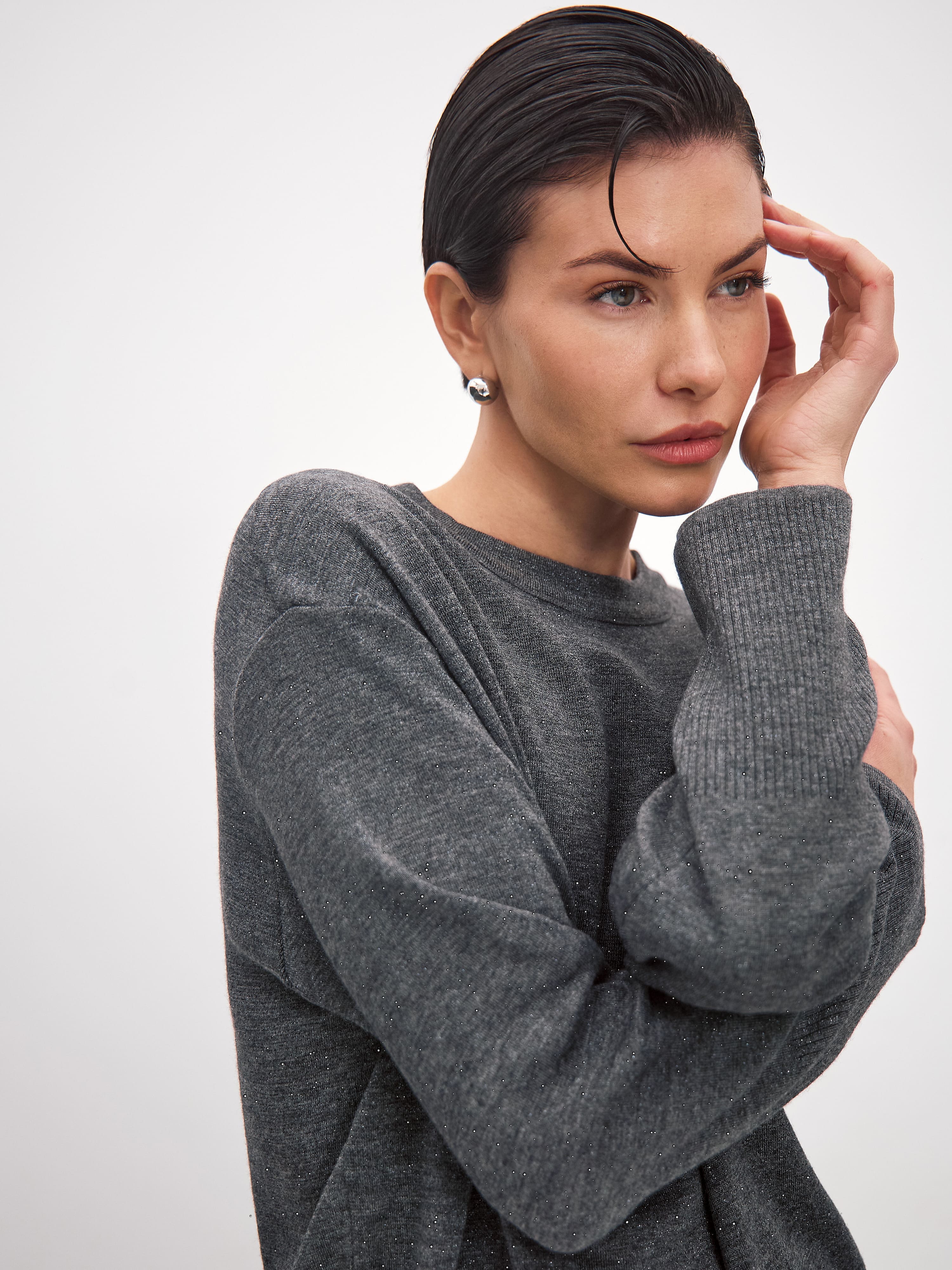 Свободный джемпер для особенных поводов, в котором уютное тепло шерсти и нежная прохлада вискозы смешиваются с деликатным сиянием люрекса. Идеальный вариант для любой вечеринки, где подразумеваются танцы. Модель имеет непринужденный силуэт за счет приспущенного плеча и высоких манжет. Детали фасона: круглая пришивная горловина и оформленный широкой расслабленной резинкой низ. Как и в остальных моделях новогодней коллекции, в этом джемпере используется самый тактильный вид люрекса – софт. Его мягкая металлизированная нить не ощущается в трикотажном полотне, поэтому джемпер сохраняет мягкость и комфортную фактуру.