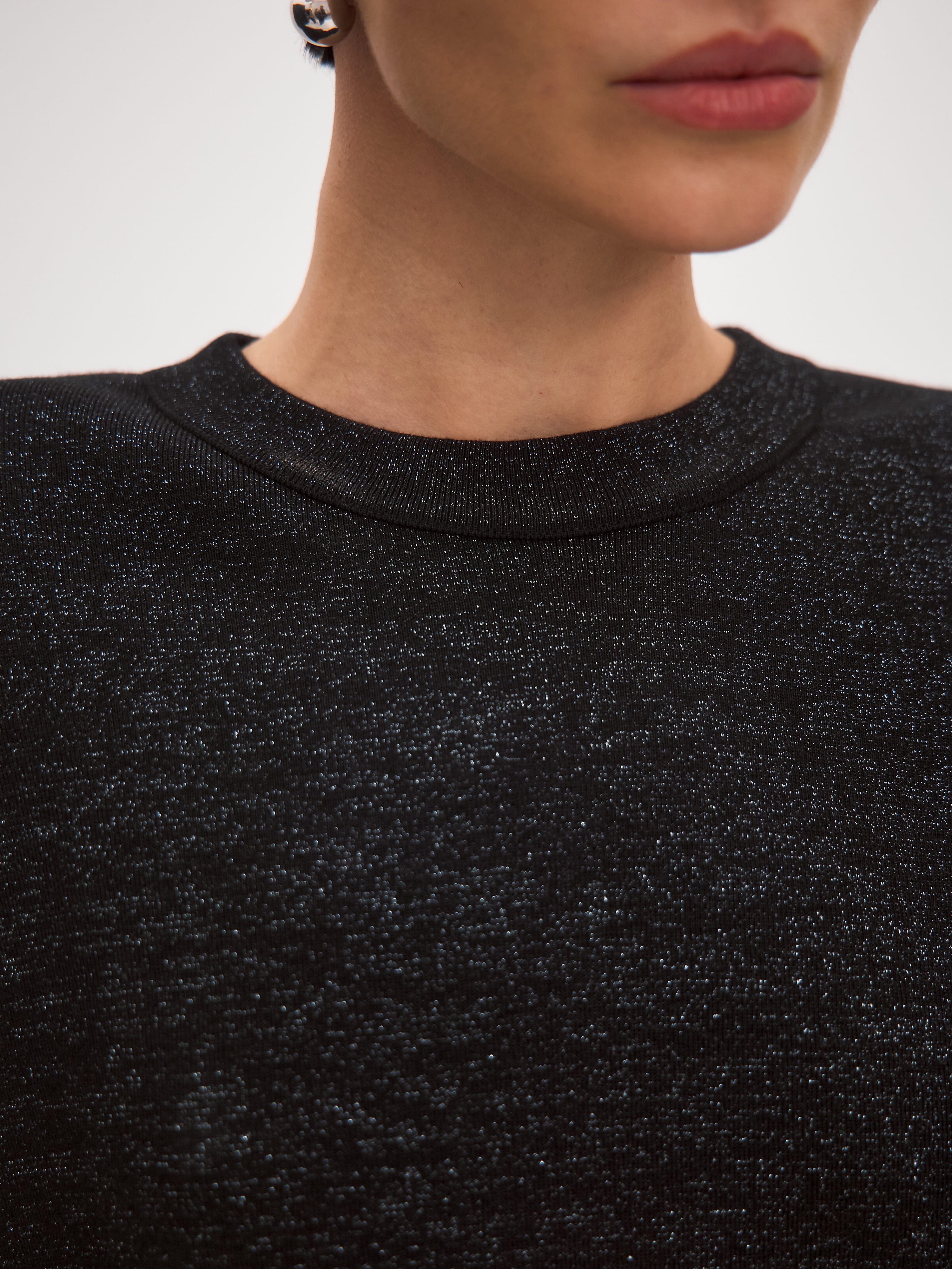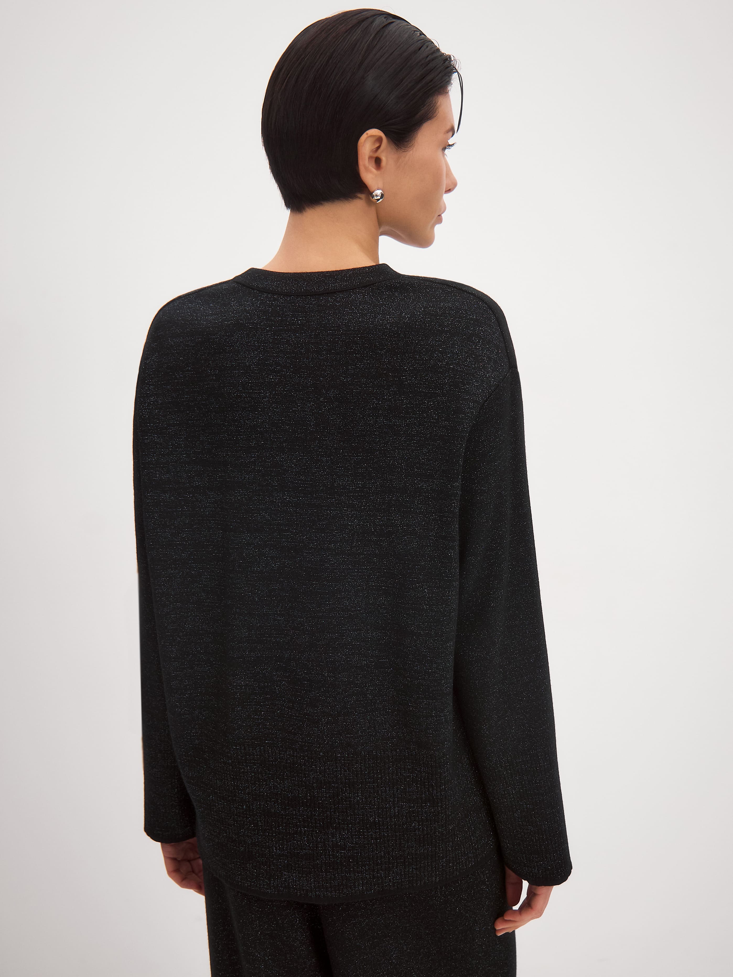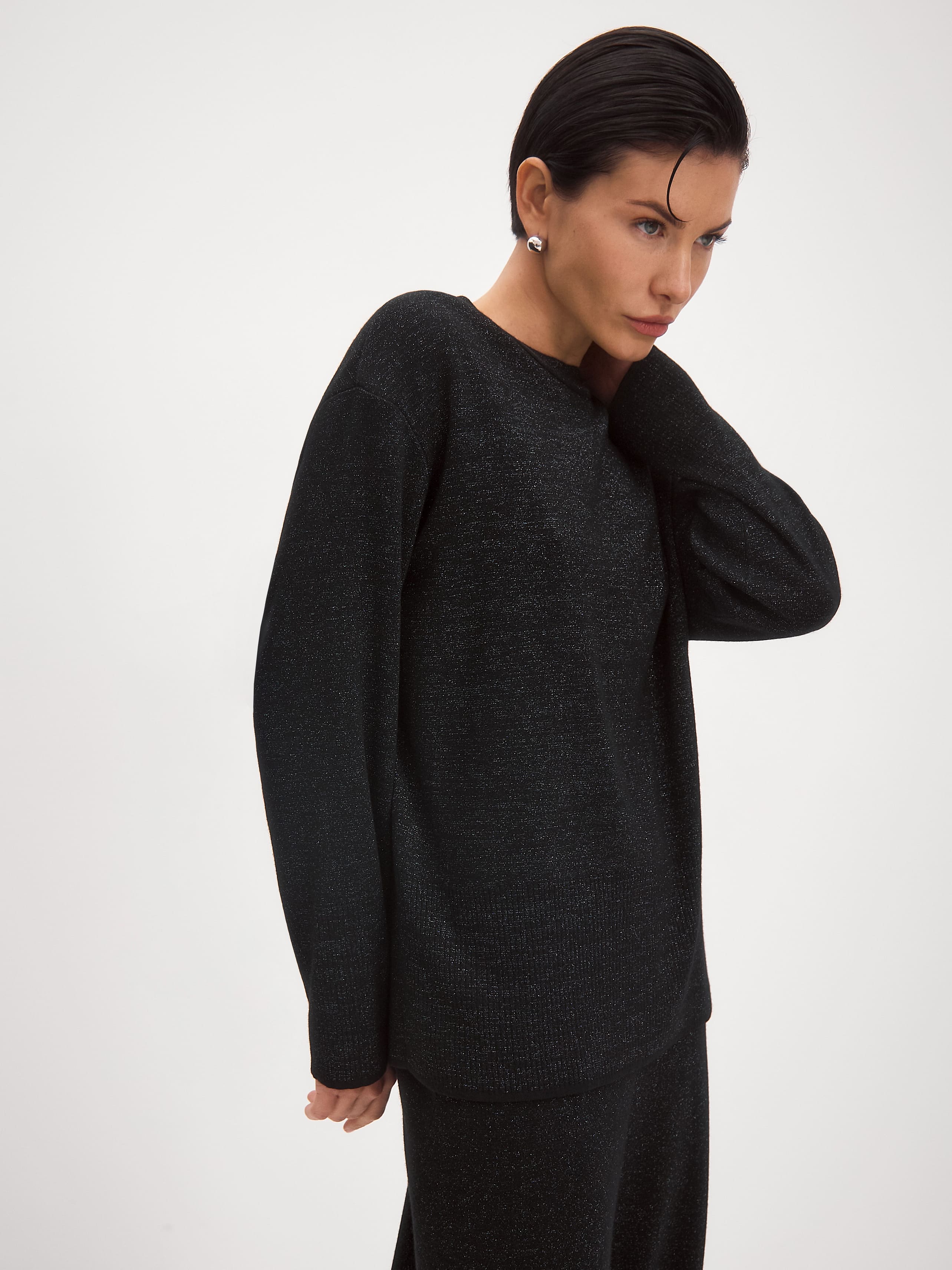 Свободный джемпер для особенных поводов, в котором уютное тепло шерсти и нежная прохлада вискозы смешиваются с деликатным сиянием люрекса. Идеальный вариант для любой вечеринки, где подразумеваются танцы. Модель имеет непринужденный силуэт за счет приспущенного плеча и высоких манжет. Детали фасона: круглая пришивная горловина и оформленный широкой расслабленной резинкой низ. Как и в остальных моделях новогодней коллекции, в этом джемпере используется самый тактильный вид люрекса – софт. Его мягкая металлизированная нить не ощущается в трикотажном полотне, поэтому джемпер сохраняет мягкость и комфортную фактуру.