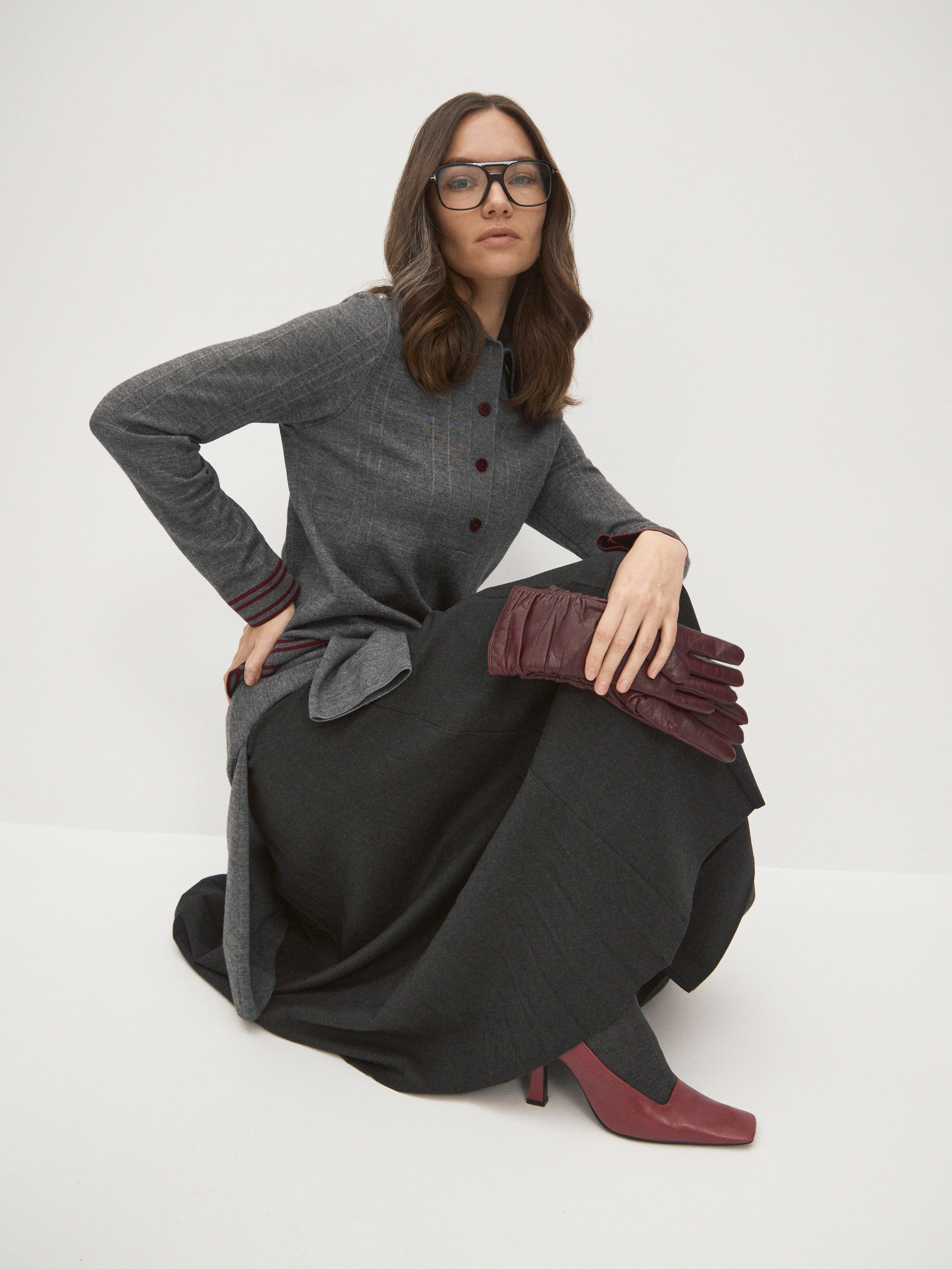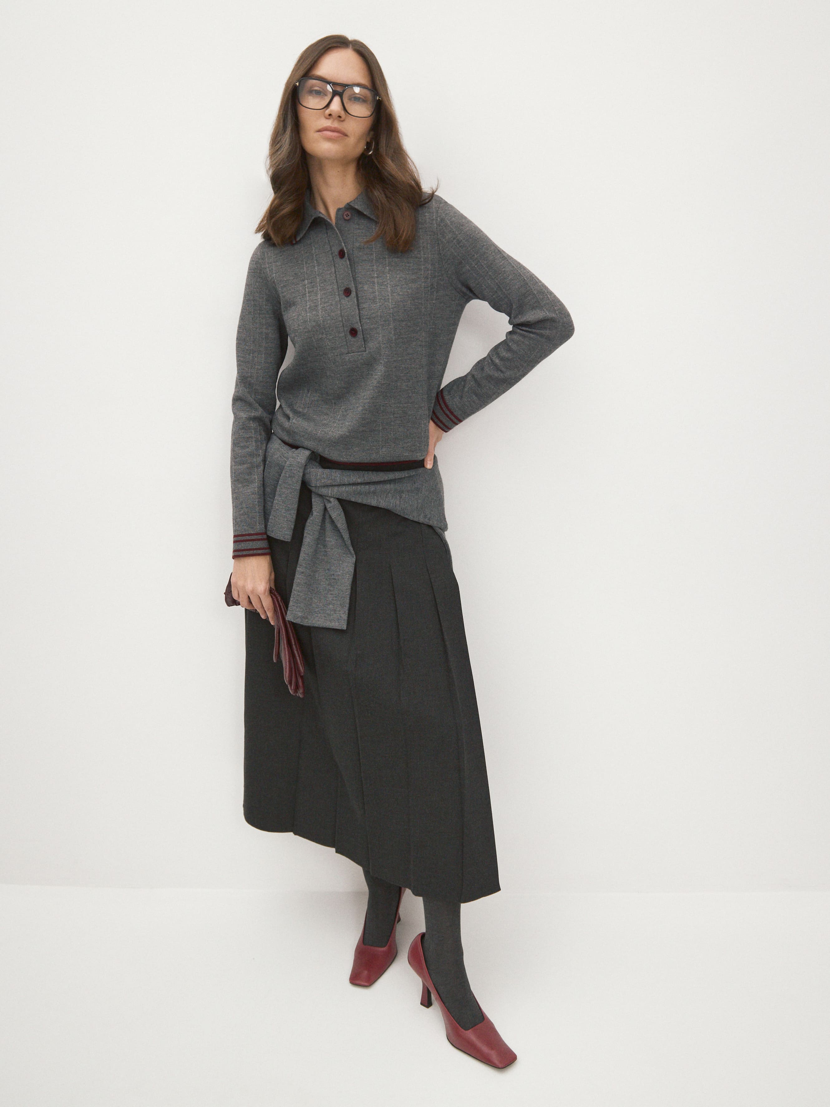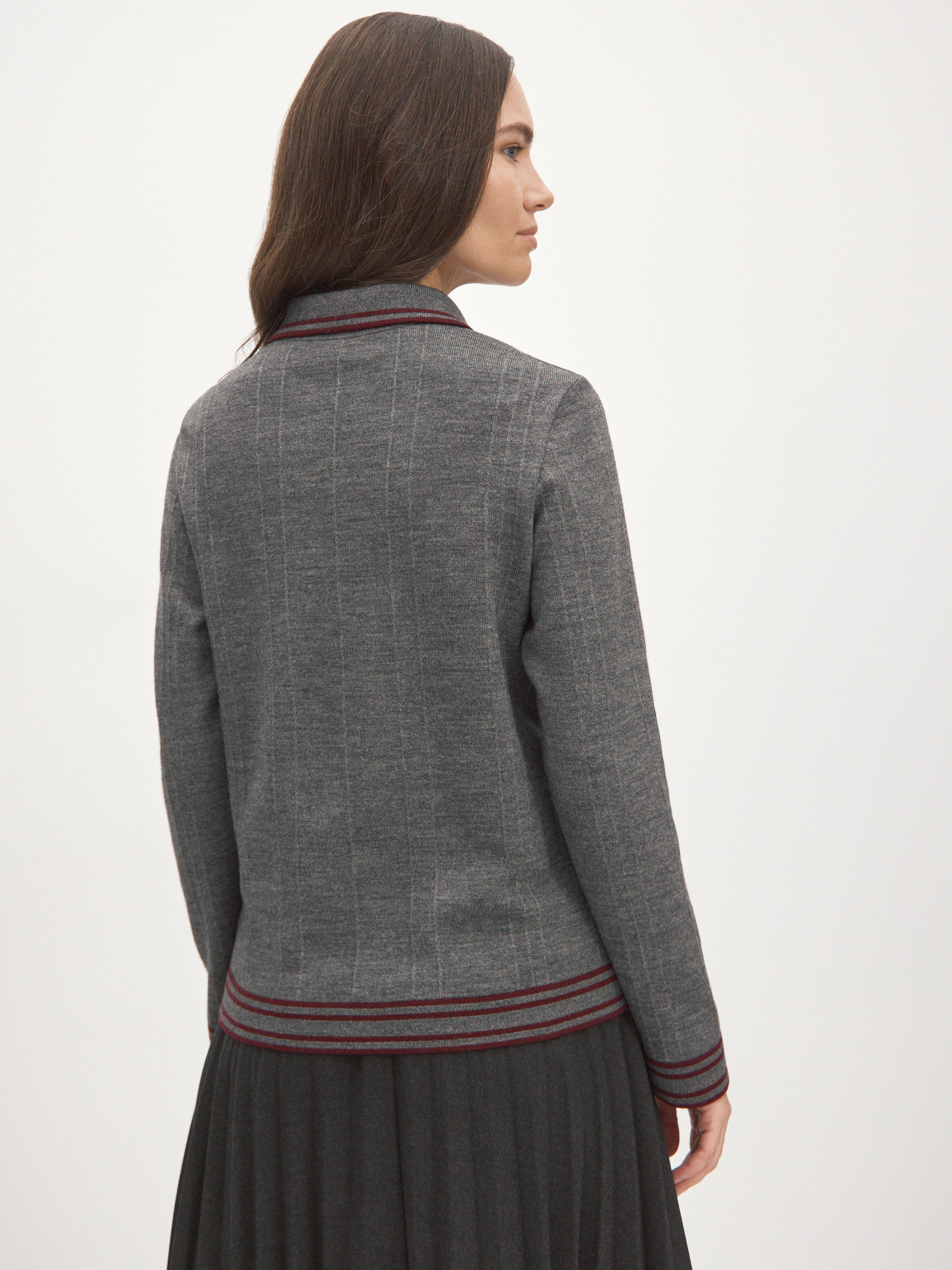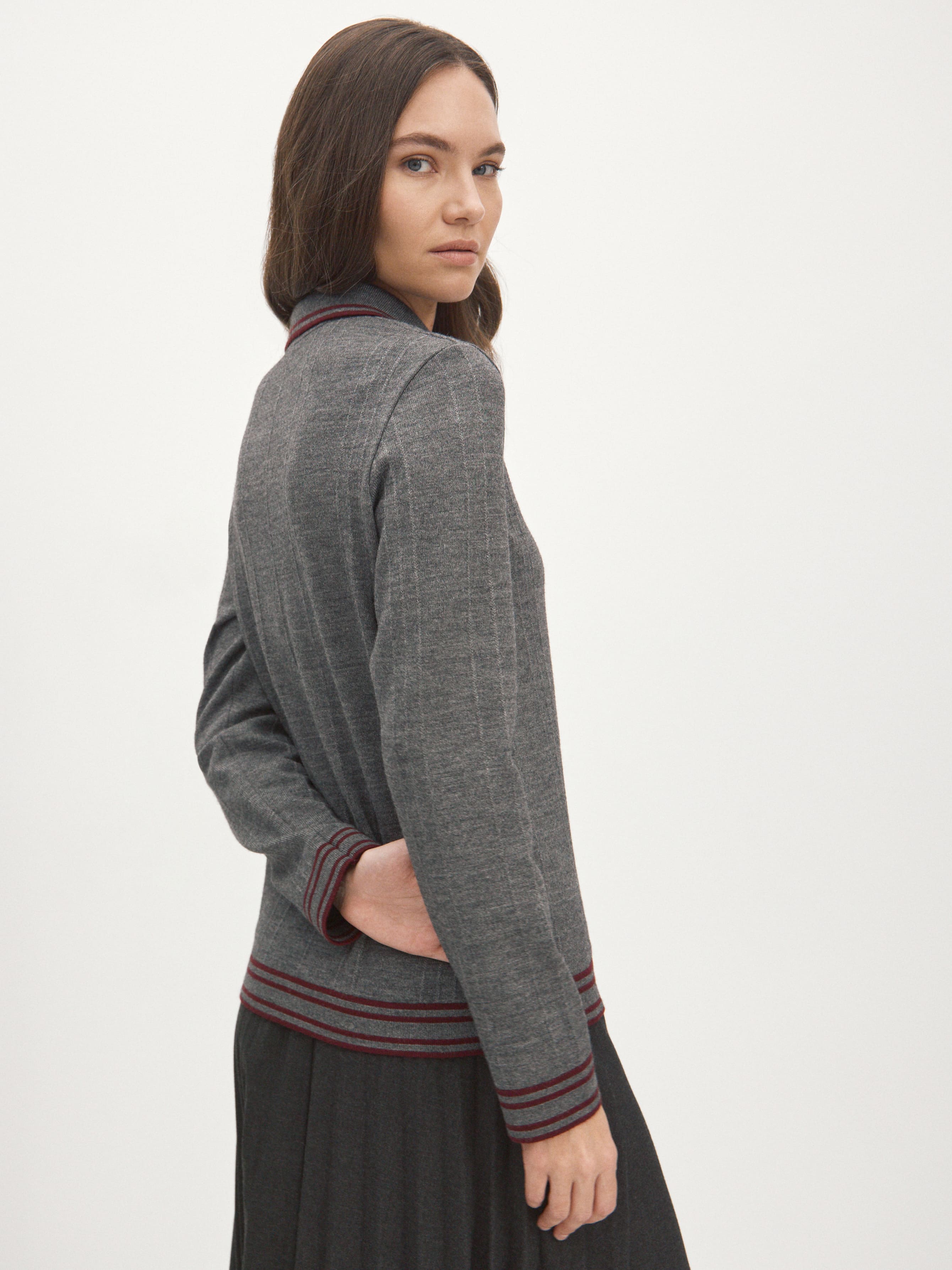 Джемпер прямого силуэта в эстетике легендарных рубашек поло и теннисных футболок. Декорирован дублирующейся полоской по манжетами, воротничку и краям. От этой модели мы хотели добиться легкого тепла и таких же деликатных прикосновений. В итоге остановили выбор на премиальной пряже из шерсти тонкорунного мериноса, “разбавленной” искусственным шелком (вискозой). Трикотаж с таким составом приобретает особые тактильные свойства. Он становится более плотным, прочным и шелковистым на ощупь. При этом сохраняются все плюсы натуральной шерсти. Формальность образа корректируется рядом крупных пуговиц – джемпер можно чуть расстегнуть или выбрать максимально закрытый стиль.