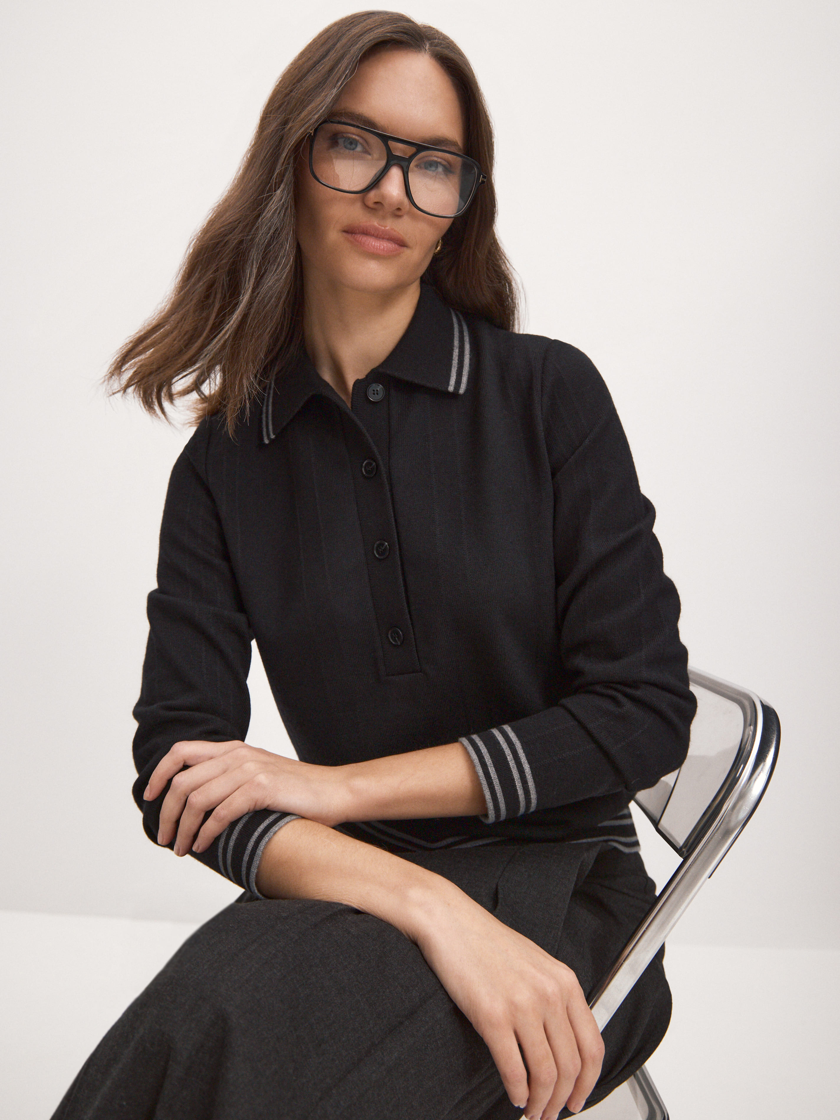Джемпер прямого силуэта в эстетике легендарных рубашек поло и теннисных футболок. Декорирован дублирующейся полоской по манжетами, воротничку и краям. От этой модели мы хотели добиться легкого тепла и таких же деликатных прикосновений. В итоге остановили выбор на премиальной пряже из шерсти тонкорунного мериноса, “разбавленной” искусственным шелком (вискозой). Трикотаж с таким составом приобретает особые тактильные свойства. Он становится более плотным, прочным и шелковистым на ощупь. При этом сохраняются все плюсы натуральной шерсти. Формальность образа корректируется рядом крупных пуговиц – джемпер можно чуть расстегнуть или выбрать максимально закрытый стиль.