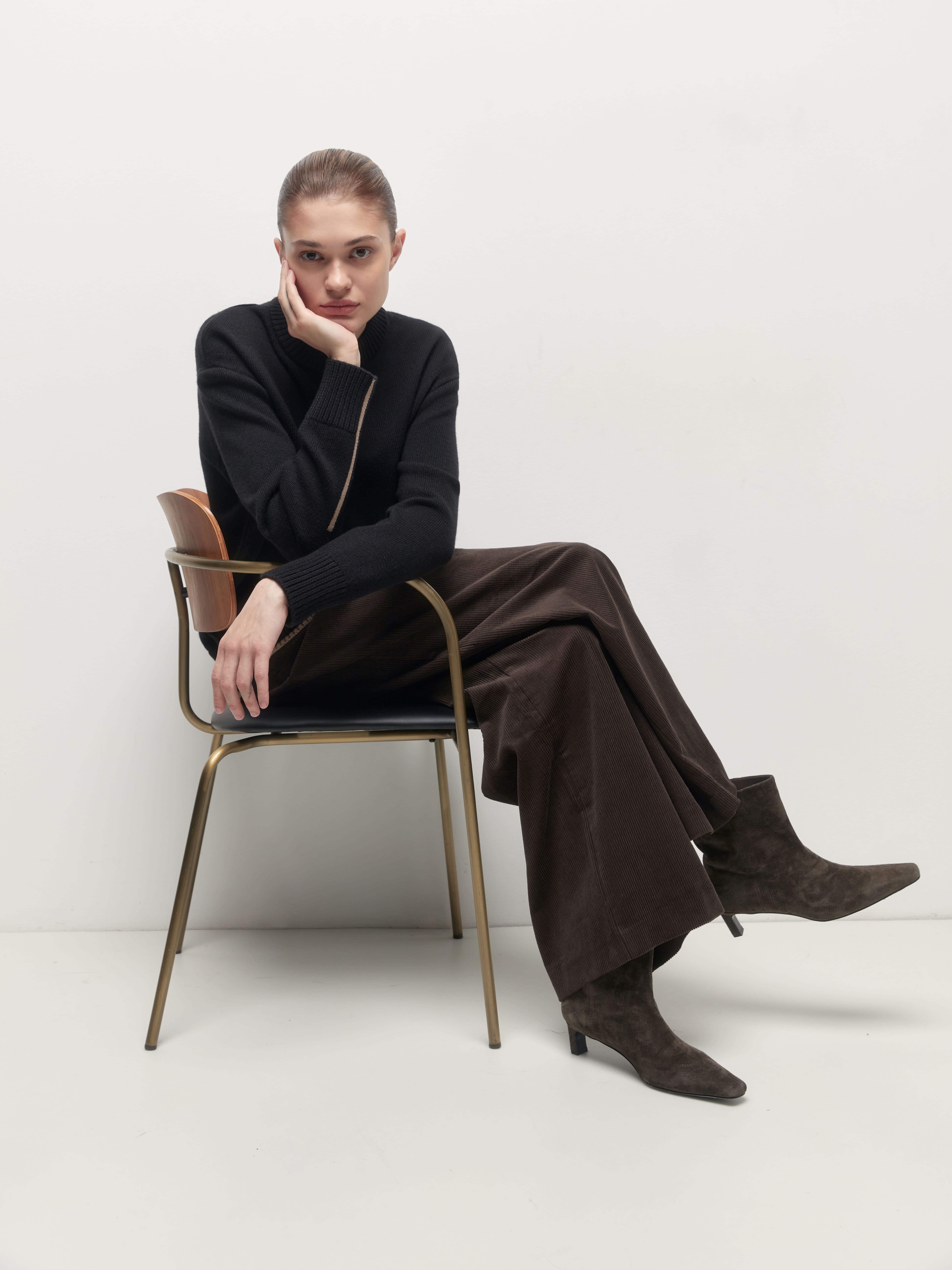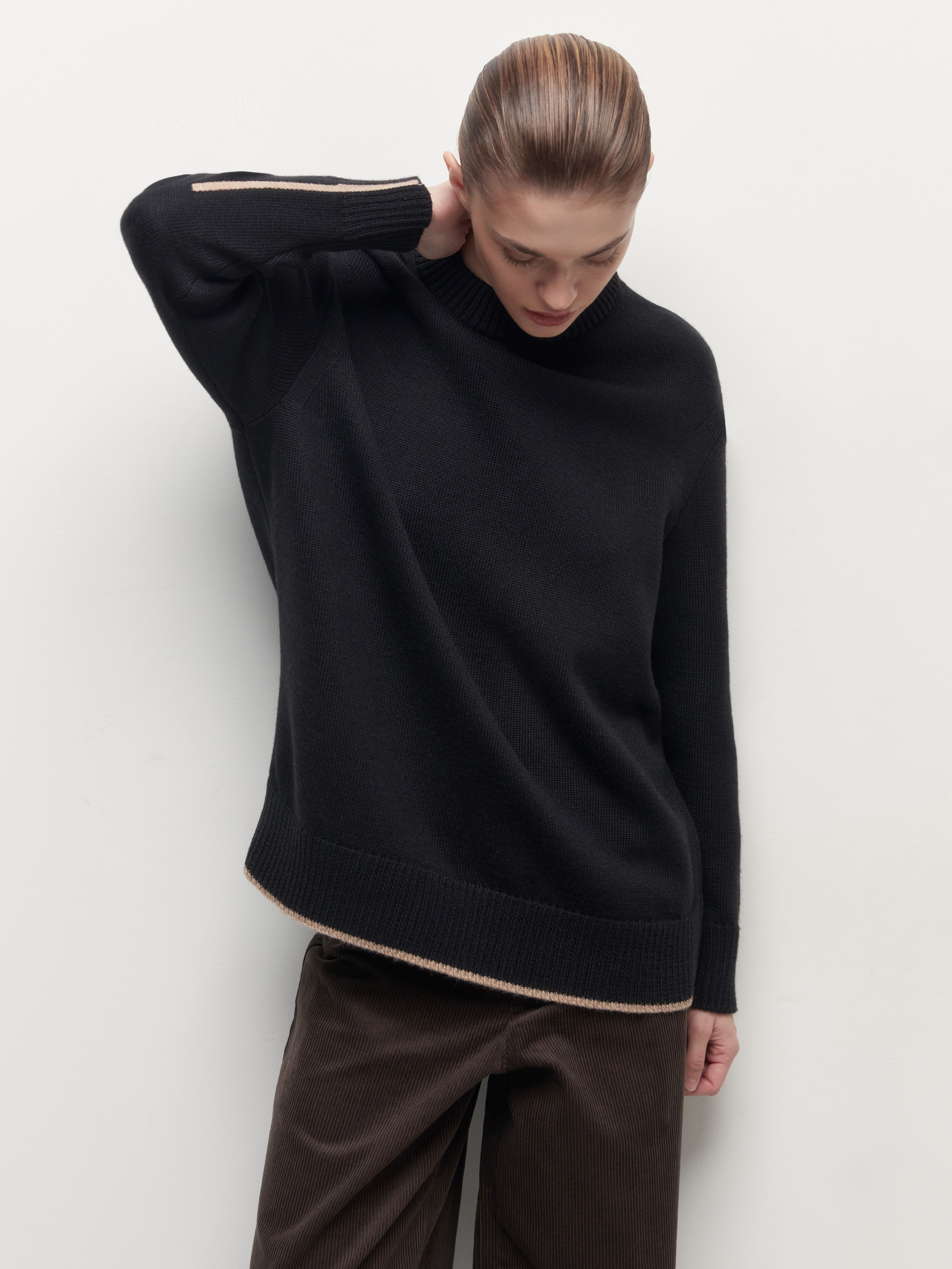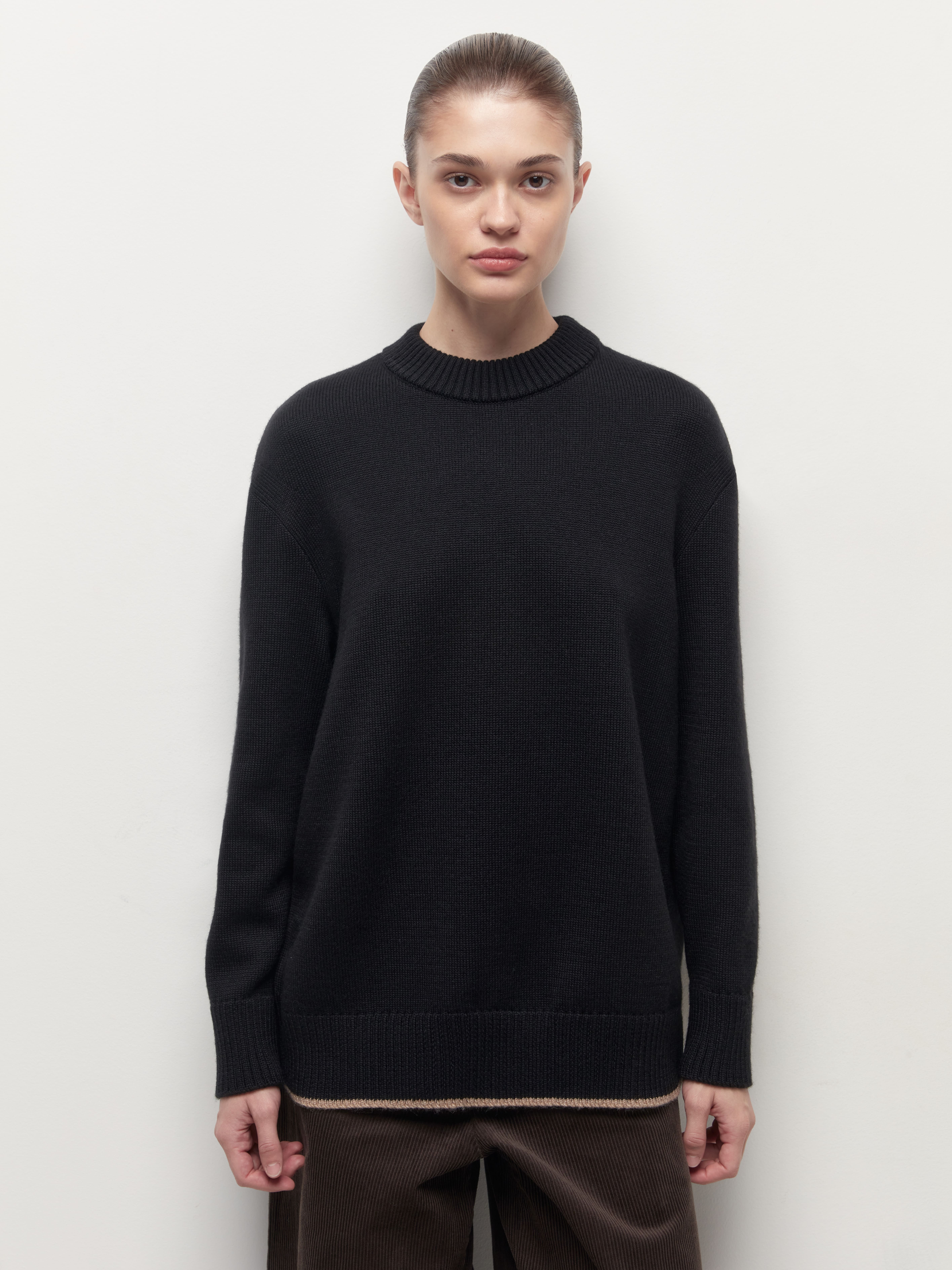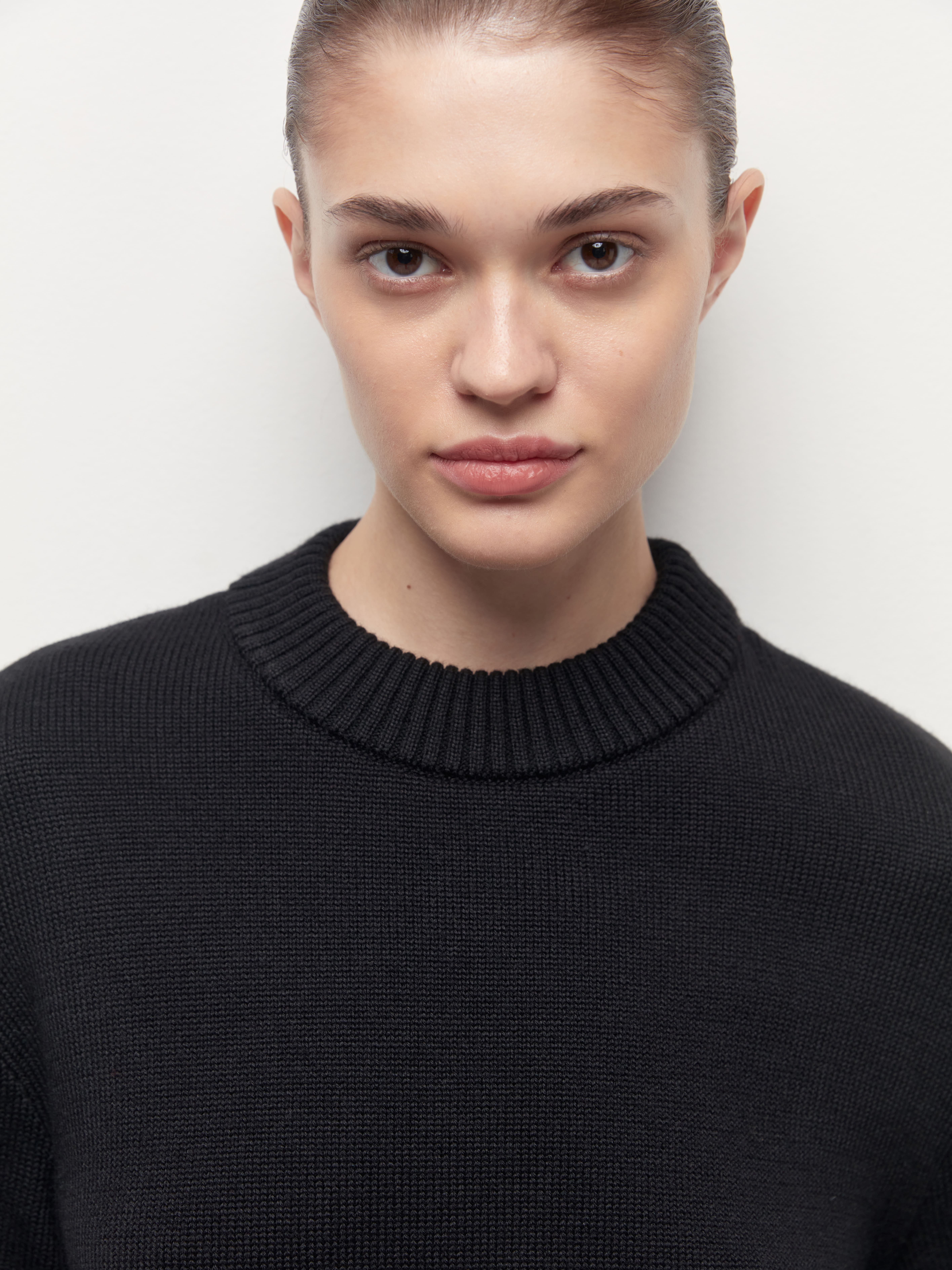 Этот уютный негабаритный джемпер выглядит ультраплотным, но на самом деле очень мягкий и приятный на ощупь. Не пугайтесь шерстяного трикотажа. Смешанный с нежным акрилом, он кардинально меняет свои тактильные характеристики, но при этом остается предельно теплым и дышащим. Для наиболее выразительных луков прибегайте к приему компенсации – комбинируйте оверсайз свитер с графичными вещами строгого кроя.
