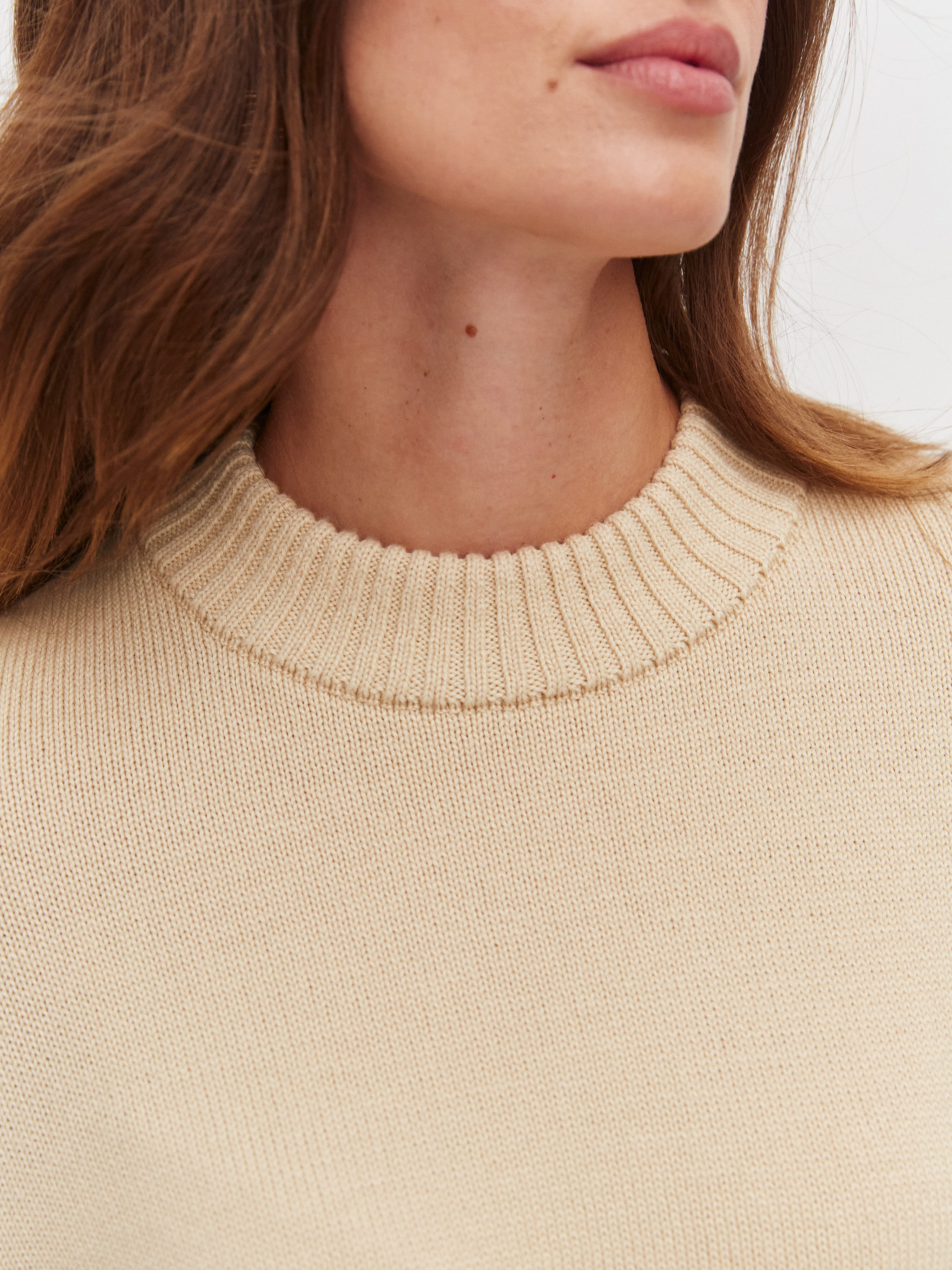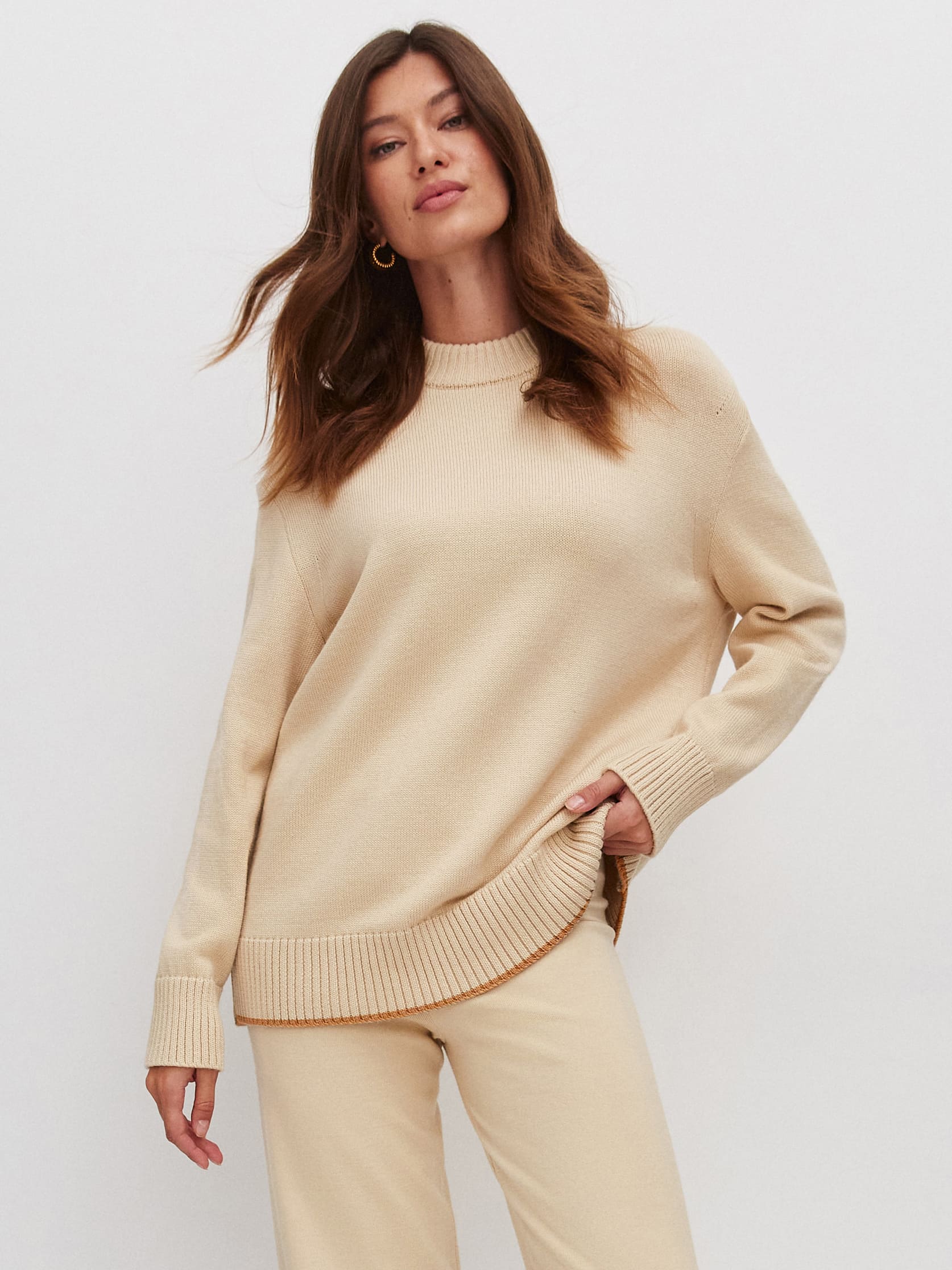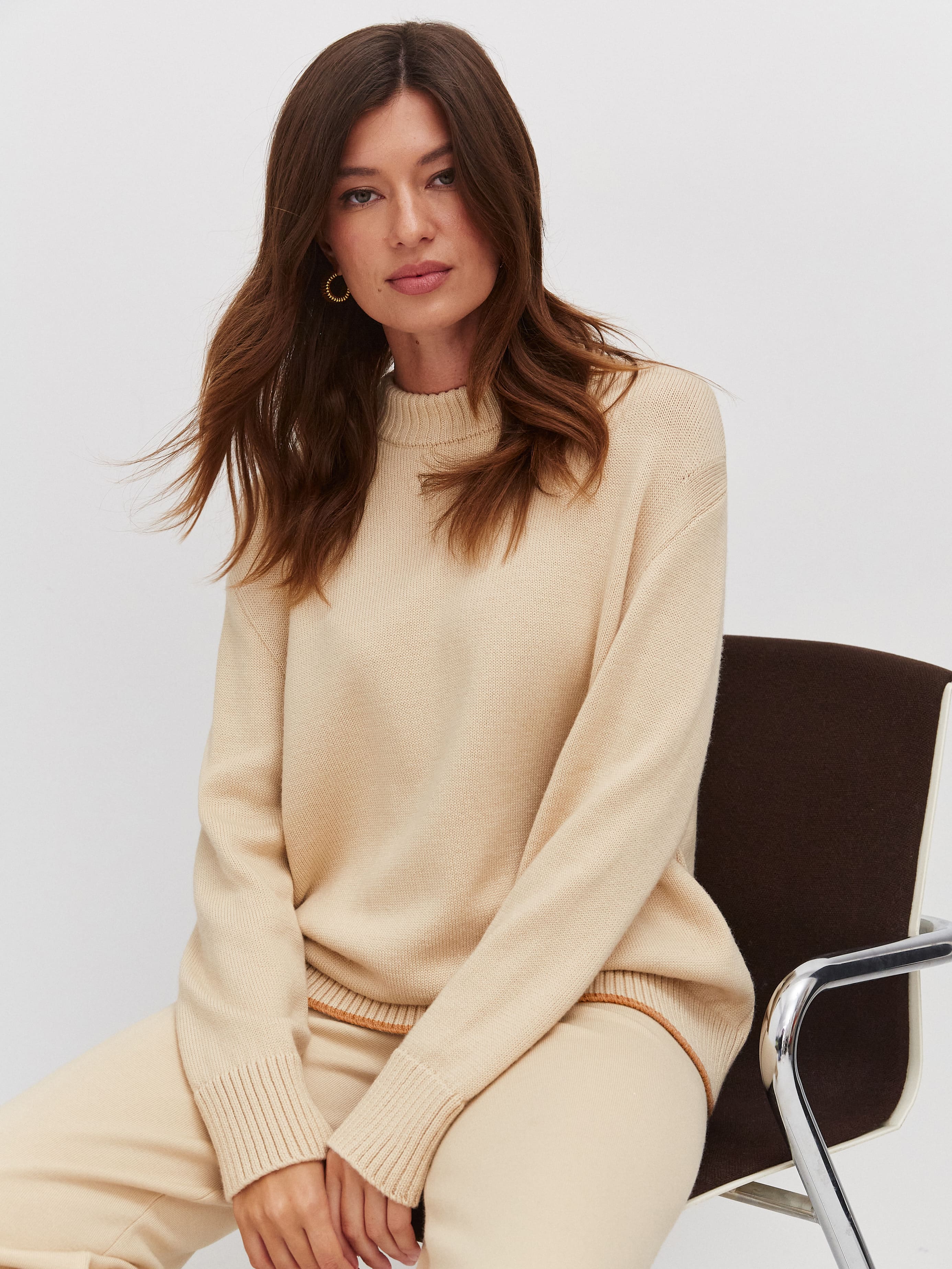 Этот уютный негабаритный джемпер выглядит ультраплотным, но на самом деле очень мягкий и приятный на ощупь. Не пугайтесь шерстяного трикотажа. Смешанный с нежным акрилом, он кардинально меняет свои тактильные характеристики, но при этом остается предельно теплым и дышащим. Для наиболее выразительных луков прибегайте к приему компенсации – комбинируйте оверсайз свитер с графичными вещами строгого кроя.