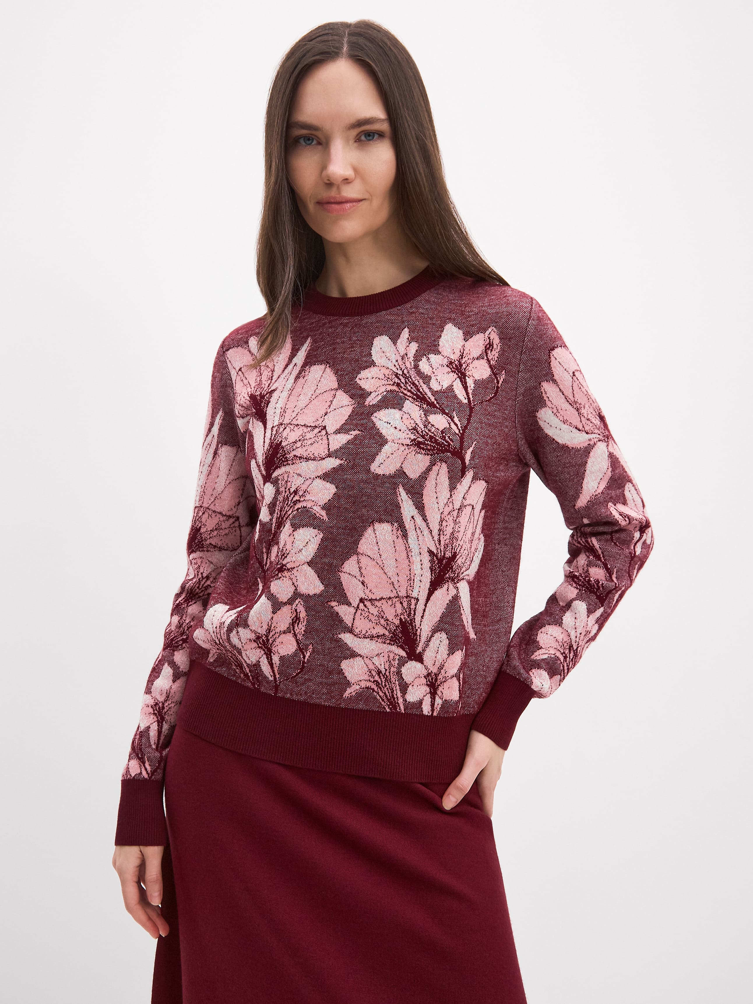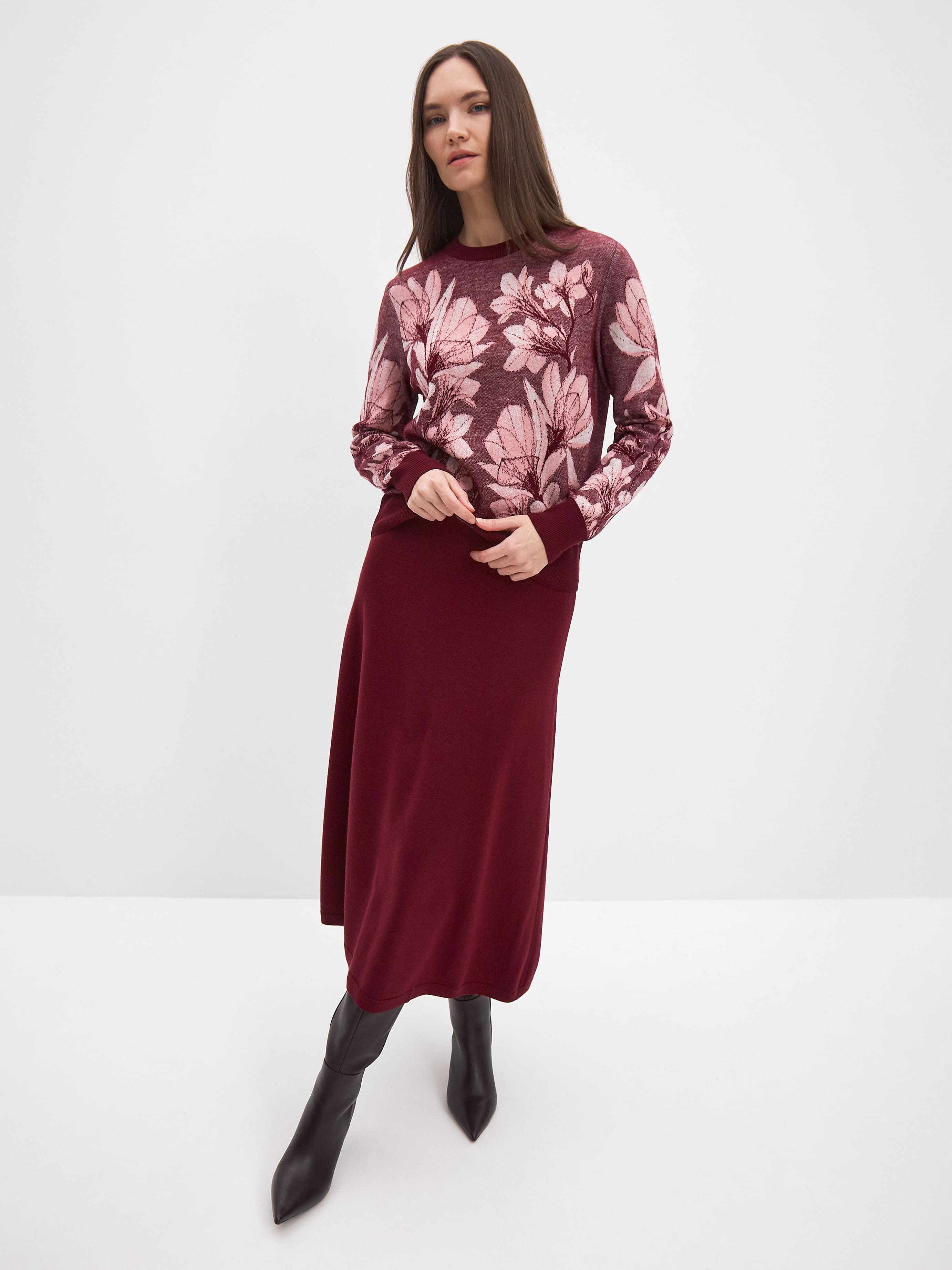 Мы нечасто задействуем в трикотаже флористические принты. И этот акцентный джемпер – как раз исключение из правила. Но авторский приглушенный рисунок – не единственное достоинство этого свитшота. У него не менее уникальный состав. Шерстяная нить с включением уютного хлопка и шелковистой вискозы. Неудивительно, что поверхность изделия хочется постоянно трогать, ощущая мягкость кончиками всех пальцев.