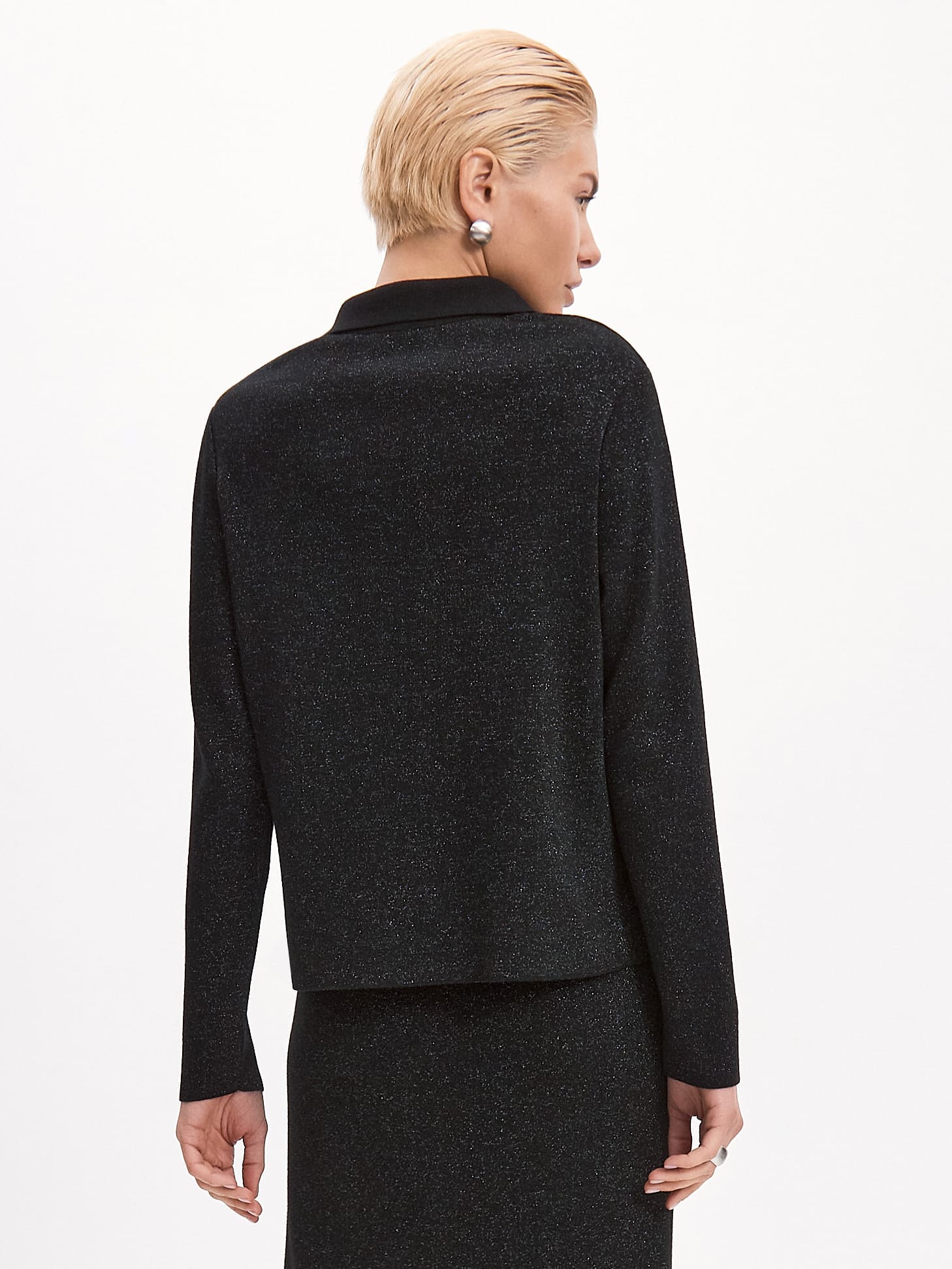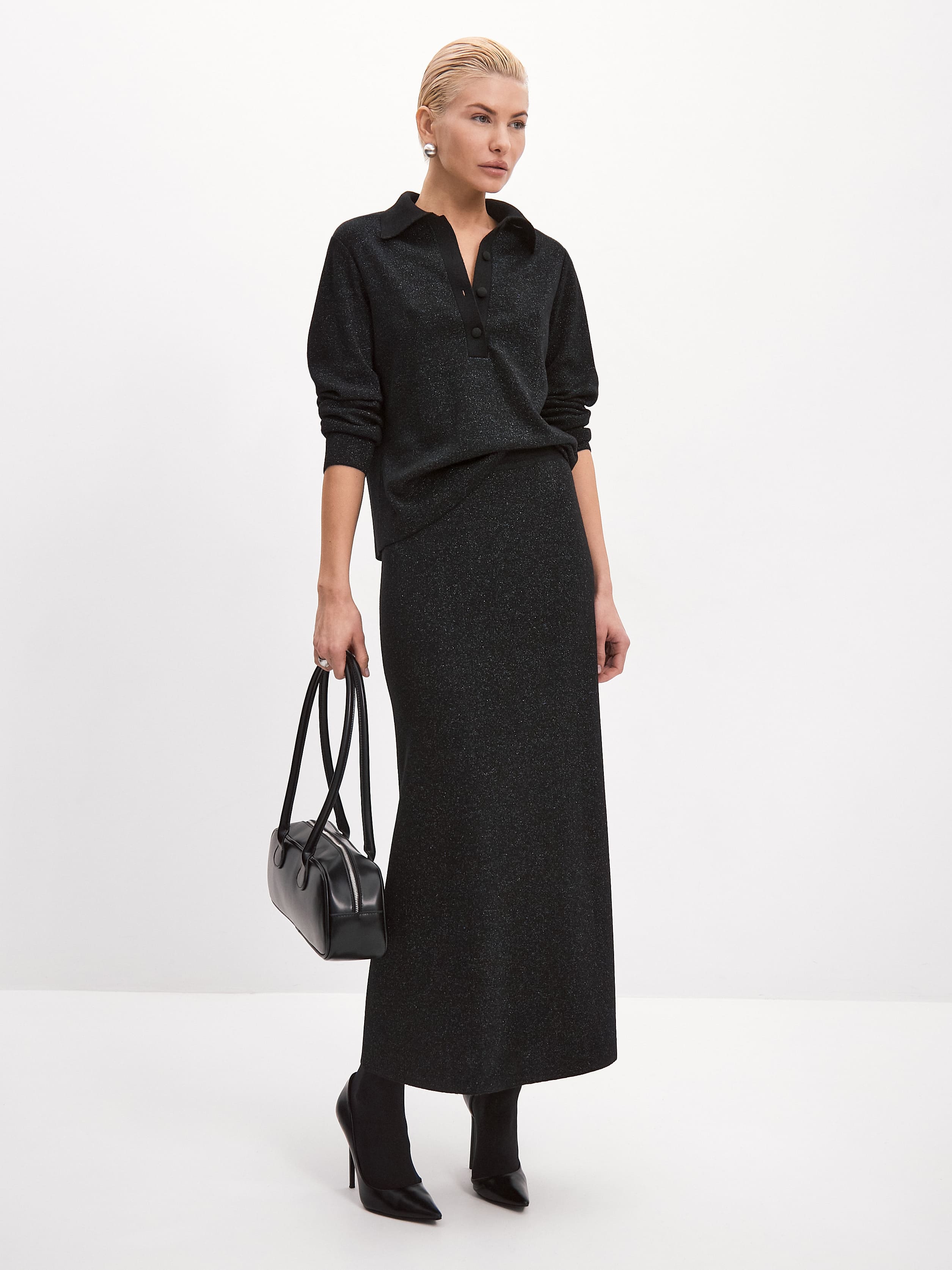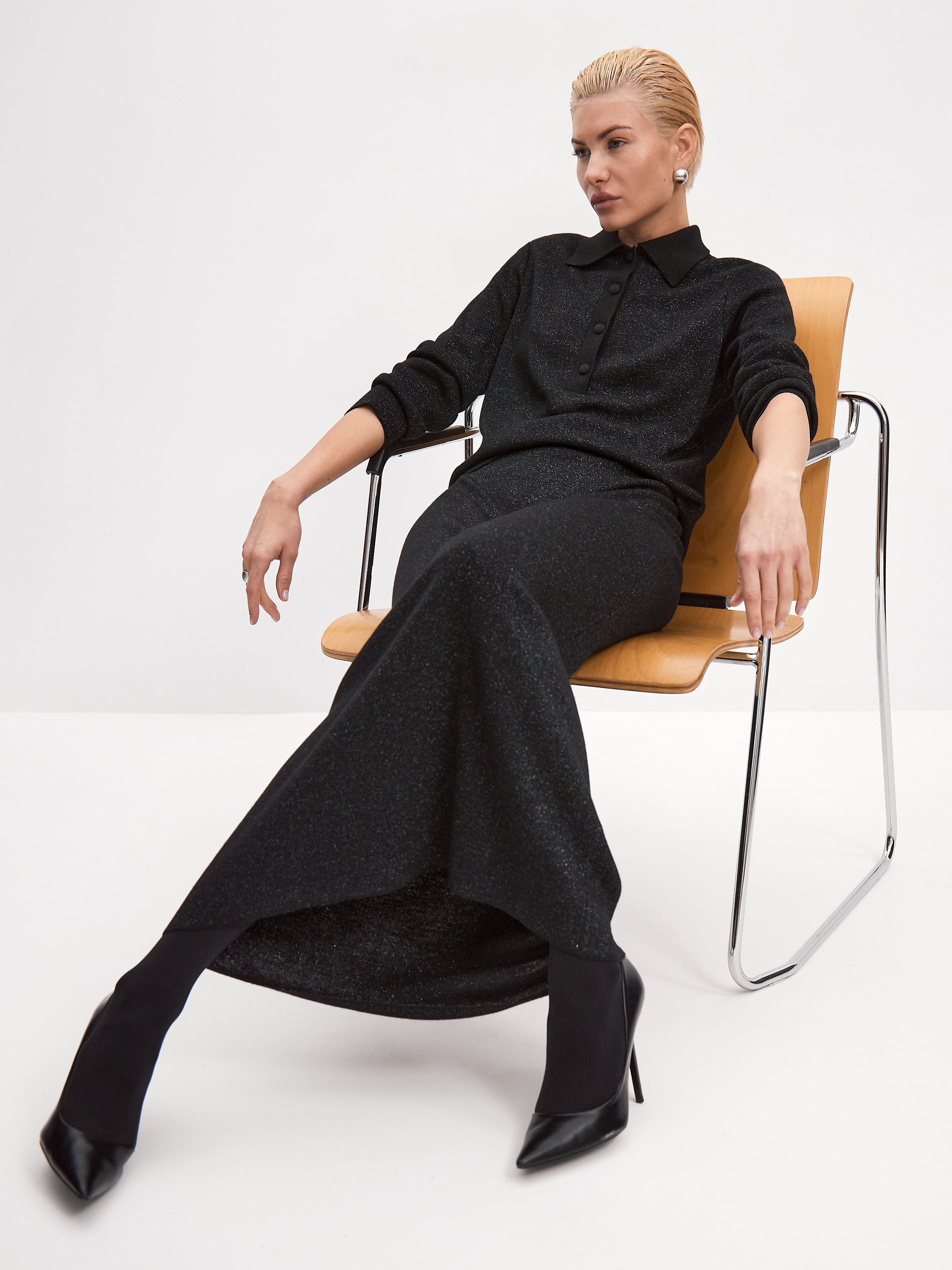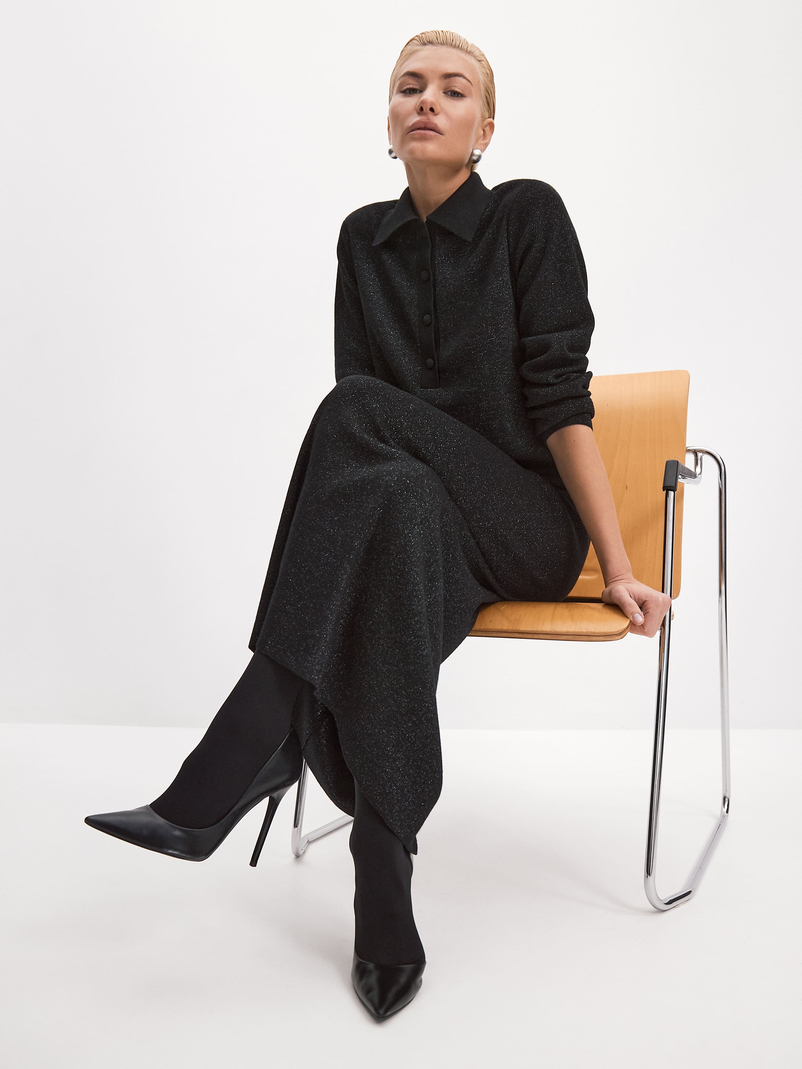 Нарядное шерстяное поло с интригующим мерцанием люрексовой нити. Мы переплели премиальную шерсть мериноса с самой мягкой, податливой и дорогой разновидностью люрекса (софт). Благодаря ей, вязаный трикотаж приобрел визуальную изысканность, но остался максимально приятным на ощупь. Джемпер чуть свободный в посадке, с аккуратным воротничком на пуговицах, которыми можно регулировать глубину выреза. Рекомендуем как дополнение к юбке Рене, имеющей идентичные состав, плотность плетения и оттенок.