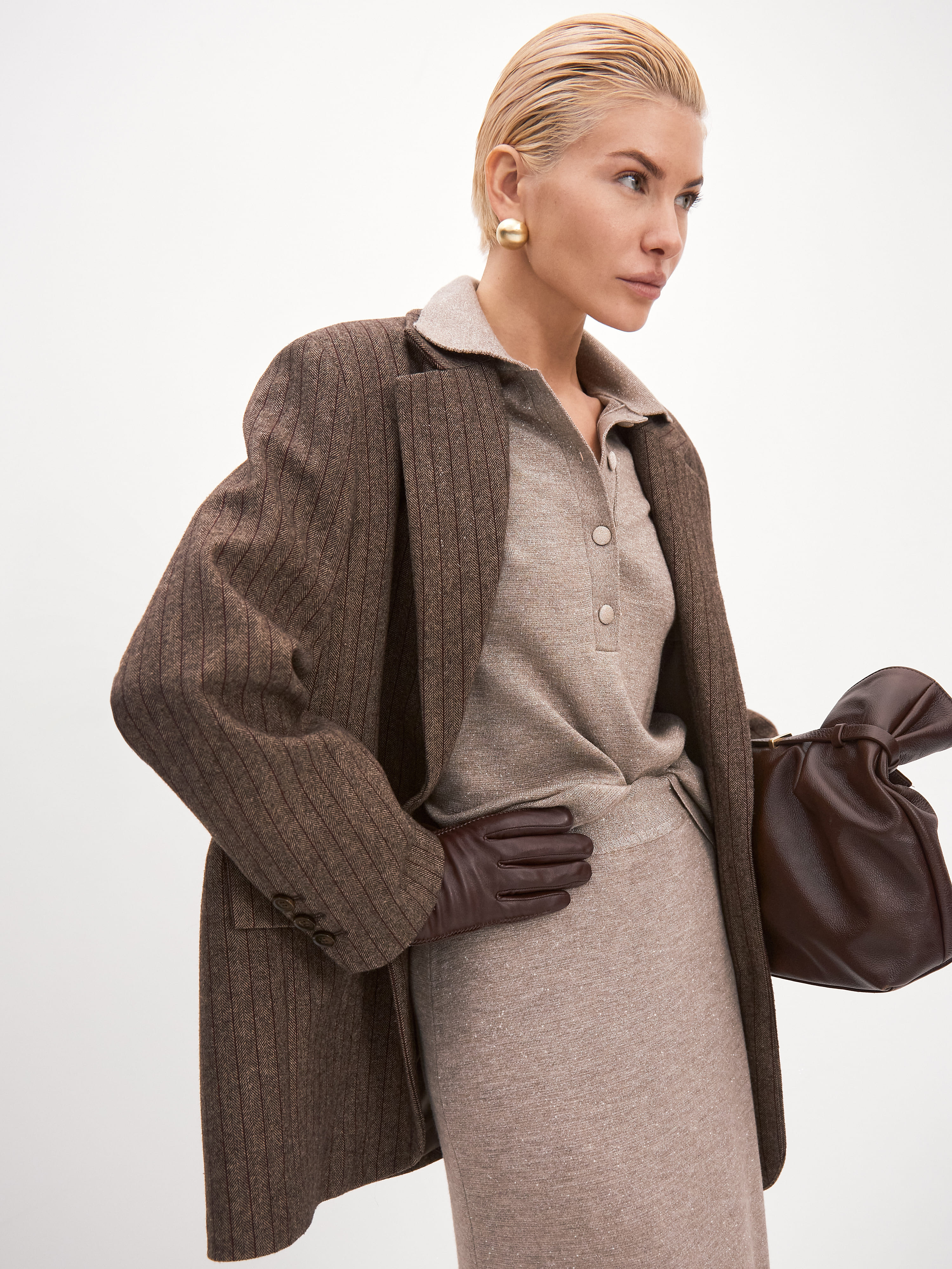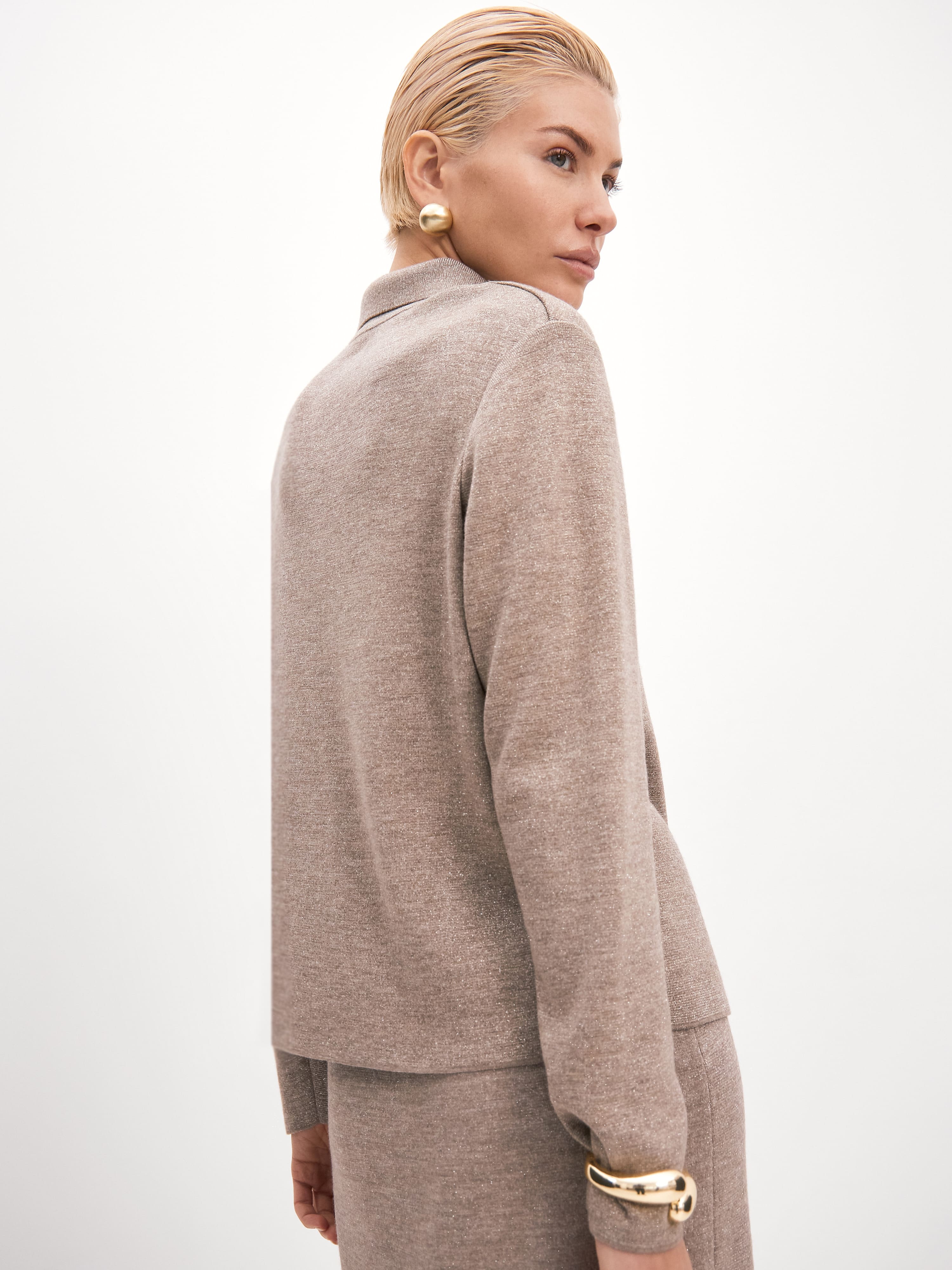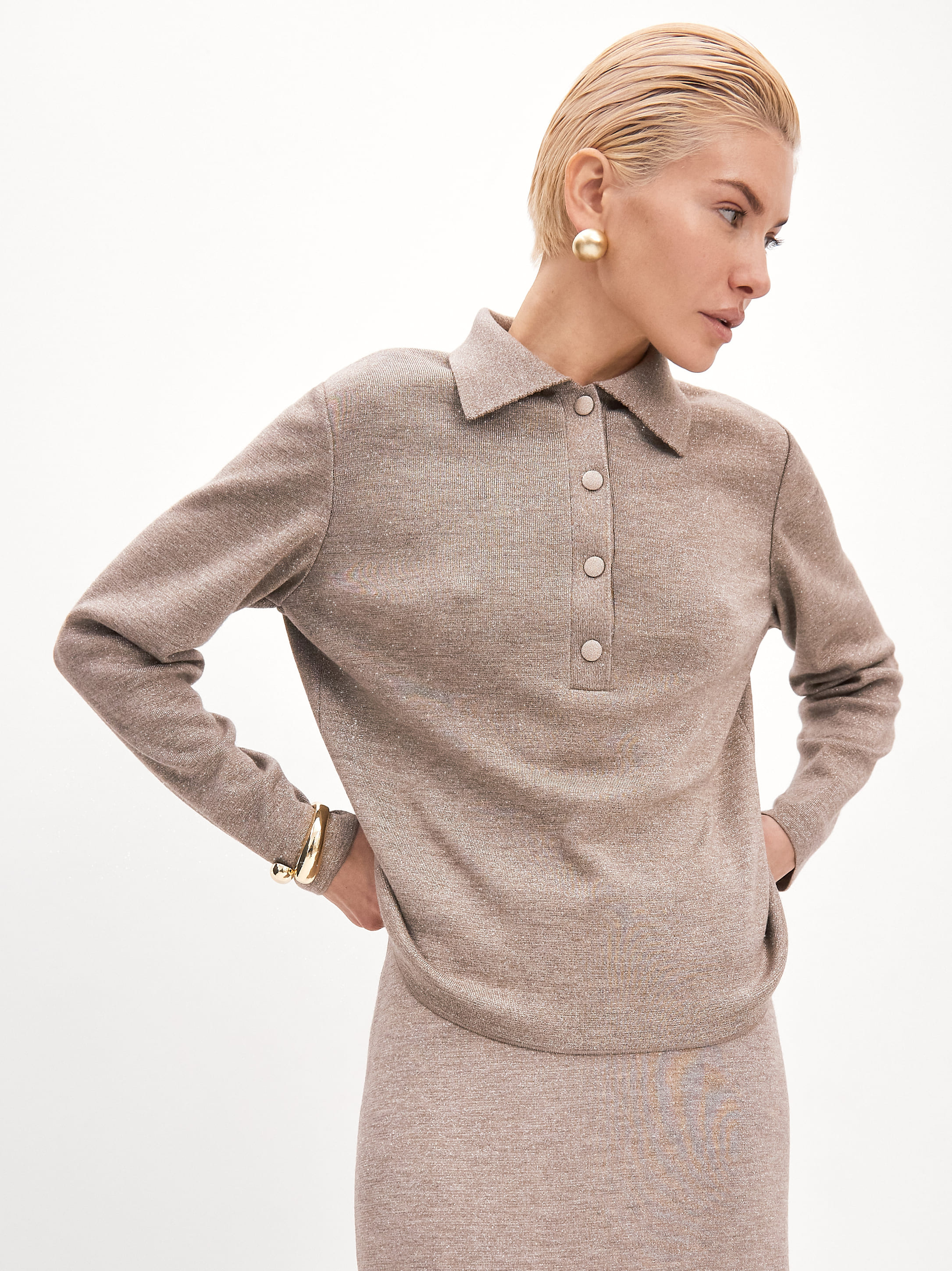 Нарядное шерстяное поло с интригующим мерцанием люрексовой нити. Мы переплели премиальную шерсть мериноса с самой мягкой, податливой и дорогой разновидностью люрекса (софт). Благодаря ей, вязаный трикотаж приобрел визуальную изысканность, но остался максимально приятным на ощупь. Джемпер чуть свободный в посадке, с аккуратным воротничком на пуговицах, которыми можно регулировать глубину выреза. Рекомендуем как дополнение к юбке Рене, имеющей идентичные состав, плотность плетения и оттенок.