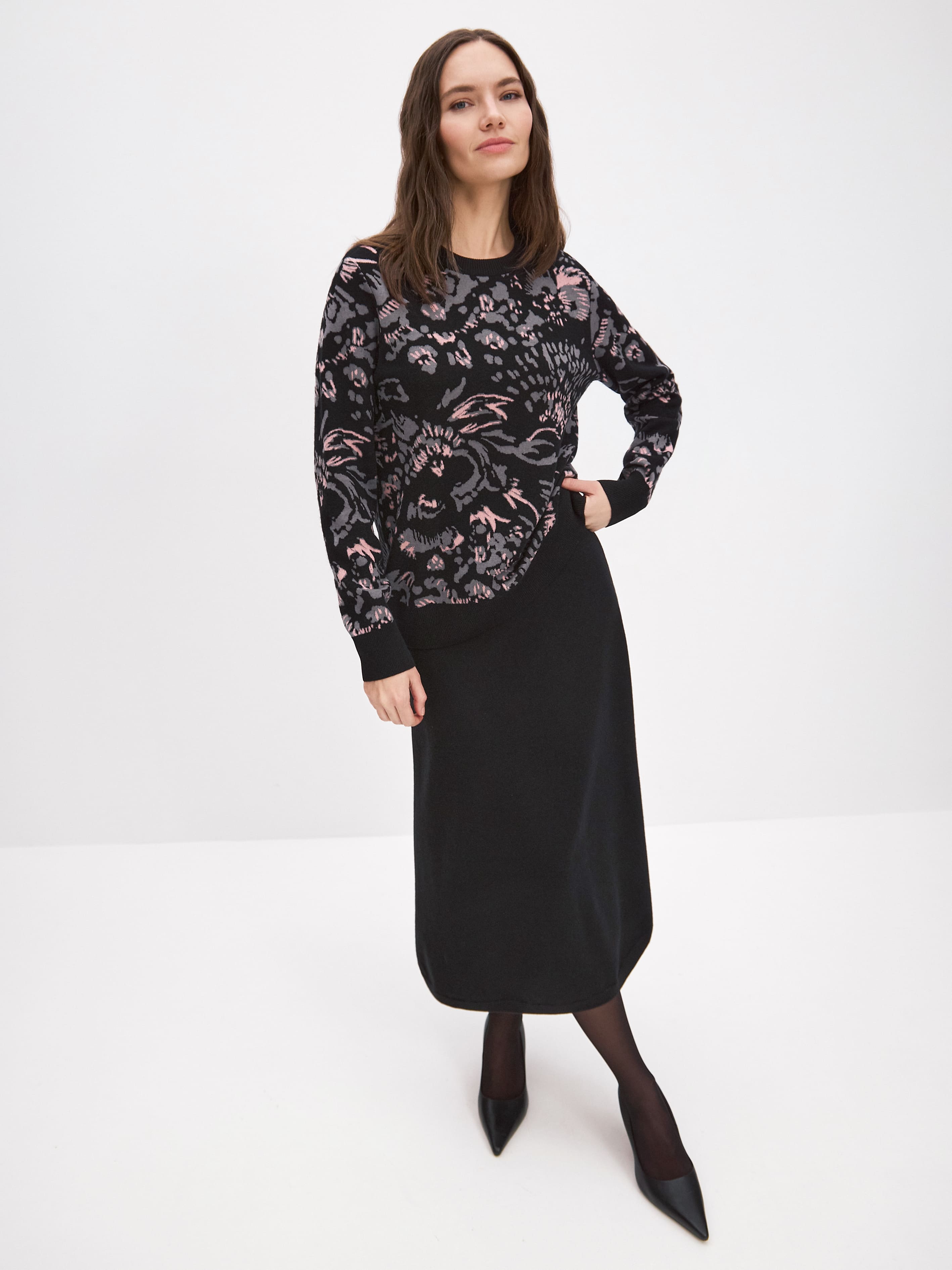 Осенне-зимний джемпер с жаккардовым принтом, цель которого – не позволить своей обладательнице замерзнуть и затеряться в толпе. Уютный и очень теплый, благодаря натуральной шерсти в составе. Совершенно не колючий, за счет добавленного хлопка, который делает шерстяной трикотаж податливым и мягким. Чтобы придать силуэту нужную устойчивость, собрали низ на широкую резинку, обвязали горловину в два слоя и добавили манжеты. Теперь посадку джемпера можно адаптировать под себя – чуть подворачивать снизу, стягивать рукава выше линии запястья и т. д.