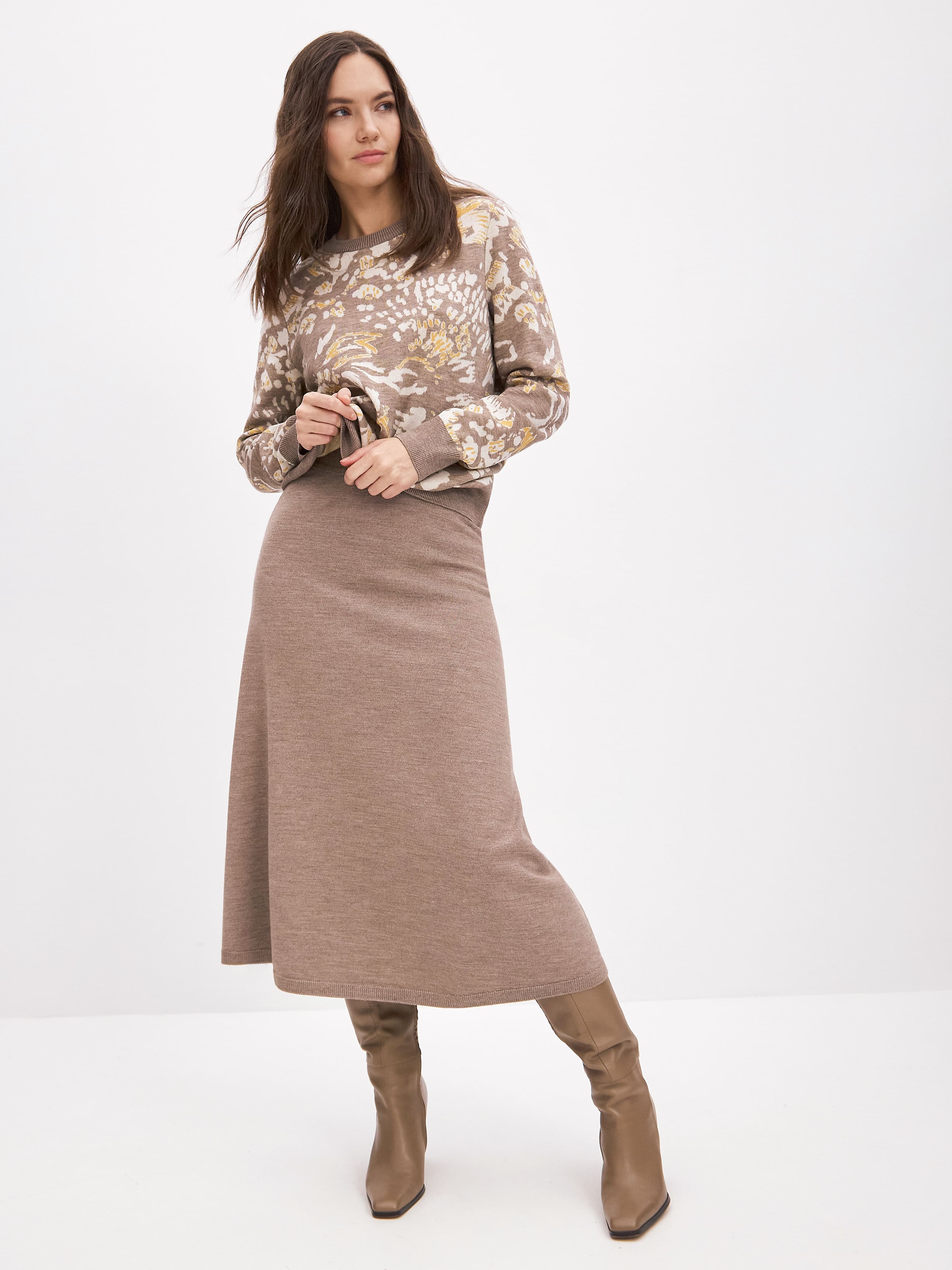 Осенне-зимний джемпер с жаккардовым принтом, цель которого – не позволить своей обладательнице замерзнуть и затеряться в толпе. Уютный и очень теплый, благодаря натуральной шерсти в составе. Совершенно не колючий, за счет добавленного хлопка, который делает шерстяной трикотаж податливым и мягким. Чтобы придать силуэту нужную устойчивость, собрали низ на широкую резинку, обвязали горловину в два слоя и добавили манжеты. Теперь посадку джемпера можно адаптировать под себя – чуть подворачивать снизу, стягивать рукава выше линии запястья и т. д.