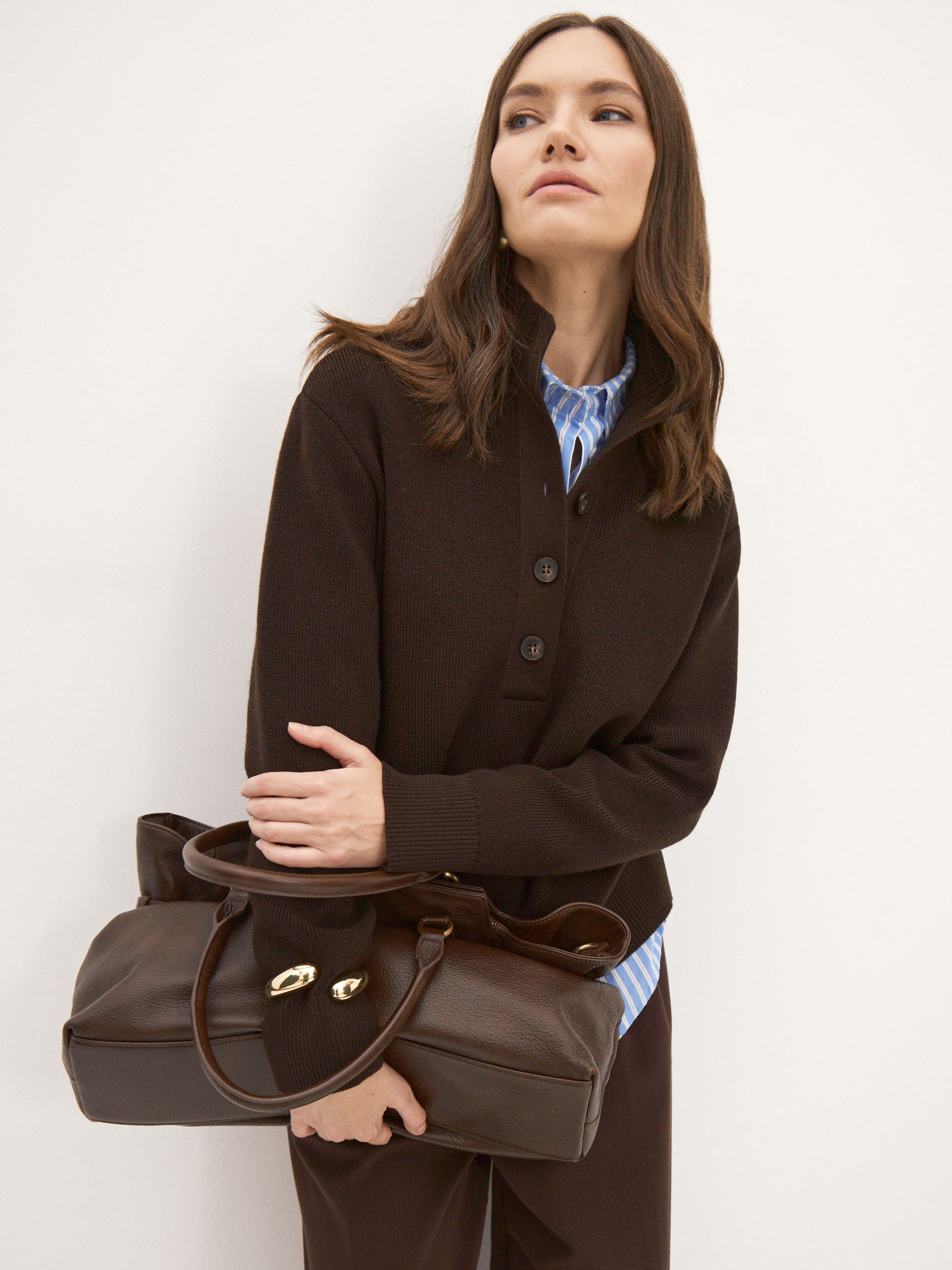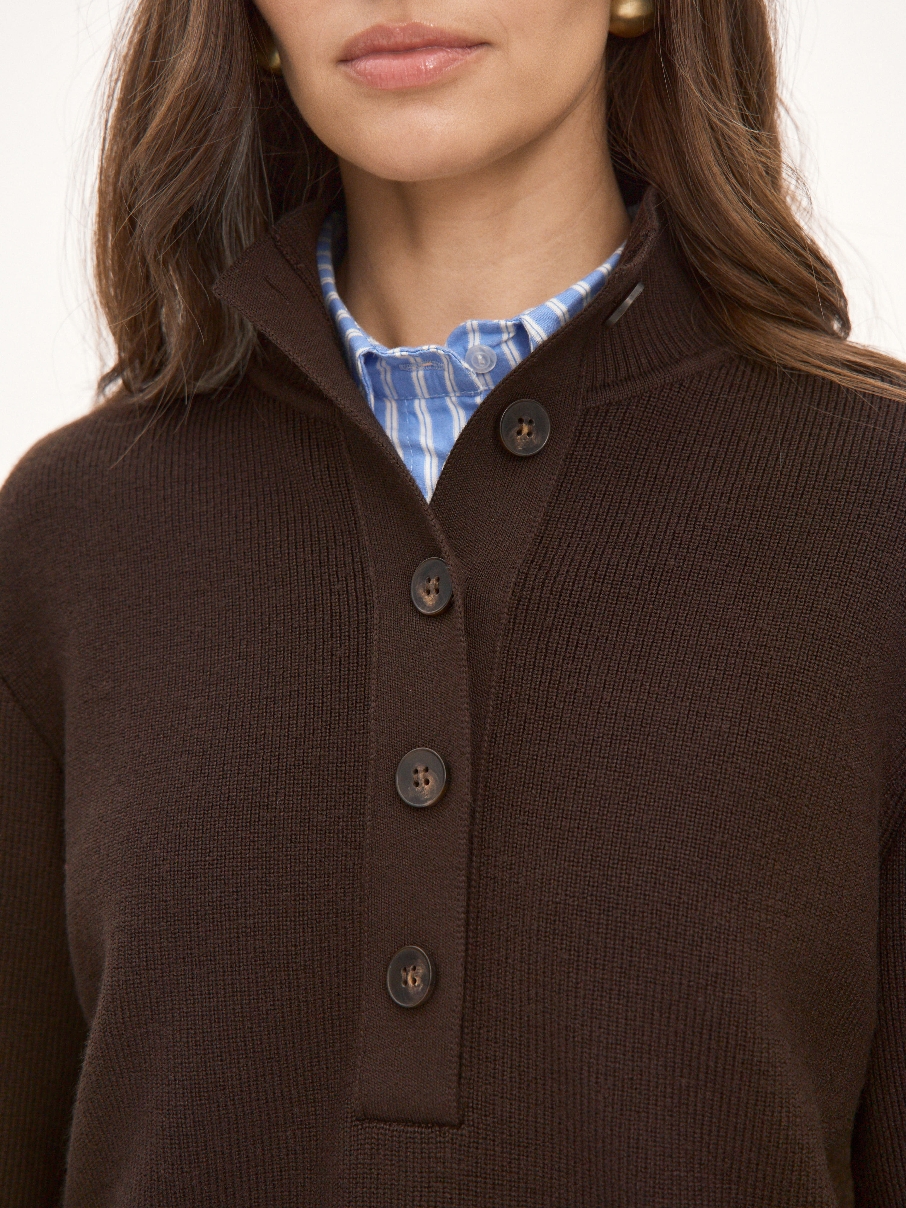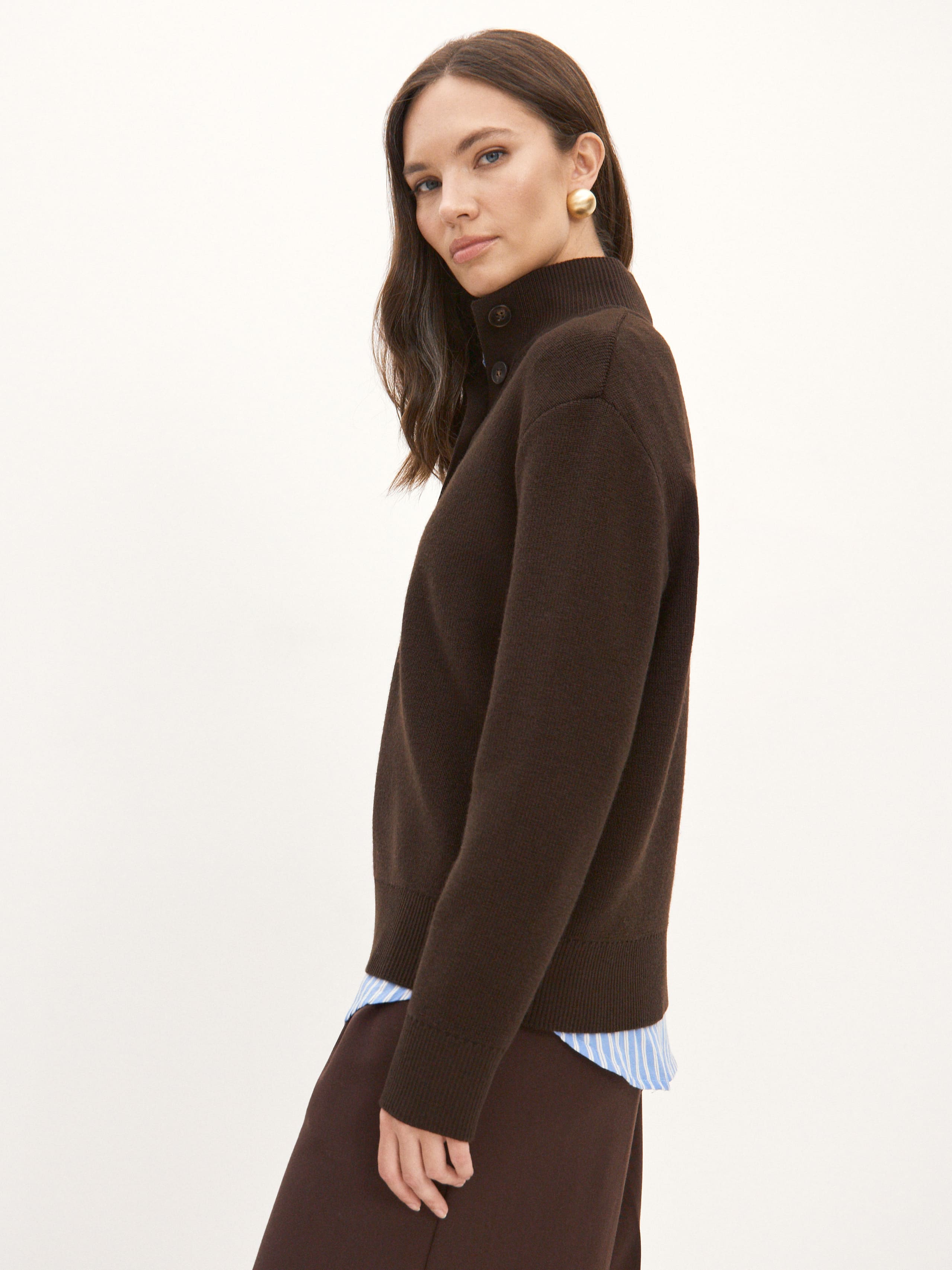 Мериносовый джемпер с высокой горловиной на пуговицах, способный адаптироваться под любую стилевую формальность. В застегнутом виде превращается в базовый теплый свитер, уютно укутывающий и позволяющий отказаться от шарфа на прогулке. Пара расстегнутых пуговиц на планке красиво приоткрывает шею, повышая градус непринужденности образа. В отделке низа и манжет использована наша любимая техника – широкая, расслабленная резинка. Она повторяет свободный силуэт джемпера, но при этом не позволяет трикотажу тянуться вниз.