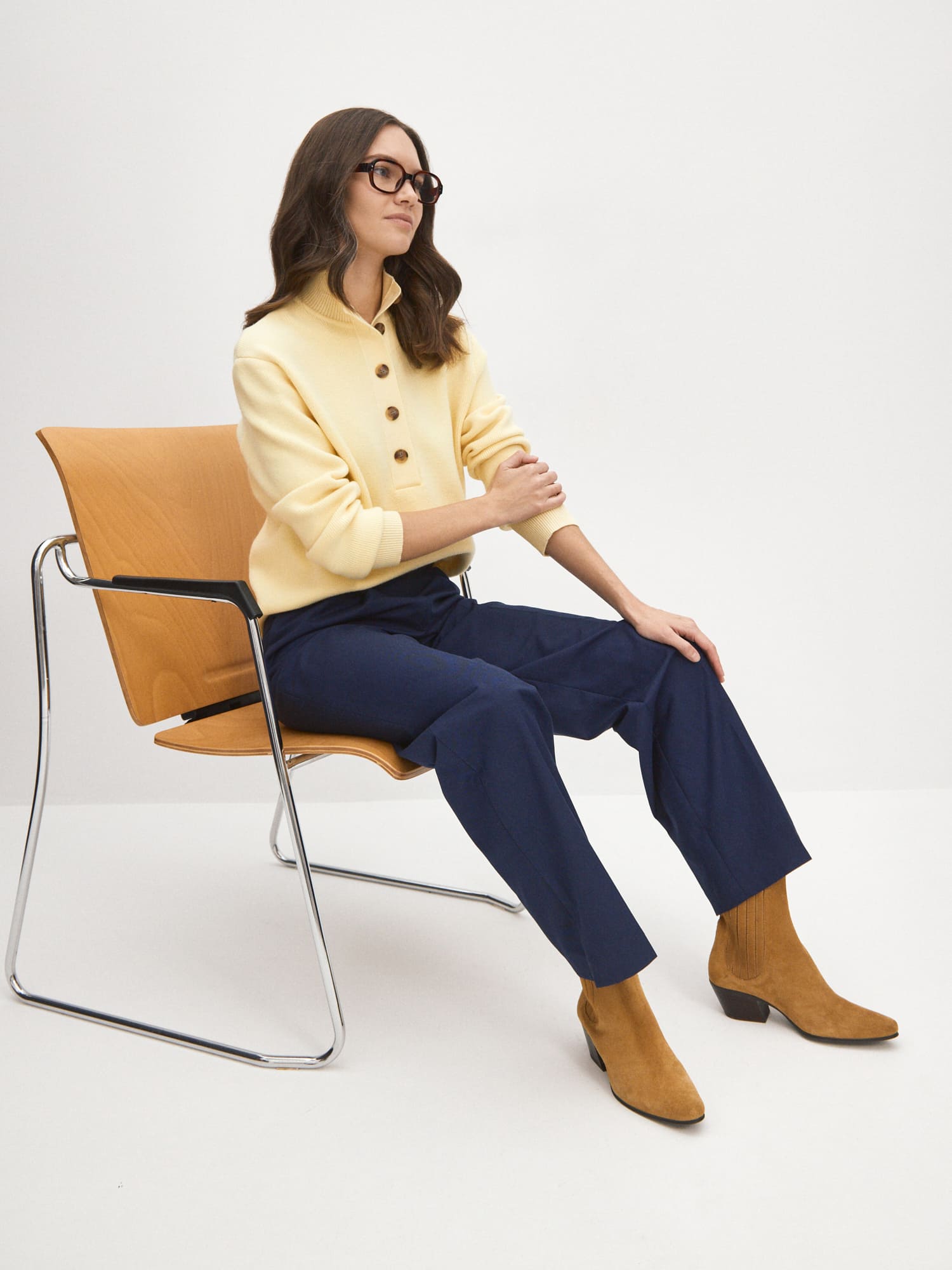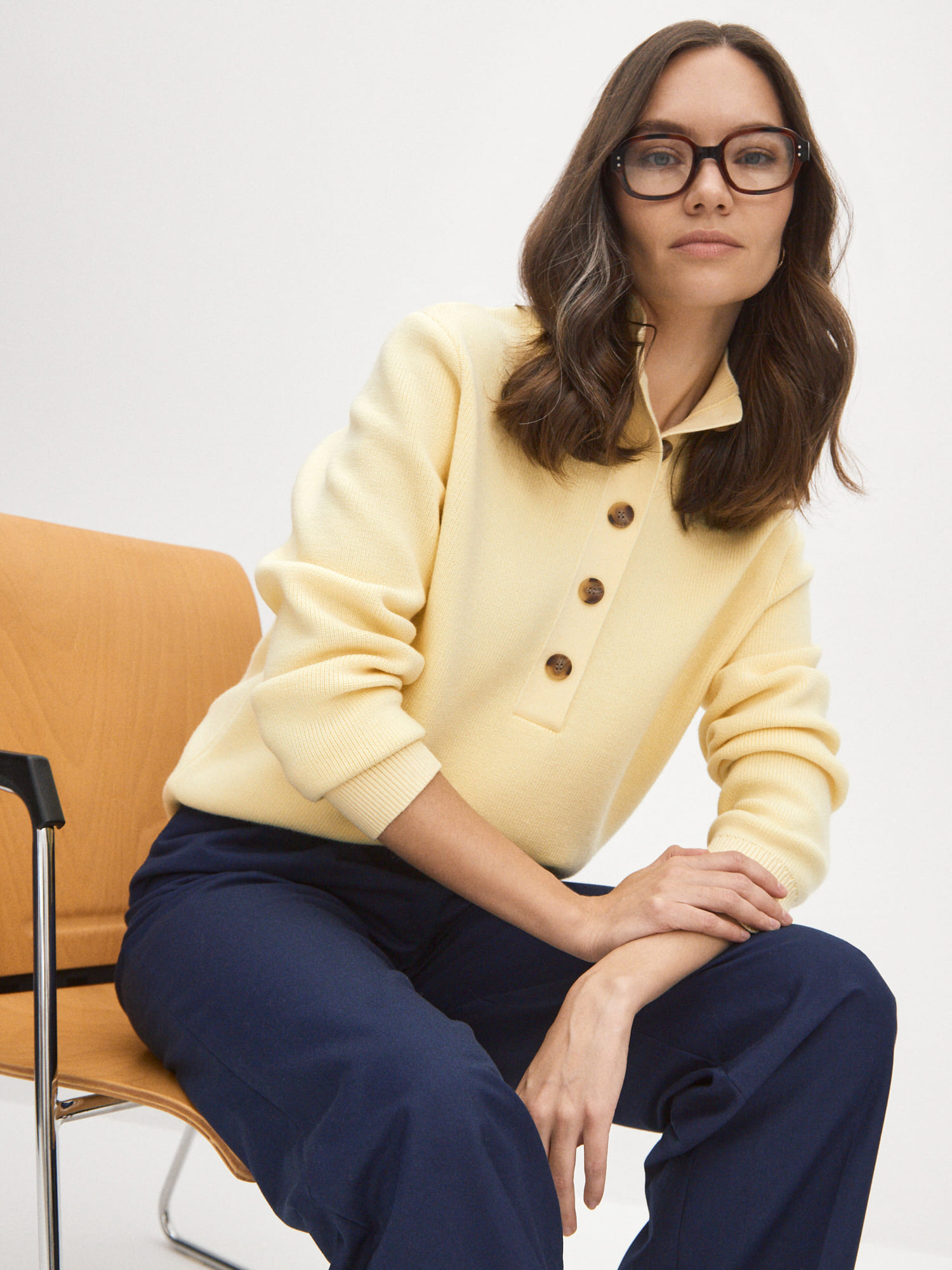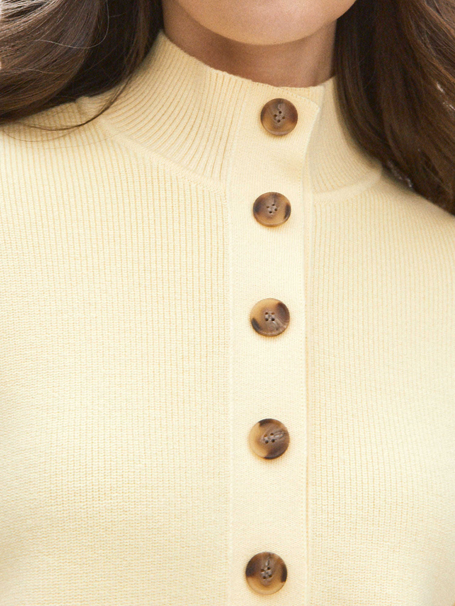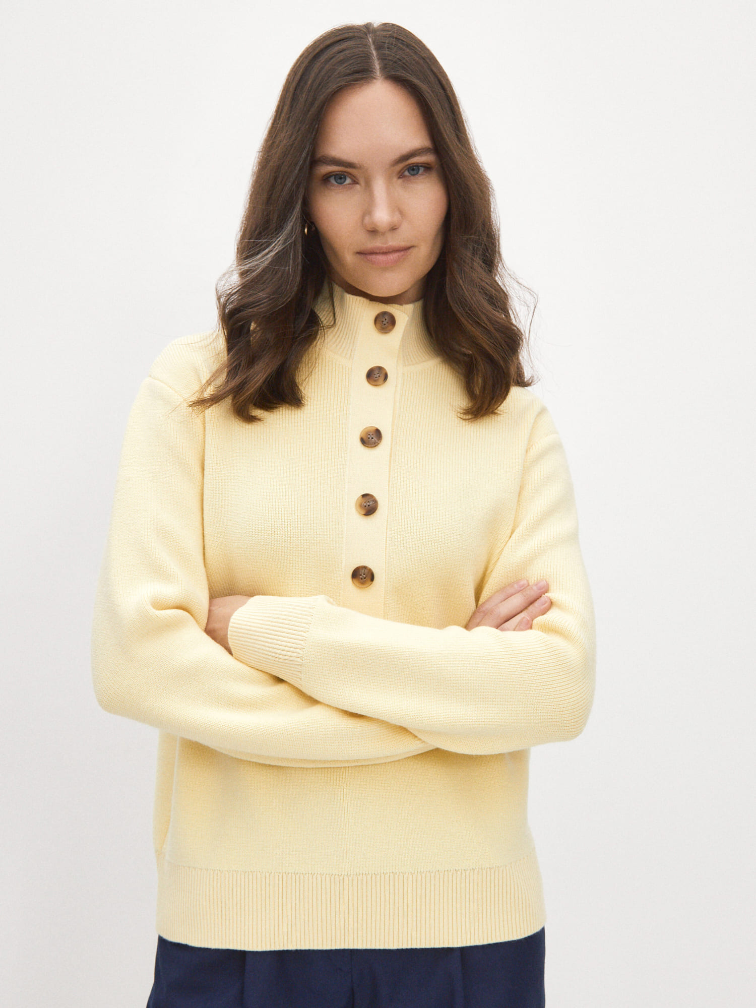 Мериносовый джемпер с высокой горловиной на пуговицах, способный адаптироваться под любую стилевую формальность. В застегнутом виде превращается в базовый теплый свитер, уютно укутывающий и позволяющий отказаться от шарфа на прогулке. Пара расстегнутых пуговиц на планке красиво приоткрывает шею, повышая градус непринужденности образа. В отделке низа и манжет использована наша любимая техника – широкая, расслабленная резинка. Она повторяет свободный силуэт джемпера, но при этом не позволяет трикотажу тянуться вниз.