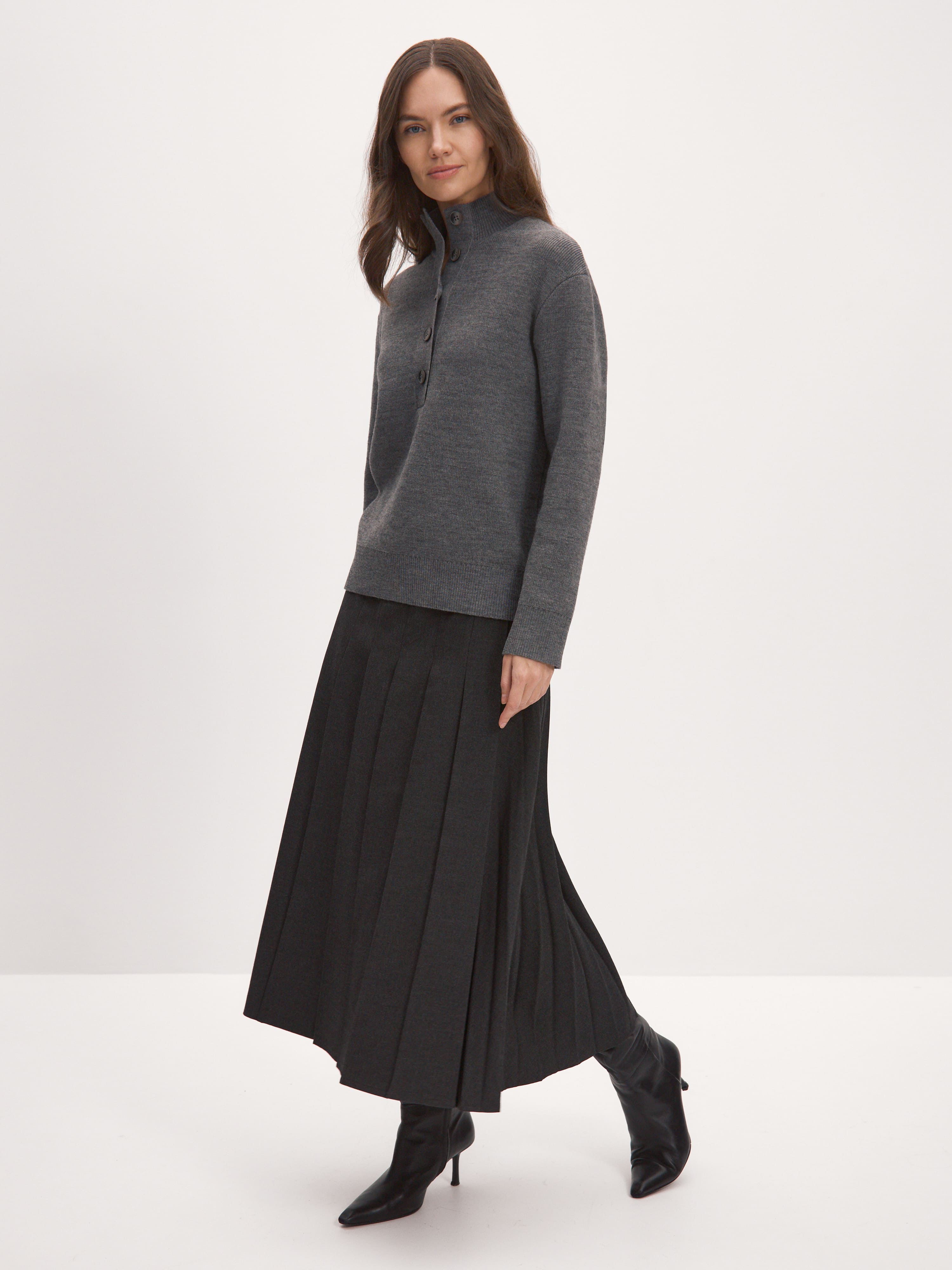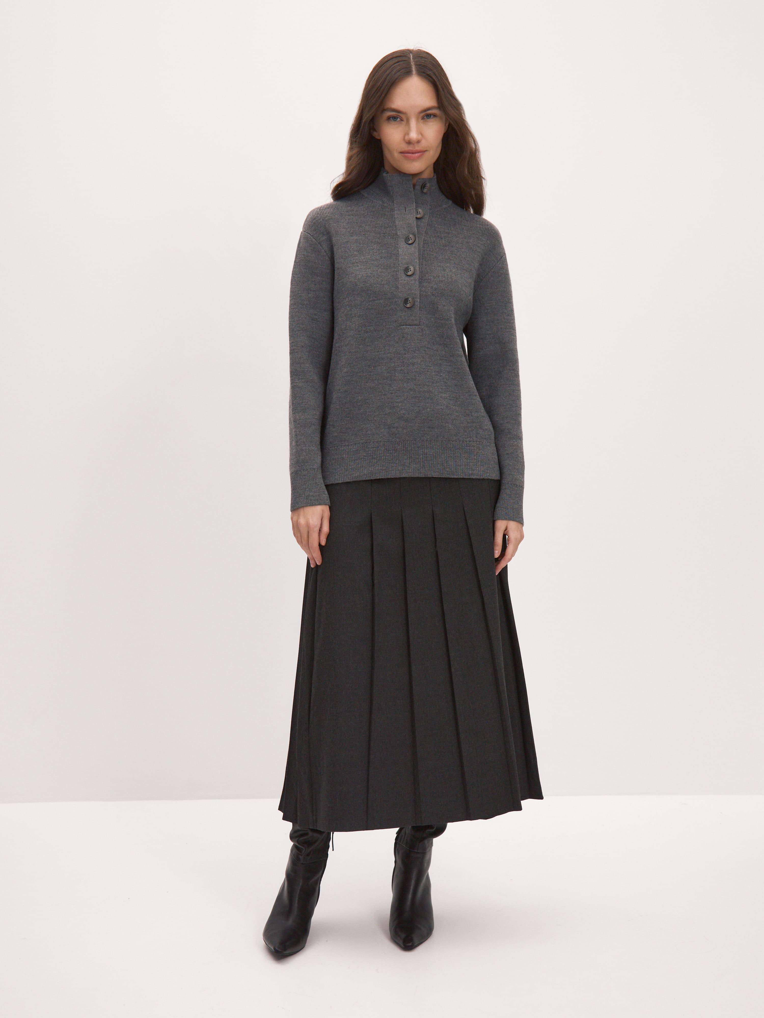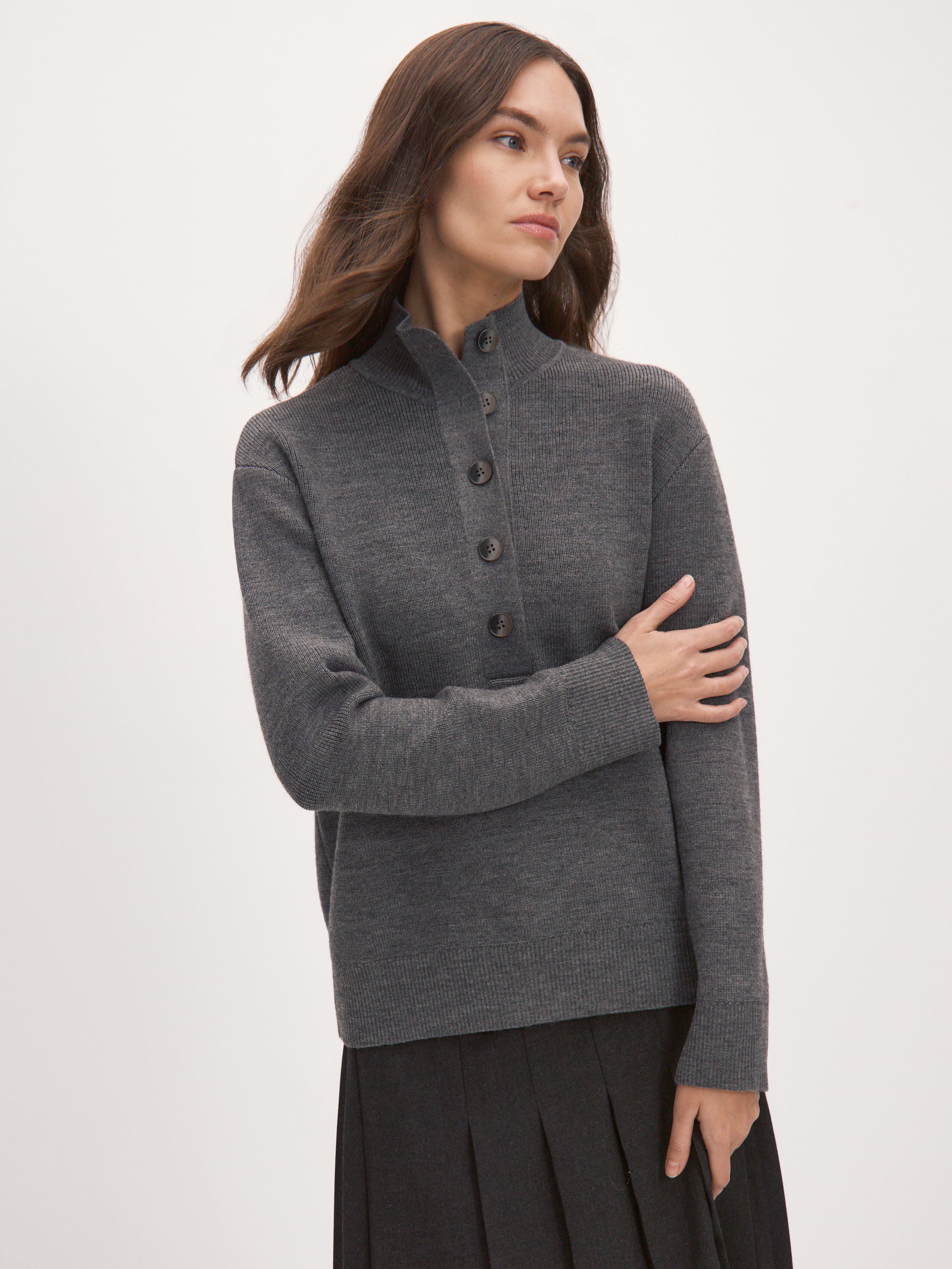 Мериносовый джемпер с высокой горловиной на пуговицах, способный адаптироваться под любую стилевую формальность. В застегнутом виде превращается в базовый теплый свитер, уютно укутывающий и позволяющий отказаться от шарфа на прогулке. Пара расстегнутых пуговиц на планке красиво приоткрывает шею, повышая градус непринужденности образа. В отделке низа и манжет использована наша любимая техника – широкая, расслабленная резинка. Она повторяет свободный силуэт джемпера, но при этом не позволяет трикотажу тянуться вниз.