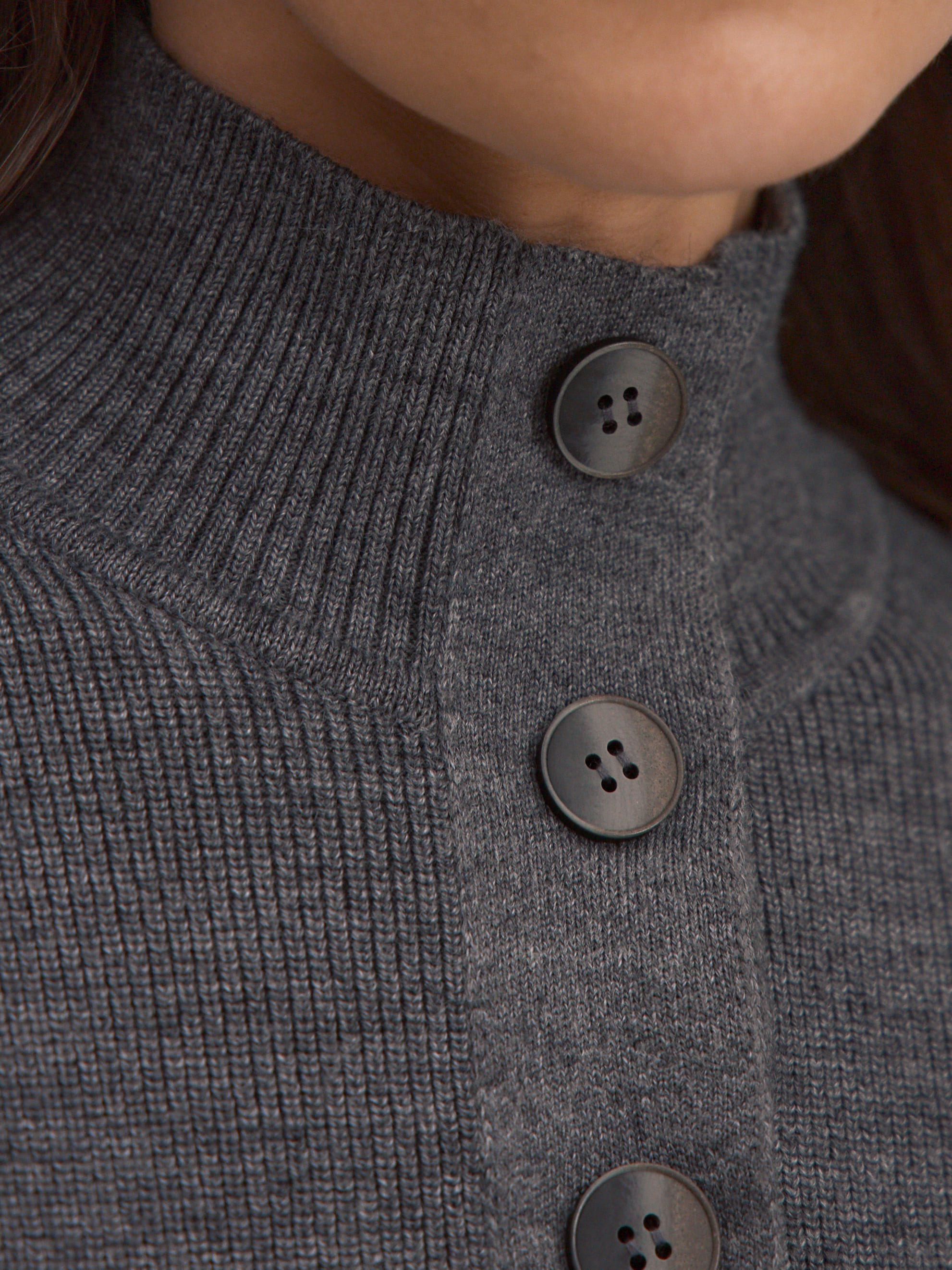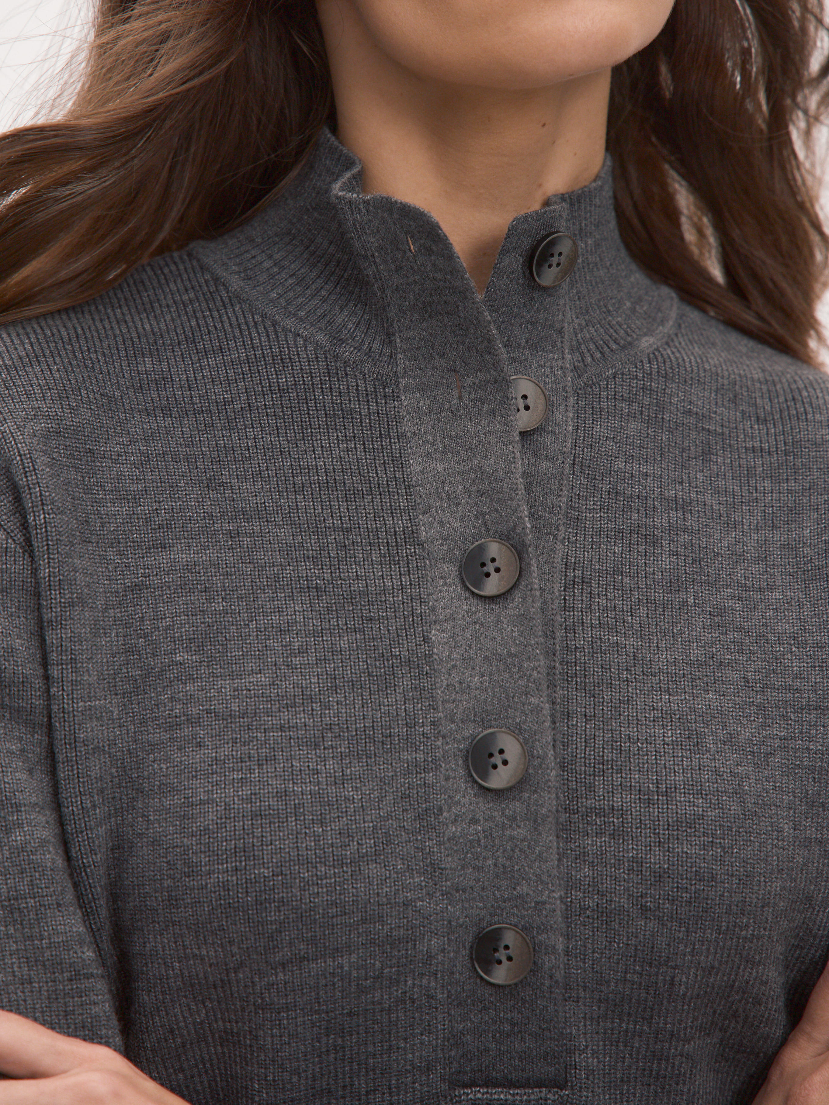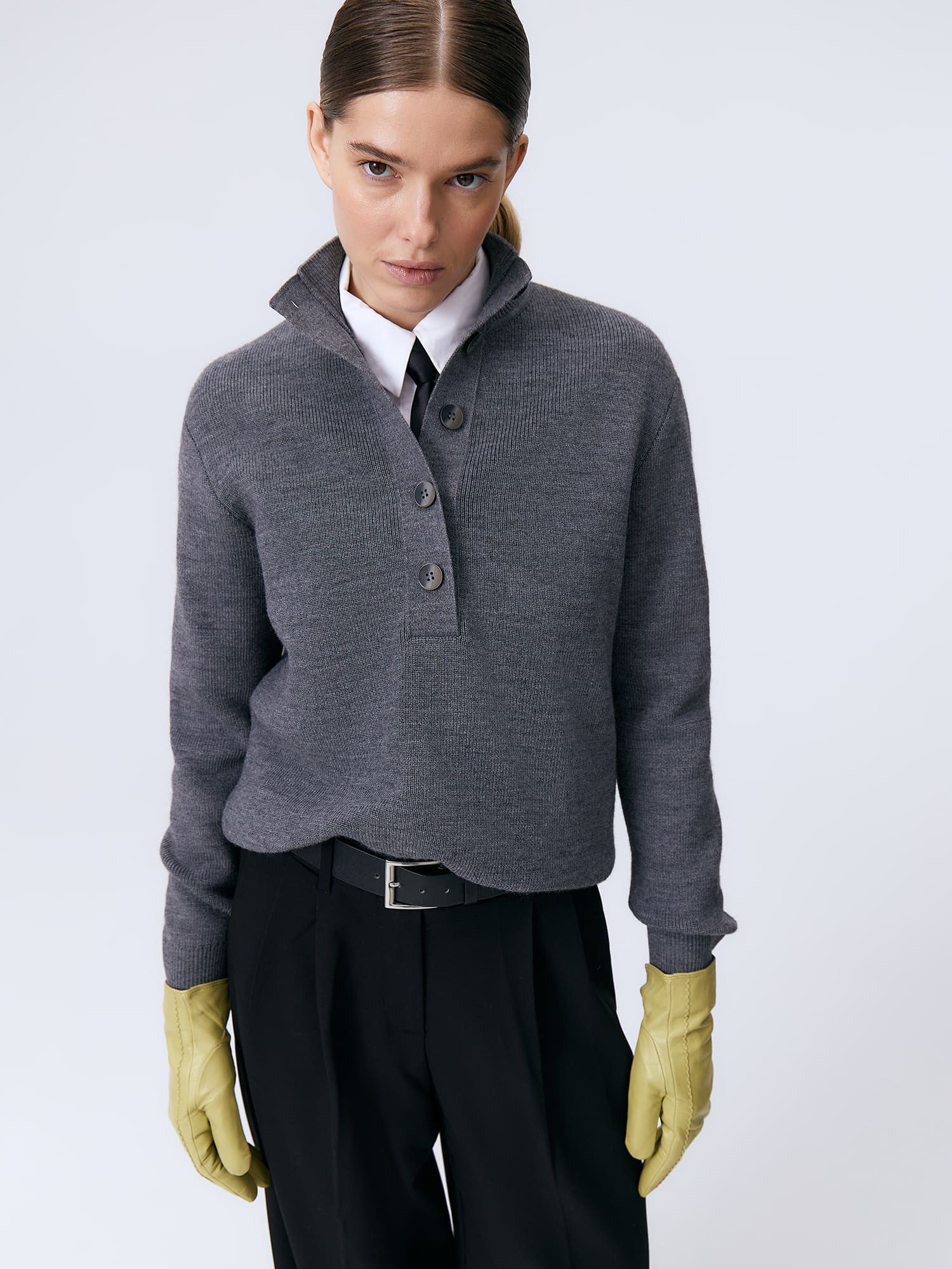 Мериносовый джемпер с высокой горловиной на пуговицах, способный адаптироваться под любую стилевую формальность. В застегнутом виде превращается в базовый теплый свитер, уютно укутывающий и позволяющий отказаться от шарфа на прогулке. Пара расстегнутых пуговиц на планке красиво приоткрывает шею, повышая градус непринужденности образа. В отделке низа и манжет использована наша любимая техника – широкая, расслабленная резинка. Она повторяет свободный силуэт джемпера, но при этом не позволяет трикотажу тянуться вниз.