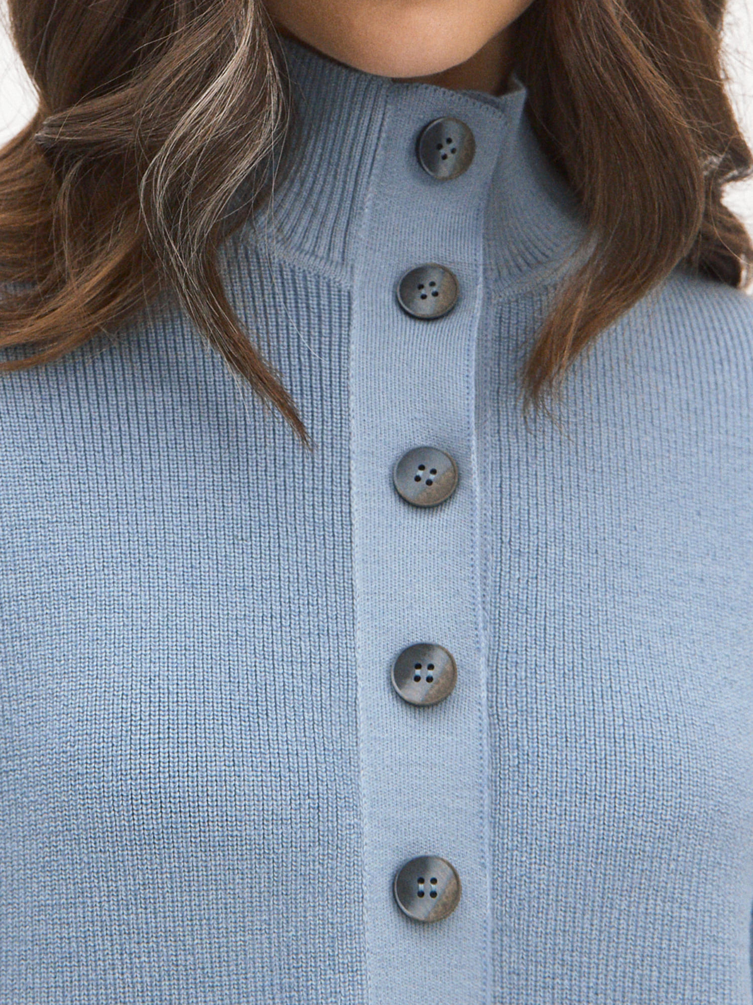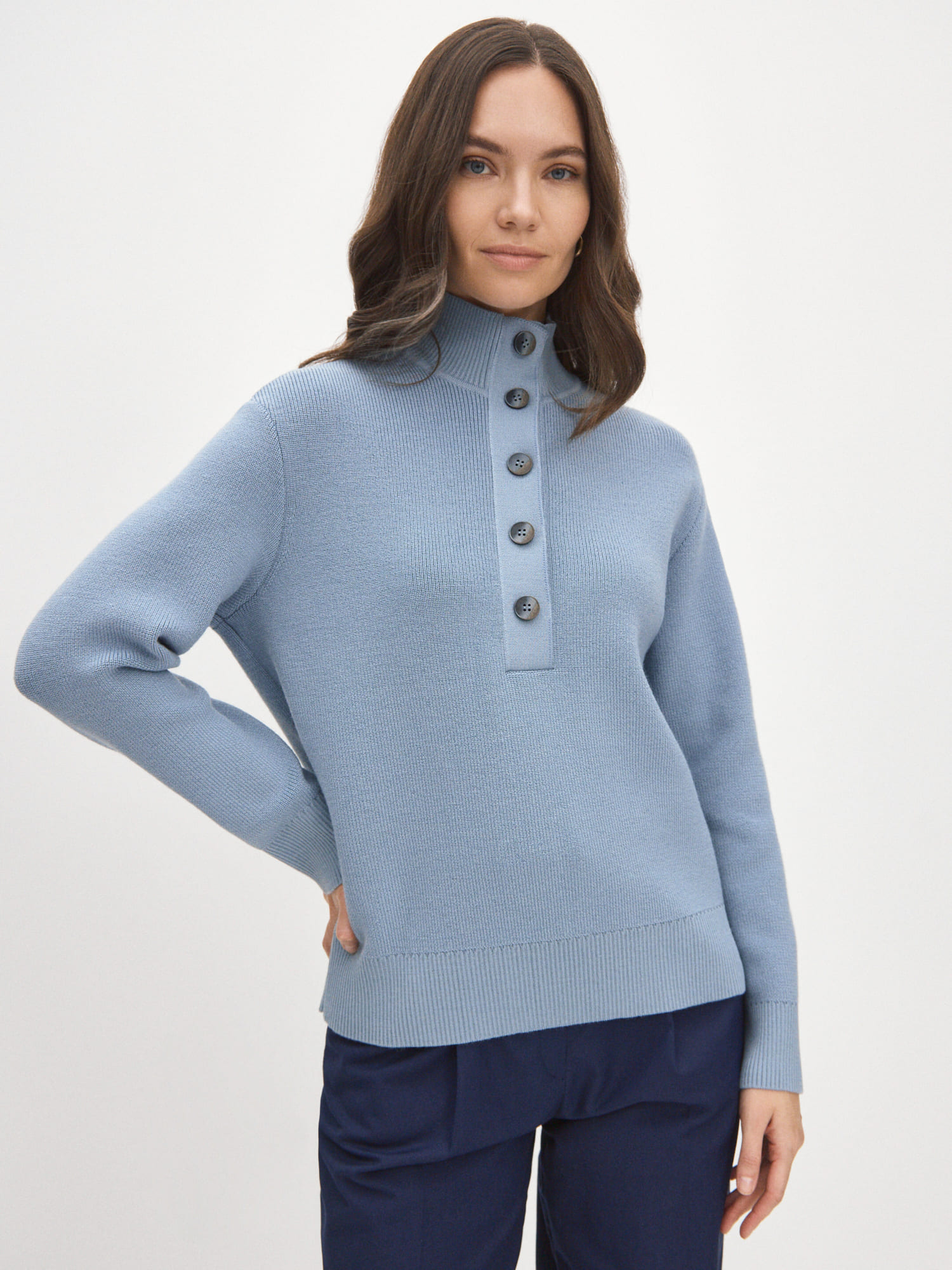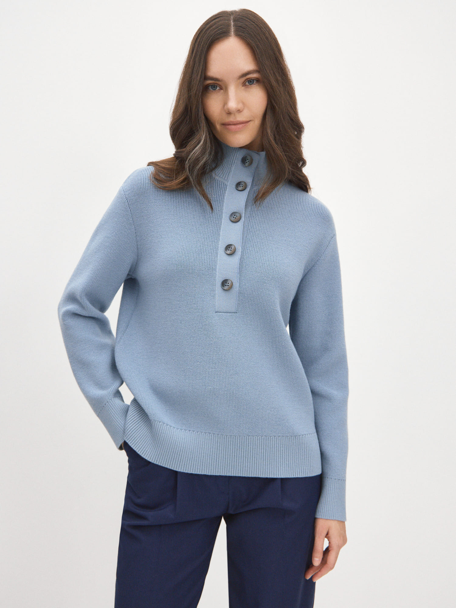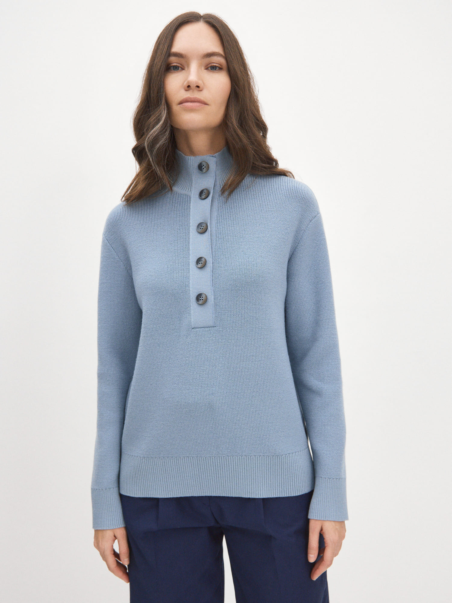 Мериносовый джемпер с высокой горловиной на пуговицах, способный адаптироваться под любую стилевую формальность. В застегнутом виде превращается в базовый теплый свитер, уютно укутывающий и позволяющий отказаться от шарфа на прогулке. Пара расстегнутых пуговиц на планке красиво приоткрывает шею, повышая градус непринужденности образа. В отделке низа и манжет использована наша любимая техника – широкая, расслабленная резинка. Она повторяет свободный силуэт джемпера, но при этом не позволяет трикотажу тянуться вниз.