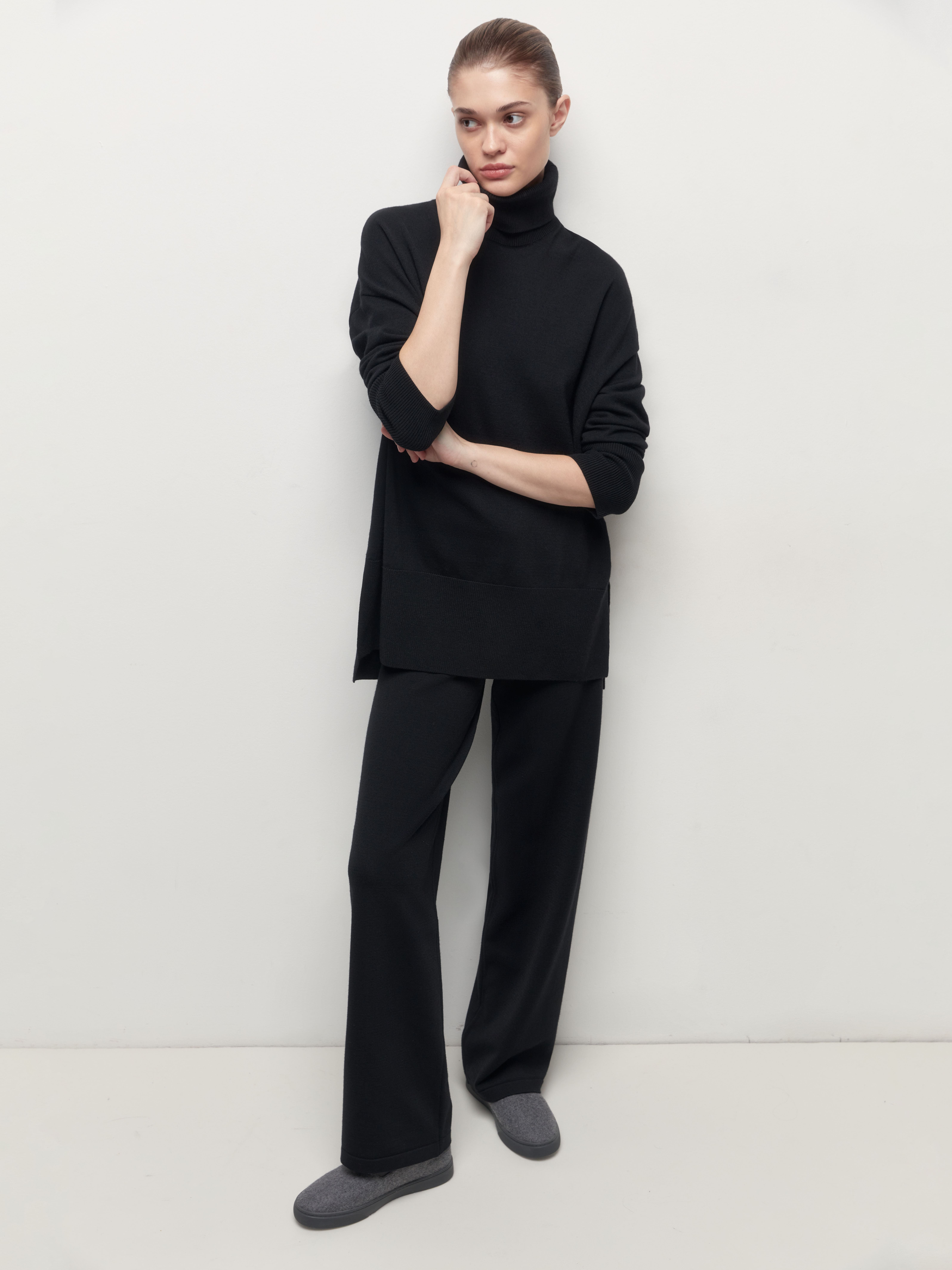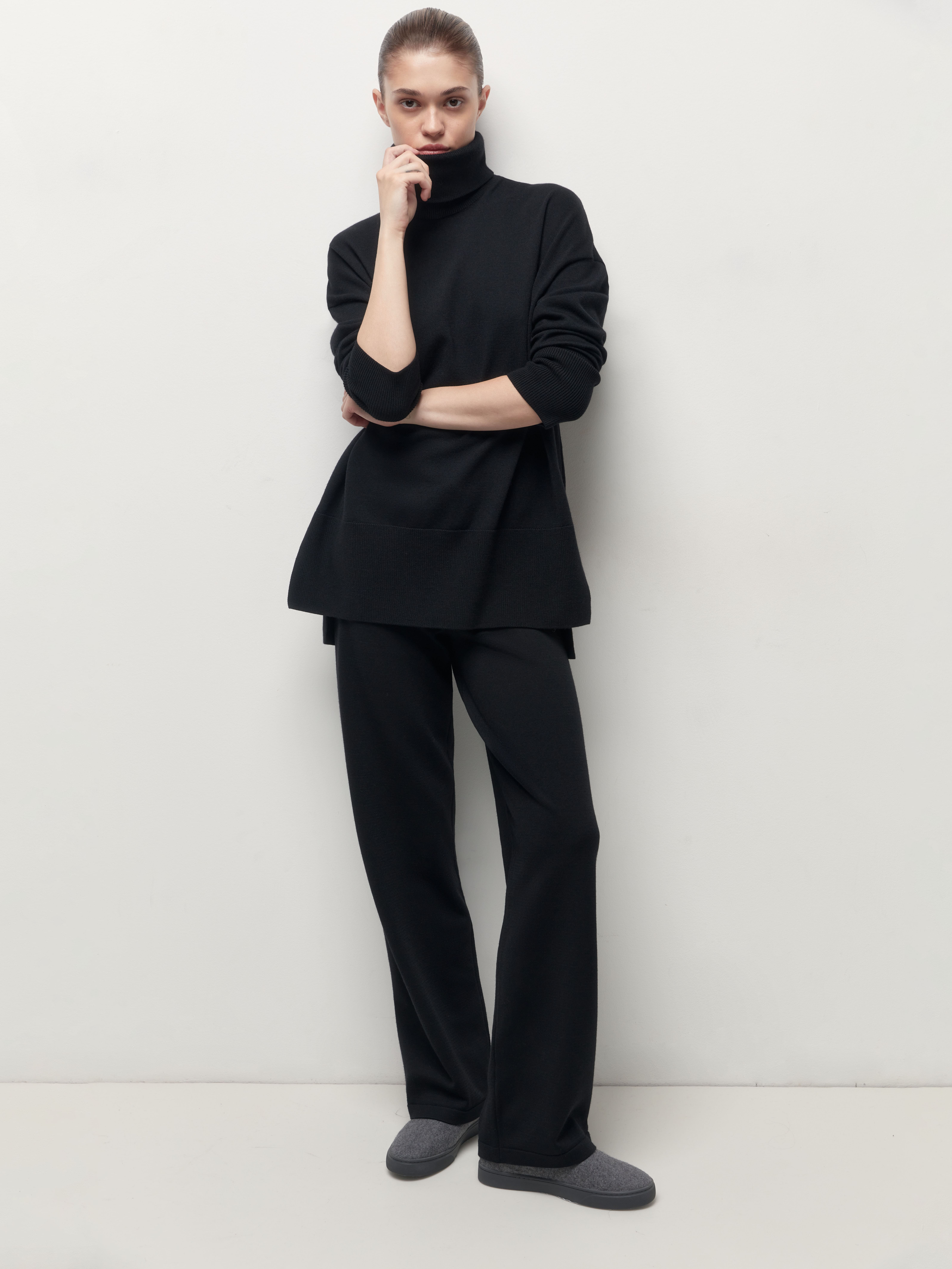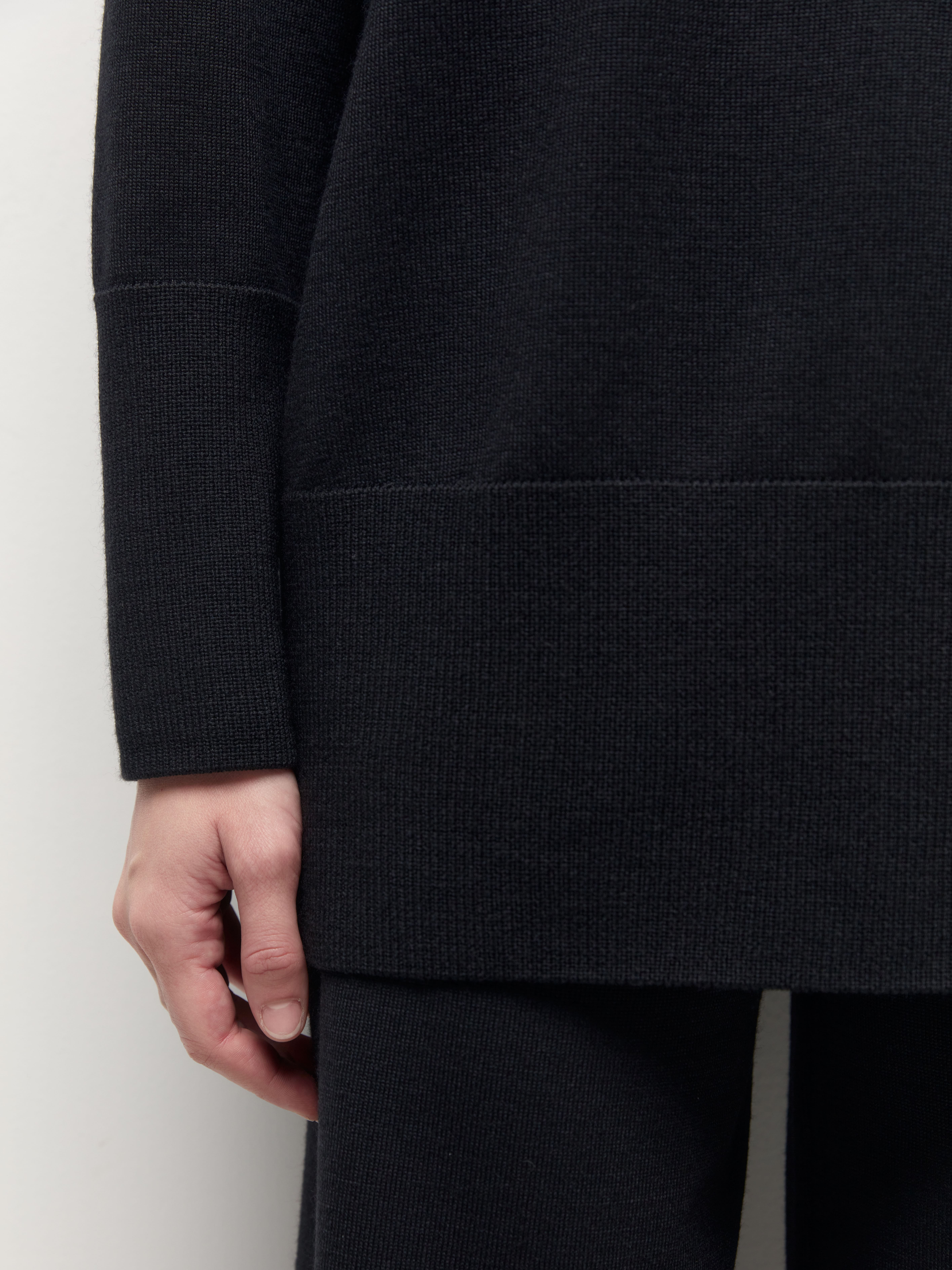 Удлиненный джемпер из шерстяного трикотажа смотрится небанально за счет нескольких деталей. Экстремально широкие манжеты и отделка нижней части дополняются контрастом между длинной спинкой и и укороченным передом свитера. Спущенный рукав визуально уменьшает ширину плеч. Состав изделия рассчитан на всех, кого пугает эффект покалывания, присущий натуральной шерсти. Для данной модели отбиралась особенно уютная пряжа с нежной вискозой, которая не колется и не вызывает раздражения.