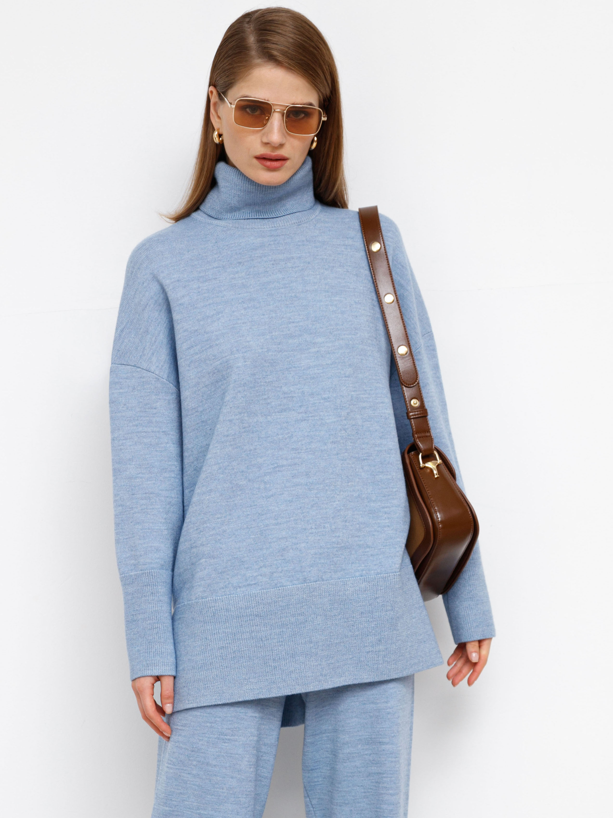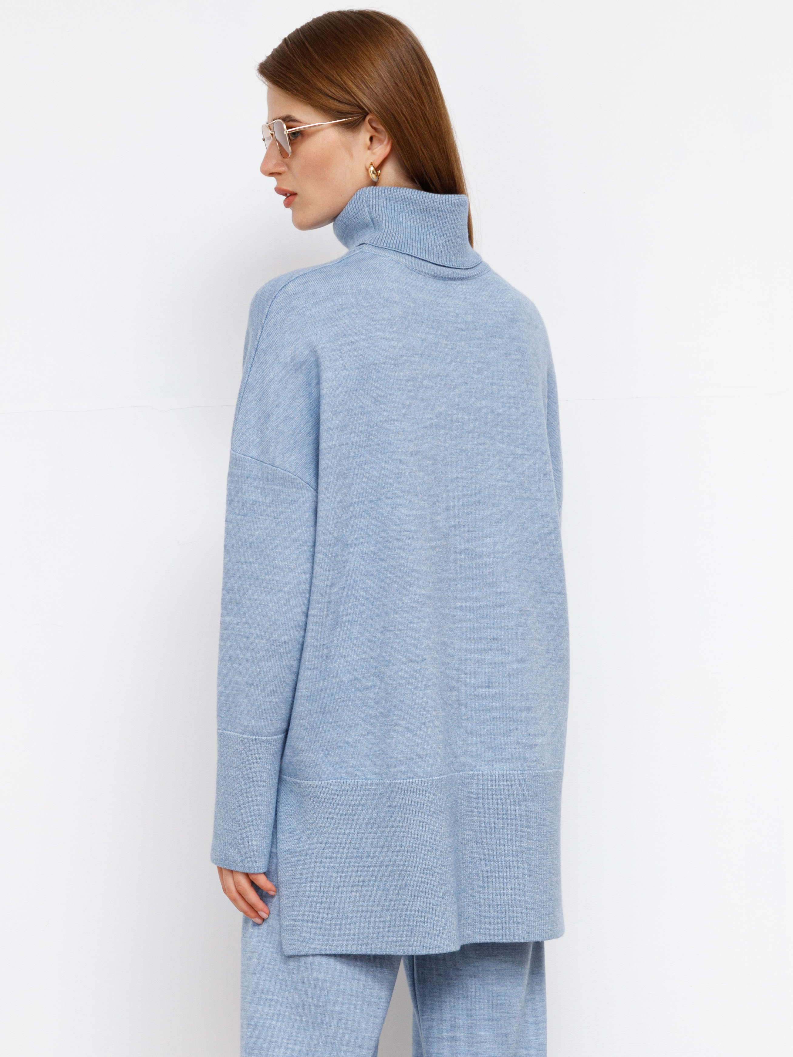 Удлиненный джемпер из шерстяного трикотажа смотрится небанально за счет нескольких деталей. Экстремально широкие манжеты и отделка нижней части дополняются контрастом между длинной спинкой и и укороченным передом свитера. Спущенный рукав визуально уменьшает ширину плеч. Состав изделия рассчитан на всех, кого пугает эффект покалывания, присущий натуральной шерсти. Для данной модели отбиралась особенно уютная пряжа с нежной вискозой, которая не колется и не вызывает раздражения.