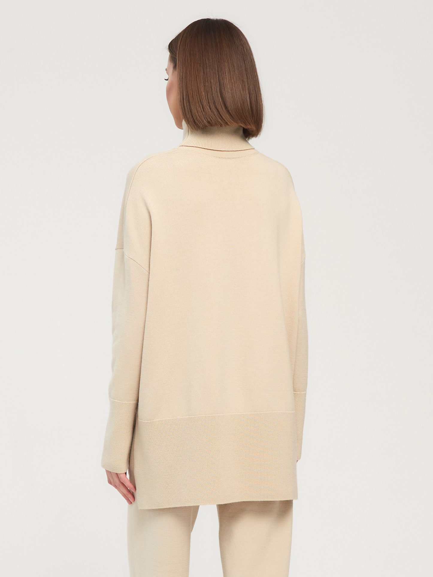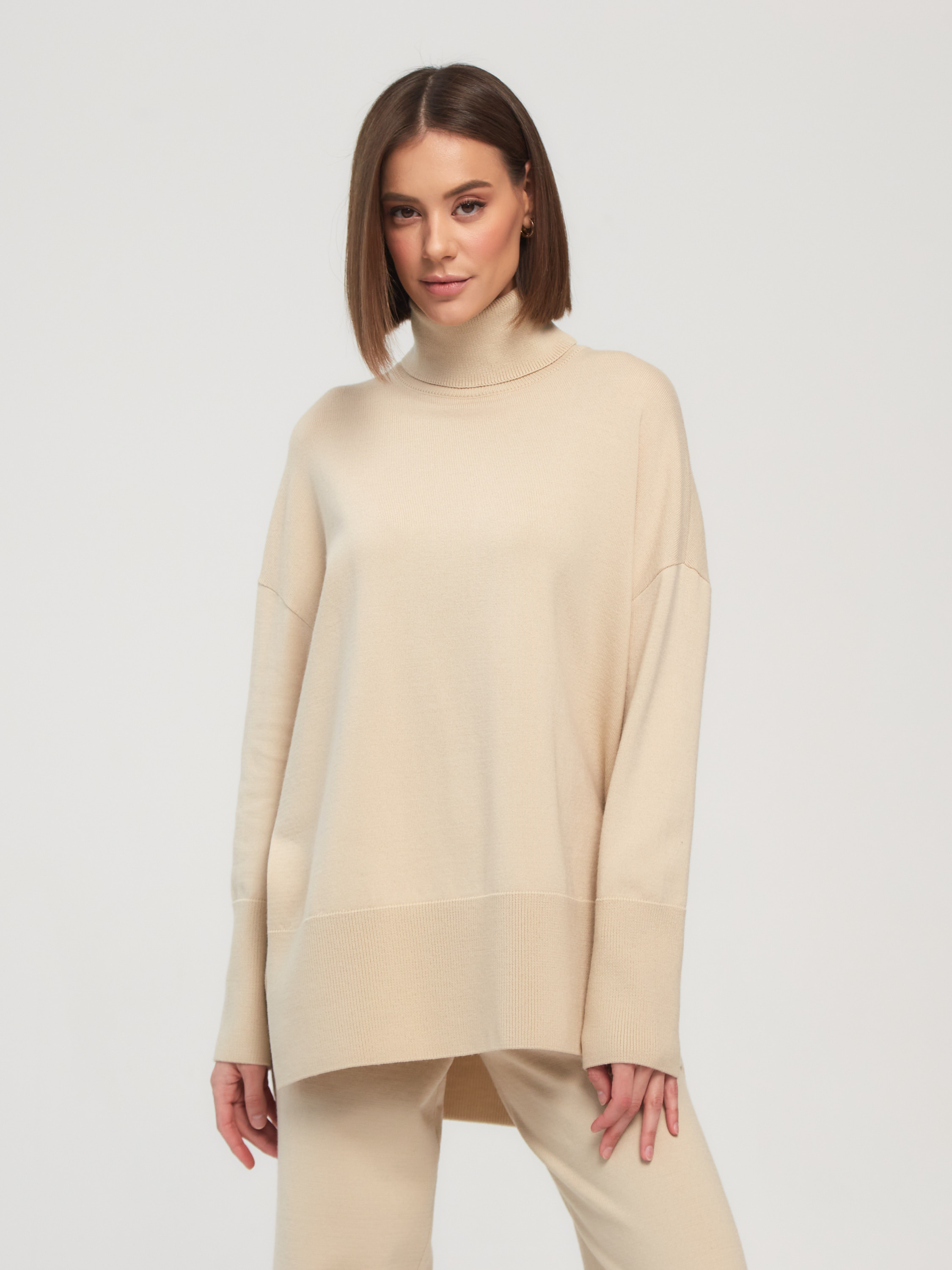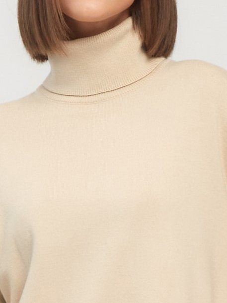 Удлиненный джемпер из шерстяного трикотажа смотрится небанально за счет нескольких деталей. Экстремально широкие манжеты и отделка нижней части дополняются контрастом между длинной спинкой и и укороченным передом свитера. Спущенный рукав визуально уменьшает ширину плеч. Состав изделия рассчитан на всех, кого пугает эффект покалывания, присущий натуральной шерсти. Для данной модели отбиралась особенно уютная пряжа с нежной вискозой, которая не колется и не вызывает раздражения.