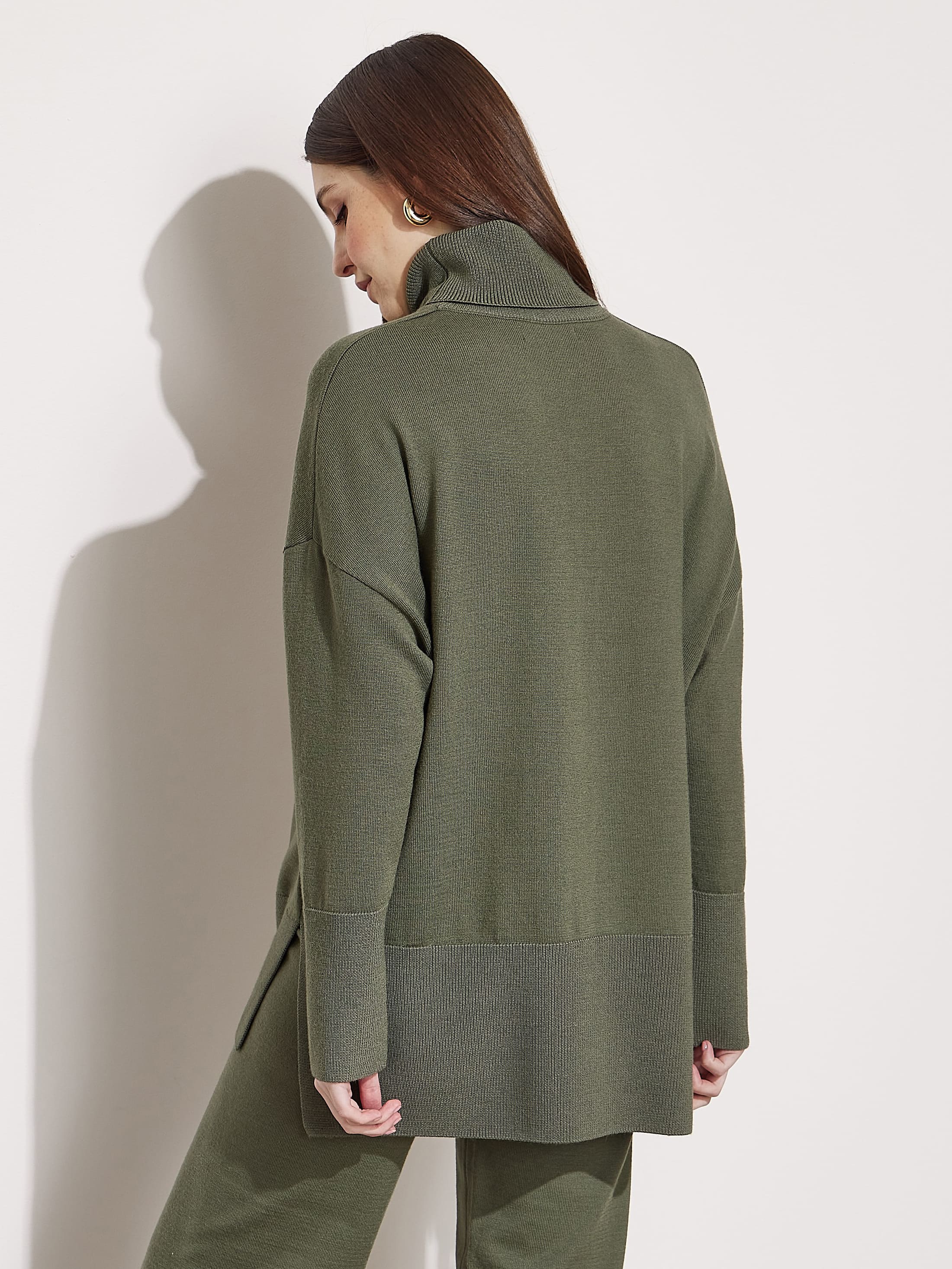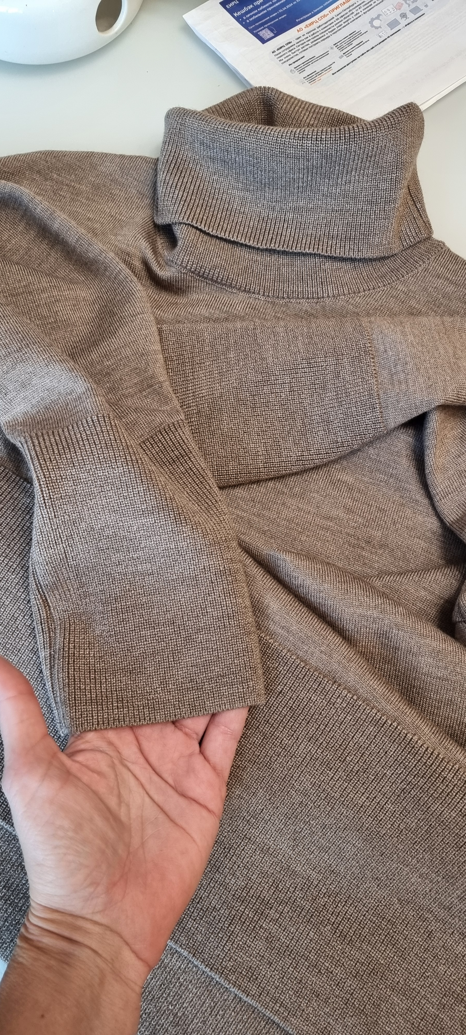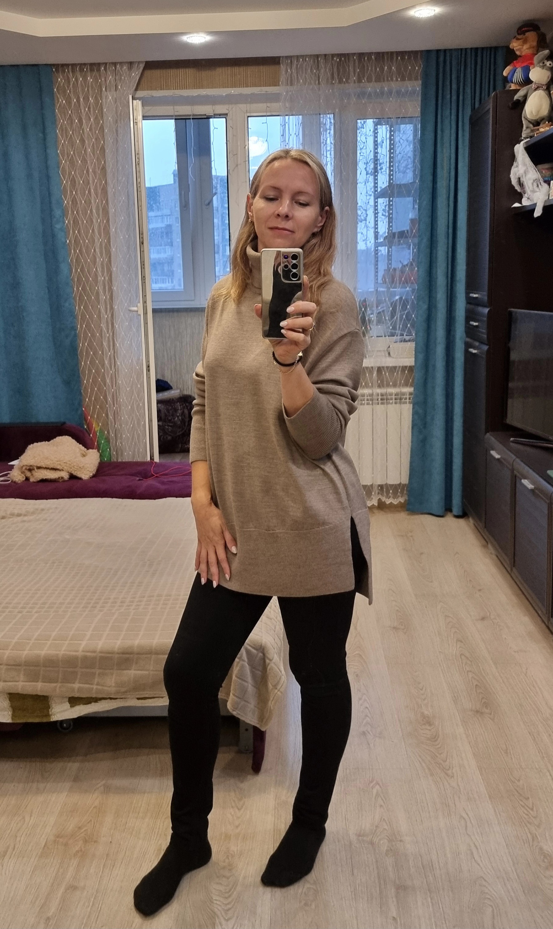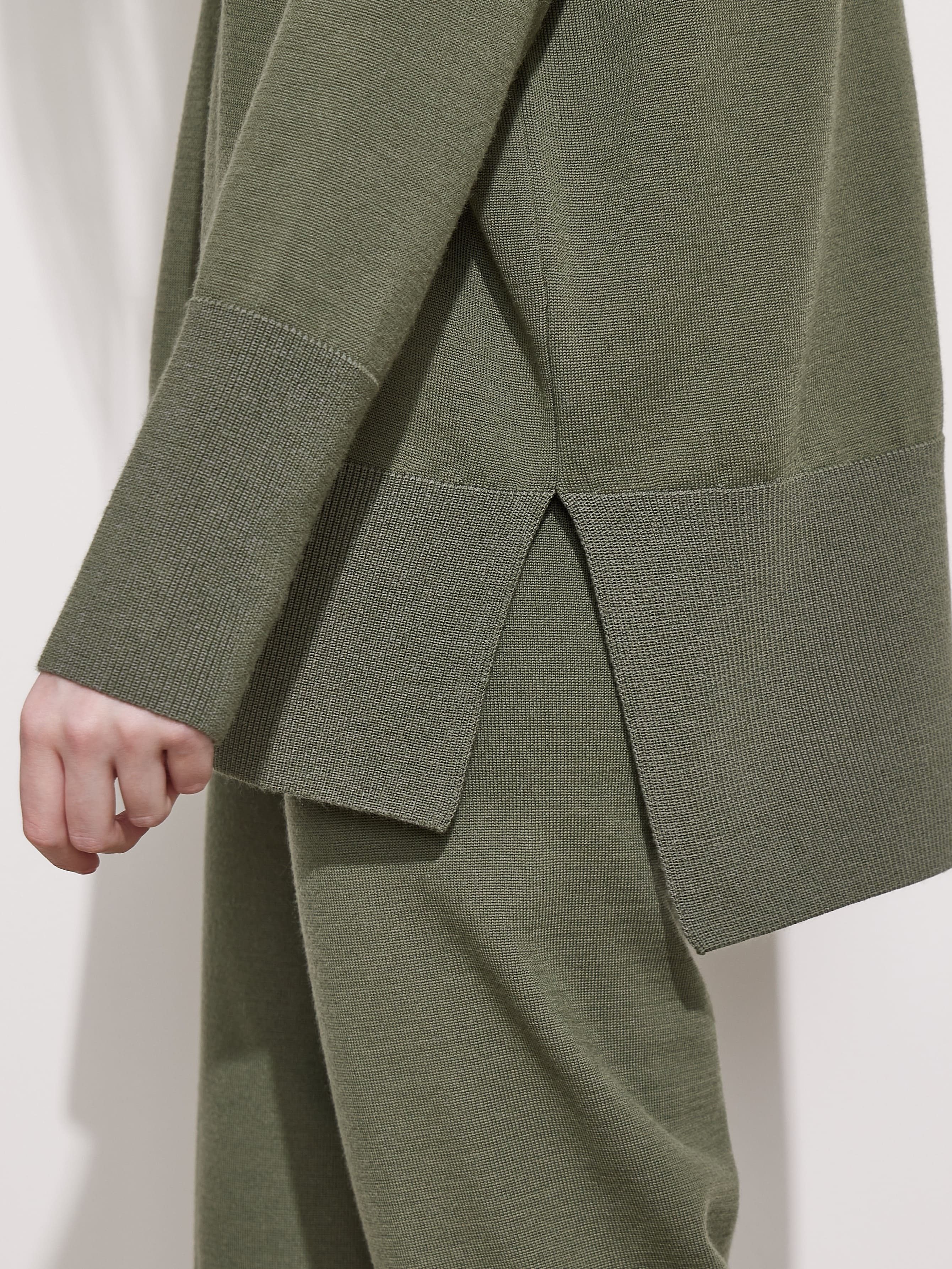 Удлиненный джемпер из шерстяного трикотажа смотрится небанально за счет нескольких деталей. Экстремально широкие манжеты и отделка нижней части дополняются контрастом между длинной спинкой и и укороченным передом свитера. Спущенный рукав визуально уменьшает ширину плеч. Состав изделия рассчитан на всех, кого пугает эффект покалывания, присущий натуральной шерсти. Для данной модели отбиралась особенно уютная пряжа с нежной вискозой, которая не колется и не вызывает раздражения.
