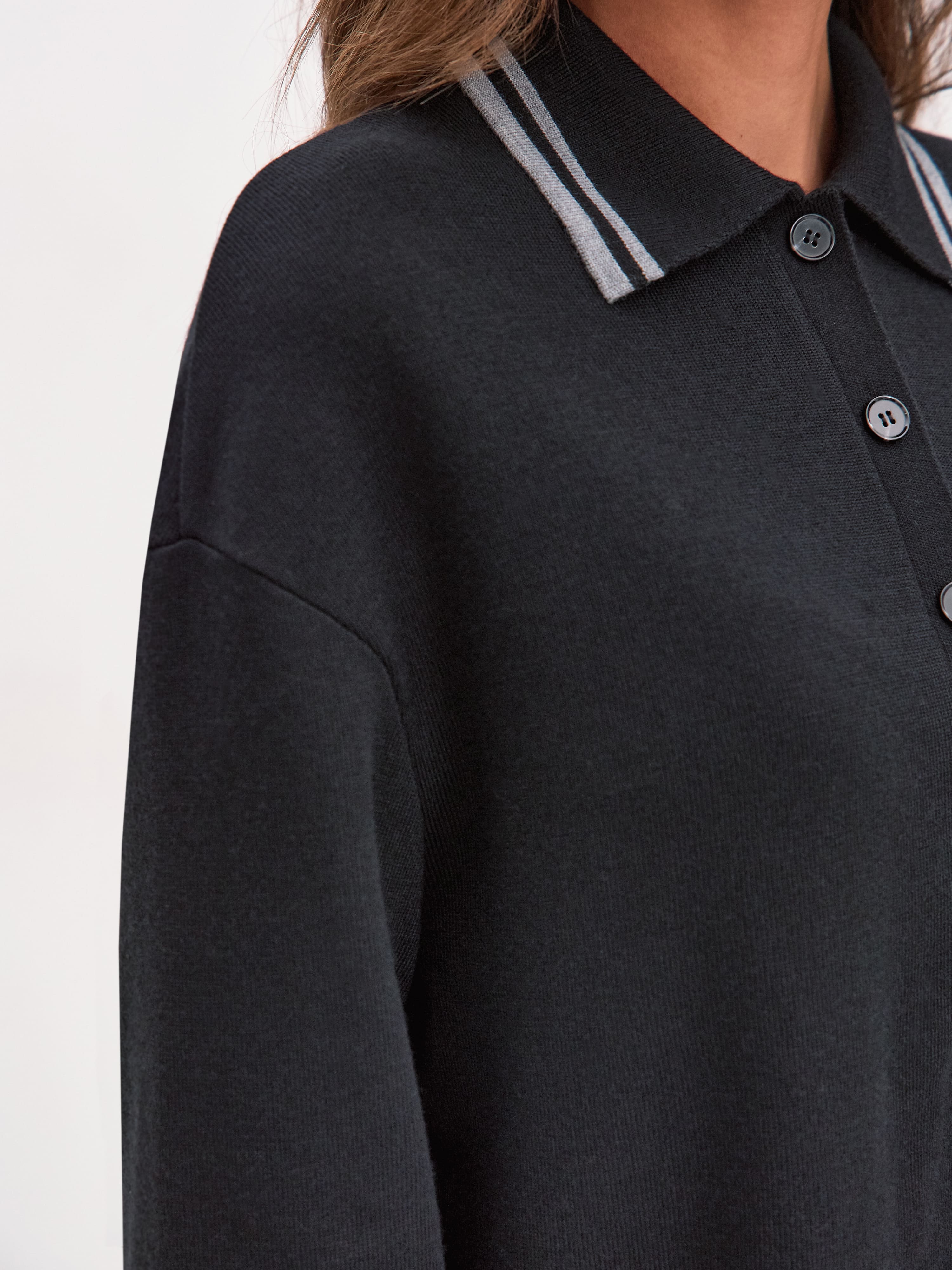 Удлиненная модель джемпера-поло, в которой расслабленность силуэта компенсируется сдержанной геометрией отделки. Связана из очень деликатного микса мериносовой шерсти и ласкающей вискозы. Особенности: заниженная зона плеча, воротник поло, вывязанные резинкой низ и манжеты, противостоящие деформации краев. Трикотажное полотно характеризует красивый шелковистый финиш, превращающий поло в базовую единицу не только повседневного, но и выходного образа.
