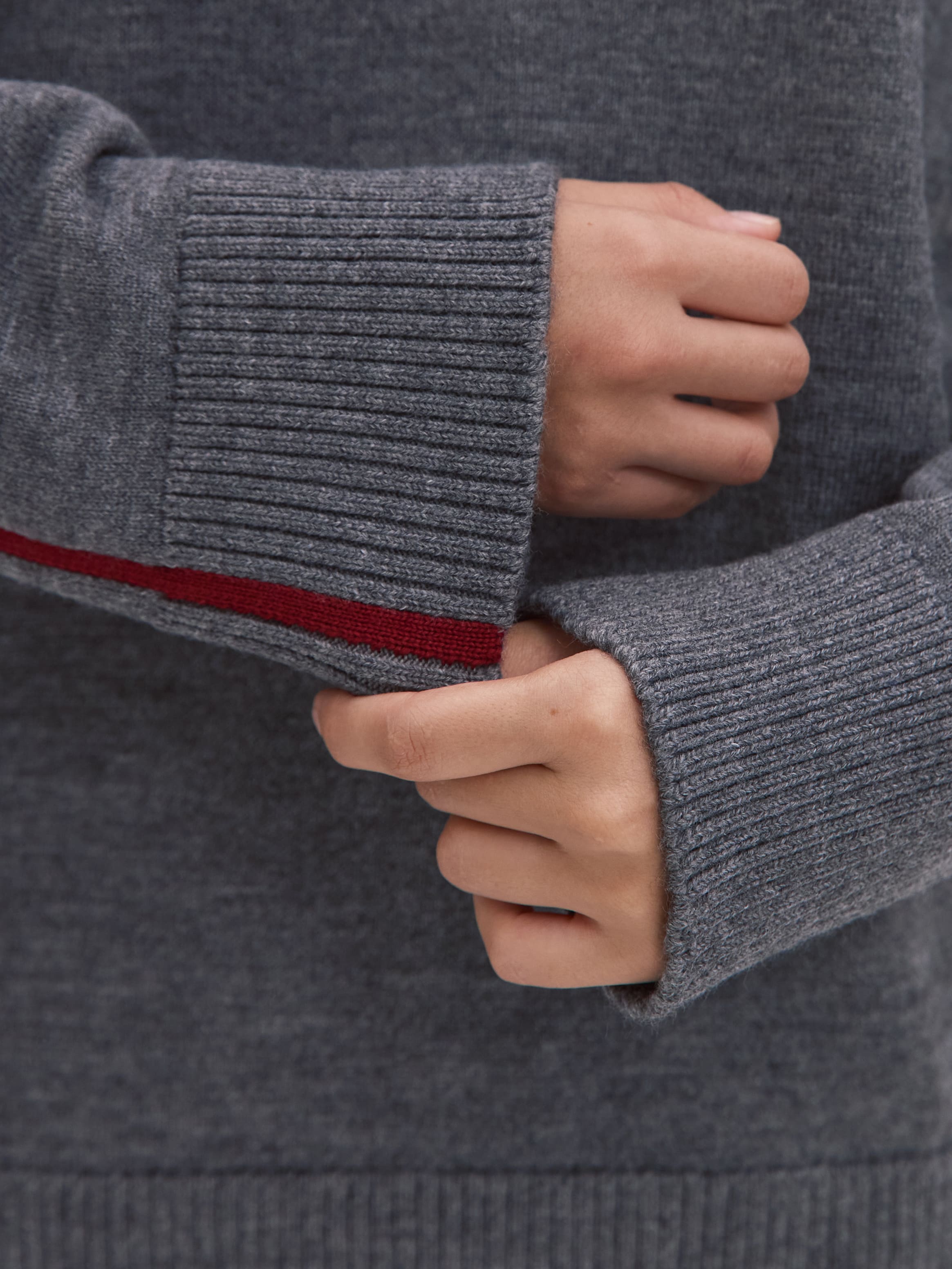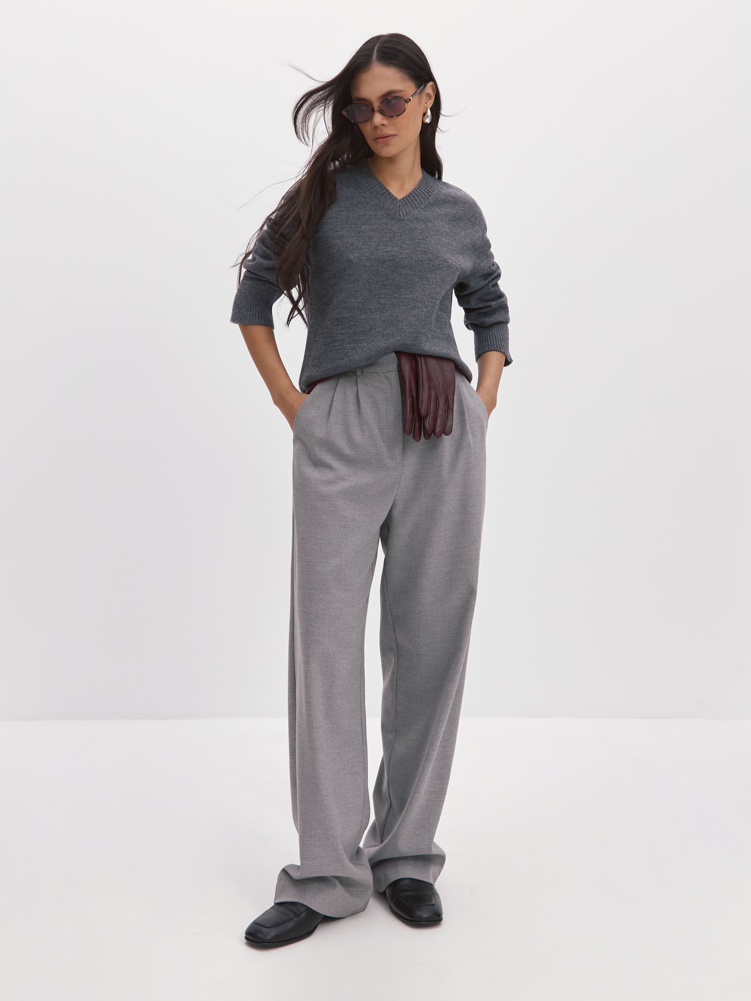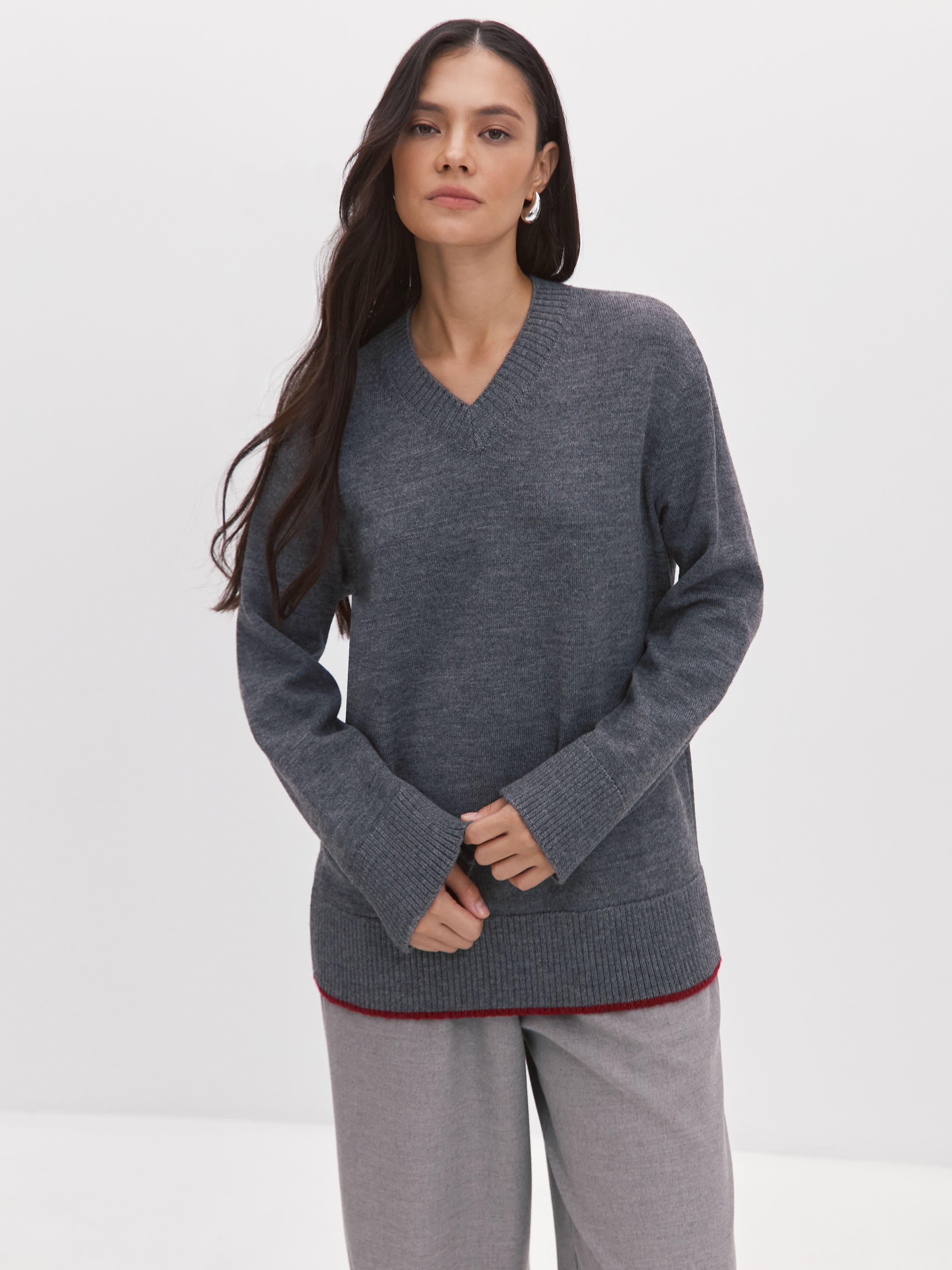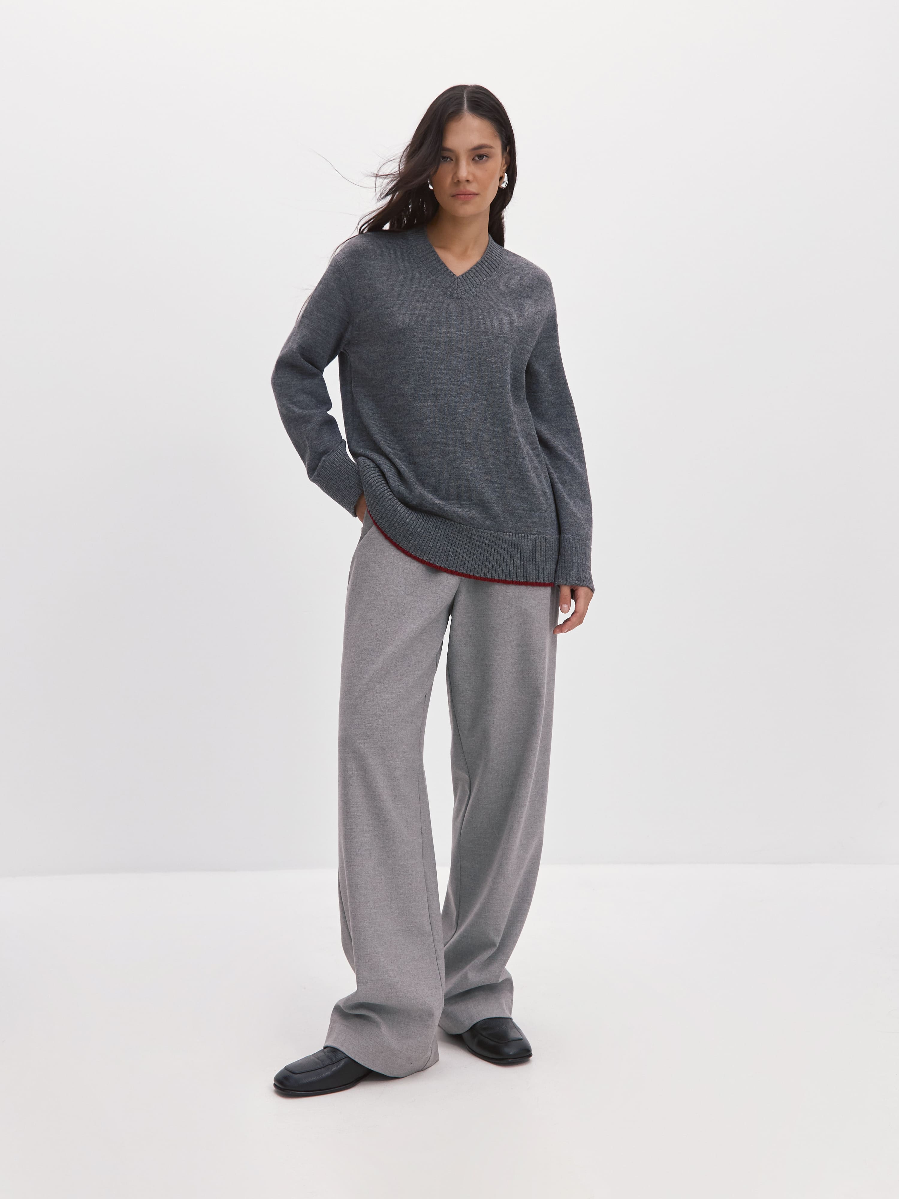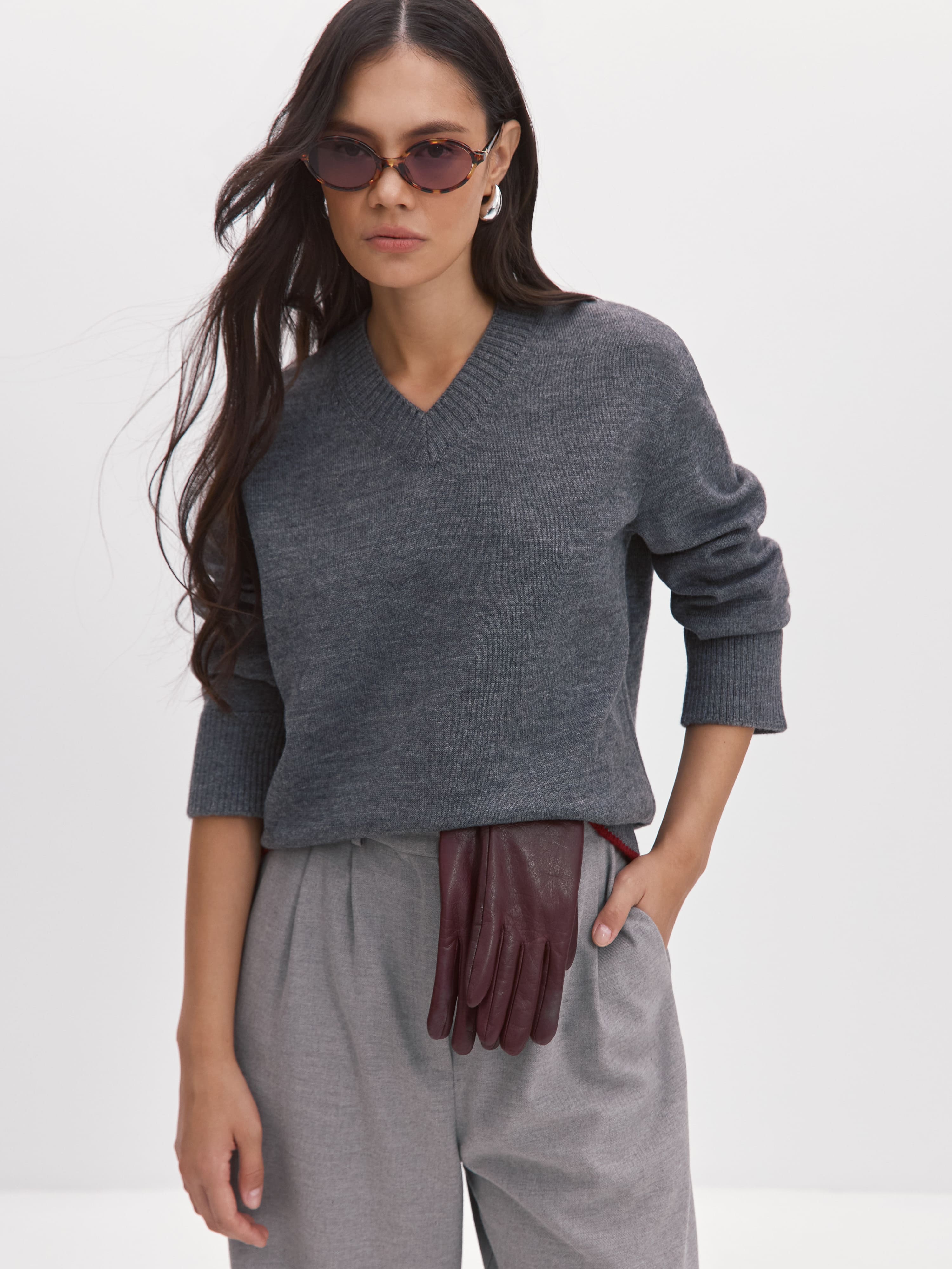 Теплый, сдержанно-свободный джемпер-база с уплотненной структурой плетения. С первым похолоданием превращается в вещь №1 в гардеробе, благодаря трикотажу с мериносовой шерстью. Толщина шерстяного волоска мериноса не превышает 23 микрон. Это почти в два раза меньше, чем у обычной шерсти. Изделия из такой нити отличает особая шелковистая мягкость. Непринужденность силуэта обыграна спущенной линией плеча, просторным кроем, а также широкой, не стягивающей резинкой по низу и манжетам джемпера. V-образный вырез оставляет место для аксессуаров.