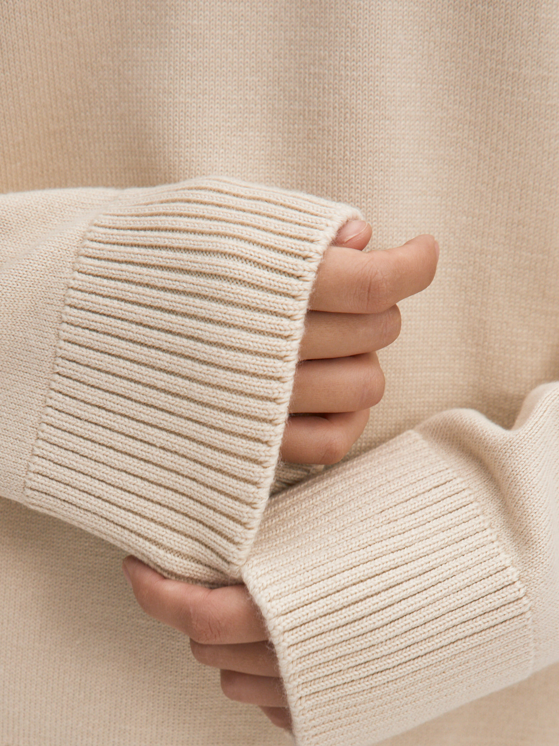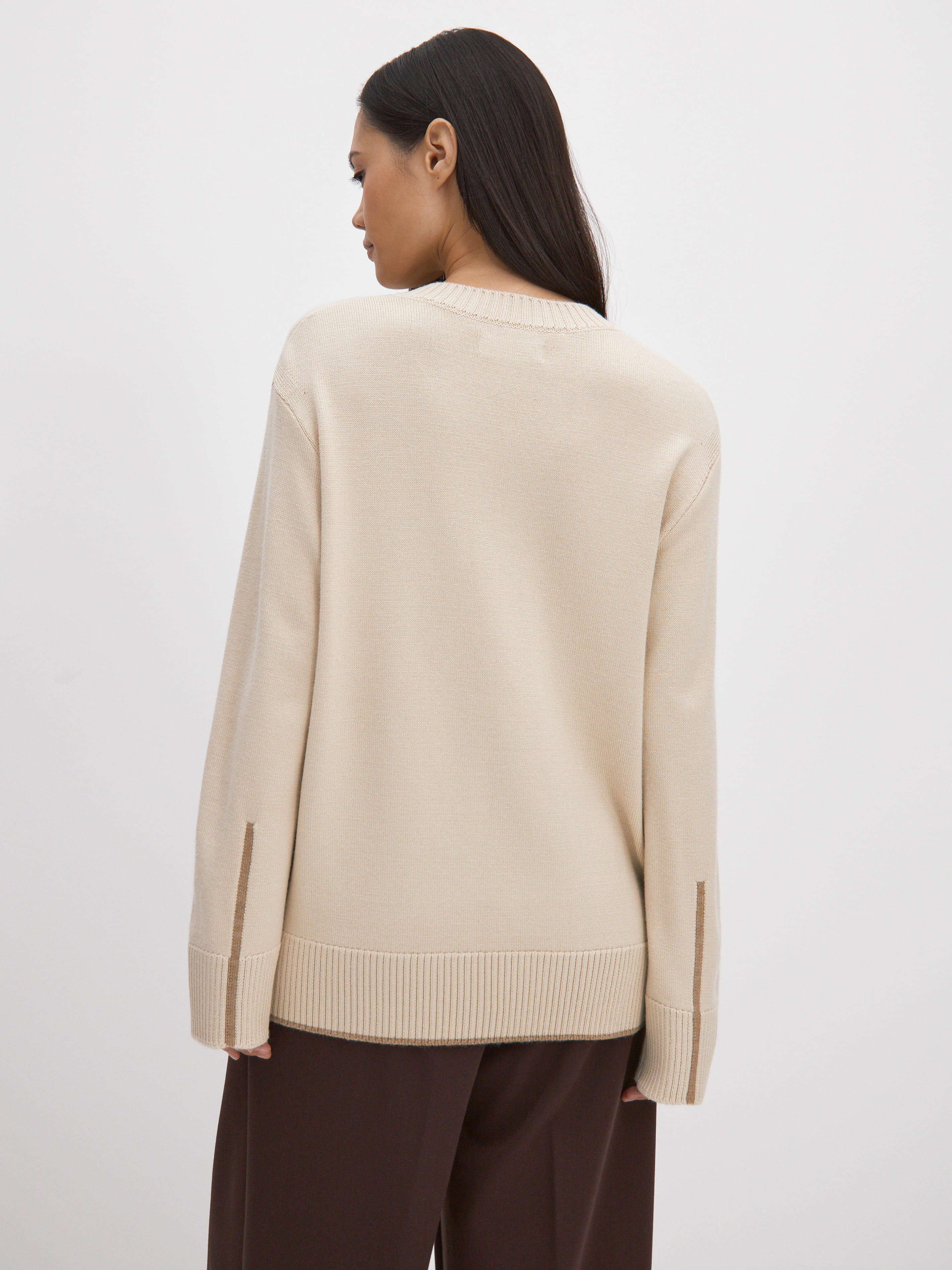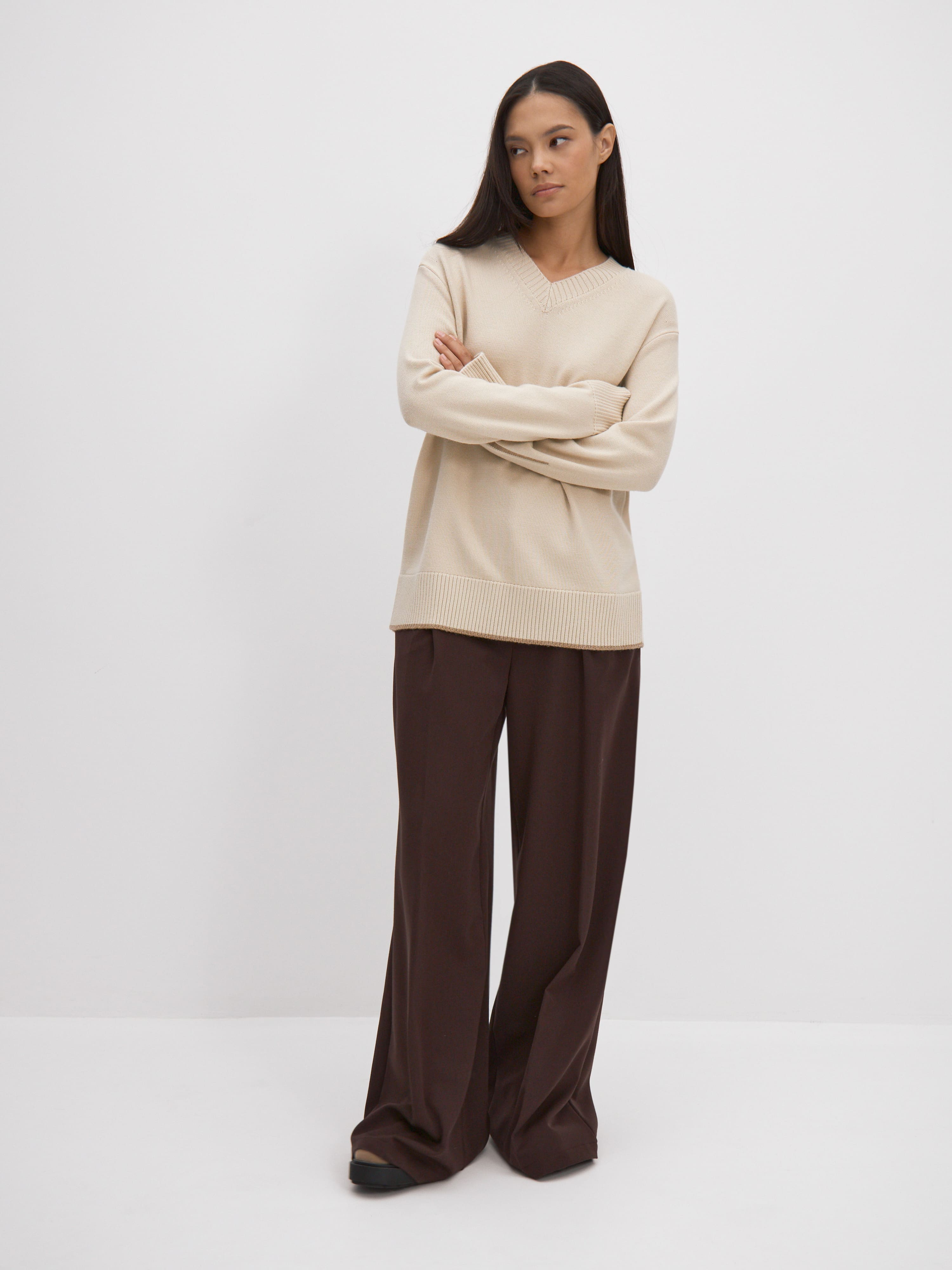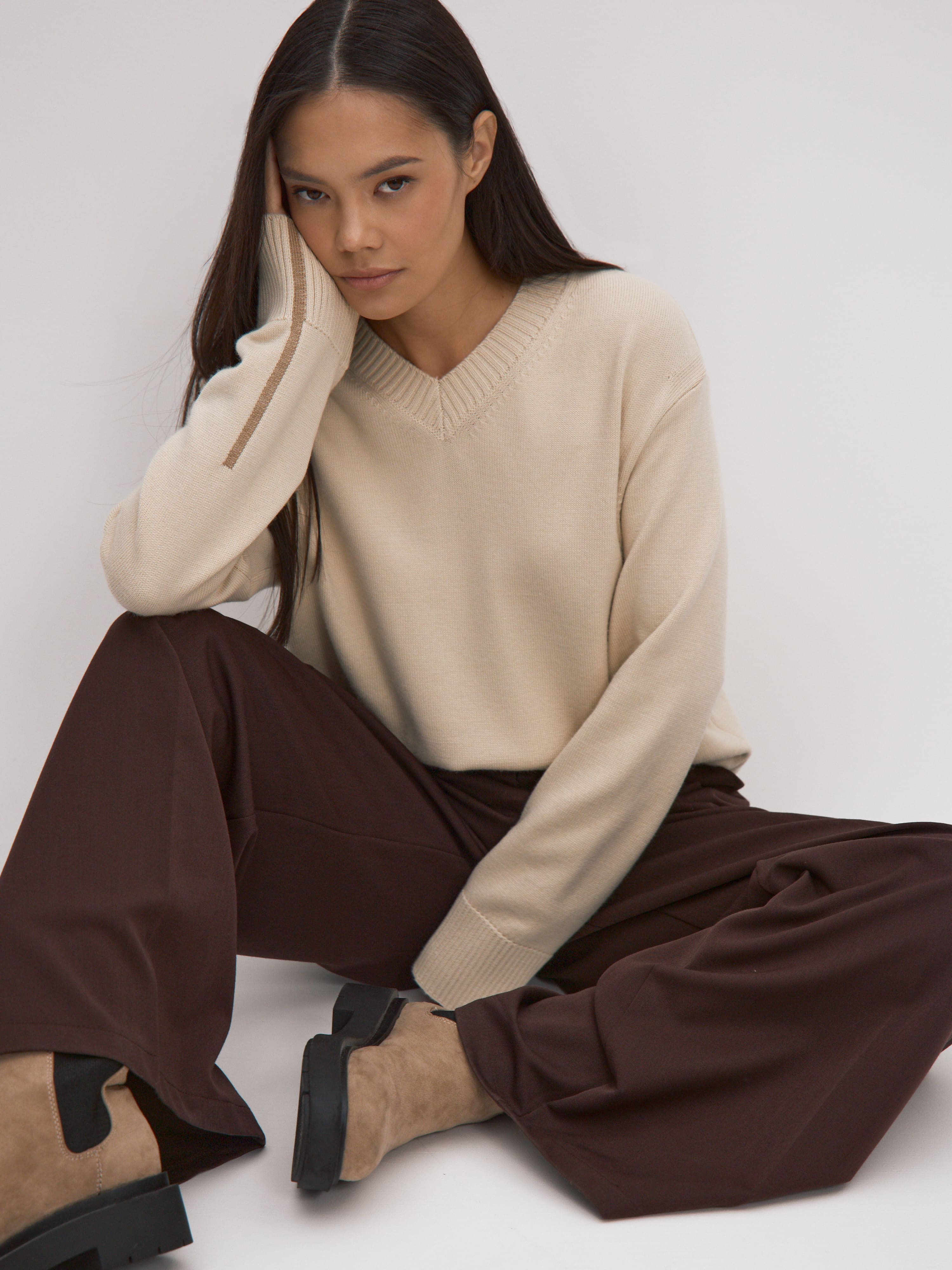 Теплый, сдержанно-свободный джемпер-база с уплотненной структурой плетения. С первым похолоданием превращается в вещь №1 в гардеробе, благодаря трикотажу с мериносовой шерстью. Толщина шерстяного волоска мериноса не превышает 23 микрон. Это почти в два раза меньше, чем у обычной шерсти. Изделия из такой нити отличает особая шелковистая мягкость. Непринужденность силуэта обыграна спущенной линией плеча, просторным кроем, а также широкой, не стягивающей резинкой по низу и манжетам джемпера. V-образный вырез оставляет место для аксессуаров.