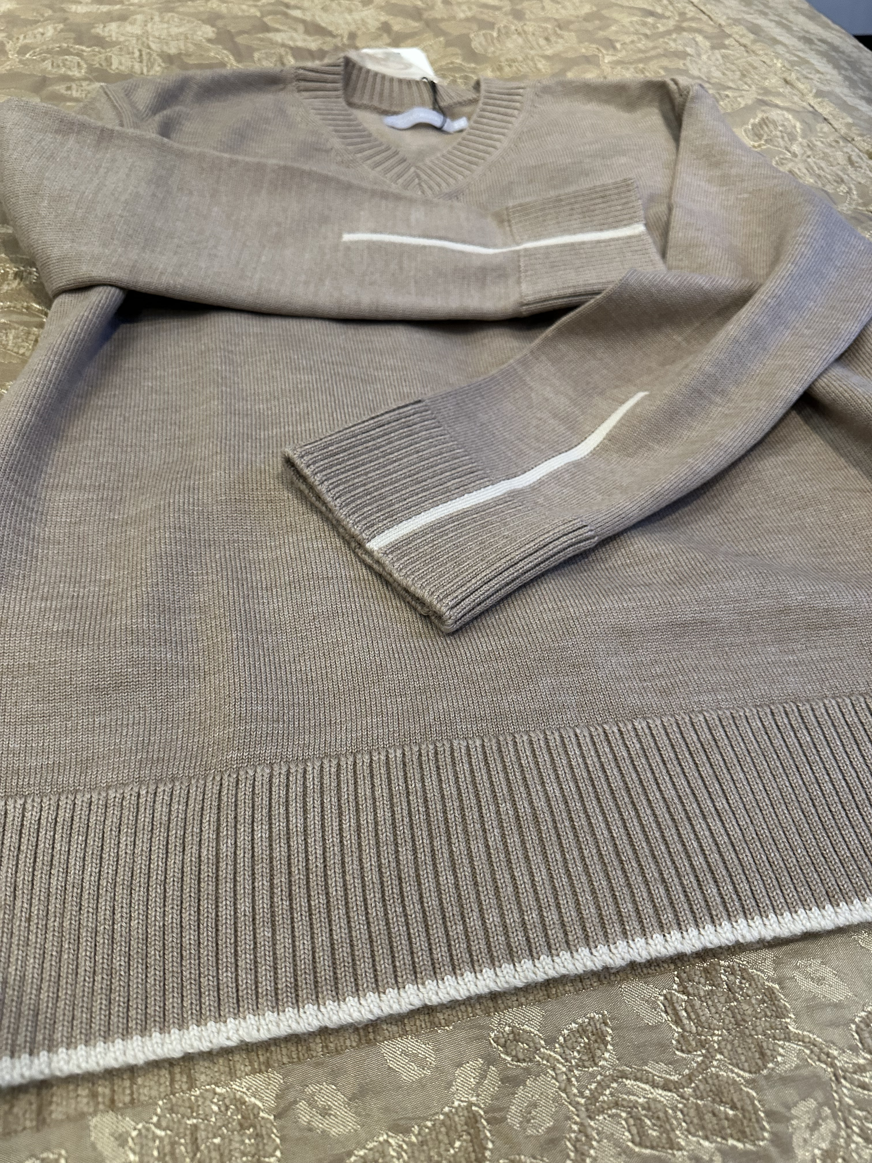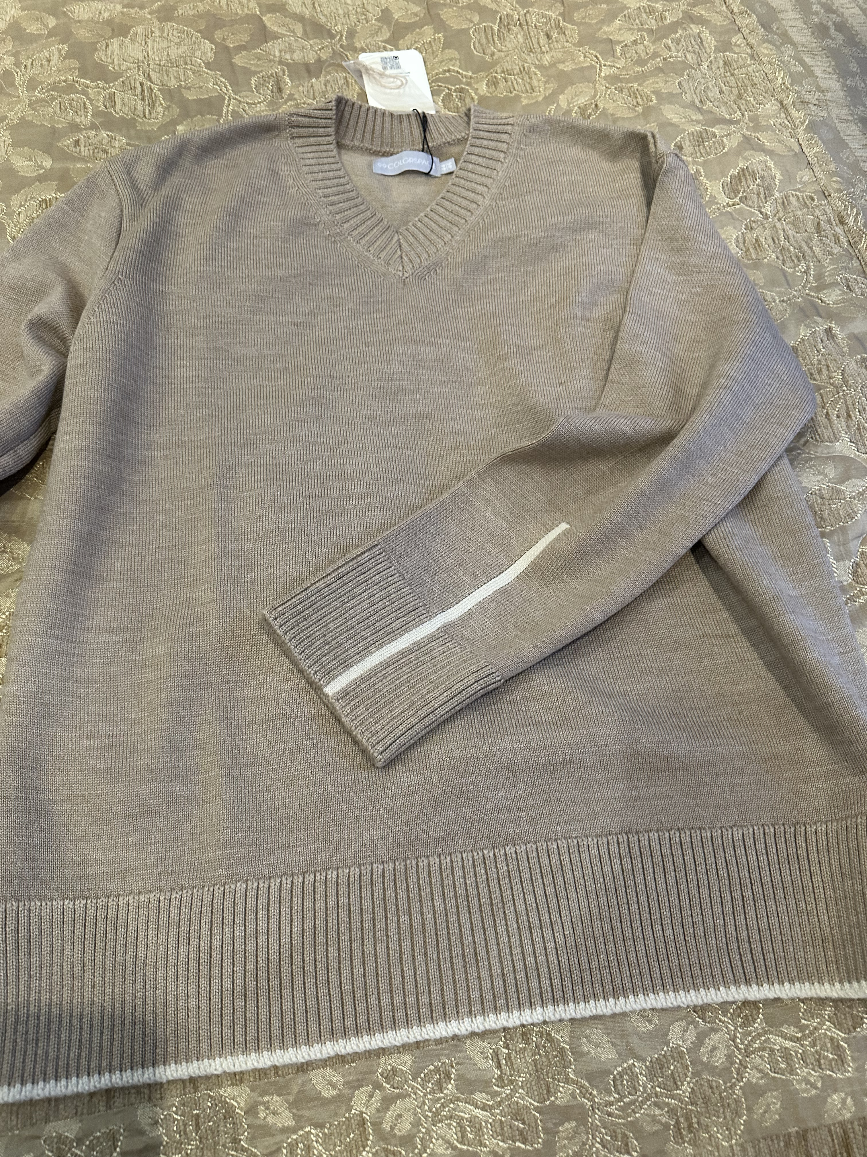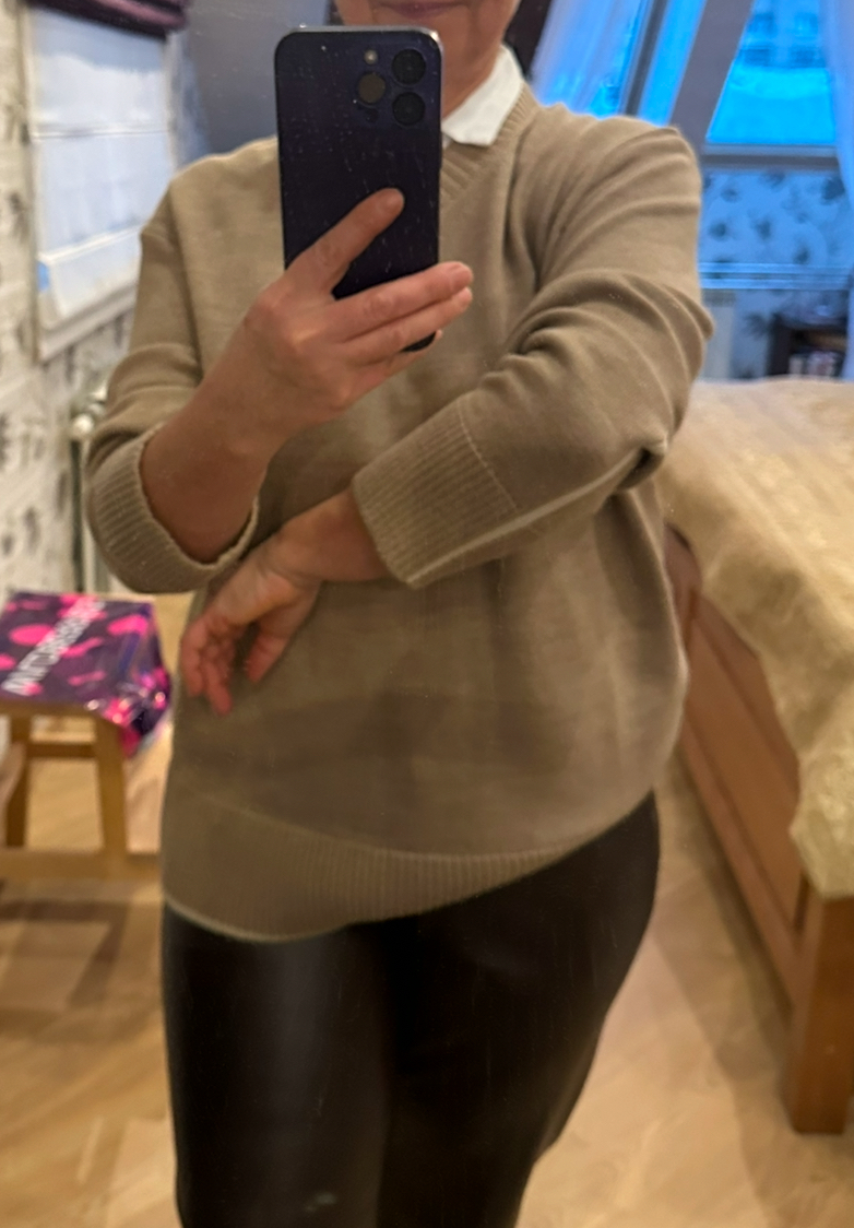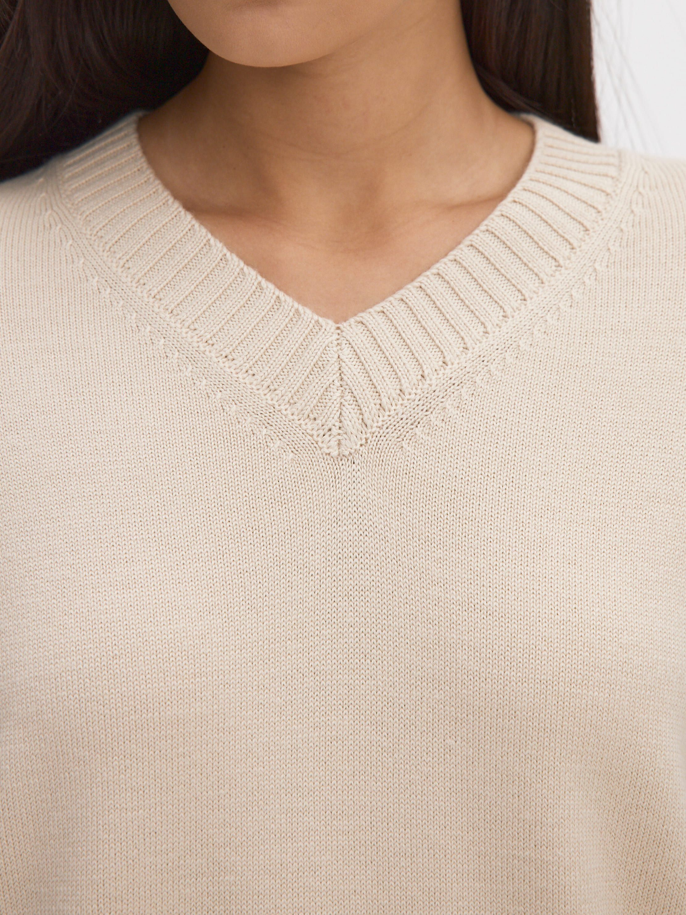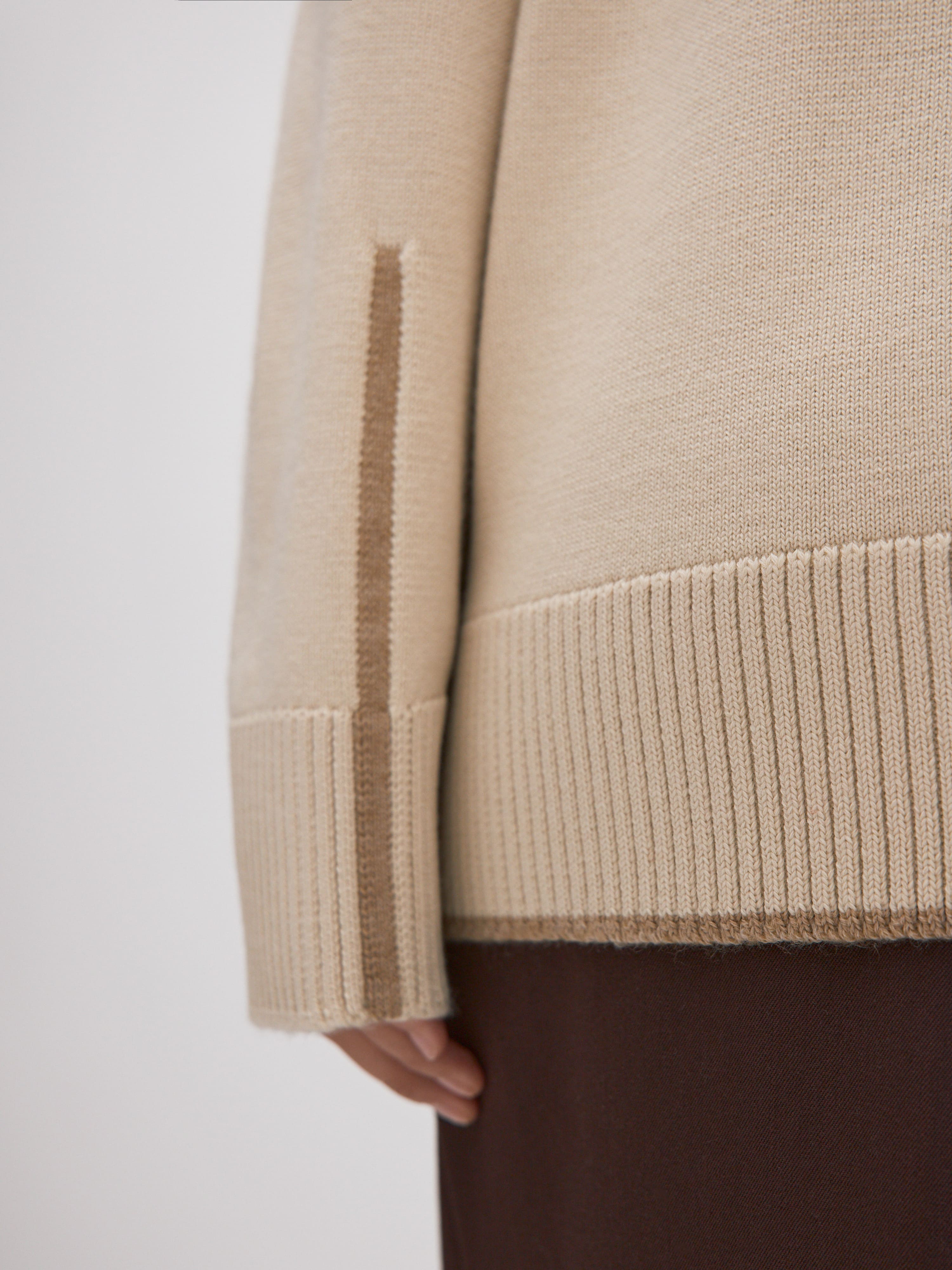 Теплый, сдержанно-свободный джемпер-база с уплотненной структурой плетения. С первым похолоданием превращается в вещь №1 в гардеробе, благодаря трикотажу с мериносовой шерстью. Толщина шерстяного волоска мериноса не превышает 23 микрон. Это почти в два раза меньше, чем у обычной шерсти. Изделия из такой нити отличает особая шелковистая мягкость. Непринужденность силуэта обыграна спущенной линией плеча, просторным кроем, а также широкой, не стягивающей резинкой по низу и манжетам джемпера. V-образный вырез оставляет место для аксессуаров.