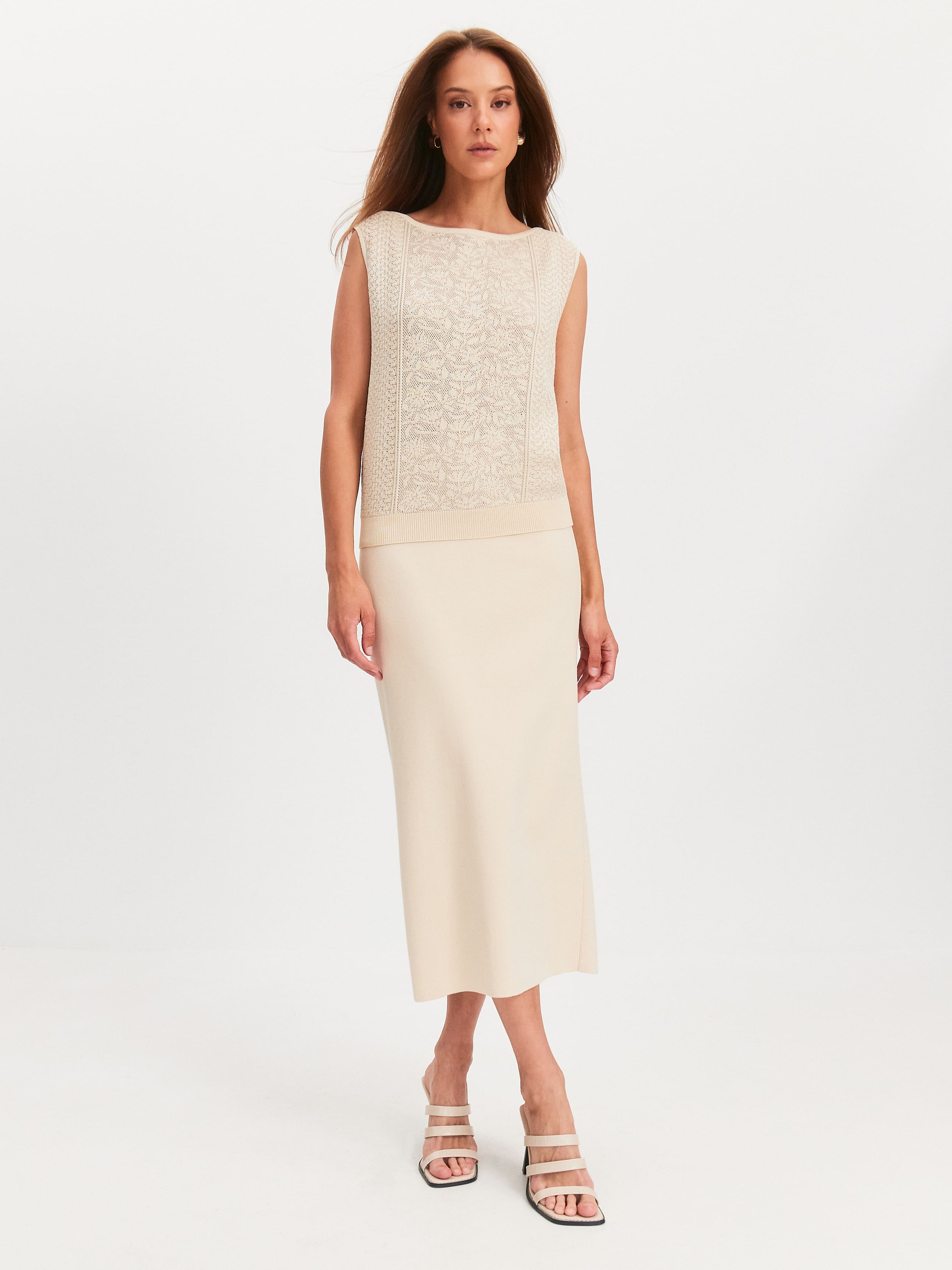 Самая романтическая версия жилета в летней коллекции бренда. Авторская модель из хлопко-вискозы сочетает в себе нейтральный крой и эксклюзивную комбинацию вязаного узора. Центральная вставка – это сложный флористический паттерн, напоминающий гипюр. Ажурные орнаменты по бокам усиливают кружевную эстетику изделия. Эластичная резинка по нижнему краю способствует сохранению формы. Горловина жилета обработана вязаной бейкой для подчеркивания идеально округлого контура.