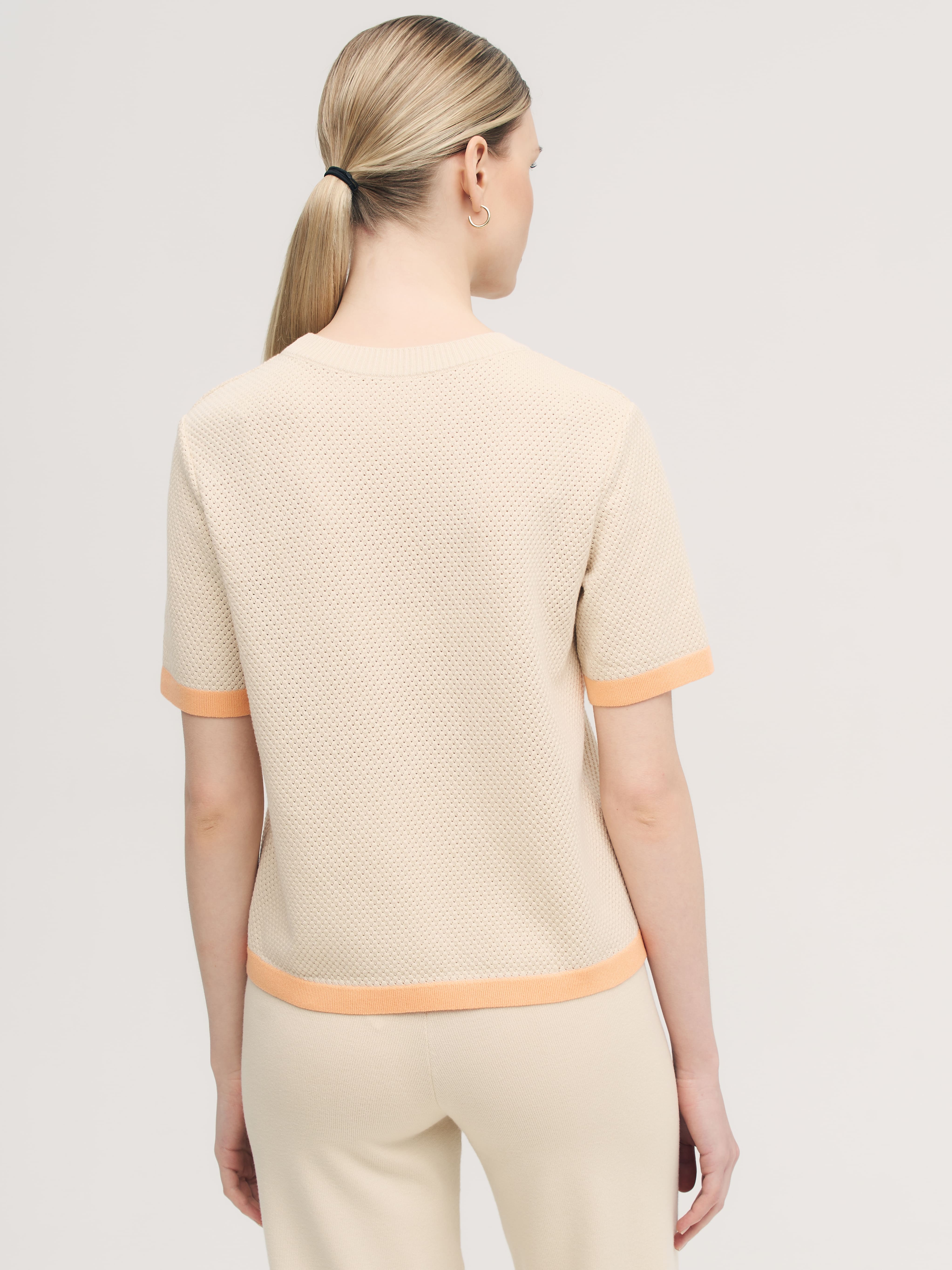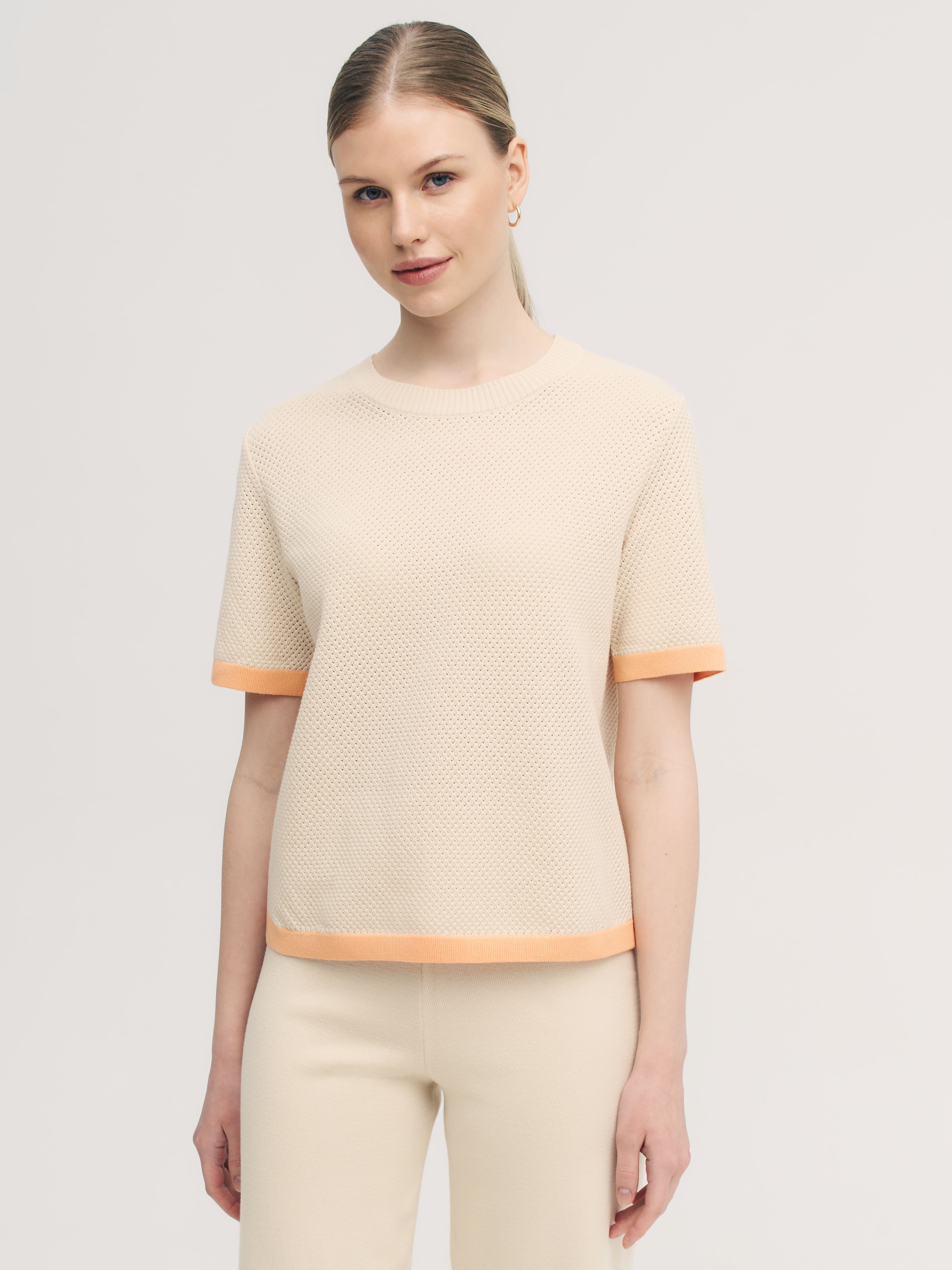 Невесомая летняя фантазия от дизайнеров бренда – нежнейший джемпер-сетка в сдержанно-спортивном стиле. Уютная альтернатива скучным трикотажным футболкам, в которой замиксованы сразу хлопок и вискоза. Особенности: прямой, не ограничивающий движения, крой, акцентная полоса по краям и защищенная от деформаций горловина. Дышащий трикотаж с перфорацией дарит легкое просвечивание, позволяя поиграть с оттенками нижнего белья. Решайте, выбирать топ в тон или на контрасте.