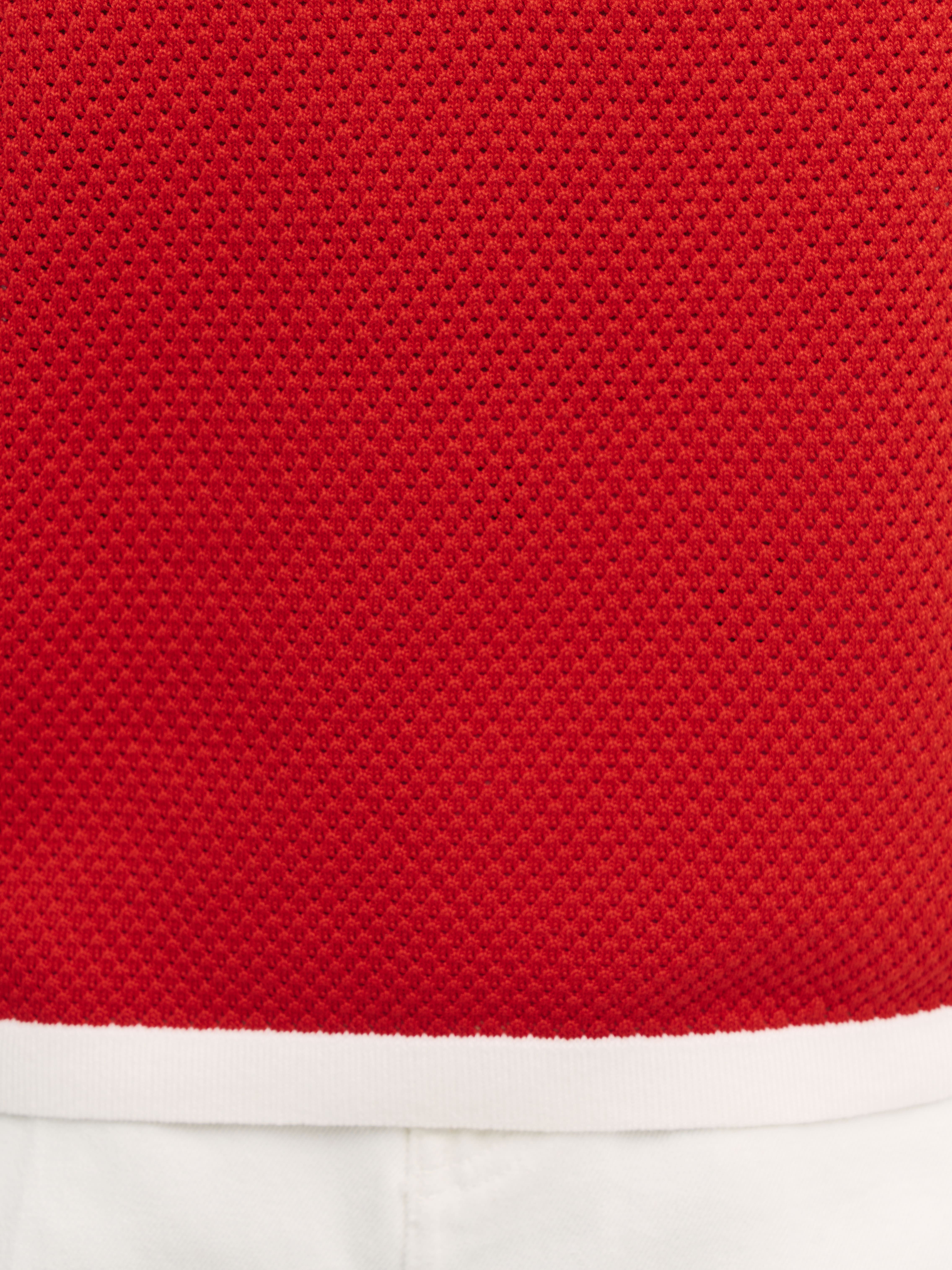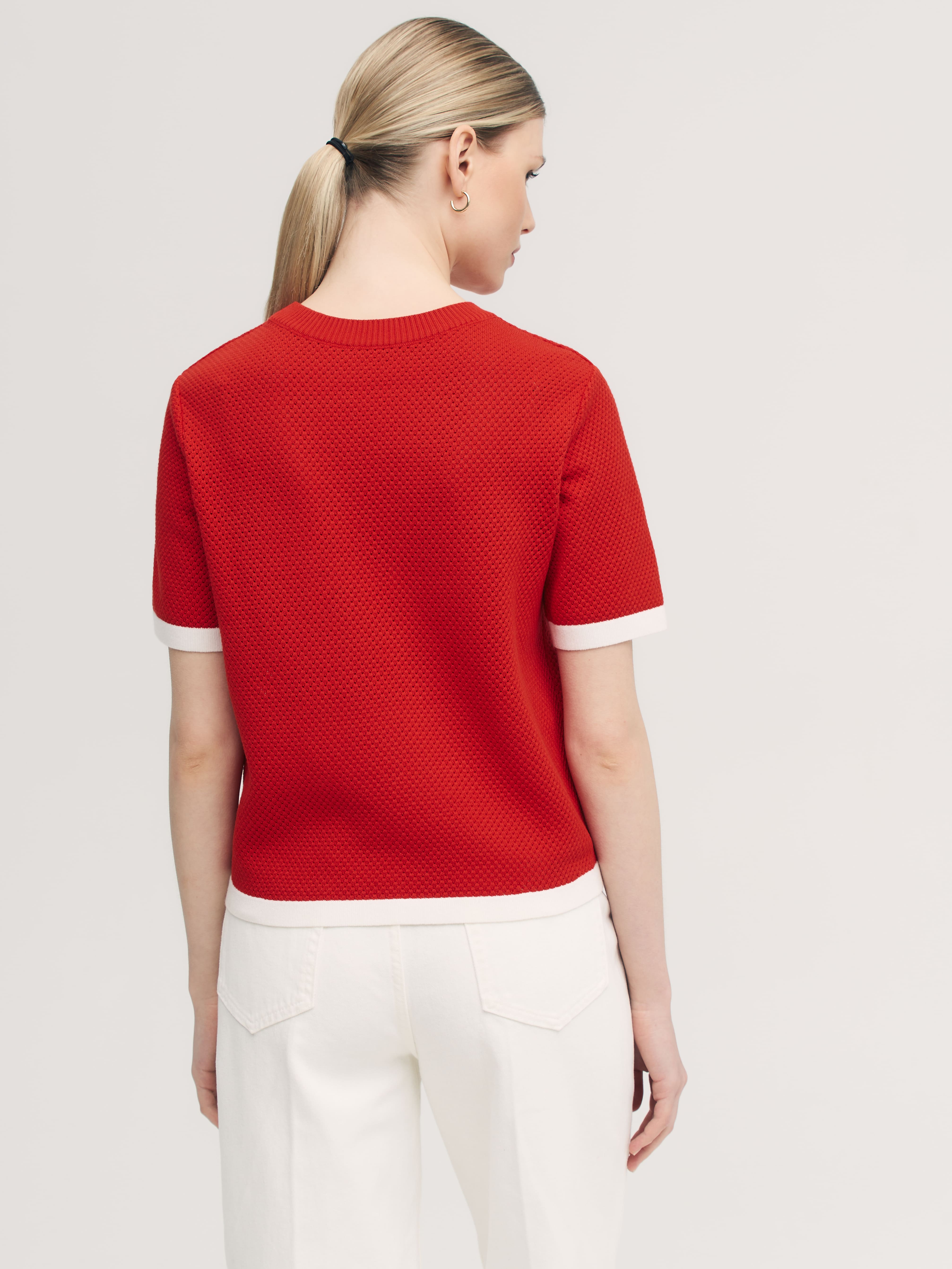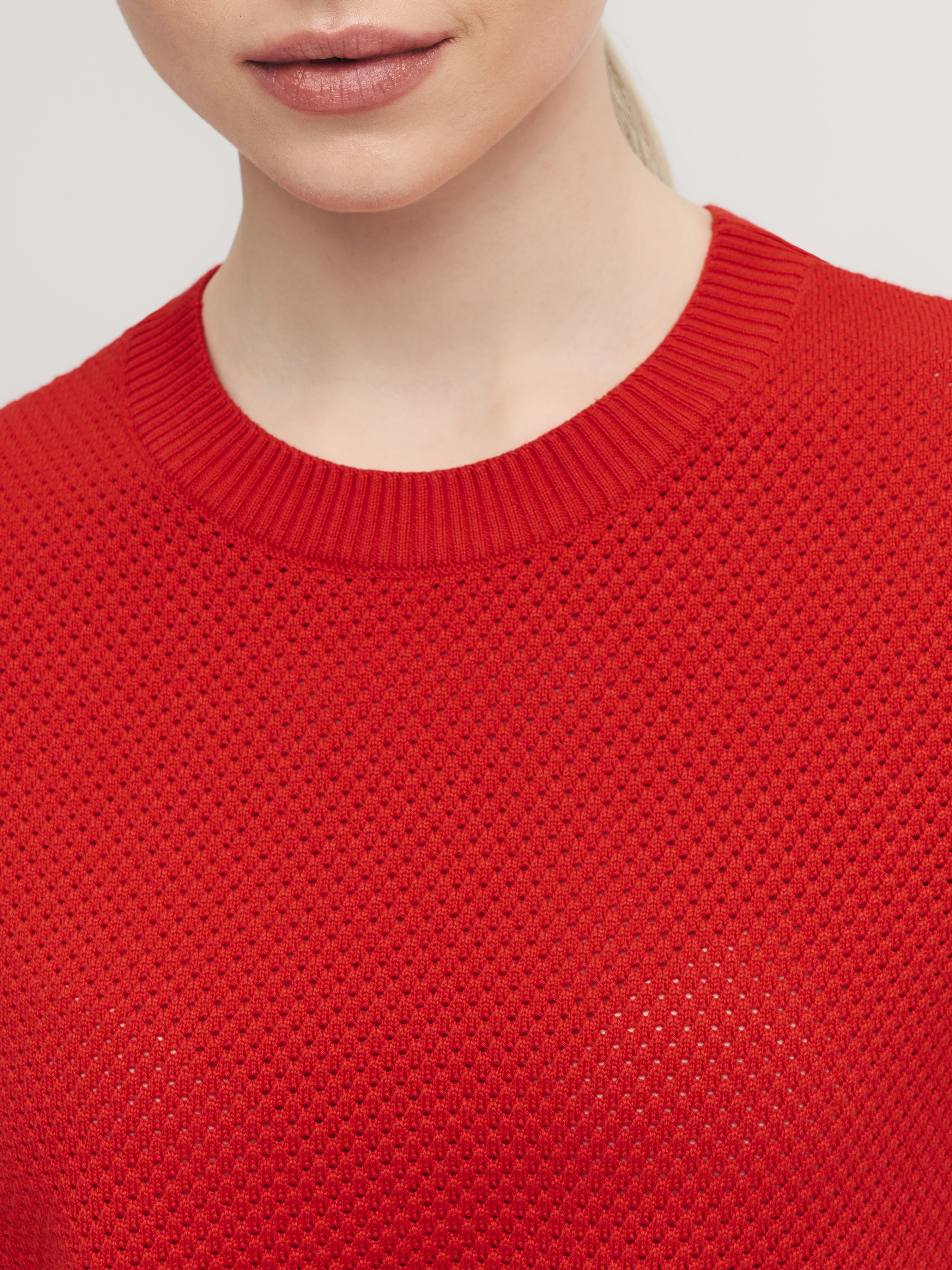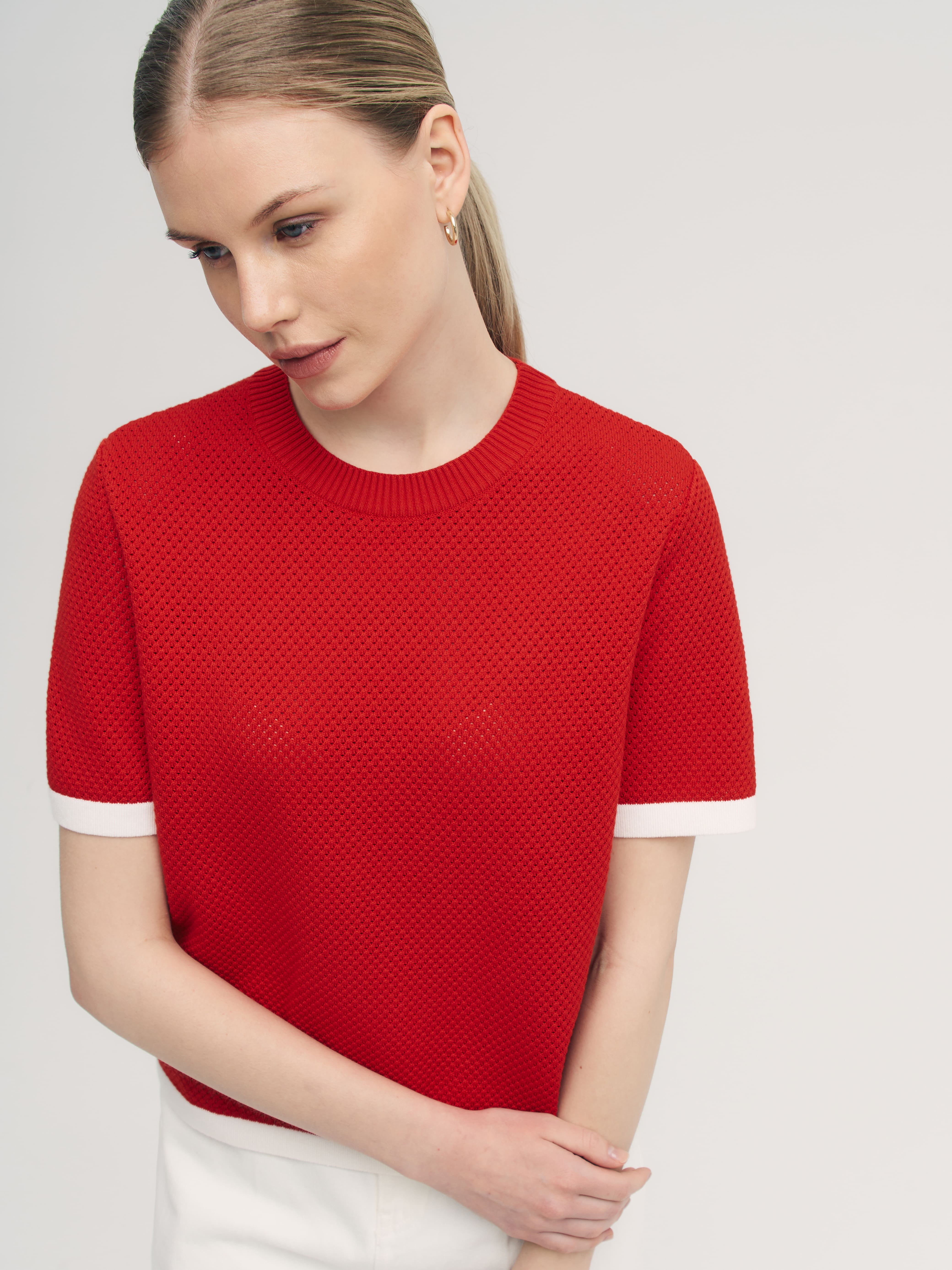 Невесомая летняя фантазия от дизайнеров бренда – нежнейший джемпер-сетка в сдержанно-спортивном стиле. Уютная альтернатива скучным трикотажным футболкам, в которой замиксованы сразу хлопок и вискоза. Особенности: прямой, не ограничивающий движения, крой, акцентная полоса по краям и защищенная от деформаций горловина. Дышащий трикотаж с перфорацией дарит легкое просвечивание, позволяя поиграть с оттенками нижнего белья. Решайте, выбирать топ в тон или на контрасте.