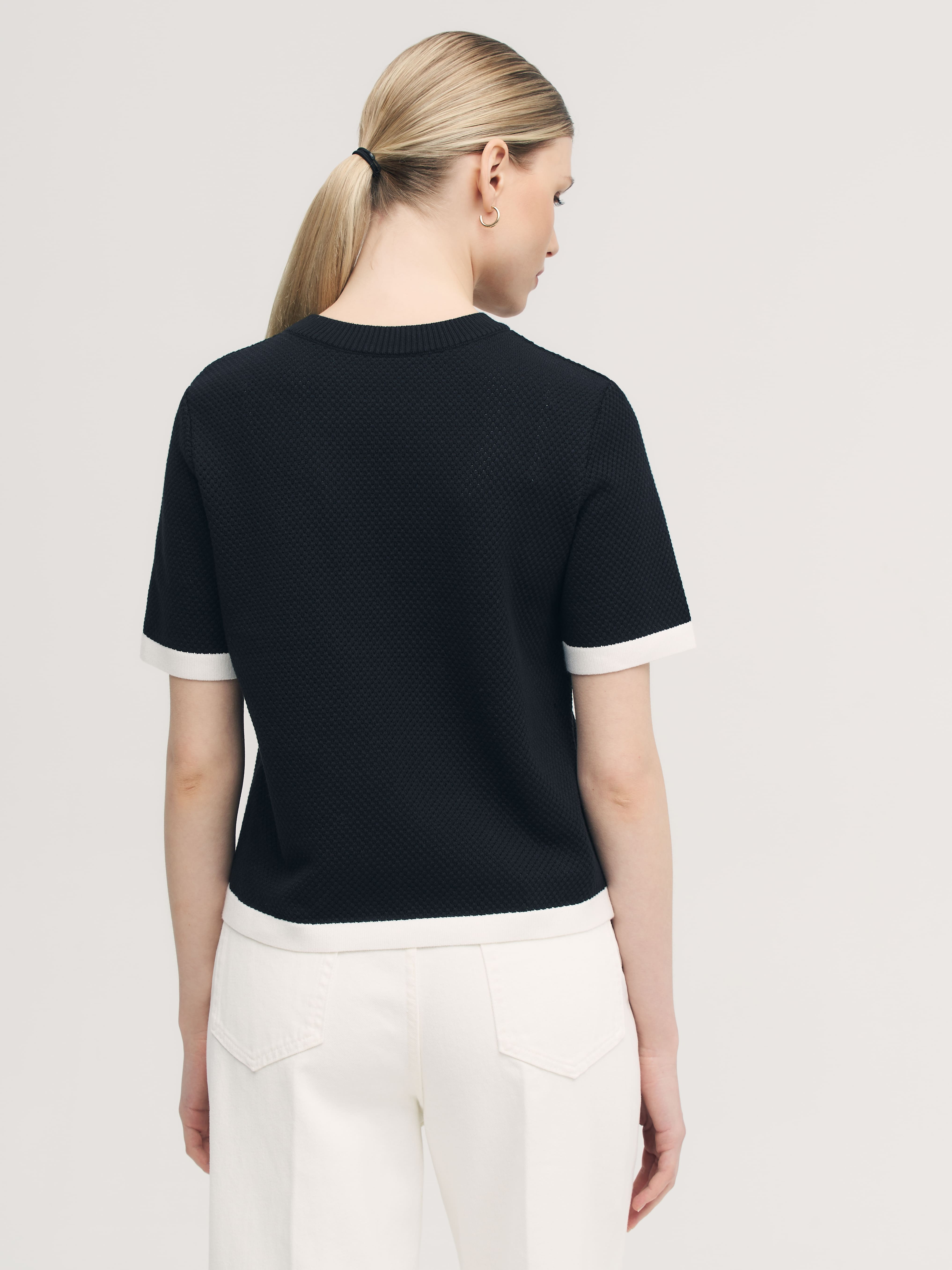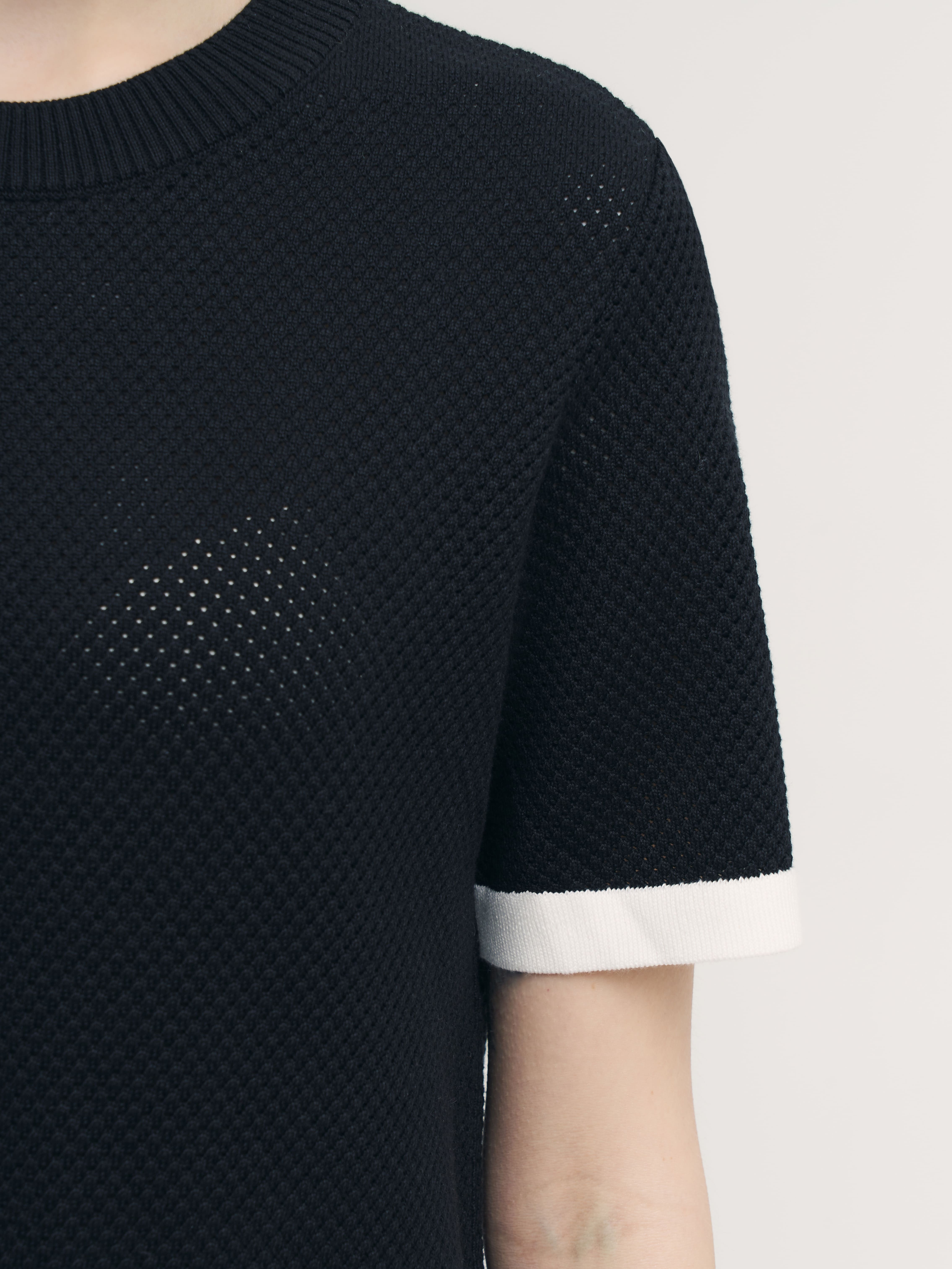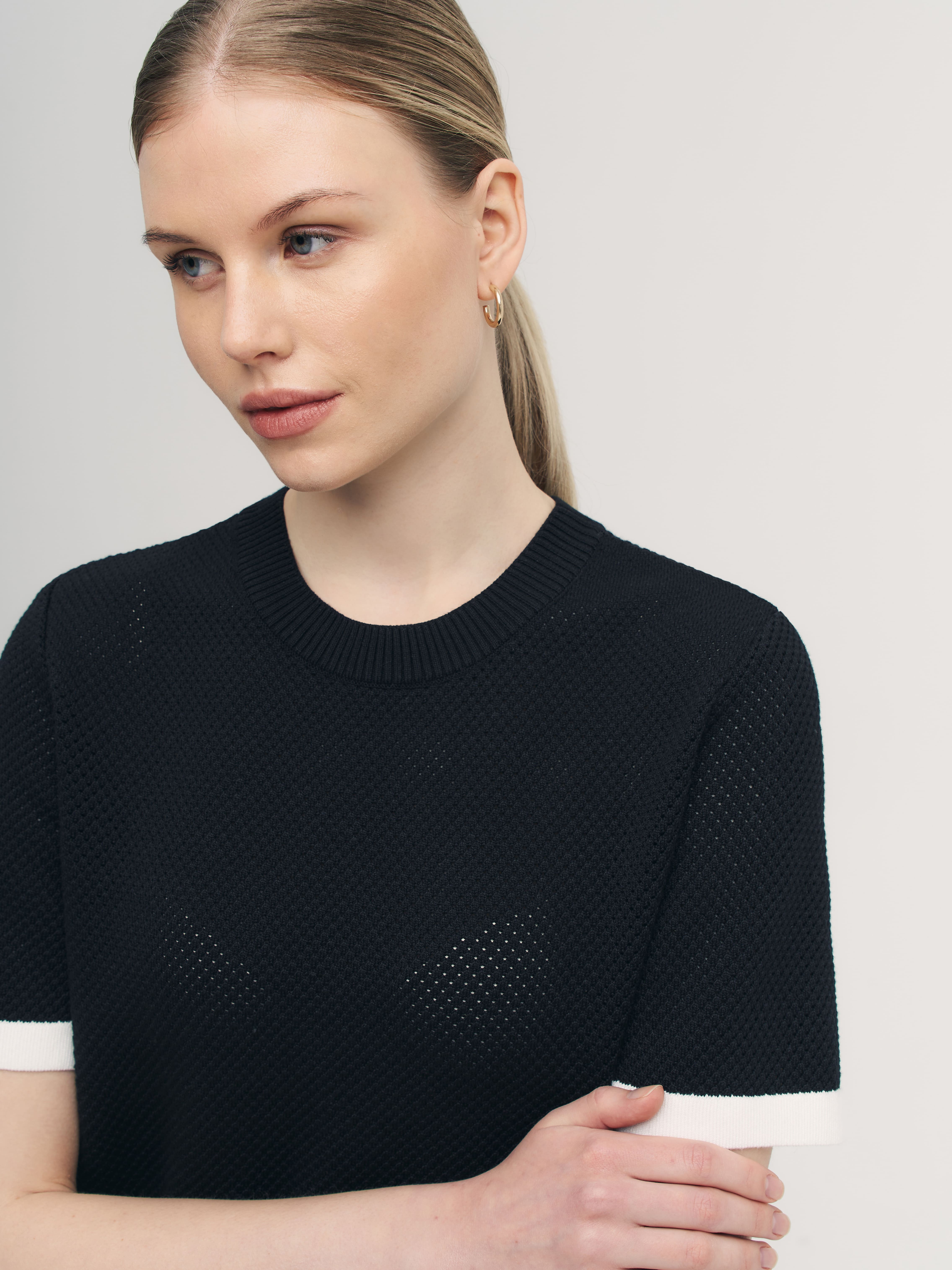 Невесомая летняя фантазия от дизайнеров бренда – нежнейший джемпер-сетка в сдержанно-спортивном стиле. Уютная альтернатива скучным трикотажным футболкам, в которой замиксованы сразу хлопок и вискоза. Особенности: прямой, не ограничивающий движения, крой, акцентная полоса по краям и защищенная от деформаций горловина. Дышащий трикотаж с перфорацией дарит легкое просвечивание, позволяя поиграть с оттенками нижнего белья. Решайте, выбирать топ в тон или на контрасте.