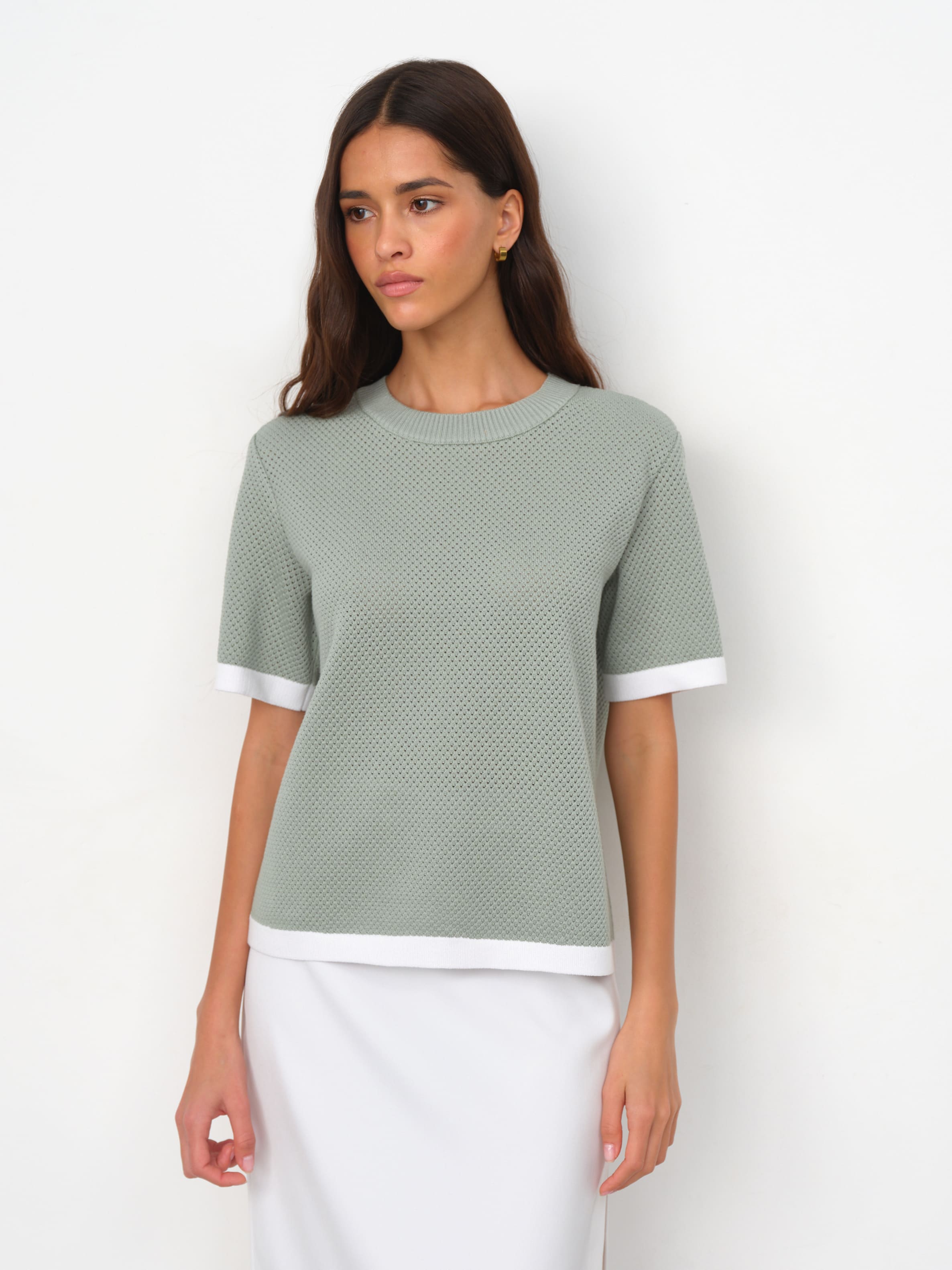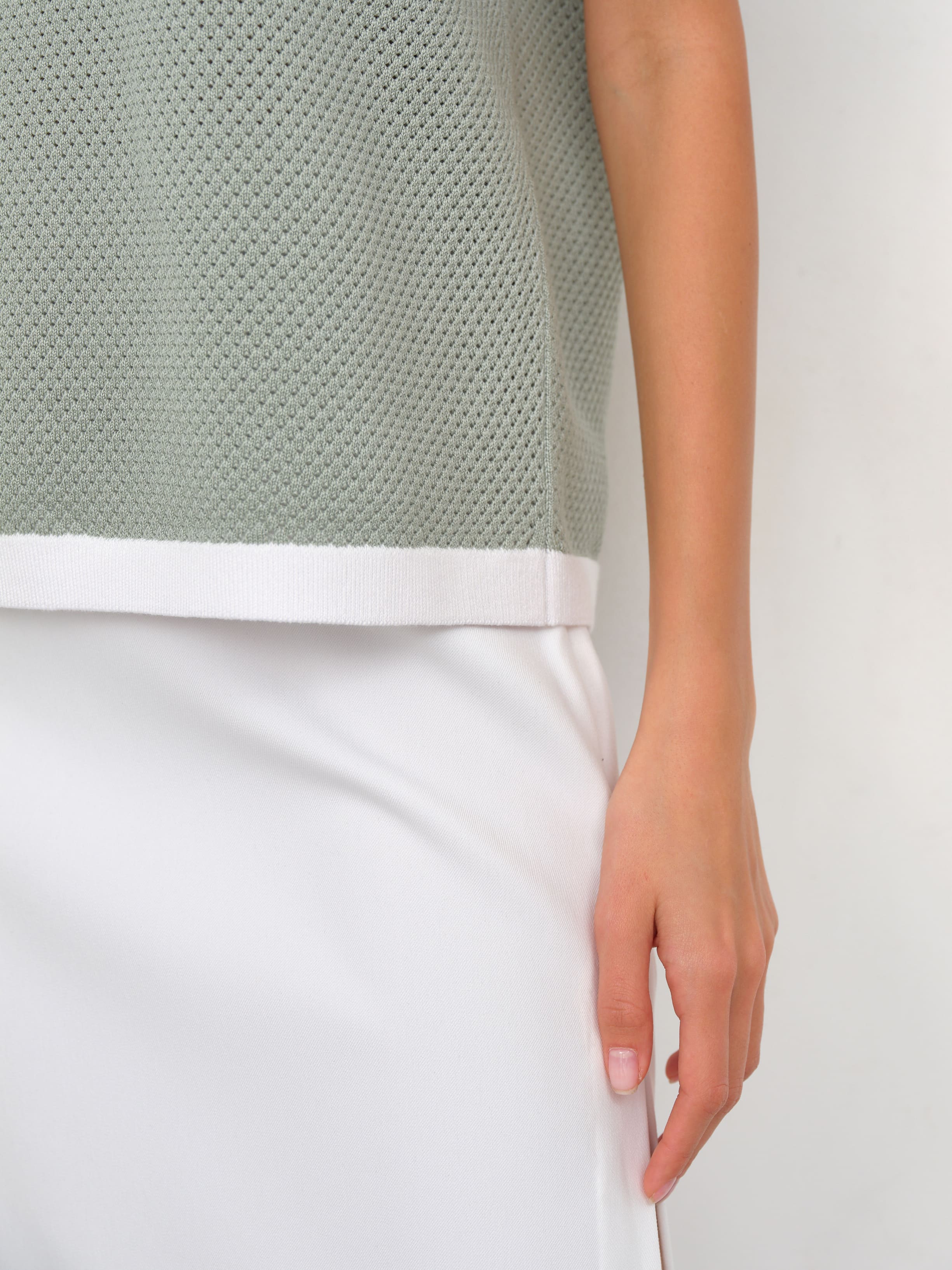 Невесомая летняя фантазия от дизайнеров бренда – нежнейший джемпер-сетка в сдержанно-спортивном стиле. Уютная альтернатива скучным трикотажным футболкам, в которой замиксованы сразу хлопок и вискоза. Особенности: прямой, не ограничивающий движения, крой, акцентная полоса по краям и защищенная от деформаций горловина. Дышащий трикотаж с перфорацией дарит легкое просвечивание, позволяя поиграть с оттенками нижнего белья. Решайте, выбирать топ в тон или на контрасте.