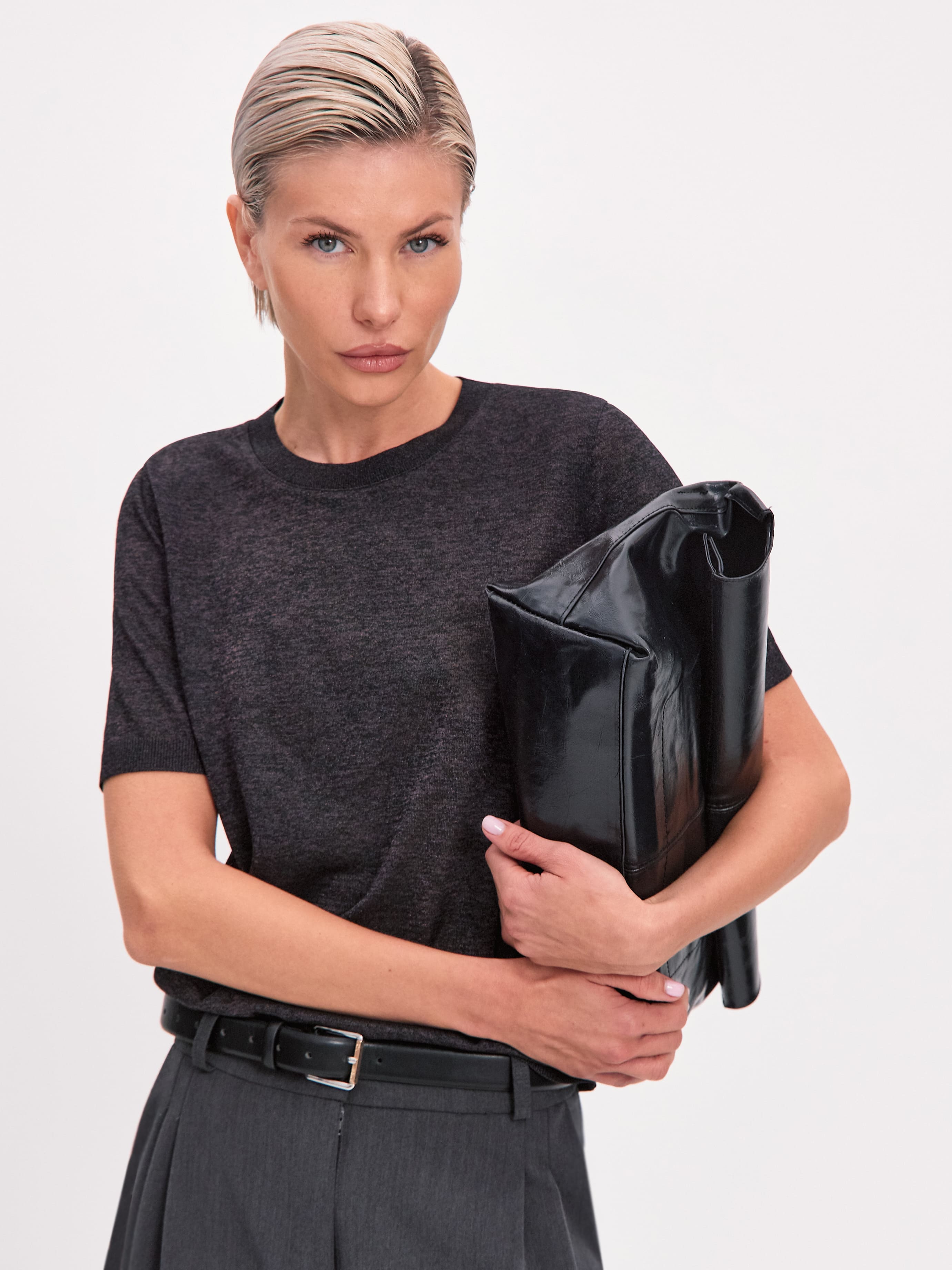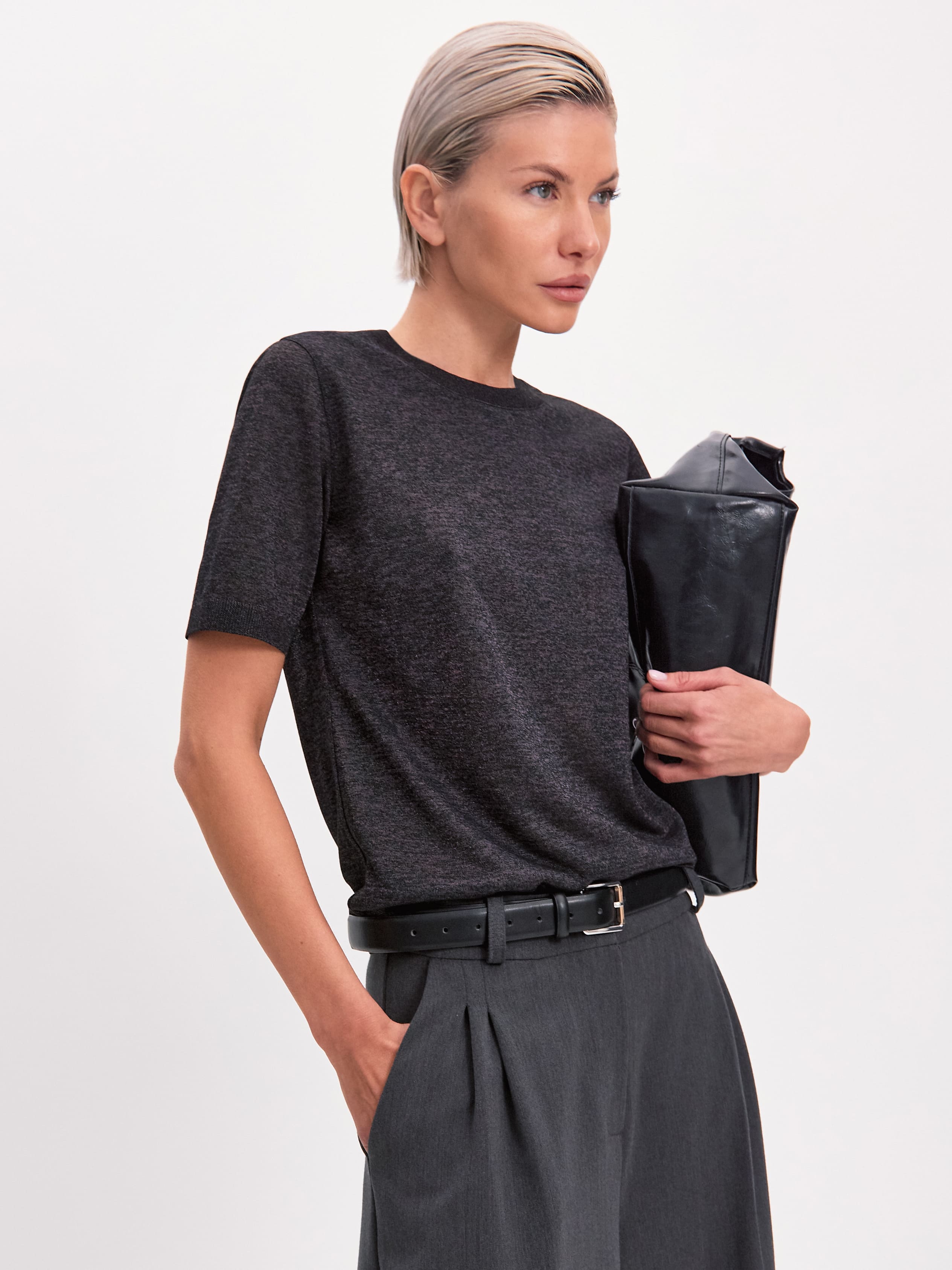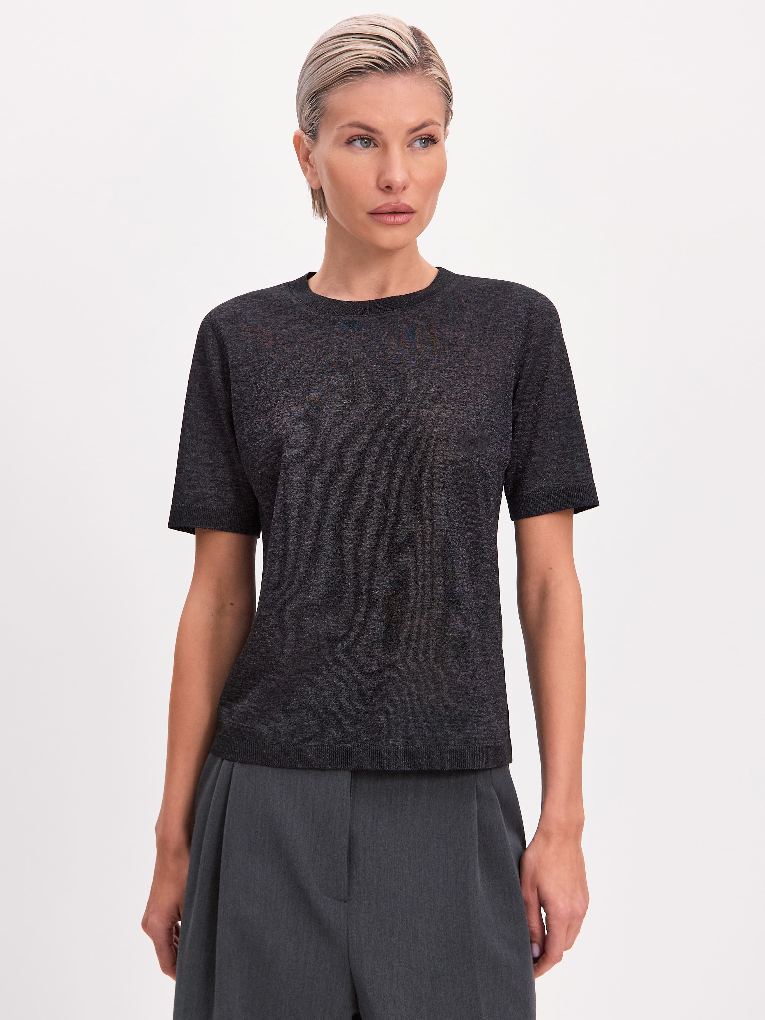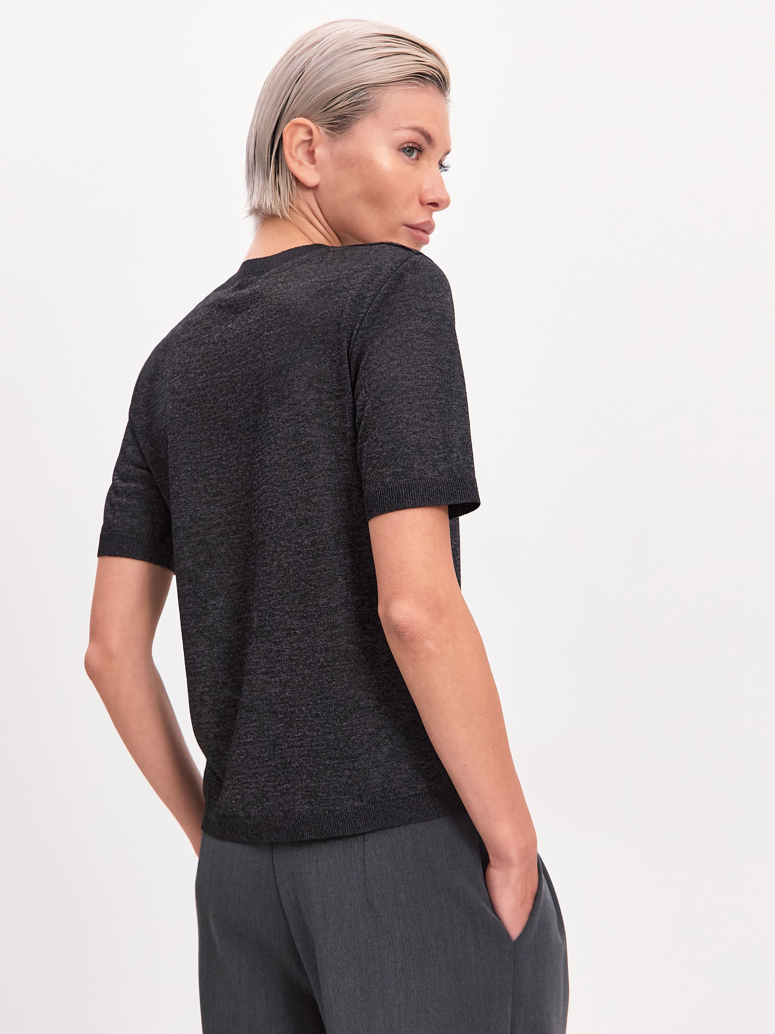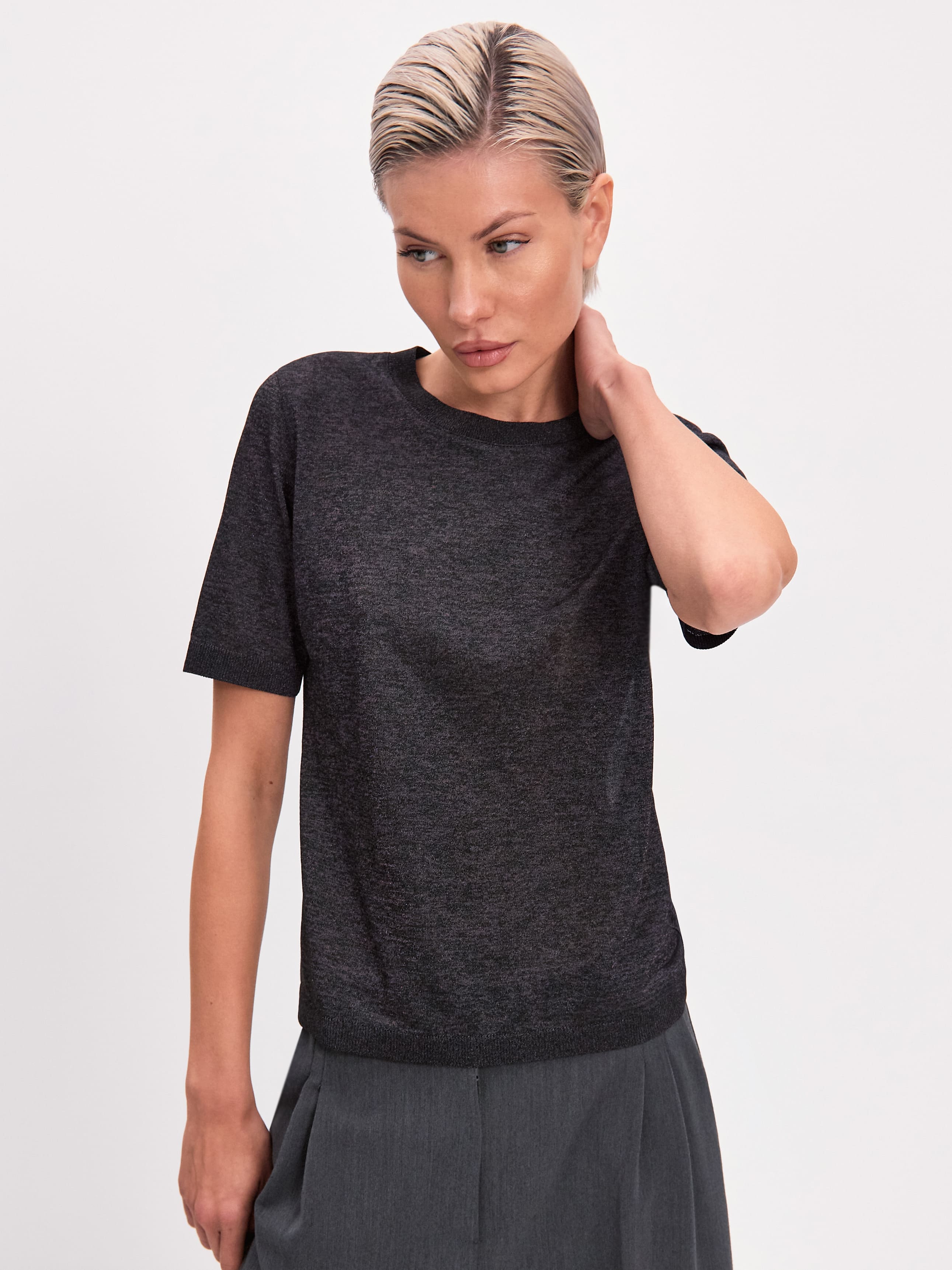 Самая невесомая футболка в нашей коллекции, для которой мы создали особую разновидность тончайшего, полупрозрачного трикотажа. Своей уникальной эстетикой изделие обязано пряже из меланжевой вискозы. При переплетении она приобретает изысканный, чуть переливающийся финиш, переходящий в едва уловимый блеск под солнечными лучами. Футболка мягко струится, создает легкий охлаждающий эффект, сохраняя идеально прямой силуэт. Горловина, низ и рукава усилены резинкой. Такой вариант отделки препятствует обвисанию краев, сохраняя структуру полотна.