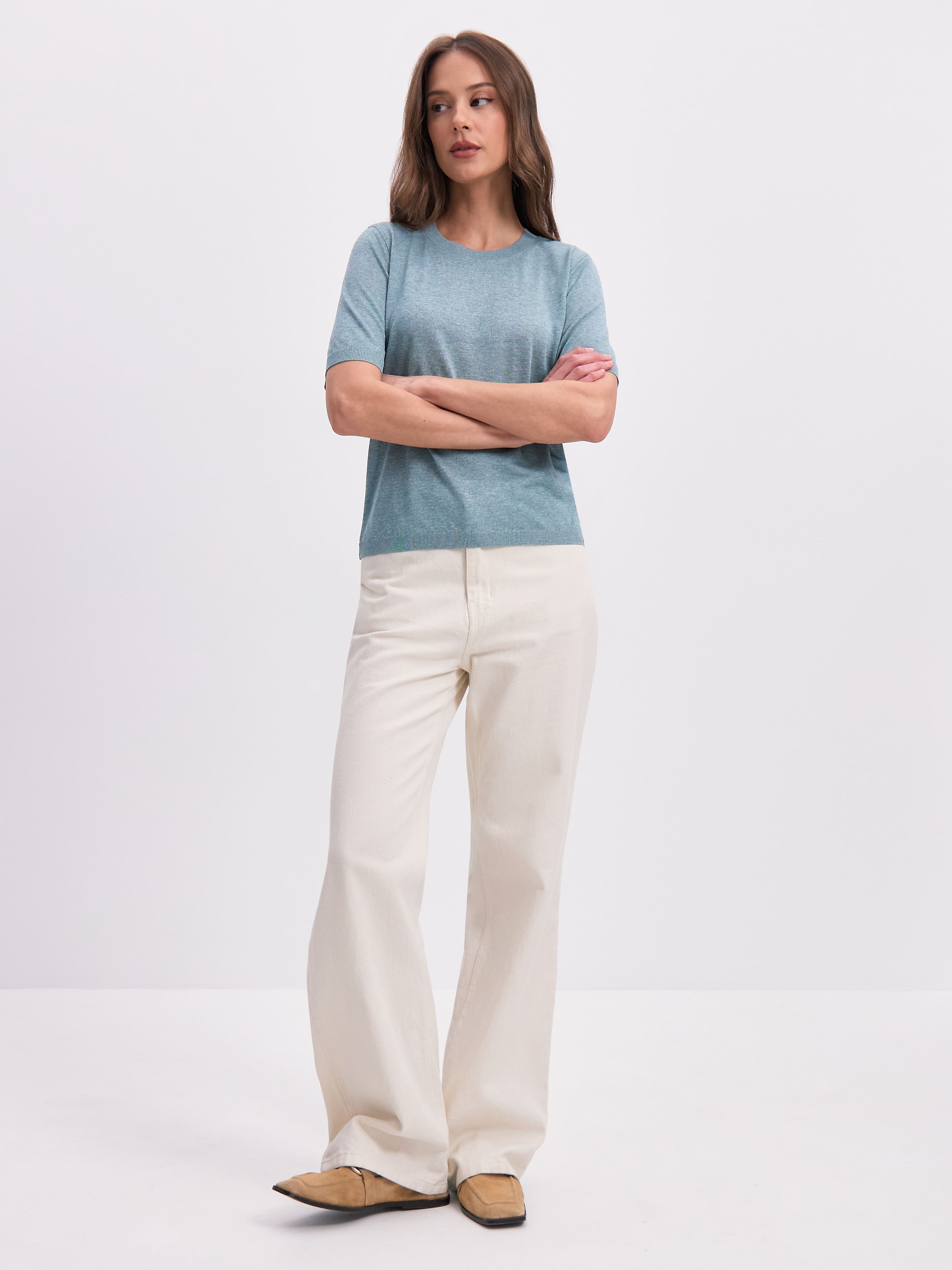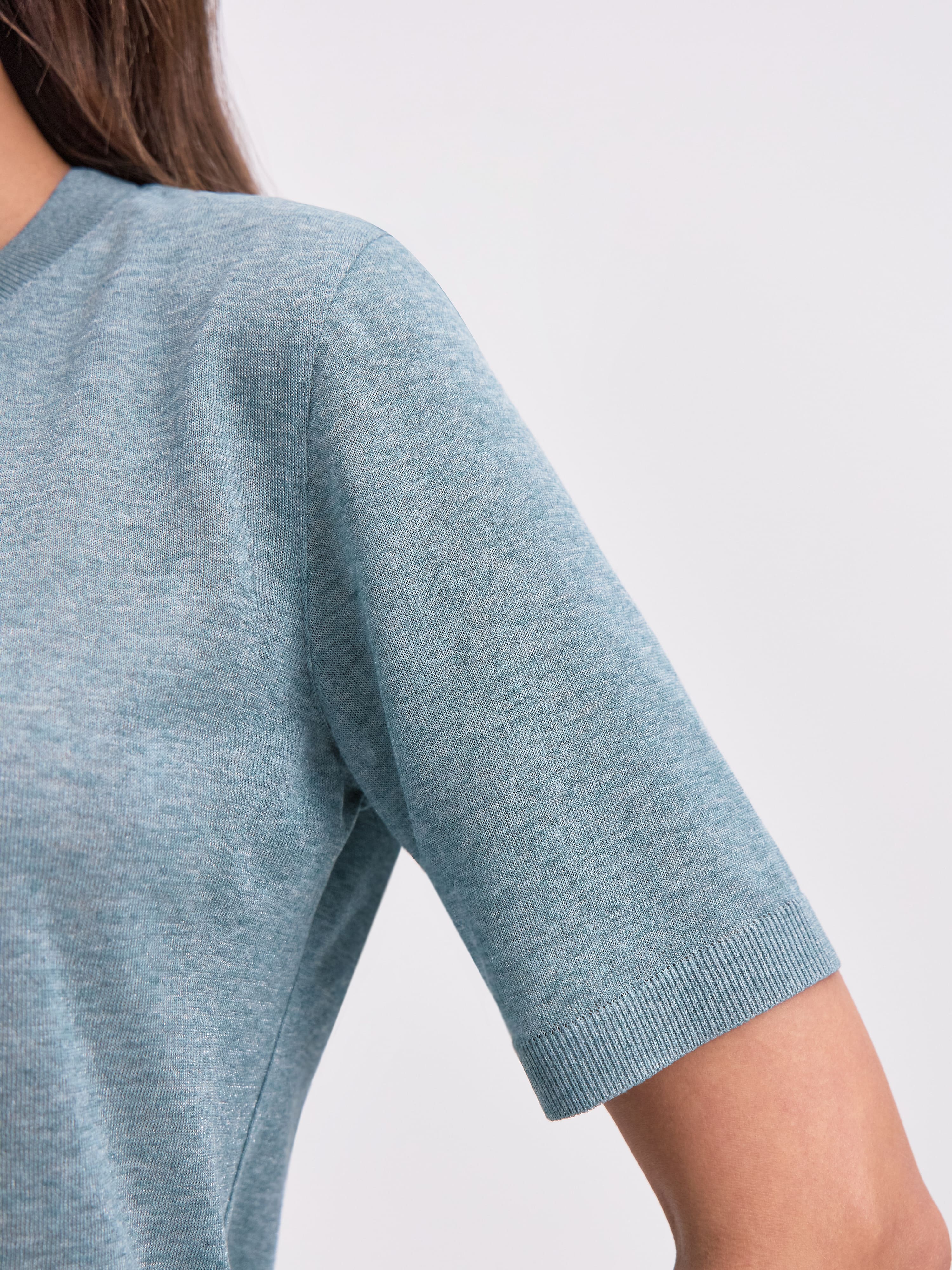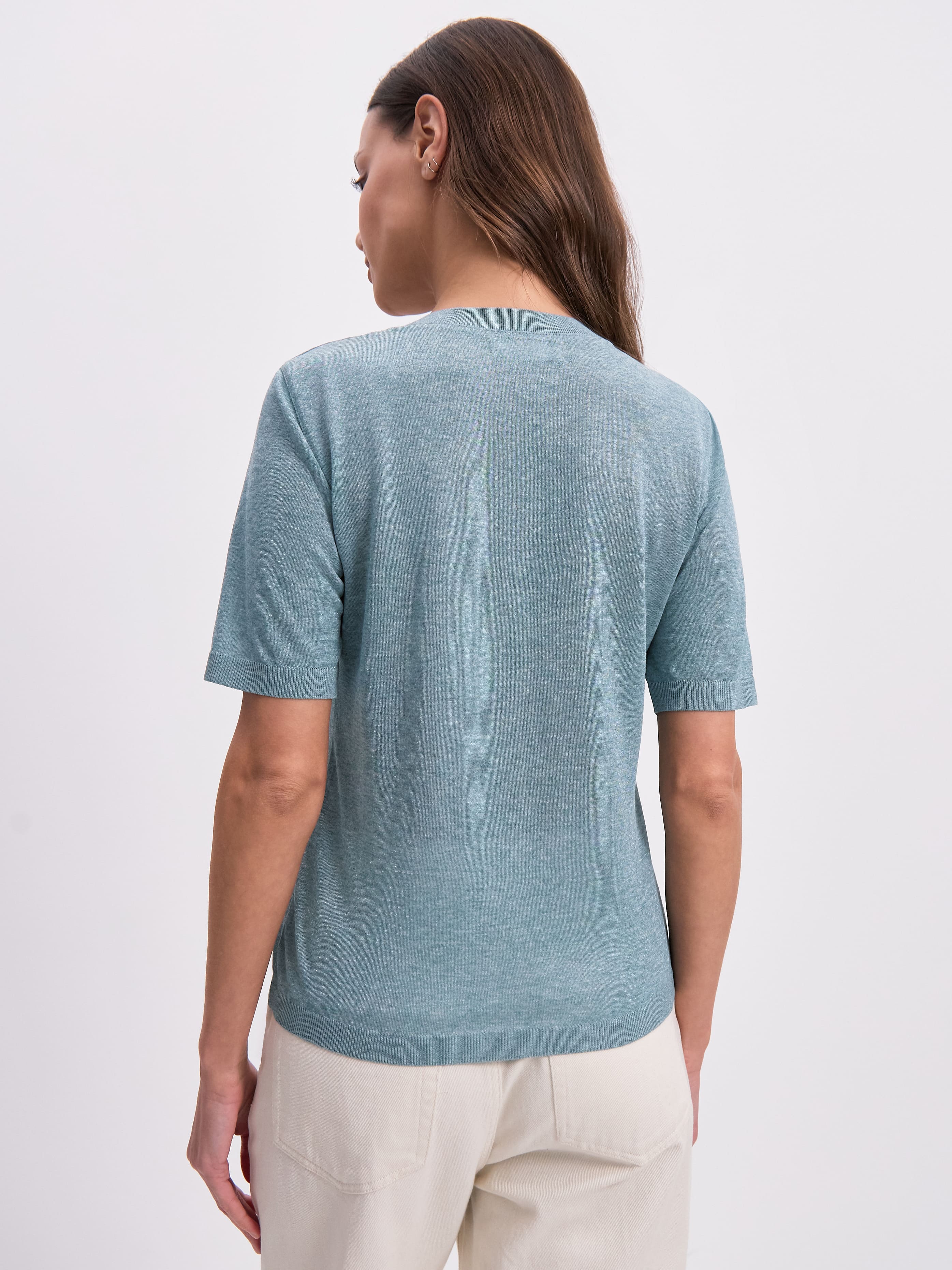 Самая невесомая футболка в нашей коллекции, для которой мы создали особую разновидность тончайшего, полупрозрачного трикотажа. Своей уникальной эстетикой изделие обязано пряже из меланжевой вискозы. При переплетении она приобретает изысканный, чуть переливающийся финиш, переходящий в едва уловимый блеск под солнечными лучами. Футболка мягко струится, создает легкий охлаждающий эффект, сохраняя идеально прямой силуэт. Горловина, низ и рукава усилены резинкой. Такой вариант отделки препятствует обвисанию краев, сохраняя структуру полотна.