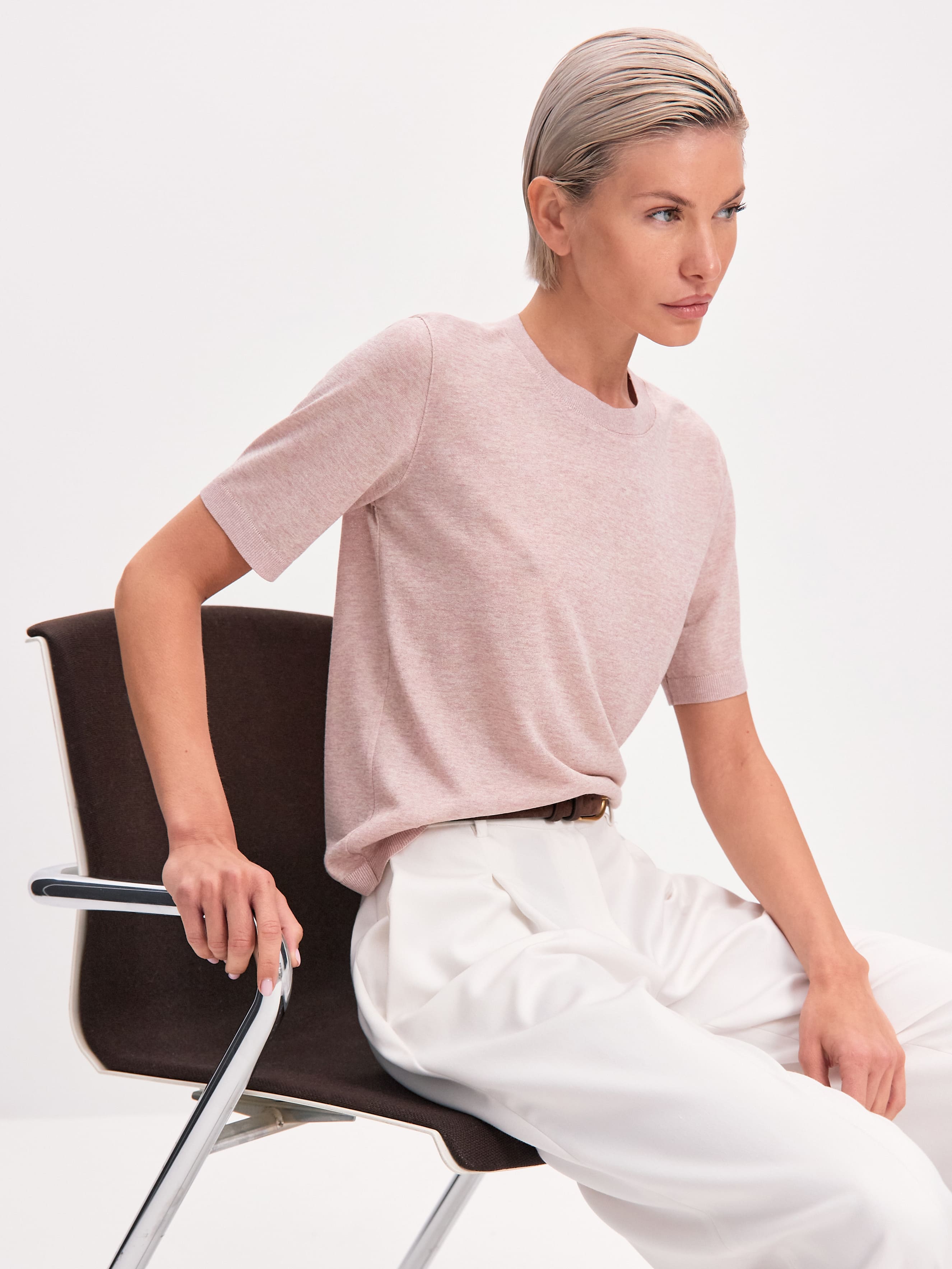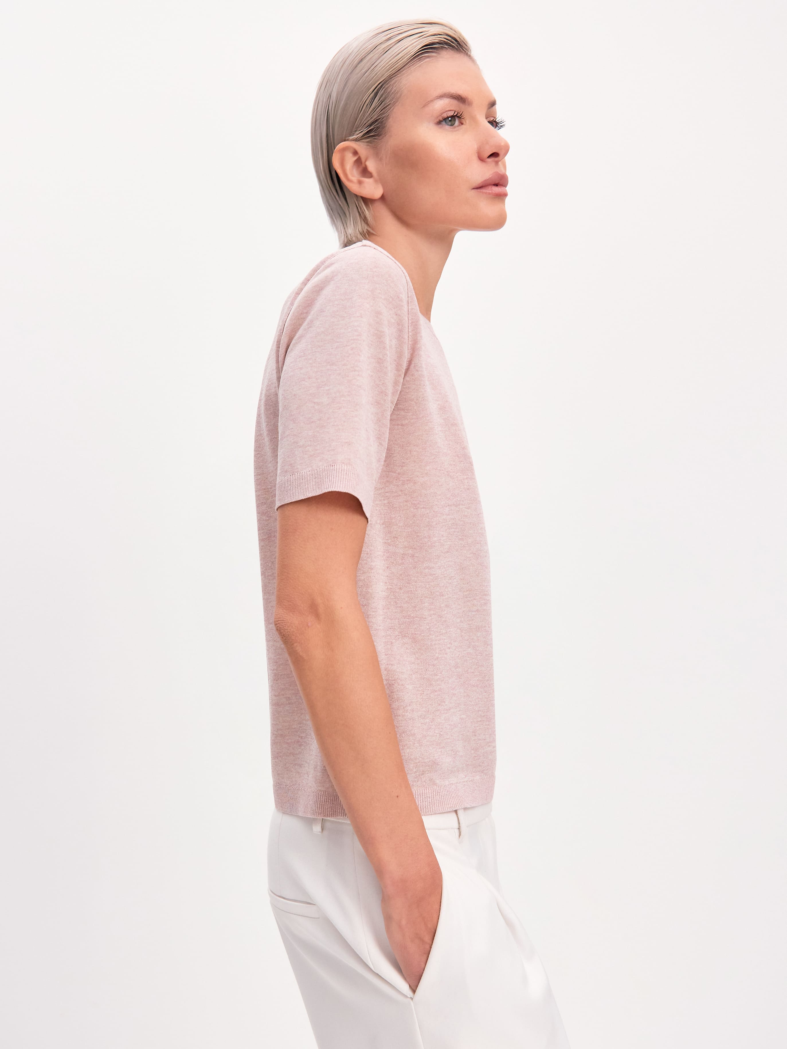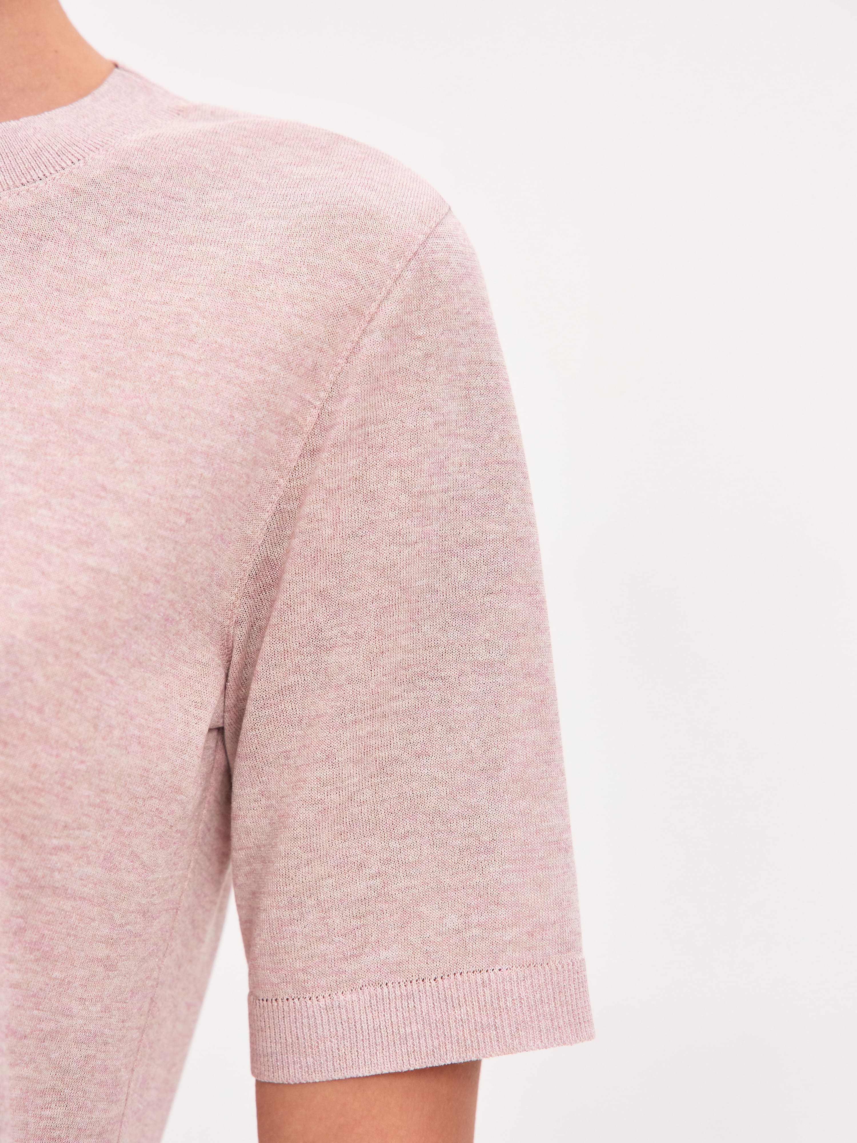 Самая невесомая футболка в нашей коллекции, для которой мы создали особую разновидность тончайшего, полупрозрачного трикотажа. Своей уникальной эстетикой изделие обязано пряже из меланжевой вискозы. При переплетении она приобретает изысканный, чуть переливающийся финиш, переходящий в едва уловимый блеск под солнечными лучами. Футболка мягко струится, создает легкий охлаждающий эффект, сохраняя идеально прямой силуэт. Горловина, низ и рукава усилены резинкой. Такой вариант отделки препятствует обвисанию краев, сохраняя структуру полотна.