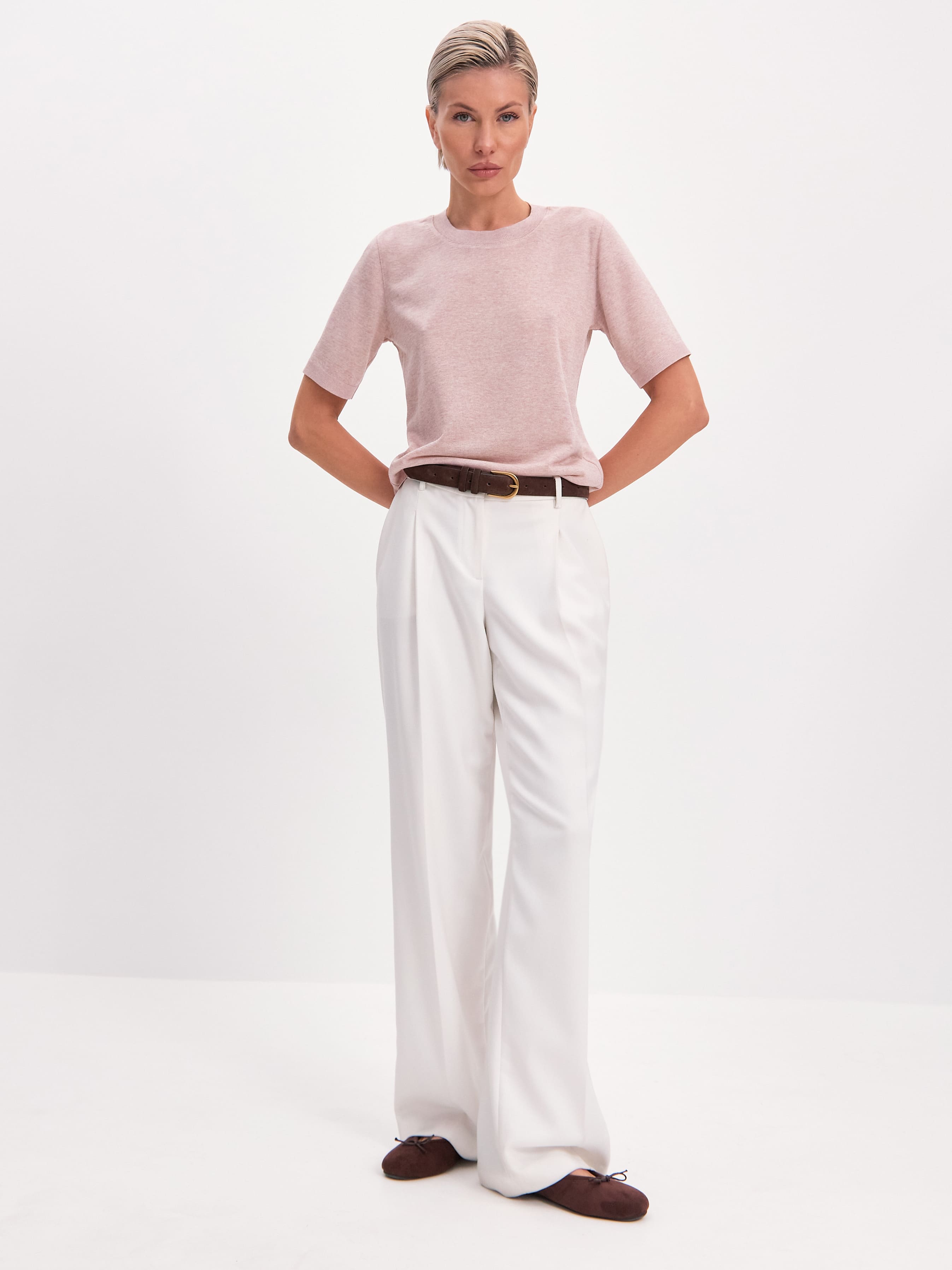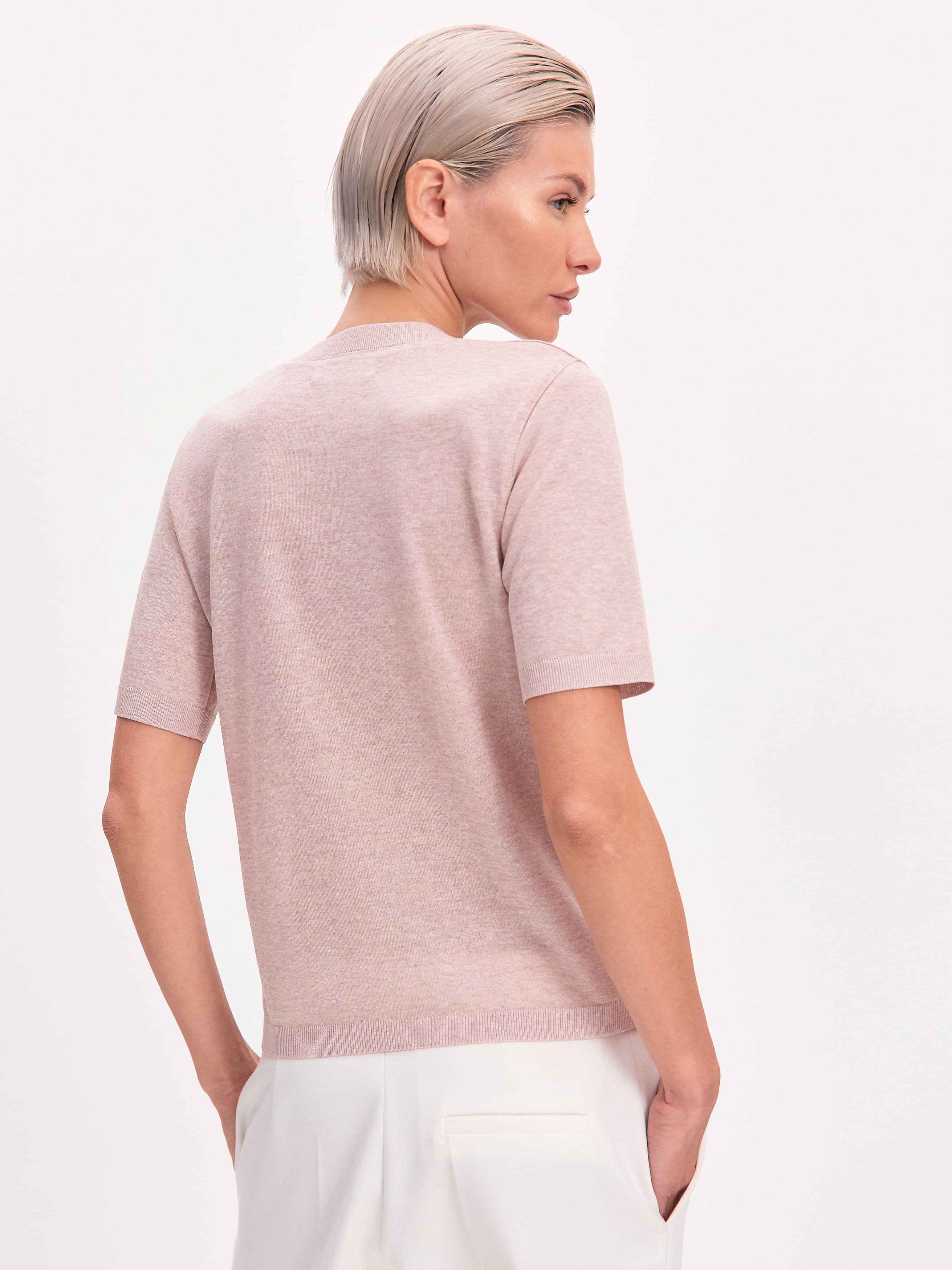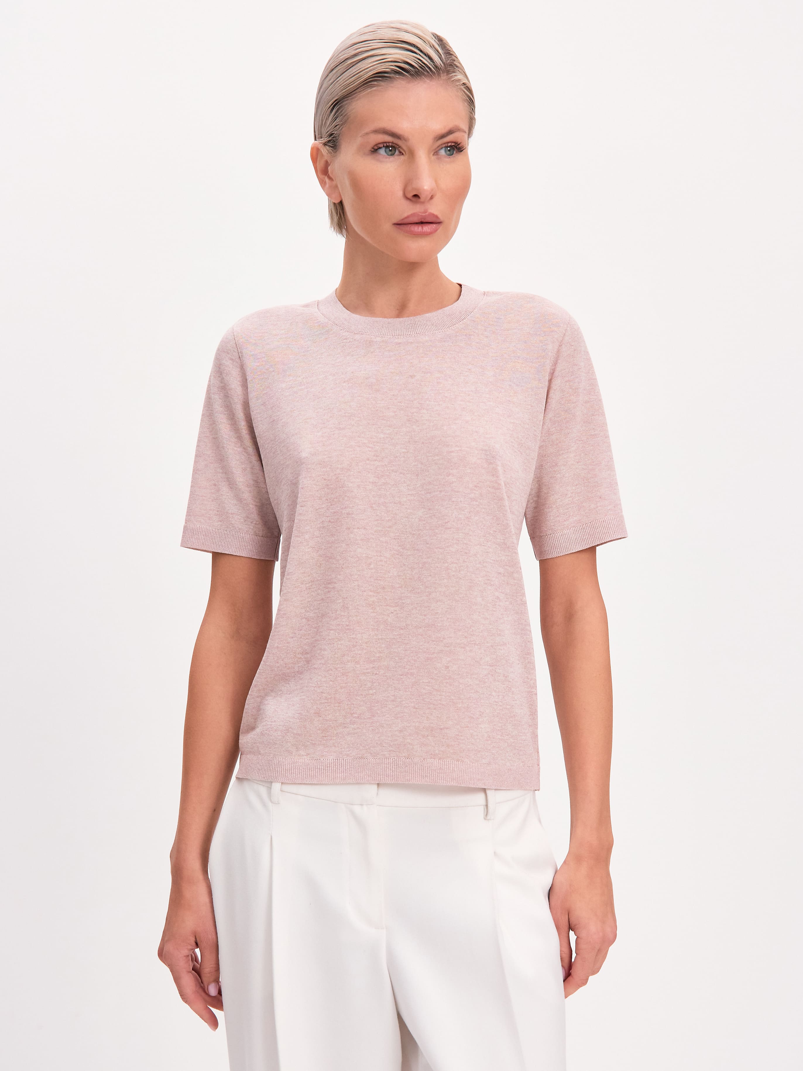 Самая невесомая футболка в нашей коллекции, для которой мы создали особую разновидность тончайшего, полупрозрачного трикотажа. Своей уникальной эстетикой изделие обязано пряже из меланжевой вискозы. При переплетении она приобретает изысканный, чуть переливающийся финиш, переходящий в едва уловимый блеск под солнечными лучами. Футболка мягко струится, создает легкий охлаждающий эффект, сохраняя идеально прямой силуэт. Горловина, низ и рукава усилены резинкой. Такой вариант отделки препятствует обвисанию краев, сохраняя структуру полотна.