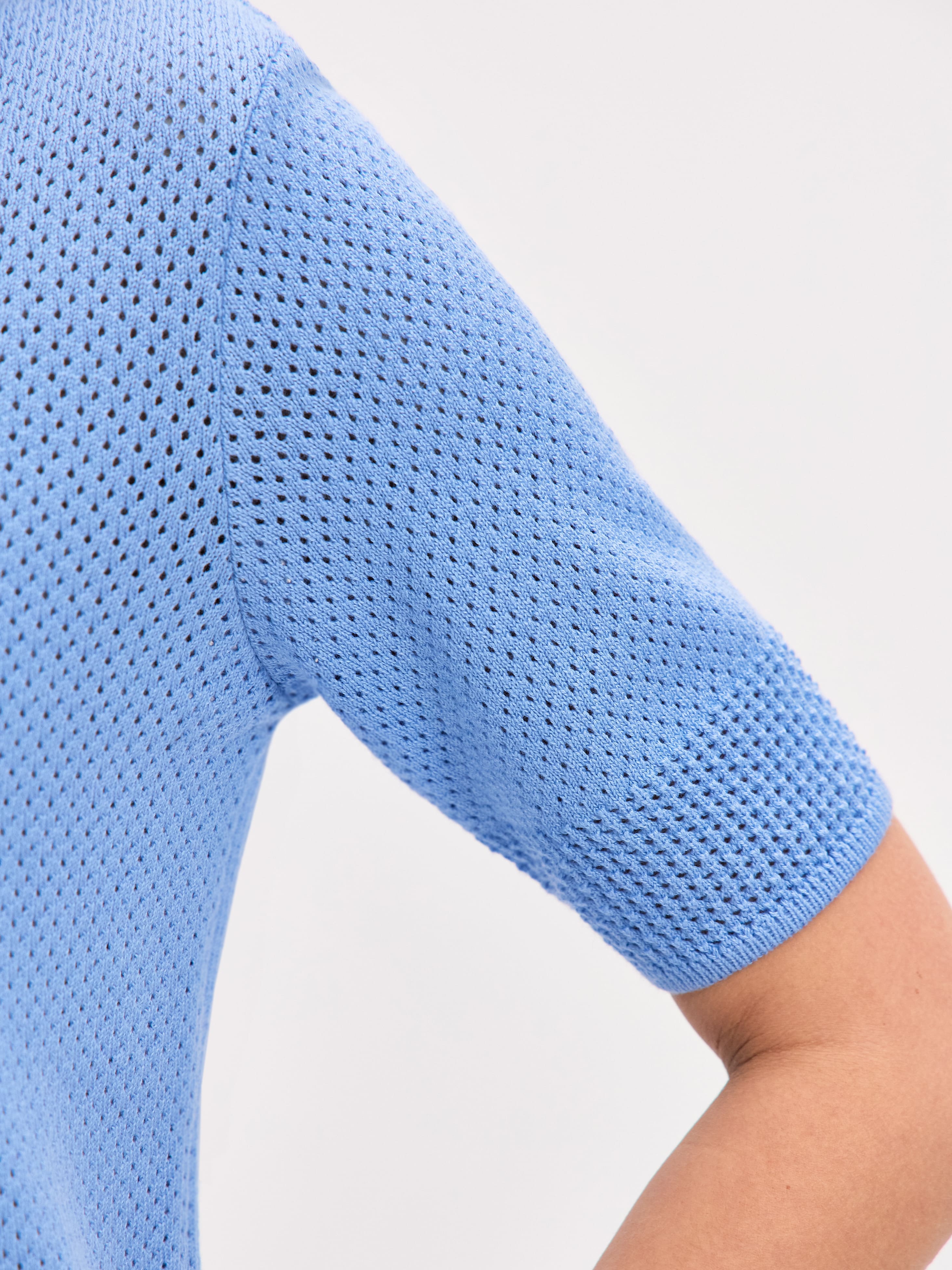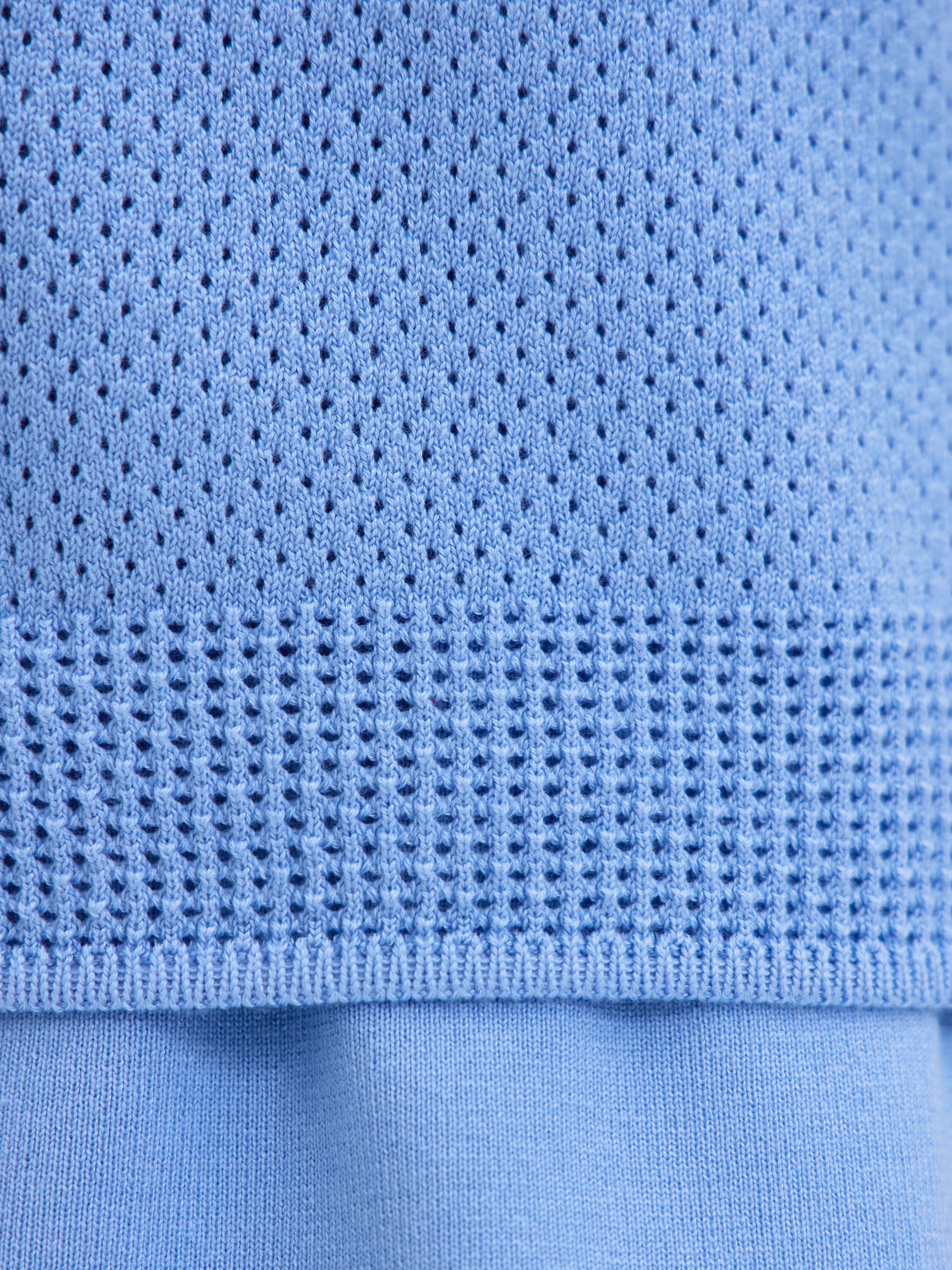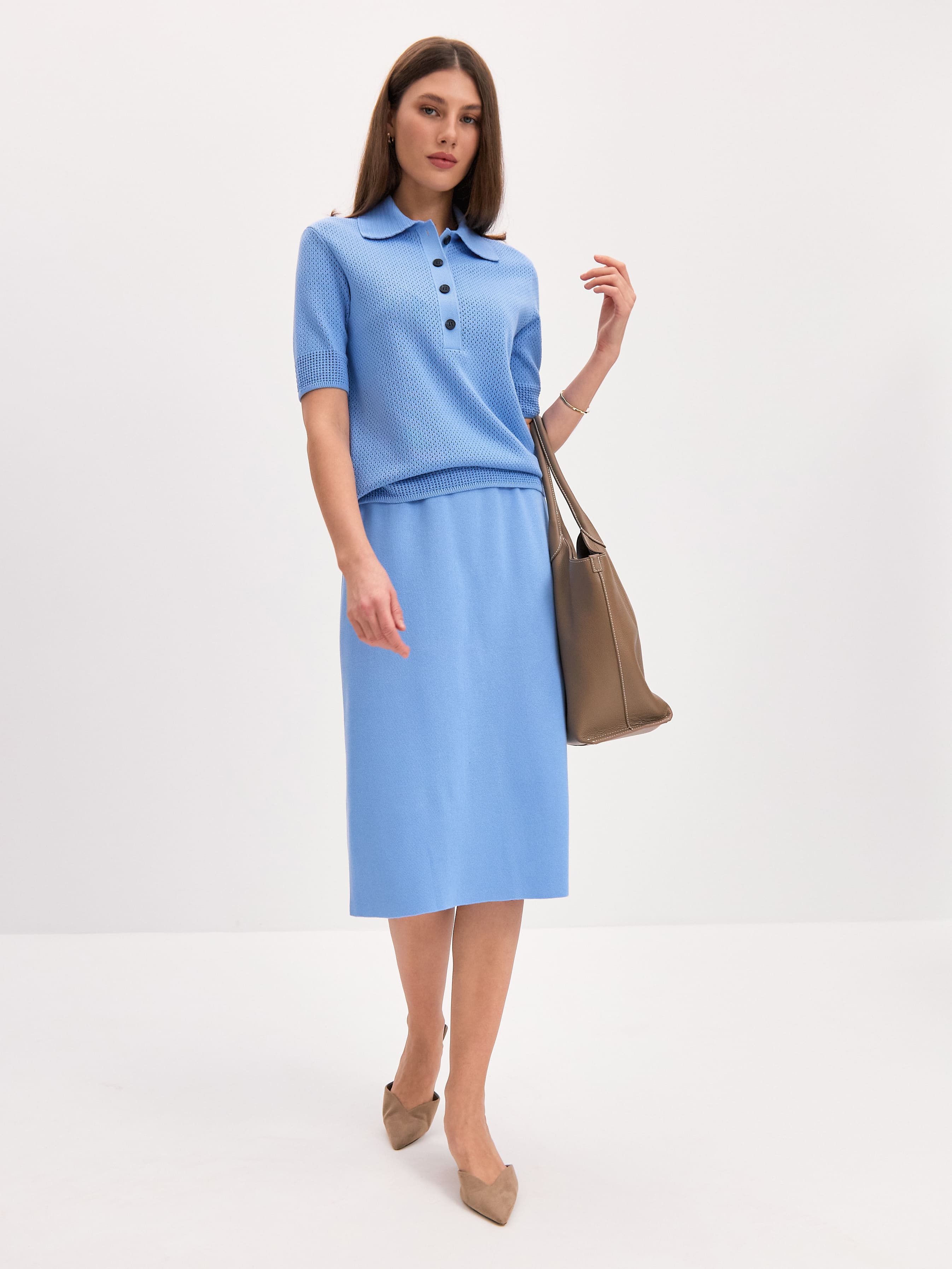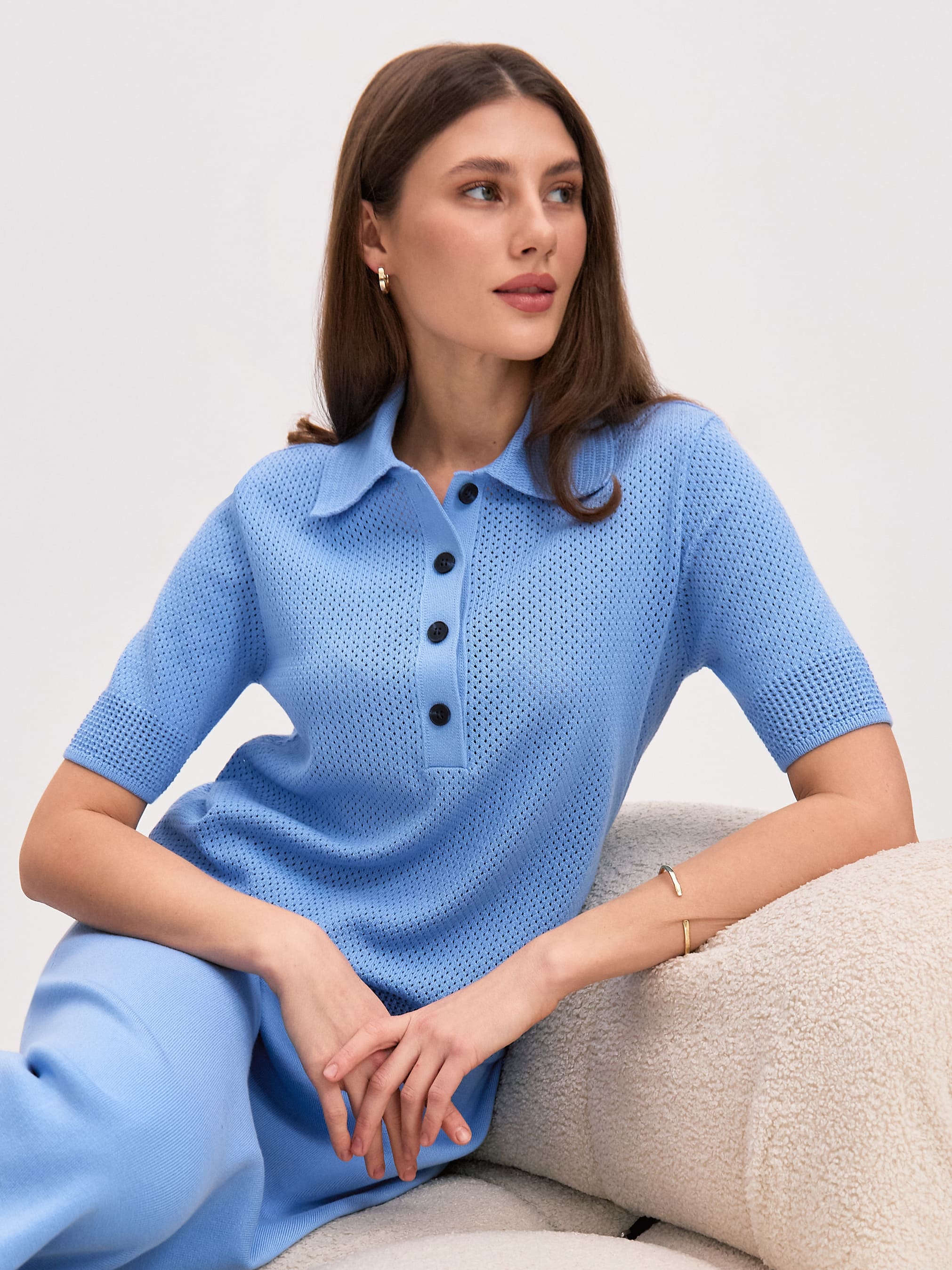 Нежное вязаное поло с хлопком и невесомой вискозой. Изюминка модели – аккуратная перфорация. Каждая трикотажная ячейка работает как проводник воздушных капсул, бережно охлаждающих тело. Уютный джемпер для летнего отпуска и морских прогулок. Мягкий трикотаж защитит от активного солнца, бриза и перегрева. Рифмуется с любым низом из круизной коллекции 99colorspace – вискозными юбками или пластичными хлопковыми палаццо.