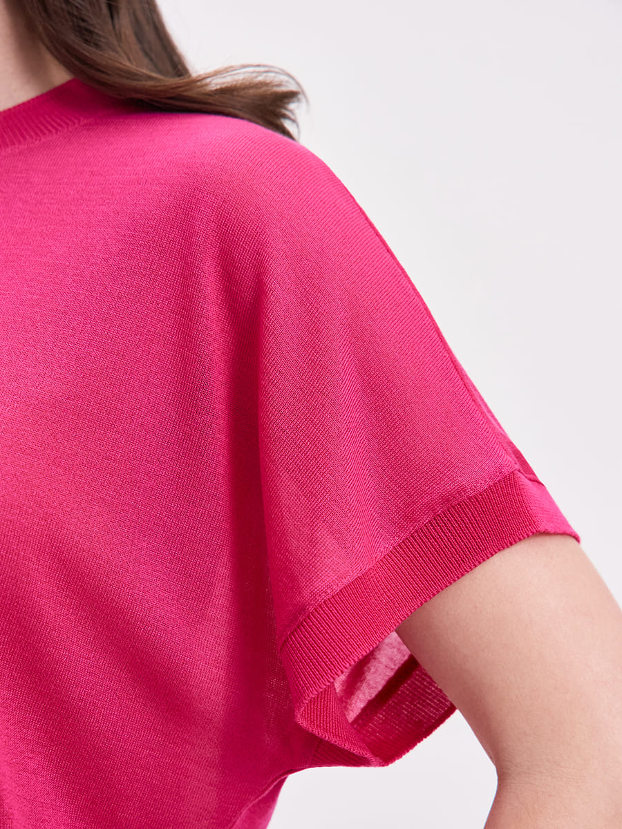 Настоящий летний дзен – восхитительно легкий джемпер-футболка из вискозы. Модная находка для отпуска и расслабленно-ленивых выходных за городом. Выполнен из тонкого полупрозрачного трикотажа с шелковистым финишем. Края и горловина защищены от деформаций мягкой вязаной резинкой. Ключевая деталь фасона – цельнокроенный, красиво струящийся вдоль линии плеча рукав. Дружит с любым летним низом – брюками палаццо, летящими юбками и сексуальными шортиками.