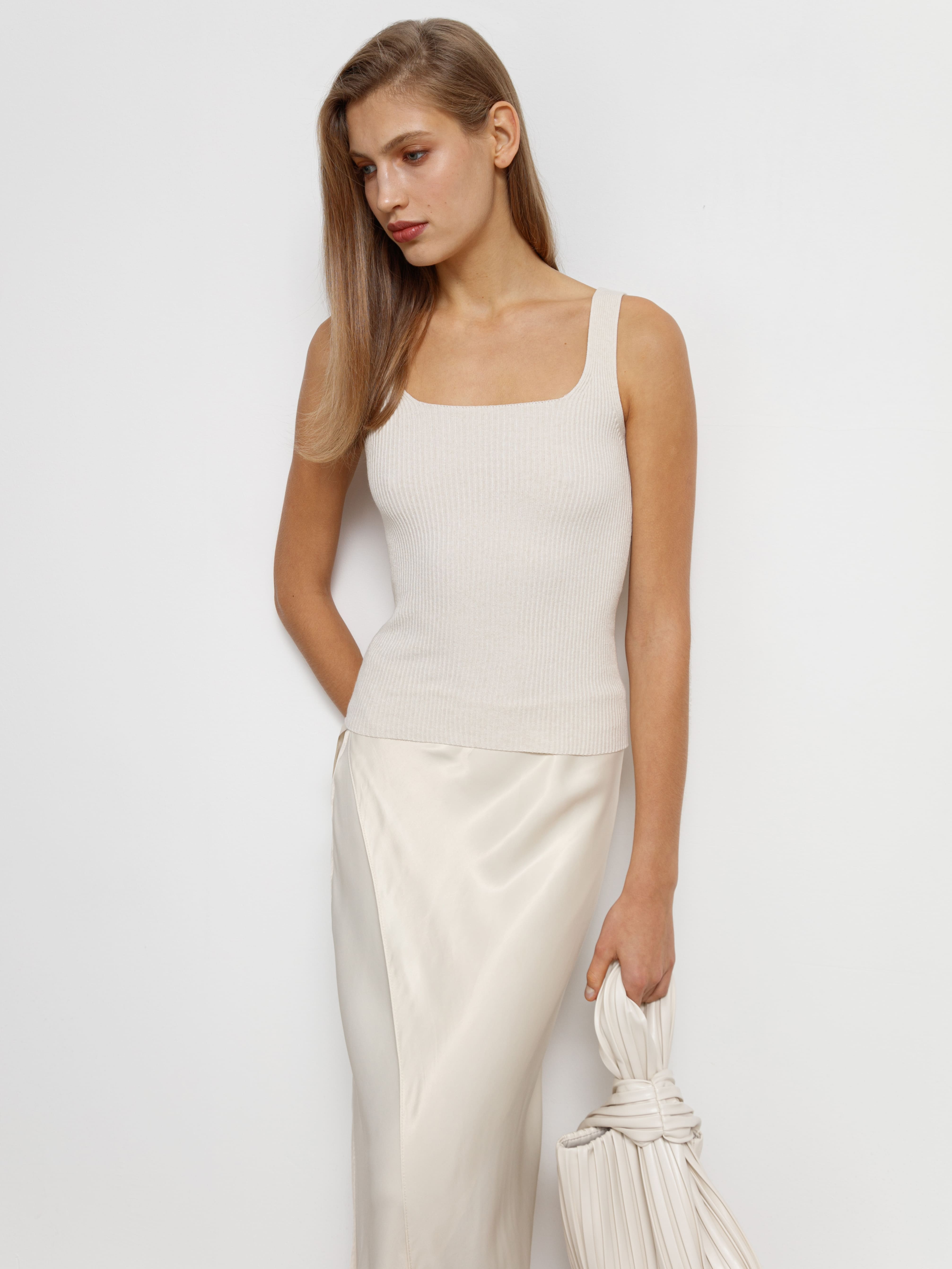 Топ-майка с геометричным вырезом каре, связанный в технике мелкий рубчик. Универсальная модная единица без выраженной привязки к сезонности. Органично дополнит летний гардероб и с легкостью трансформируется в нижний слой в осенних образах. Оптимизированная плотность изделия создает гармоничное облегание без чрезмерного обтягивания. Модель выполнена из эластично-упругого трикотажа с чуть шероховатой текстурой. Базовое волокно в составе – натуральный хлопок, дополнительно укрепленный вискозой.