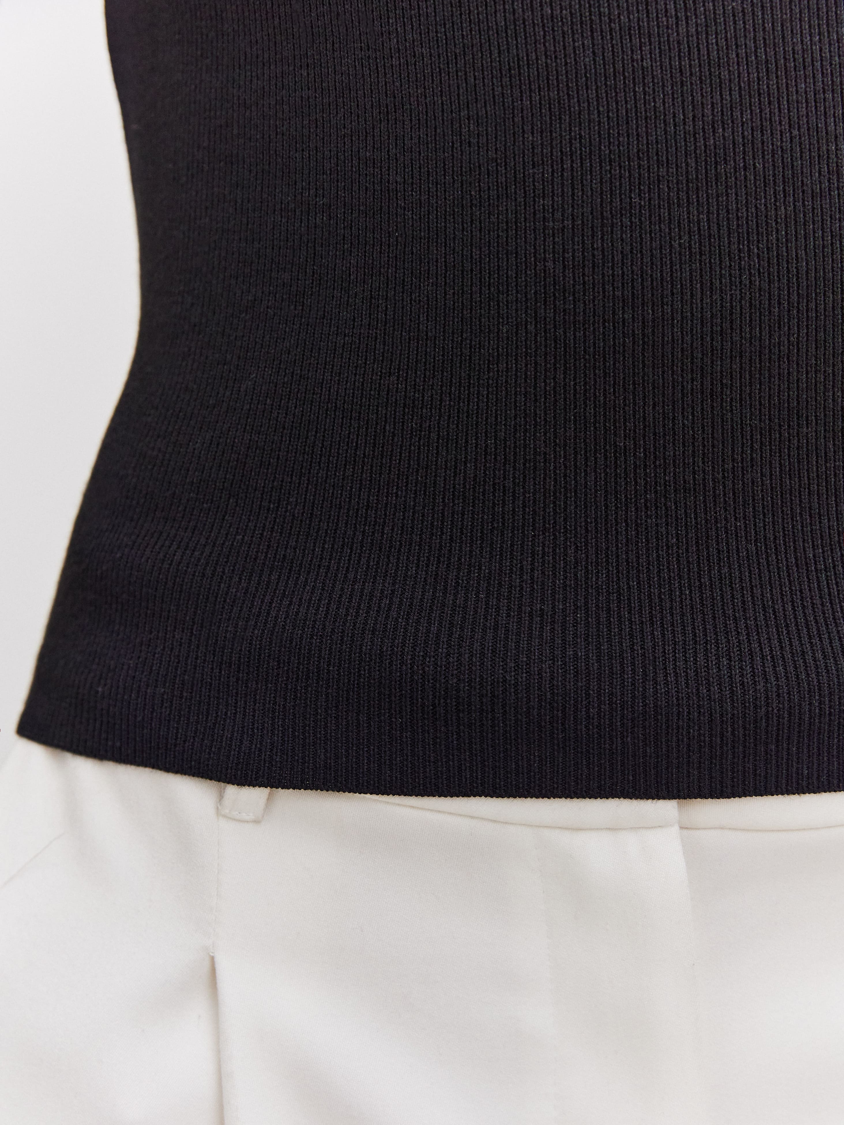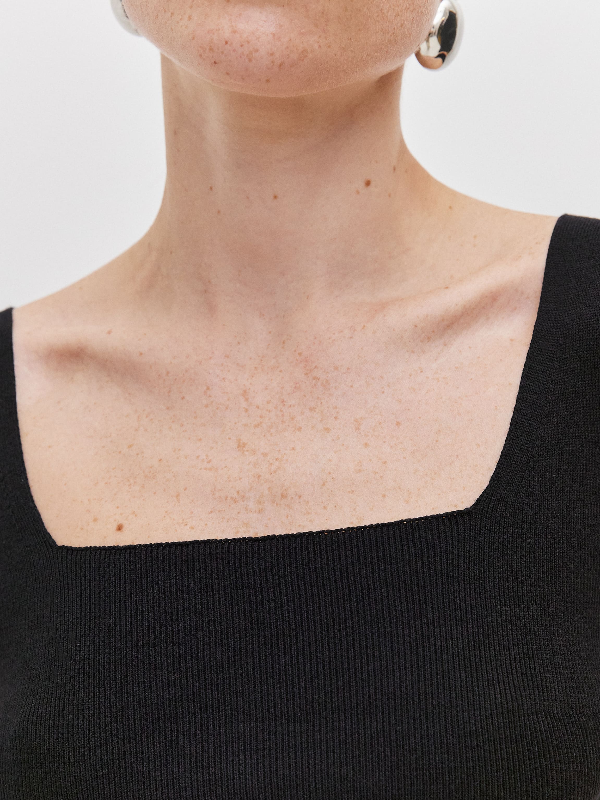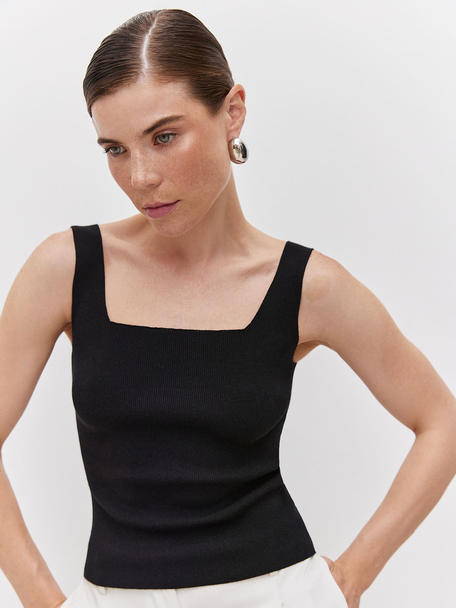 Топ-майка с геометричным вырезом каре, связанный в технике мелкий рубчик. Универсальная модная единица без выраженной привязки к сезонности. Органично дополнит летний гардероб и с легкостью трансформируется в нижний слой в осенних образах. Оптимизированная плотность изделия создает гармоничное облегание без чрезмерного обтягивания. Модель выполнена из эластично-упругого трикотажа с чуть шероховатой текстурой. Базовое волокно в составе – натуральный хлопок, дополнительно укрепленный вискозой.
