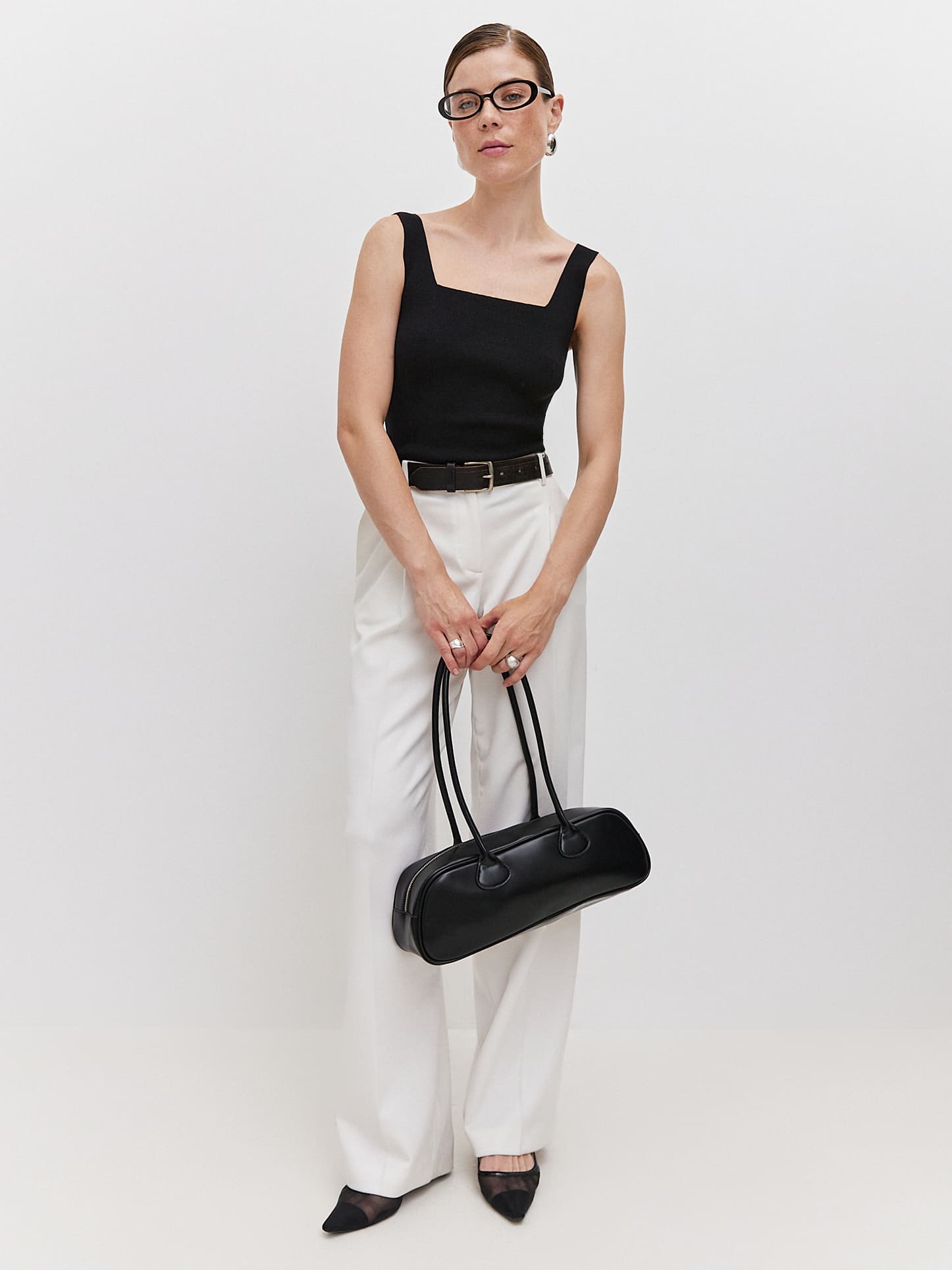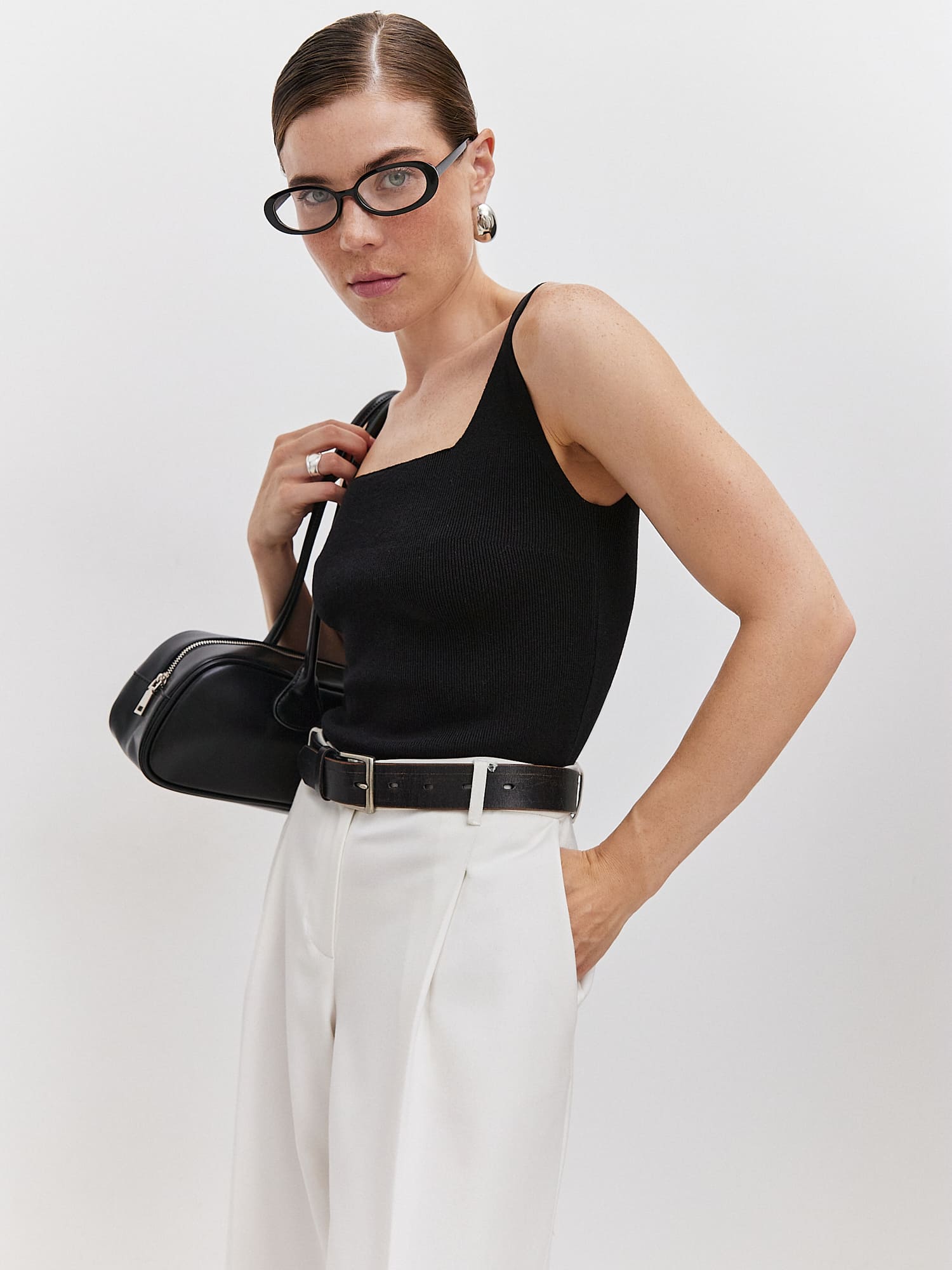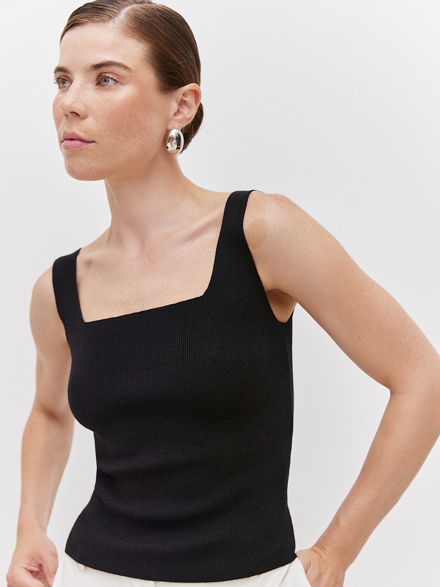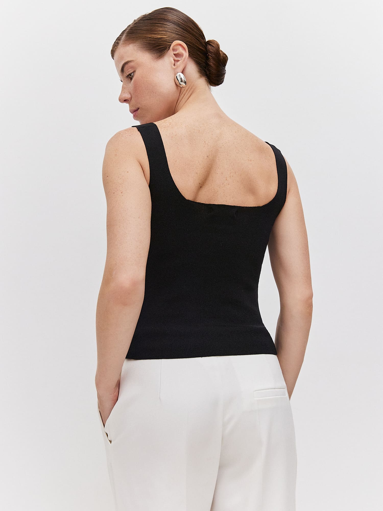 Топ-майка с геометричным вырезом каре, связанный в технике мелкий рубчик. Универсальная модная единица без выраженной привязки к сезонности. Органично дополнит летний гардероб и с легкостью трансформируется в нижний слой в осенних образах. Оптимизированная плотность изделия создает гармоничное облегание без чрезмерного обтягивания. Модель выполнена из эластично-упругого трикотажа с чуть шероховатой текстурой. Базовое волокно в составе – натуральный хлопок, дополнительно укрепленный вискозой.
