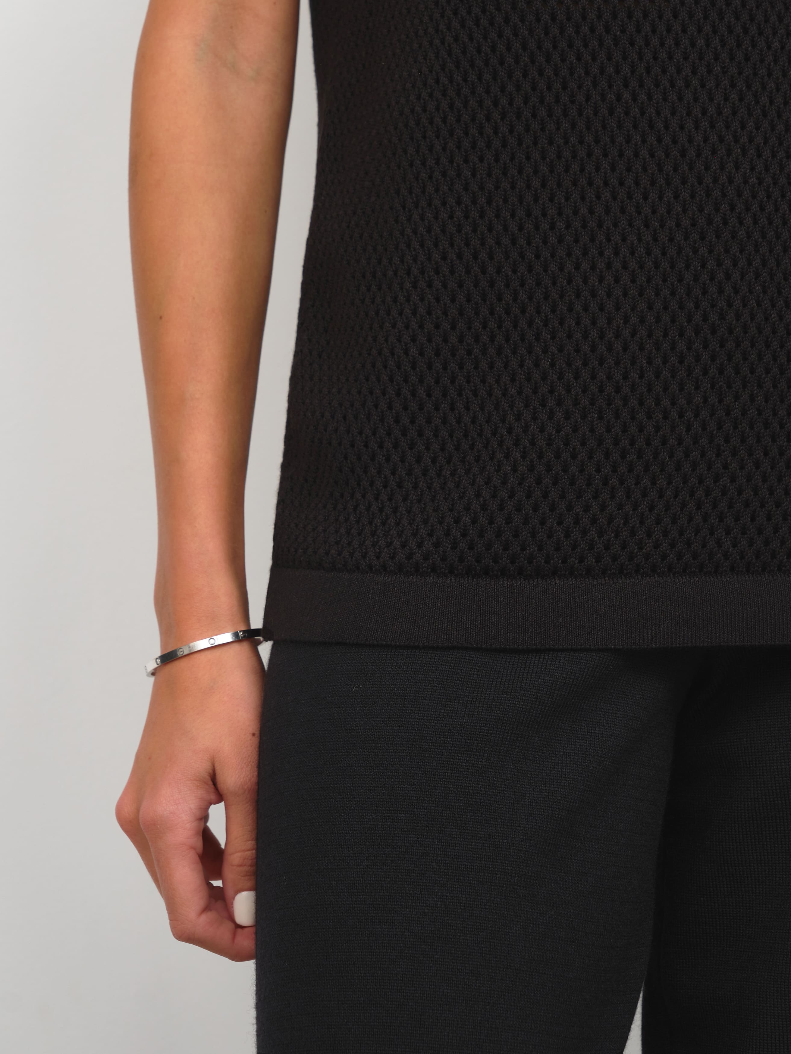 Закрытый хлопковый топ для поклонниц воздушных сеточек, ажурных техник и сдержанной перфорации. Прекрасен сам по себе и не нуждается в декоративных элементах. Эталонная однородность и симметрия узора. Смотреть на сотни аккуратных ячеек, объединенных в нежнейший трикотаж, можно бесконечно. Базовая составляющая летней капсулы, которая мягко подчеркнет загар и будет дышать каждой петелькой. Оптимальный нижний слой под весенние кардиганы 99colorspace.