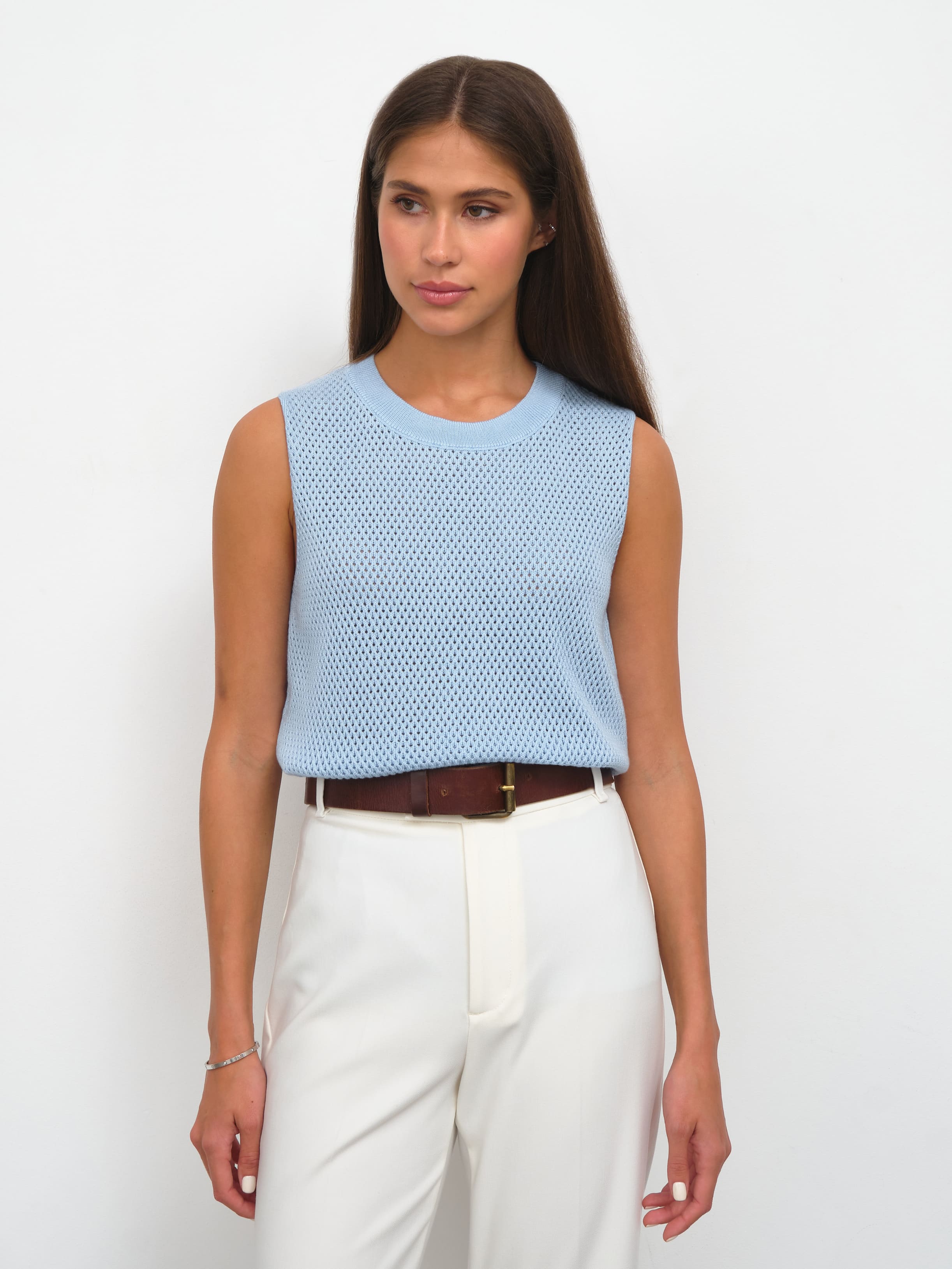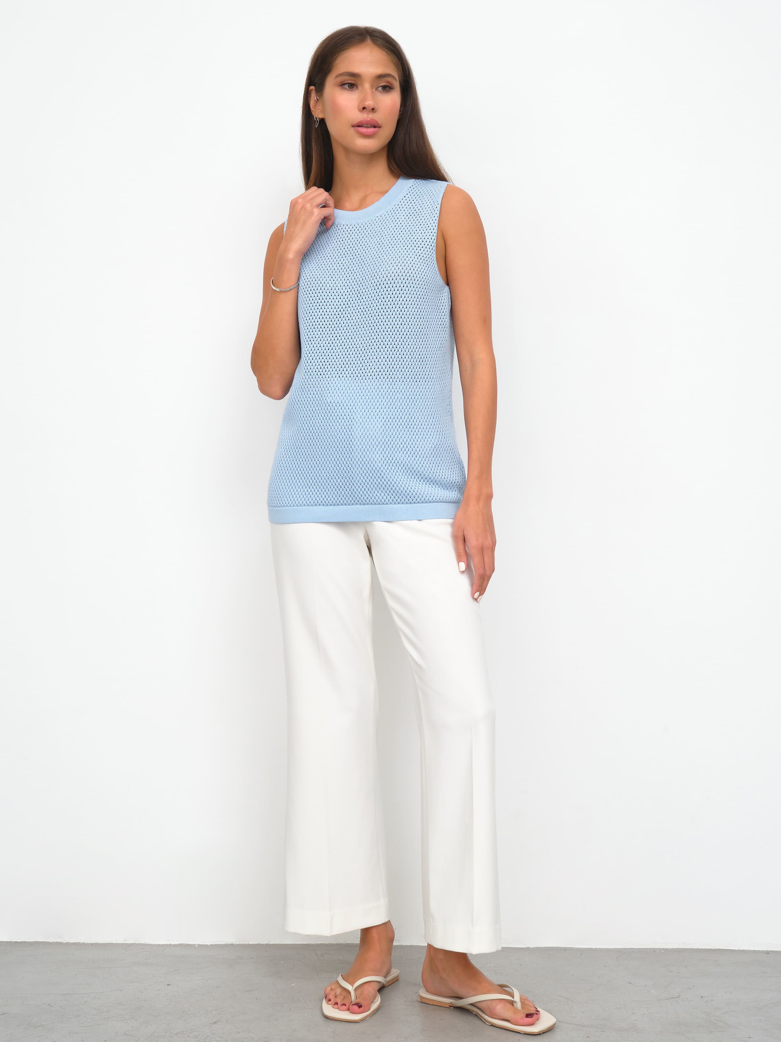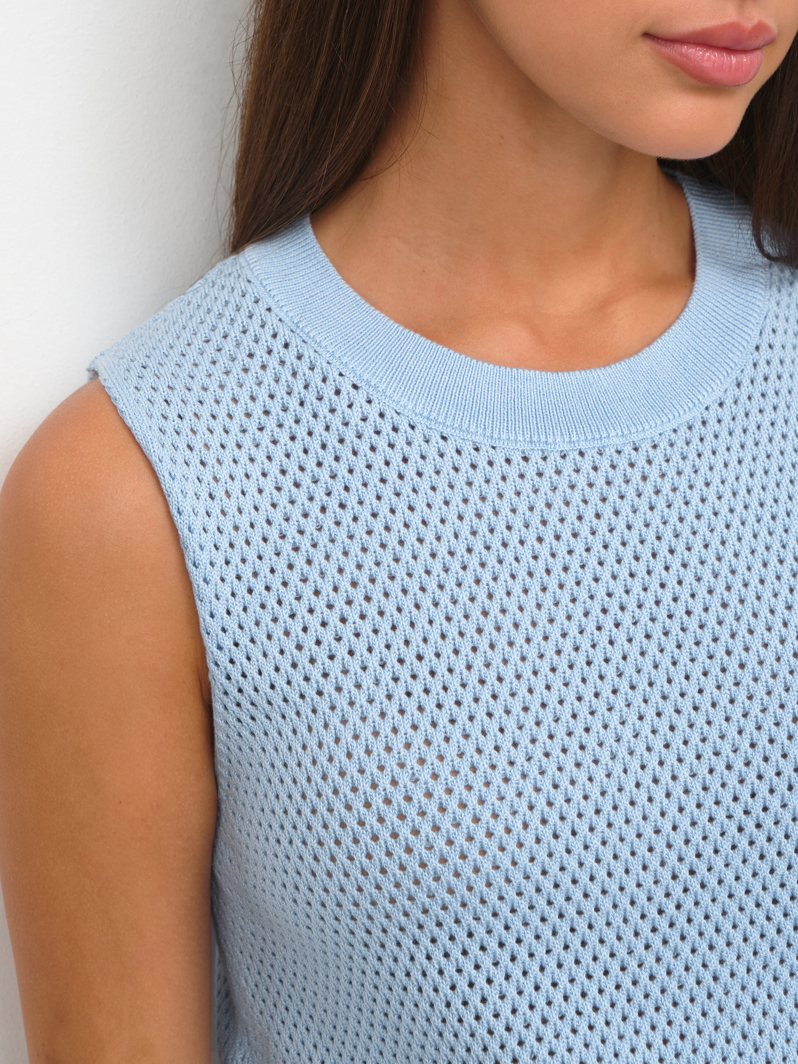 Закрытый хлопковый топ для поклонниц воздушных сеточек, ажурных техник и сдержанной перфорации. Прекрасен сам по себе и не нуждается в декоративных элементах. Эталонная однородность и симметрия узора. Смотреть на сотни аккуратных ячеек, объединенных в нежнейший трикотаж, можно бесконечно. Базовая составляющая летней капсулы, которая мягко подчеркнет загар и будет дышать каждой петелькой. Оптимальный нижний слой под весенние кардиганы 99colorspace.