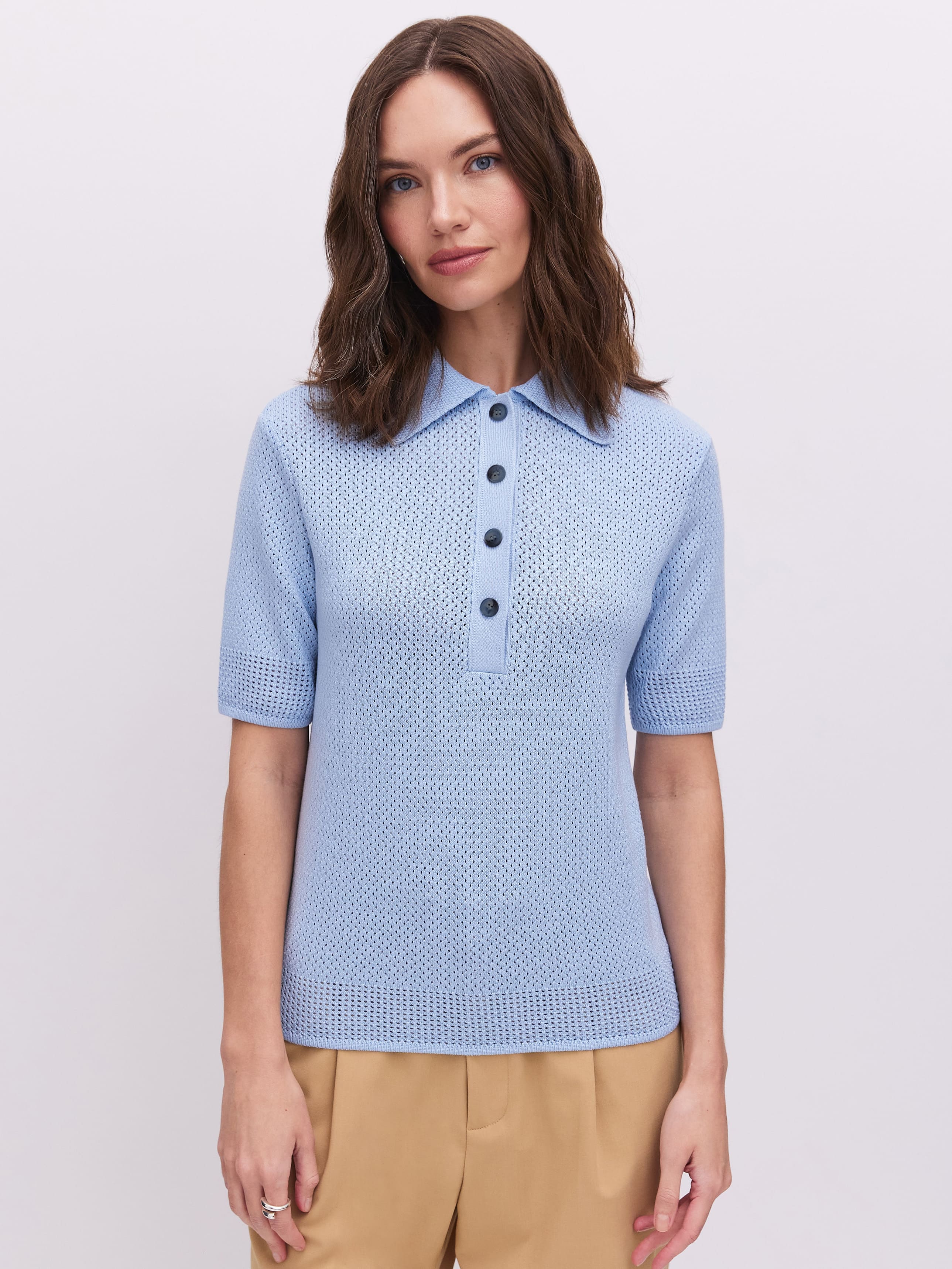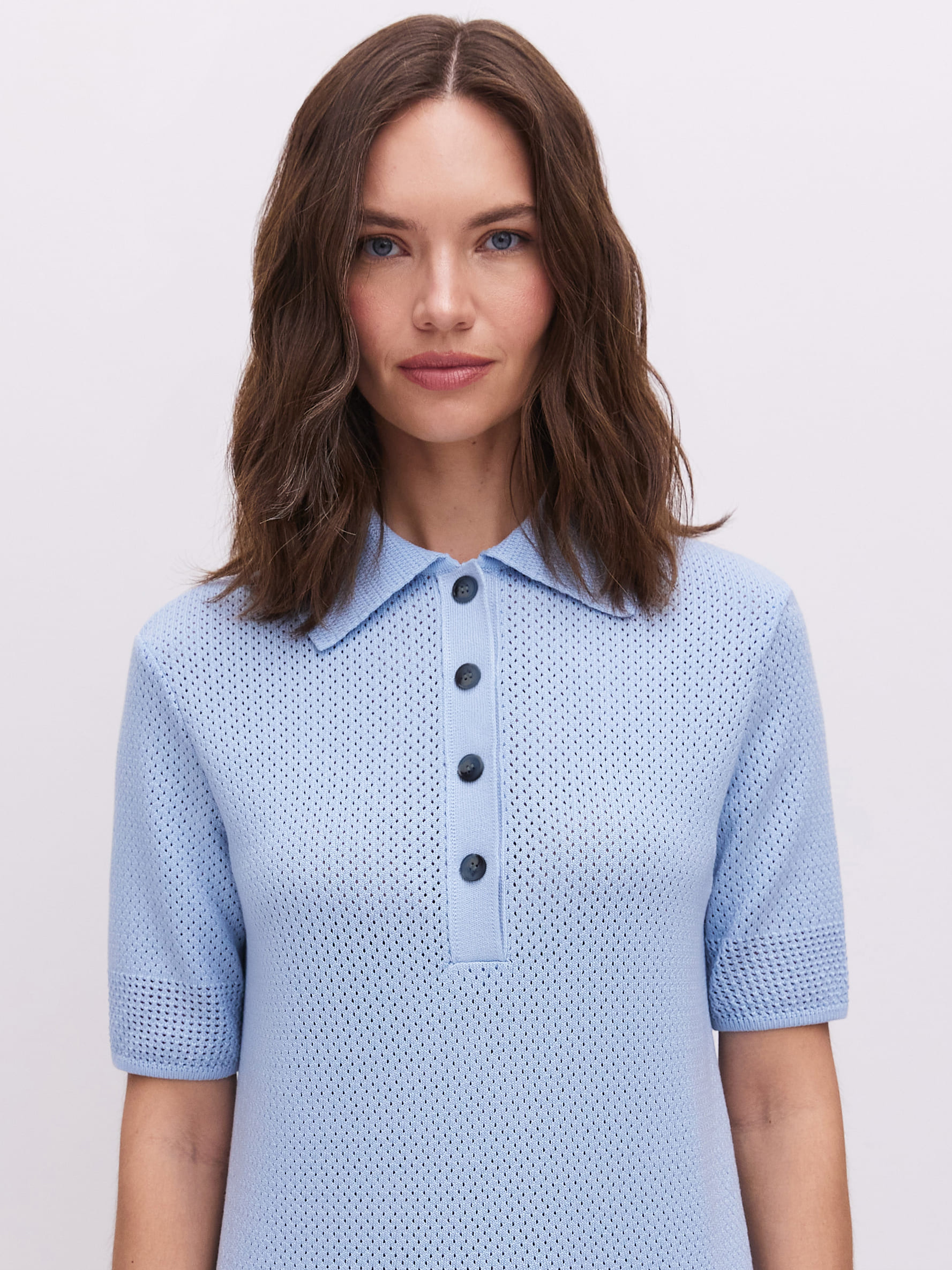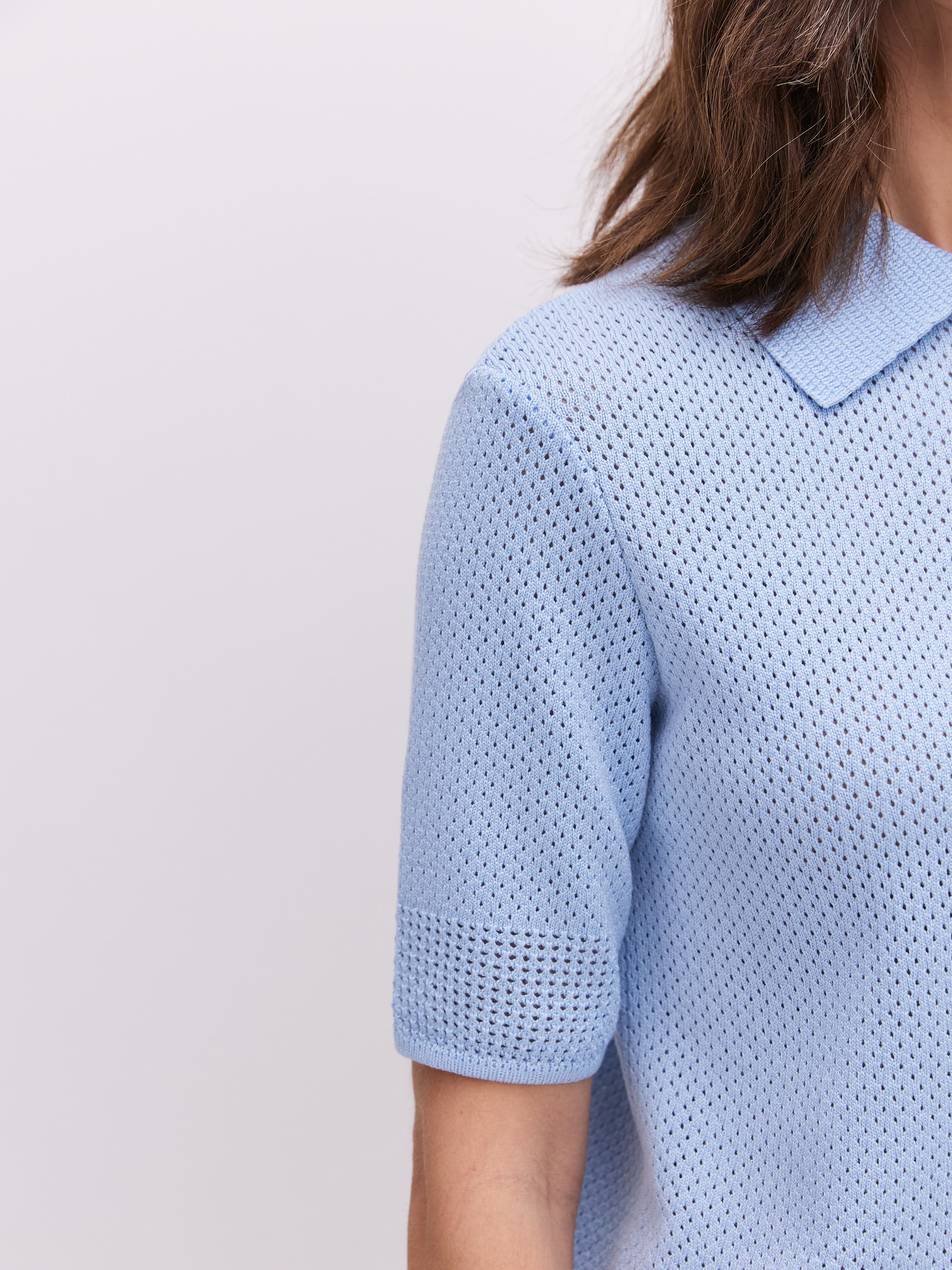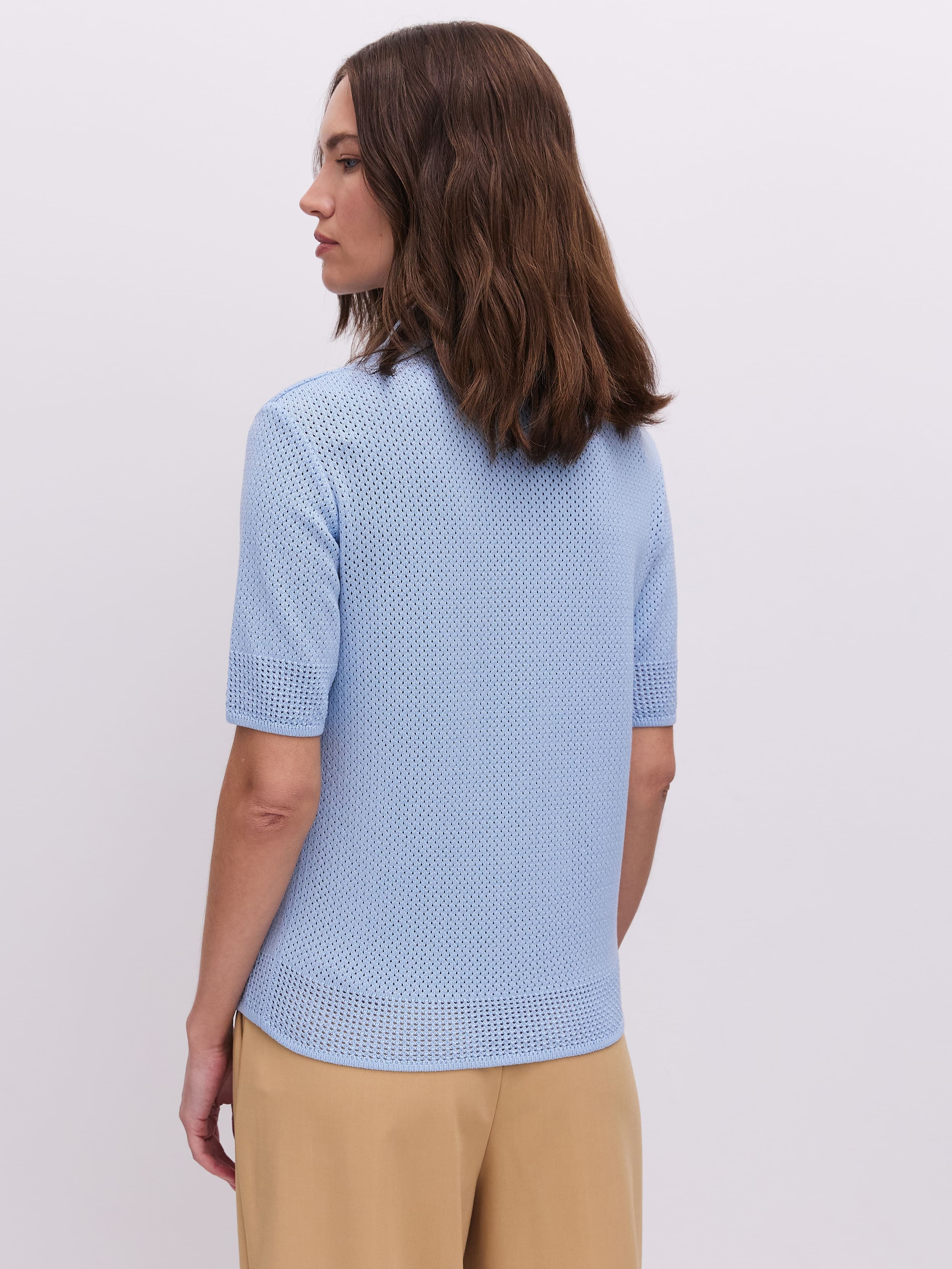 Нежное вязаное поло с хлопком и невесомой вискозой. Изюминка модели – аккуратная перфорация. Каждая трикотажная ячейка работает как проводник воздушных капсул, бережно охлаждающих тело. Уютный джемпер для летнего отпуска и морских прогулок. Мягкий трикотаж защитит от активного солнца, бриза и перегрева. Рифмуется с любым низом из круизной коллекции 99colorspace – вискозными юбками или пластичными хлопковыми палаццо.